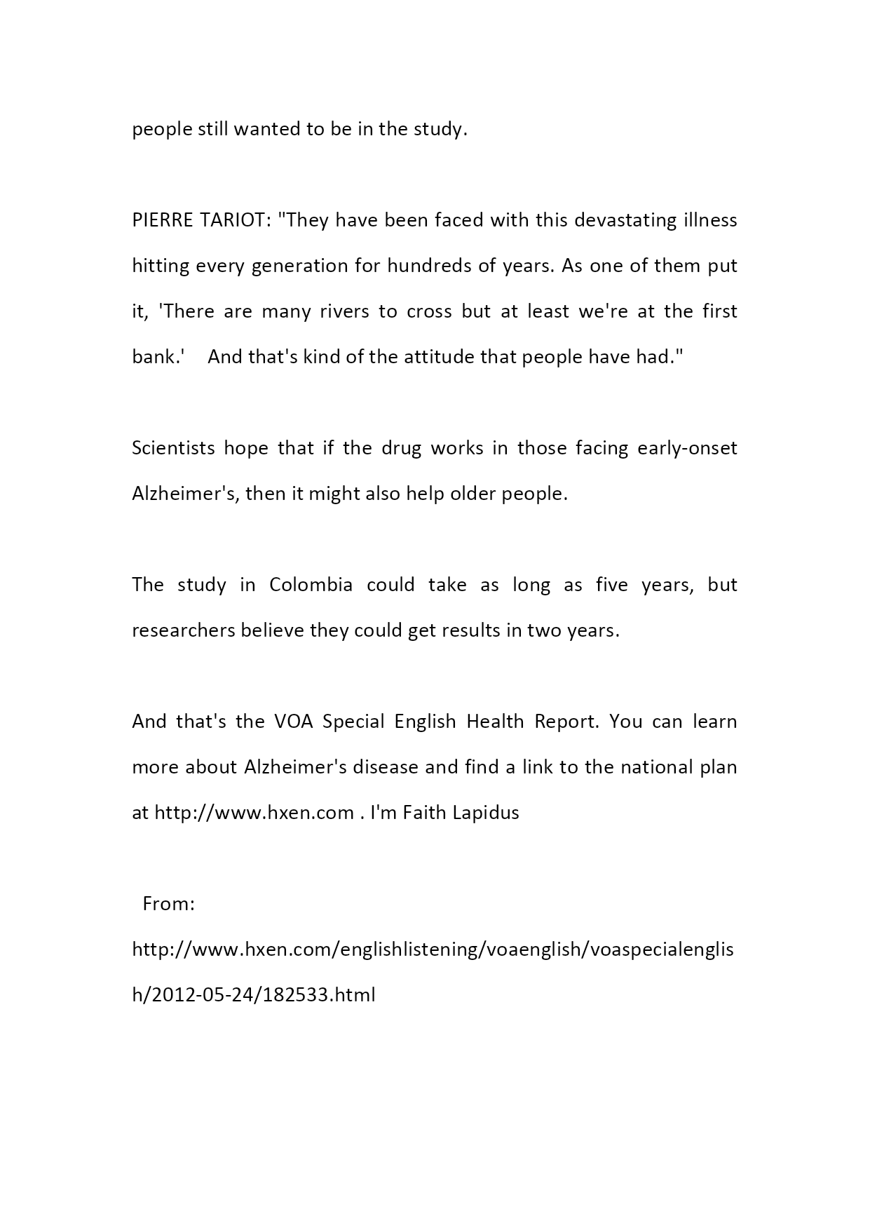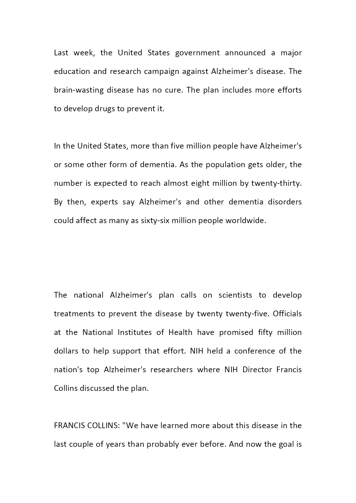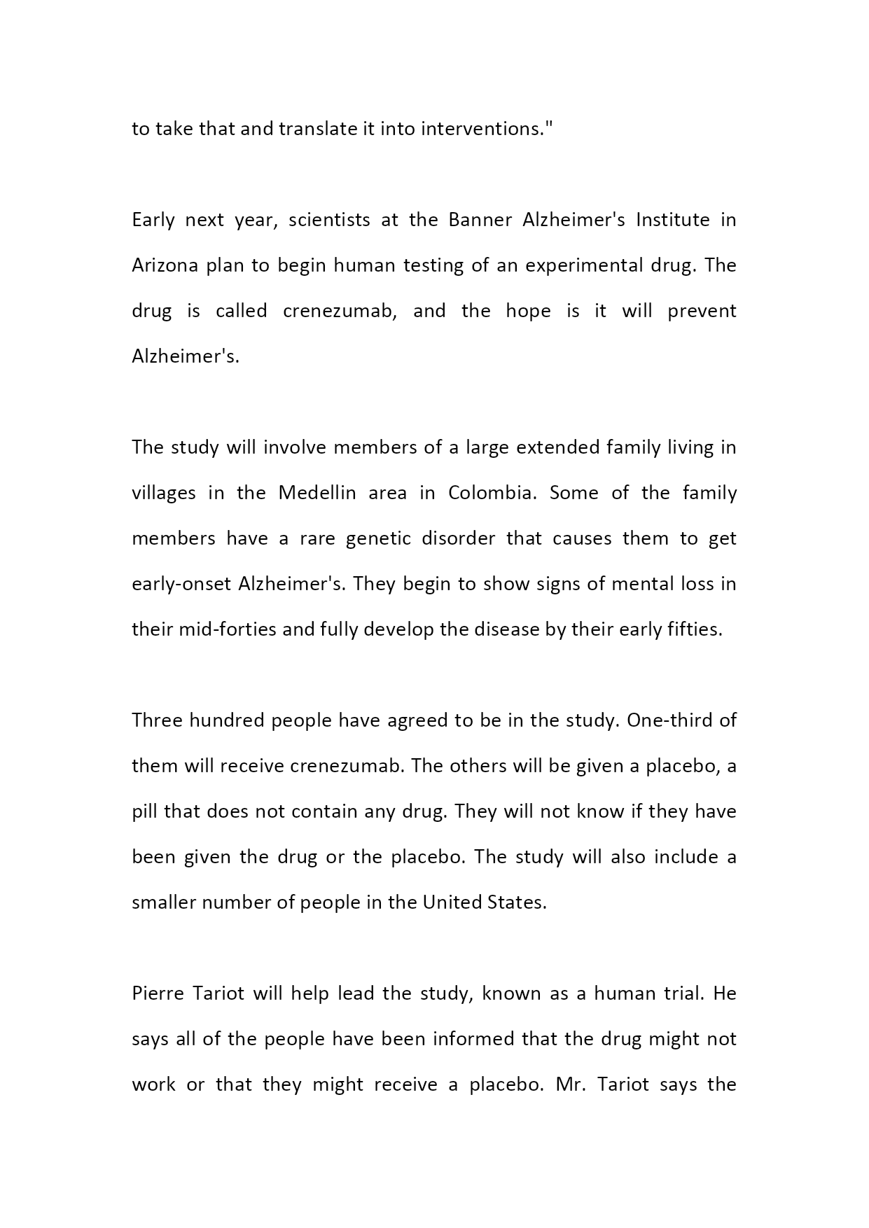 Lastweek,theUnitedStatesgovernmentannouncedamajoreducationandresearchcampaignagainstAlzheimer'sdisease.Thebrain-wastingdiseasehasnocure.Theplanincludesmoreeffortstodevelopdrugstopreventit.IntheUnitedStates,morethanfivemillionpeoplehaveAlzheimer'sorsomeotherformofdementia.Asthepopulationgetsolder,thenumberisexpectedtoreachalmosteightmillionbytwenty-thirty.Bythen,expertssayAlzheimer'sandotherdementiadisorderscouldaffectasmanyassixty-sixmillionpeopleworldwide.ThenationalAlzheimer'splancallsonscientiststodeveloptreatmentstopreventthediseasebytwentytwenty-five.OfficialsattheNationalInstitutesofHealthhavepromisedfiftymilliondollarstohelpsupportthateffort.NIHheldaconferenceofthenation'stopAlzheimer'sresearcherswhereNIHDirectorFrancisCollinsdiscussedtheplan.FRANCISCOLLINS:"Wehavelearnedmoreaboutthisdiseaseinthelastcoupleofyearsthanprobablyeverbefore.Andnowthegoalistotakethatandtranslateitintointerventions."Earlynextyear,scientistsattheBannerAlzheimer'sInstituteinArizonaplantobeginhumantestingofanexperimentaldrug.Thedrugiscalledcrenezumab,andthehopeisitwillpreventAlzheimer's.ThestudywillinvolvemembersofalargeextendedfamilylivinginvillagesintheMedellinareainColombia.Someofthefamilymembershaveararegeneticdisorderthatcausesthemtogetearly-onsetAlzheimer's.Theybegintoshowsignsofmentallossintheirmid-fortiesandfullydevelopthediseasebytheirearlyfifties.Threehundredpeoplehaveagreedtobeinthestudy.One-thirdofthemwillreceivecrenezumab.Theotherswillbegivenaplacebo,apillthatdoesnotcontainanydrug.Theywillnotknowiftheyhavebeengiventhedrugortheplacebo.ThestudywillalsoincludeasmallernumberofpeopleintheUnitedStates.PierreTariotwillhelpleadthestudy,knownasahumantrial.Hesaysallofthepeoplehavebeeninformedthatthedrugmightnotworkorthattheymightreceiveaplacebo.Mr.Tariotsaysthepeoplestillwantedtobeinthestudy.PIERRETARIOT:"Theyhavebeenfacedwiththisdevastatingillnesshittingeverygenerationforhundredsofyears.Asoneofthemputit,'Therearemanyriverstocrossbutatleastwe'reatthefirstbank.'Andthat'skindoftheattit