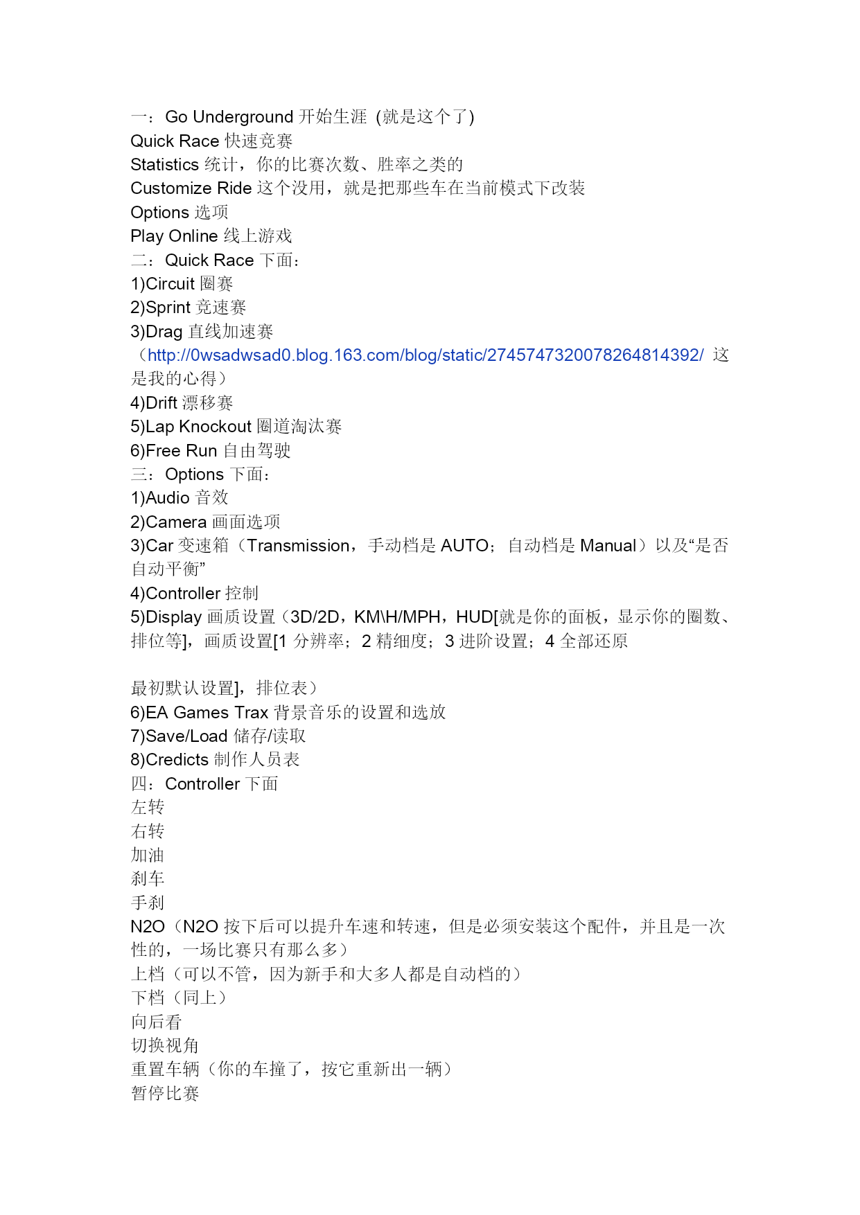 一:GoUnderground开始生涯(就是这个了)QuickRace快速竞赛Statistics统计,你的比赛次数、胜率之类的CustomizeRide这个没用,就是把那些车在当前模式下改装Options选项PlayOnline线上游戏二:QuickRace下面:1)Circuit圈赛2)Sprint竞速赛3)Drag直线加速赛(HYPERLINK"http://0wsadwsad0.blog.163.com/blog/static/2745747320078264814392/"\t"_blank"http://0wsadwsad0.blog.163.com/blog/static/2745747320078264814392/这是我的心得)4)Drift漂移赛5)LapKnockout圈道淘汰赛6)FreeRun自由驾驶三:Options下面:1)Audio音效2)Camera画面选项3)Car变速箱(Transmission,手动档是AUTO;自动档是Manual)以及“是否自动平衡”4)Controller控制5)Display画质设置(3D/2D,KM\H/MPH,HUD[就是你的面板,显示你的圈数、排位等],画质设置[1分辨率;2精细度;3进阶设置;4全部还原最初默认设置],排位表)6)EAGamesTrax背景音乐的设置和选放7)Save/Load储存/读取8)Credicts制作人员表四:Controller下面左转右转加油刹车手刹N2O(N2O按下后可以提升车速和转速,但是必须安装这个配件,并且是一次性的,一场比赛只有那么多)上档(可以不管,因为新手和大多人都是自动档的)下档(同上)向后看切换视角重置车辆(你的车撞了,按它重新出一辆)暂停比赛五:生涯中的RaceMap选择地图CustomizeCar改装车辆Rankings当地前十名的排名Magzines你在杂志上的照片Statistics排名(上面提到了)Save储存(用不着)