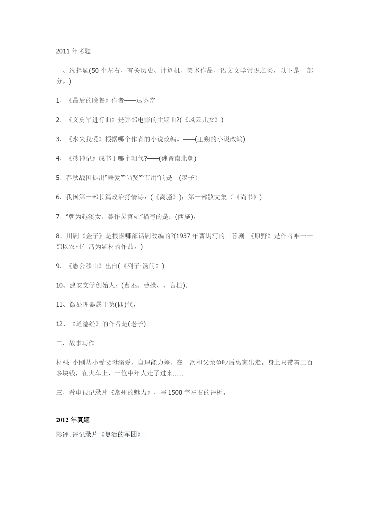 2011年考题一、选择题(50个左右,有关历史、计算机、美术作品,语文文学常识之类,以下是一部分。)1、《最后的晚餐》作者——达芬奇2、《义勇军进行曲》是哪部电影的主题曲?(《风云儿女》)3、《永失我爱》根据哪个作者的小说改编。——(王朔的小说改编)4、《搜神记》成书于哪个朝代?——(魏晋南北朝)5、春秋战国提出“兼爱”“尚贤”“节用”的是一(墨子)6、我国第一部长篇政治抒情诗:(《离骚》);第一部散文集(《尚书》)7、“朝为越溪女,暮作吴官妃”描写的是:(西施)。8、川剧《金子》是根据哪部话剧改编的?(1937年曹禺写的三暮剧《原野》是作者唯一一部以农村生活为题材的作品。)9、《愚公移山》出自(《列子·汤问》)10、建安文学创始人:(曹丕、曹操、、言植)。11、微处理器属于第(四)代。12、《道德经》的作者是(老子)。二、故事写作材料:小刚从小受父母溺爱,自理能力差,在一次和父亲争吵后离家出走。身上只带着二百多块钱,在火车上,一位中年人走了过来……三、看电视记录片《常州的魅力》,写1500字左右的评析。2012年真题影评:评记录片《复活的军团》编写故事:田园还记得高一班会课,大家一致选他当班长,但是他发现当班长并不容易,第二天一早到班上,发现几位好友在吃零食聊天,但是马上就要上课了.....继续编写,可添加一些人物等。