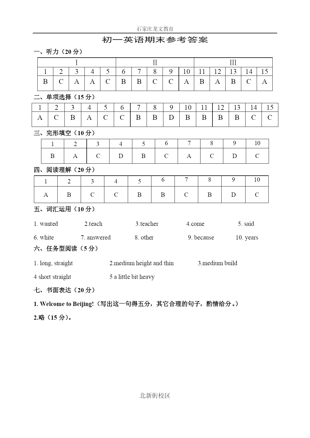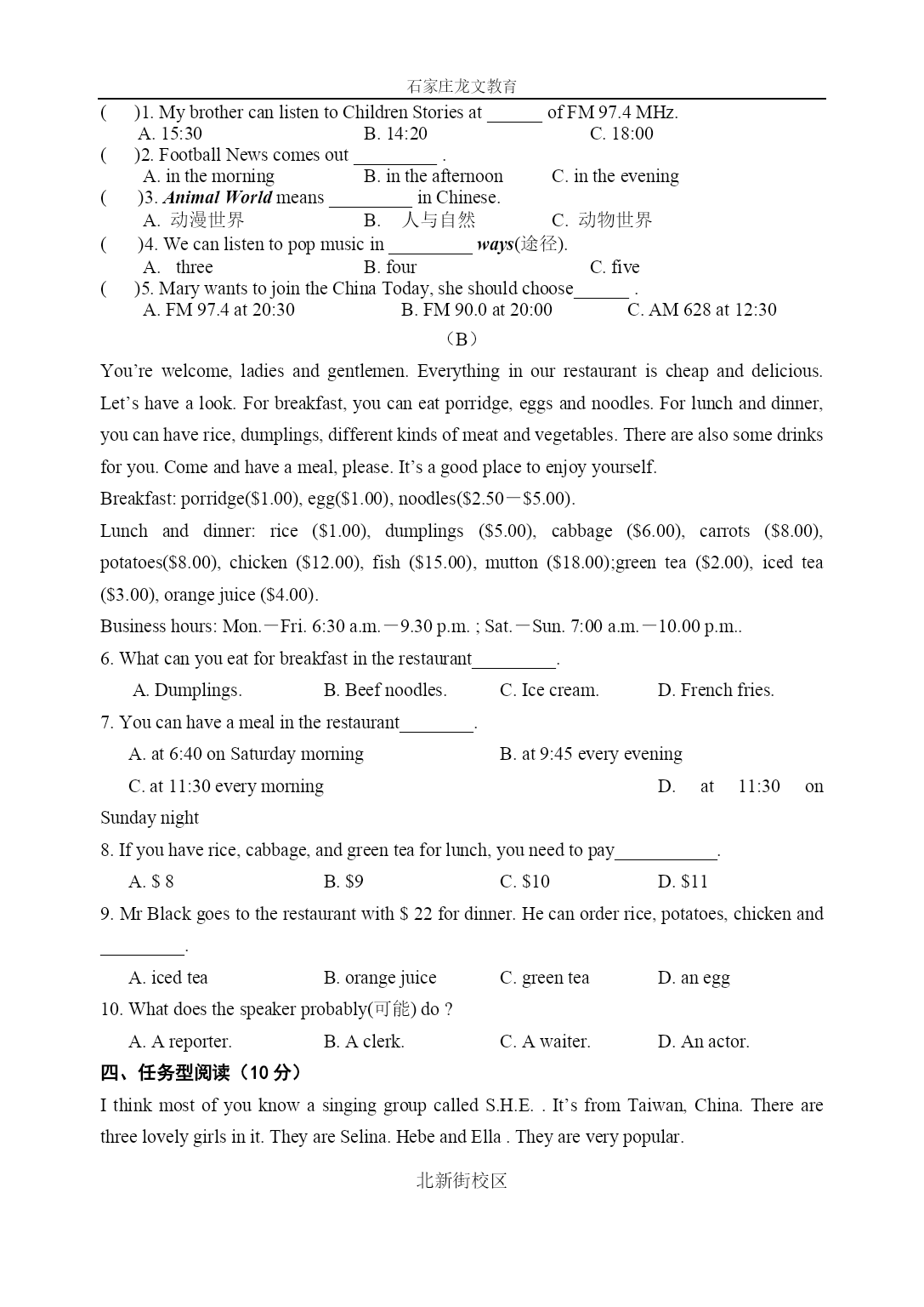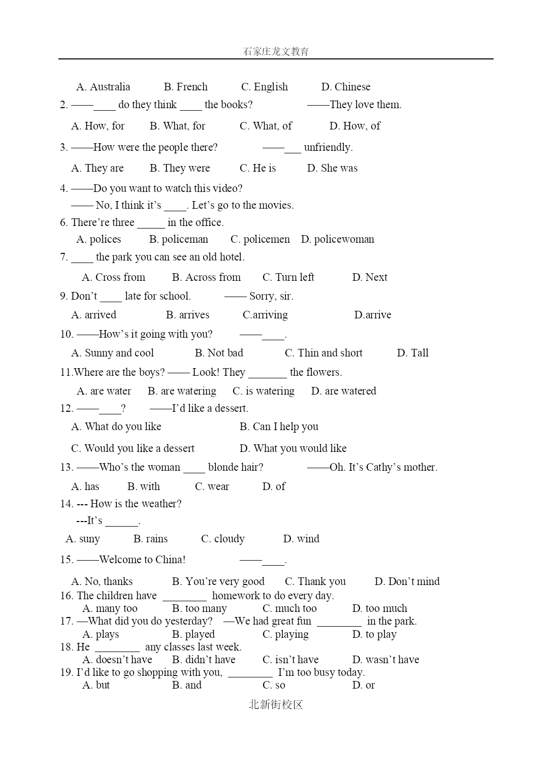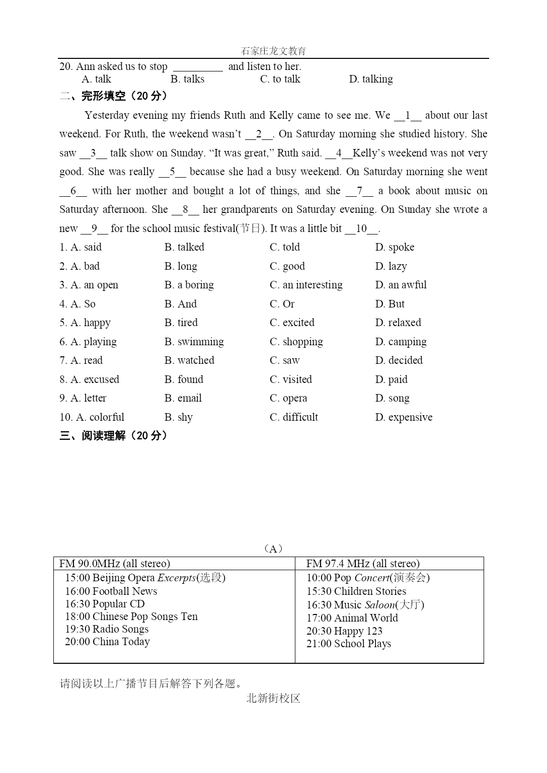 石家庄龙文教育北新街校区A.AustraliaB.FrenchC.EnglishD.Chinese2.——____dotheythink____thebooks?——Theylovethem.A.How,forB.What,forC.What,ofD.How,of3.——Howwerethepeoplethere?——___unfriendly.A.TheyareB.TheywereC.HeisD.Shewas4.——Doyouwanttowatchthisvideo?——No,Ithinkit’s____.Let’sgotothemovies.6.There’rethree_____intheoffice.A.policesB.policemanC.policemenD.policewoman7.____theparkyoucanseeanoldhotel.A.CrossfromB.AcrossfromC.TurnleftD.Next9.Don’t____lateforschool.——Sorry,sir.A.arrivedB.arrivesC.arrivingD.arrive10.——How’sitgoingwithyou?——____.A.SunnyandcoolB.NotbadC.ThinandshortD.Tall11.Wherearetheboys?——Look!They_______theflowers.A.arewaterB.arewateringC.iswateringD.arewatered12.——____?——I’dlikeadessert.A.WhatdoyoulikeB.CanIhelpyouC.WouldyoulikeadessertD.Whatyouwouldlike13.——Who’sthewoman____blondehair?——Oh.It’sCathy’smother.A.hasB.withC.wearD.of14.---Howistheweather?---It’s______.A.sunyB.rainsC.cloudyD.wind15.——WelcometoChina!——____.A.No,thanksB.You’reverygoodC.ThankyouD.Don’tmind16.Thechildrenhavehomeworktodoeveryday.A.manytooB.toomanyC.muchtooD.toomuch17.—Whatdidyoudoyesterday?—Wehadgreatfuninthepark.A.playsB.playedC.playingD.toplay18.Heanyclasseslastweek.A.doesn’thaveB.didn’thaveC.isn’thaveD.wasn’thave19.I’dliketogoshoppingwithyou,I’mtoobusytoday.A.butB.andC.soD.or20.Annaskedustostopandlistentoher.A.talkB.talksC.totalkD.talking二、完形填空(20分)YesterdayeveningmyfriendsRuthandKellycametoseeme.We__1__aboutourlastweekend.ForRuth,theweekendwasn’t__2__.OnSaturdaymorningshestudiedhistory.Shesaw__3__talkshowonSunday.“Itwasgreat,”Ruthsaid.__4__Kelly’sweekendwasnotverygood.Shewasreally__5__becauseshehadabusyweekend.OnSaturdaymorningshewent__6__withhermotherandboughtalotofthings,andshe__7__abookaboutmusiconSaturdayafternoon.She__8__hergrandparentsonSaturdayevening.OnSundayshewroteanew__9__fortheschoolmusicfestival(节日).Itwasalittlebit__10__.1.A.saidB.talkedC.toldD.spoke2.A.badB.longC.goodD.lazy3.A.anopenB.aboringC.aninterestingD.anawful4.A.SoB.AndC.OrD.But5.A.happyB.tiredC.excitedD.relaxed