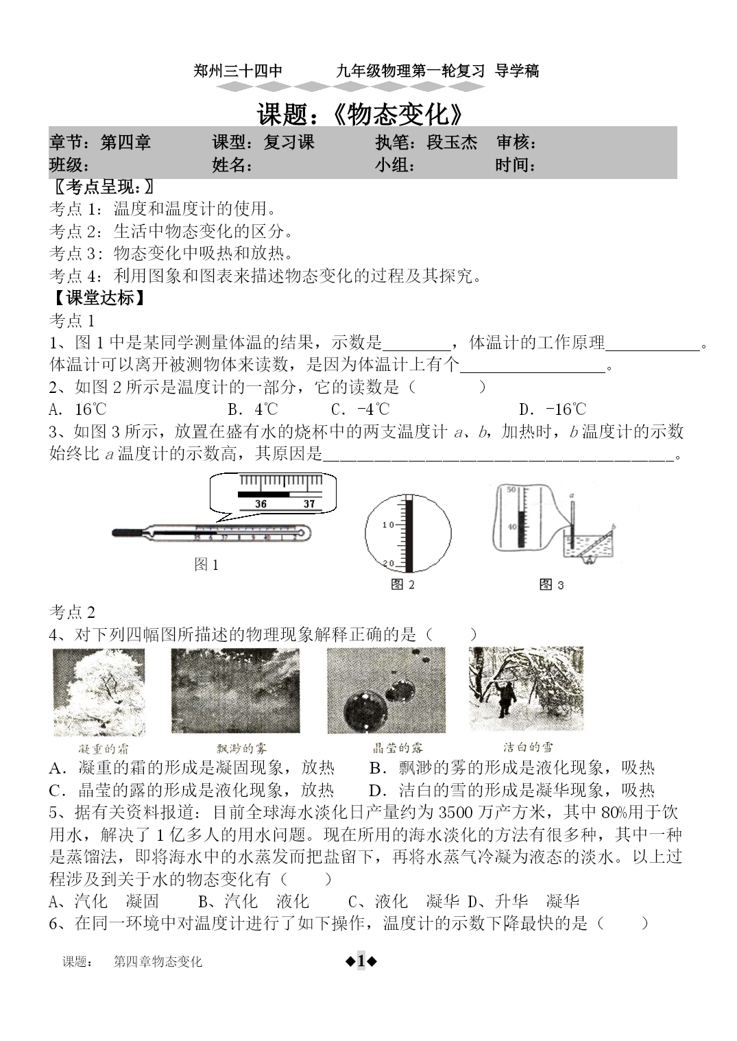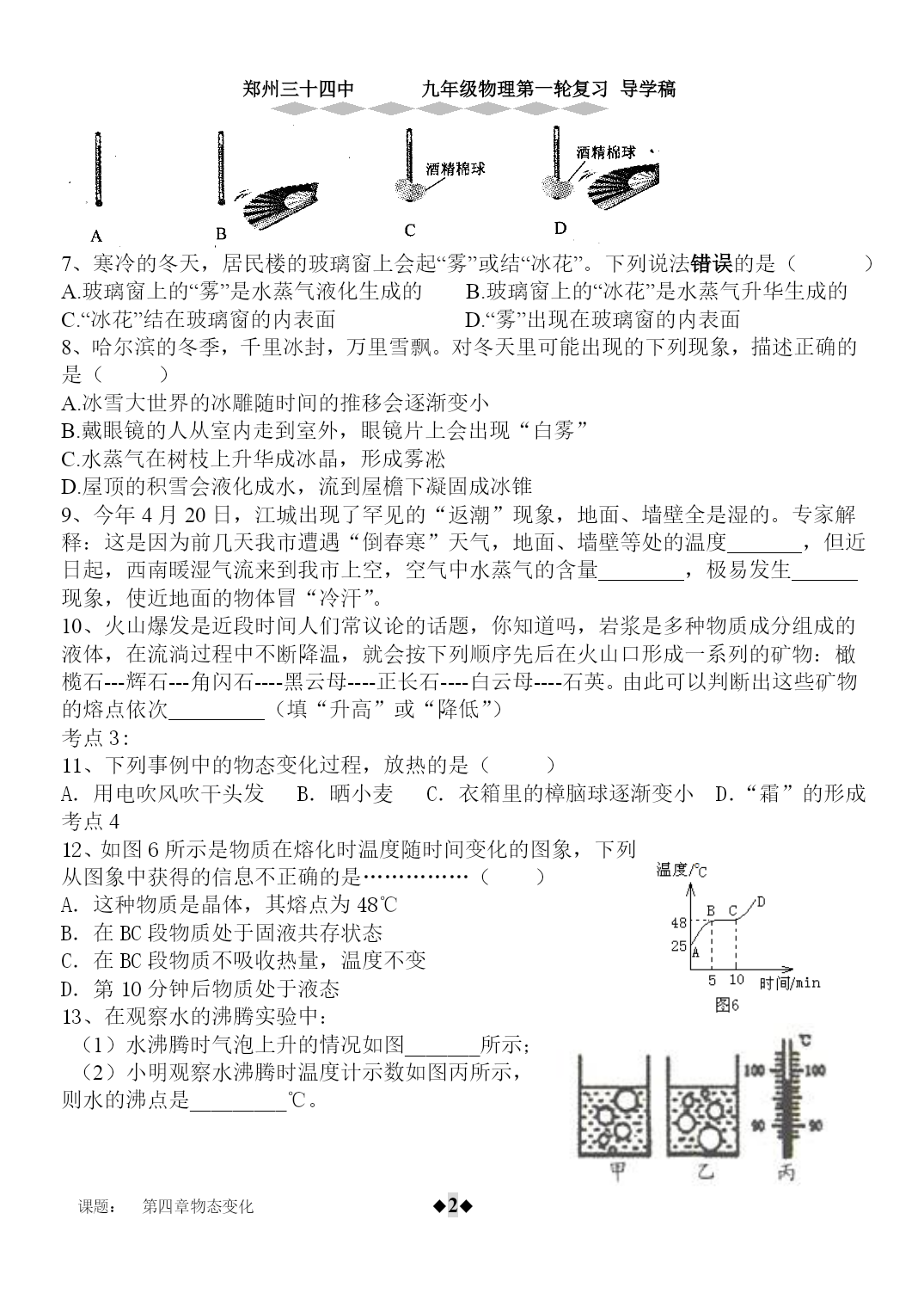 郑州三十四中九年级物理第一轮复习导学稿课题:第四章物态变化课题:《物态变化》章节:第四章课型:复习课执笔:段玉杰审核:班级:姓名:小组:时间:〖考点呈现:〗考点1:温度和温度计的使用。考点2:生活中物态变化的区分。考点3:物态变化中吸热和放热。考点4:利用图象和图表来描述物态变化的过程及其探究。【课堂达标】考点11、图1中是某同学测量体温的结果,示数是,体温计的工作原理。体温计可以离开被测物体来读数,是因为体温计上有个。2、如图2所示是温度计的一部分,它的读数是()A.16℃B.4℃C.-4℃D.-16℃图13、如图3所示,放置在盛有水的烧杯中的两支温度计a、b,加热时,b温度计的示数始终比a温度计的示数高,其原因是_________________________________________。考点24、对下列四幅图所描述的物理现象解释正确的是()A.凝重的霜的形成是凝固现象,放热B.飘渺的雾的形成是液化现象,吸热C.晶莹的露的形成是液化现象,放热D.洁白的雪的形成是凝华现象,吸热5、据有关资料报道:目前全球海水淡化日产量约为3500万产方米,其中80%用于饮用水,解决了1亿多人的用水问题。现在所用的海水淡化的方法有很多种,其中一种是蒸馏法,即将海水中的水蒸发而把盐留下,再将水蒸气冷凝为液态的淡水。以上过程涉及到关于水的物态变化有()A、汽化凝固B、汽化液化C、液化凝华D、升华凝华6、在同一环境中对温度计进行了如下操作,温度计的示数下降最快的是()7、寒冷的冬天,居民楼的玻璃窗上会起“雾”或结“冰花”。下列说法错误的是()A.玻璃窗上的“雾”是水蒸气液化生成的B.玻璃窗上的“冰花”是水蒸气升华生成的C.“冰花”结在玻璃窗的内表面D.“雾”出现在玻璃窗的内表面8、哈尔滨的冬季,千里冰封,万里雪飘。对冬天里可能出现的下列现象,描述正确的是()A.冰雪大世界的冰雕随时间的推移会逐渐变小B.戴眼镜的人从室内走到室外,眼镜片上会出现“白雾”C.水蒸气在树枝上升华成冰晶,形成雾凇D.屋顶的积雪会液化成水,流到屋檐下凝固成冰锥9、今年4月20日,江城出现了罕见的“返潮”现象,地面、墙壁全是湿的。专家解释:这是因为前几天我市遭遇“倒春寒”天气,地面、墙壁等处的温度,但近日起,西南暖湿气流来到我市上空,空气中水蒸气的含量,极易发生现象,使近地面的物体冒“冷汗”。10、火山爆发是近段时间人们常议论的话题,你知道吗,岩浆是多种物质成分组成的液体,在流淌过程中不断降温,就会按下列顺序先后在火山口形成一系列的矿物:橄榄石---辉石---角闪石----黑云母----正长石----白云母----石英。由此可以判断出这些矿物的熔点依次(填“升高”或“降低”)考点3:11、下列事例中的物态变化过程,放热的是()A.用电吹风吹干头发B.晒小麦C.衣箱里的樟脑球逐渐变小D.“霜”的形成考点412、如图6所示是物质在熔化时温度随时间变化的图象,下列从图象中获得的信息不正确的是……………()A.这种物质是晶体,其熔点为48℃B.在BC段物质处于固液共存状态C.在BC段物质不吸收热量,温度不变D.第10分钟后物质处于液态13、在观察水的沸腾实验中:(1)水沸腾时气泡上升的情况如图_______所示;(2)小明观察水沸腾时温度计示数如图丙所示,则水的沸点是_________℃。