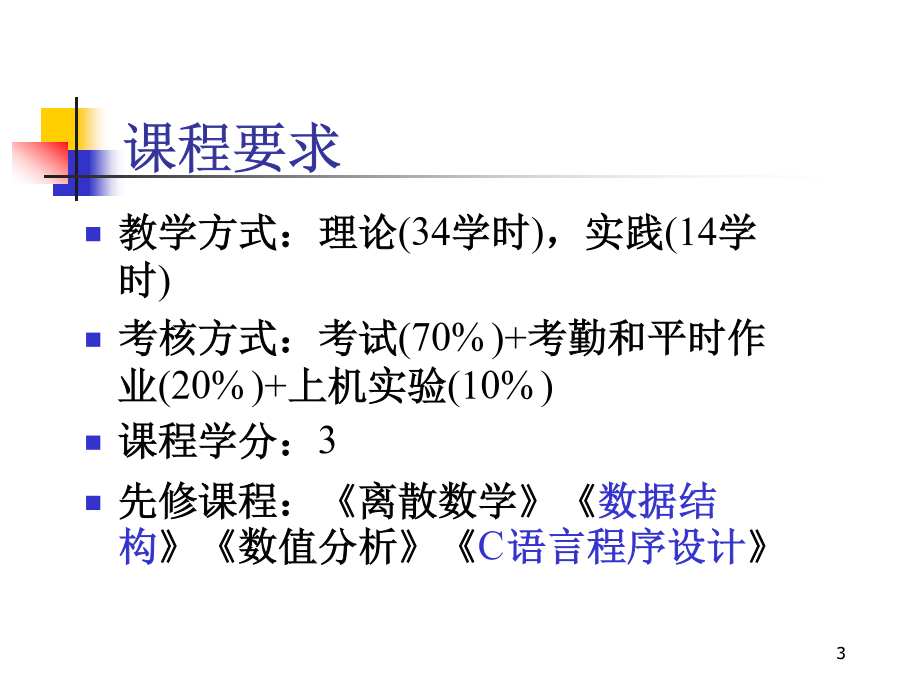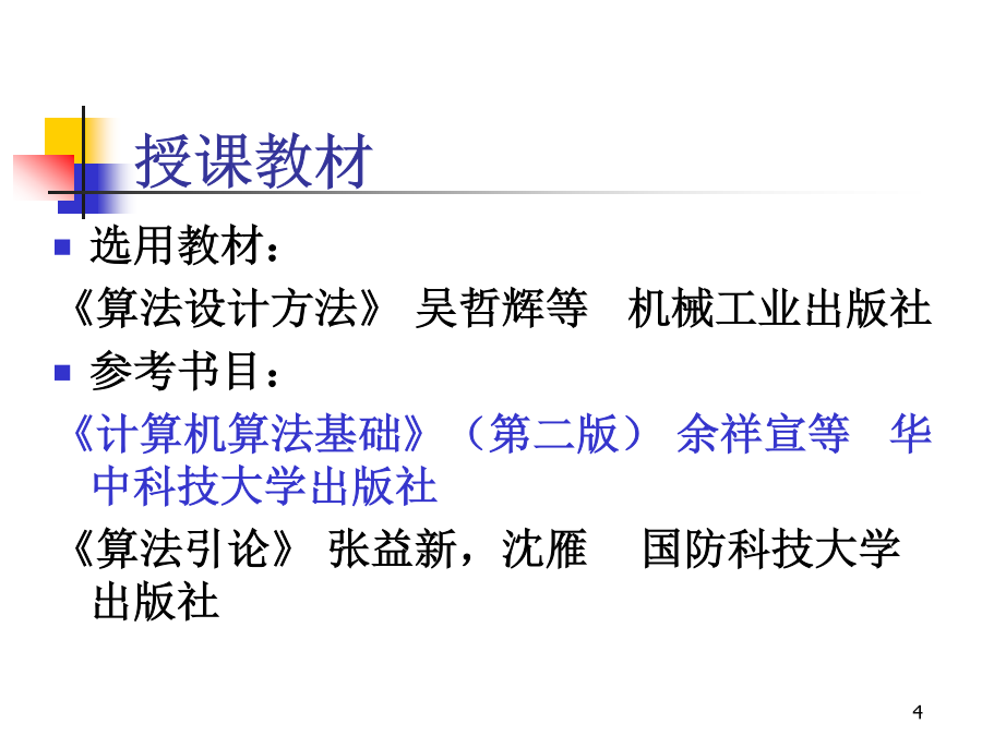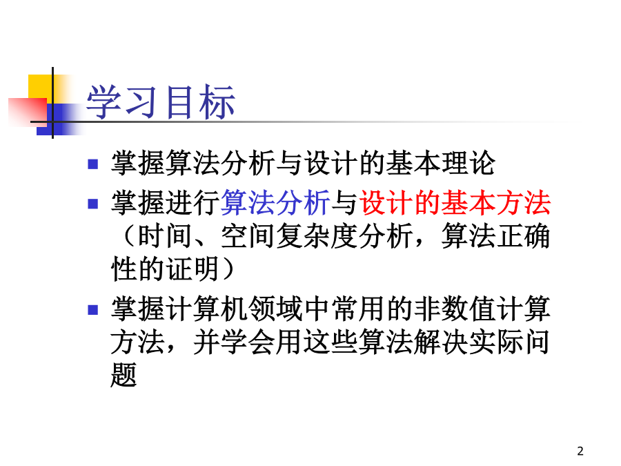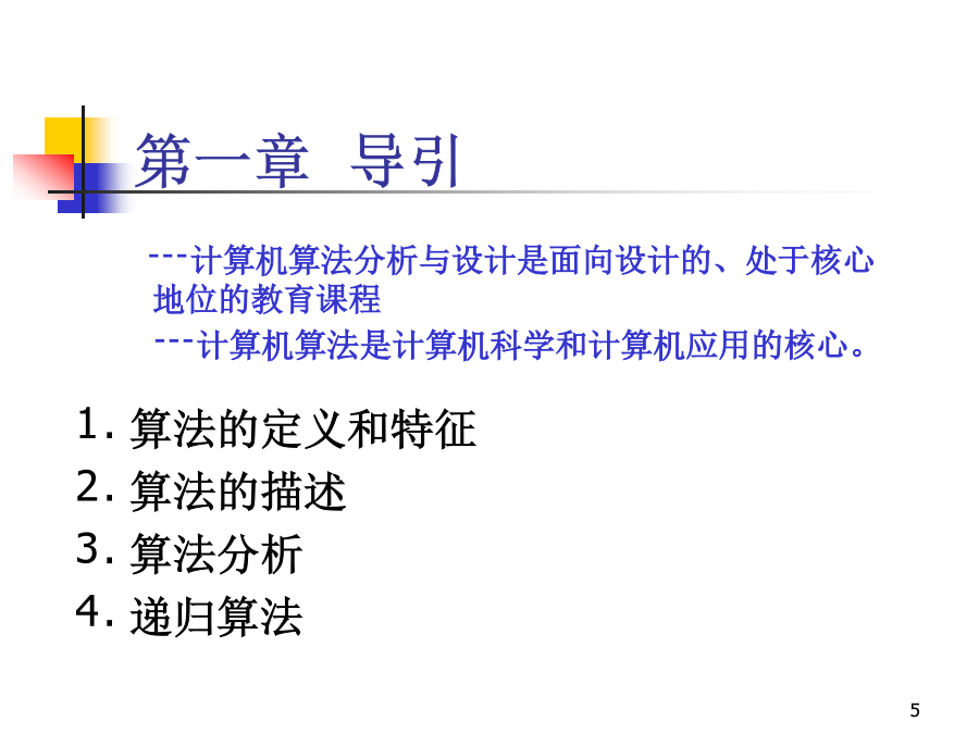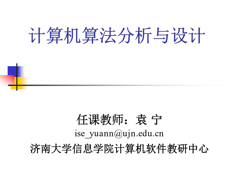 计算机算法分析与设计学习目标课程要求授课教材第一章导引1.1算法(Algorithm)的定义和特征算法是指解决问题的一种方法或一个过程一个算法是求解某一类特定问题的一组有穷规则的集合。首先,一个算法是一组规则,通常称之为算法步骤,这组规则是有穷的,即能用有限的形式表示出来。其次,一个算法是针对一类问题而设计的。1.2算法的描述算法的基本思想:轻者(小的元素)像气泡那样从水底往上浮。在排序过程中,每次把相邻的两个元素作比较,当前面的元素大于后面的元素时,就交换它们的位置。这样,所有相邻的元素比较一遍以后最大的元素就被交换到了最后面。依此类推,直到把最后两个元素排好序。用冒泡排序法对6个数进行排序(从小到大)算法1.1冒泡排序输入:待排序数组A,其中有n个元素;输出:排好序的数组A。bubblesort(floatA[],intn){inti,j;for(i=0;i<n-1;i++)for(j=0;j<n-1-i;j++)if(A[j]>A[j+1])swap(A+j,A+j+1);}算法1.2元素交换输入:待交换元素的位置x和y;输出:交换后的结果仍存于x和y中。swap(float*x,float*y){floatu=*x;*x=*y;*y=u;}例1.2求两个正整数m,n的最大公约数例1.2求两个正整数m,n的最大公约数求两个正整数最大公因子的一个实例算法1.3求最大公约数的辗转相除法输入:两整数m和n;输出:m和n的最大公约数。intgcd(intm,intn){inta=max{m,n};intb=min{m,n};intc;while(b!=0){c=amodb;a=b;b=c;}return(a);}算法1.4求最大公约数的递归算法输入:两整数m和n;输出:m和n的最大公约数。intgcd(intm,intn){inta=max{m,n};intb=min{m,n};intc;if(b==0)return(a);else{c=amodb;return(gcd(b,c));}}Horner根据等式设计出一个高效算法。首先,我们给出两个更为基本的集合运算算法。一个用Member(b,A)表示,其功能是考查b是不是集合A的一个元素。另一个记为Insert(b,A),它的功能是在集合A中增加一个元素b,这个运算以b原本不是A的元素为前提。实现Member(b,A)的实质性工作是查找。把A的元素逐个同b进行比较,若找到一个元素等于b,就输出1并停止运算;当查找完集合A的全部元素都没有找出同b相等的元素时,就输出0。算法的五个重要特性算法的特性1.3算法分析频率计数例子计算时间的渐进估计表示时间的渐进估计表示时间的渐进估计表示算法的分类n假设:机器运算速度设计算法时间算法时间复杂度甲105/s5天O(n3)乙108/s2小时O(2n)时间的渐进估计表示常用的整数求和公式冒泡排序算法的时间复杂性分析。冒泡排序算法主要包含两种基本运算:比较和交换。比较和交换运算都出现在双重嵌套循环语句的循环体中,比较运算是作为交换运算的条件而出现的。从这个双重嵌套的循环语句结构容易知道,比较运算共需进行次。当待排序数组的元素之间满足关系时,一次交换运算都不需要执行。反之,如果待排序数组的元素满足关系那么每一次比较后都需要把相邻两个元素进行交换。平均情况下的时间复杂性分析需要先引入逆序的概念。在一个序列中,若存在,使得i<j但,则说A[i]和A[j]构成一个逆序。显然,用算法1.1对这个序列进行排序,交换运算的次数就等于这个序列中逆序的个数。由于n个数的不同排列共有n!种,而在各种排列中,逆序个数的最小值为0,最大值为n(n-1)/2。因此各种分布的平均逆序个数为上式值等于n(n-1)/4。可见平均交换运算次数和最坏情况下的交换运算次数都是输入量n的二次函数,即1.4递归方程求解一个黄铜板上,插着三根宝石针,其中一根针上从下到上放了由大到小的64块金片,这就是Hanoi塔。Hanoi塔问题:就是如何将64块金片按照梵天不渝法则,由一根宝石针全部移动到另一根宝石针上去。Hanoi问题AAAAA移动步骤:①(n-1)个圆盘AB②第n个圆盘AC③(n-1)个圆盘BC如果只有一块金片,则只需作一次移动就可以了。如果有两块金片,则先将上面小的金片从第一根针移到第三根针上,再将下面大的金片从第一根针移到第二根针上,最后将第三根针上的小的金片从第三根针移到第二根针上。总共作3次移动动作。如果有n个金片呢?假设对n-1块金片怎样移动我们已经掌握,那么就可以把金片分成两部分:上面n-1块作为一部分,最底下的一块作为另一部分。这样,就可以把上面的n-1块金片整体移动到第三根针上,然后把最底下的一块金片移到第二根针上,最后再把第三根针上的块金片整体移到第二根针上,放