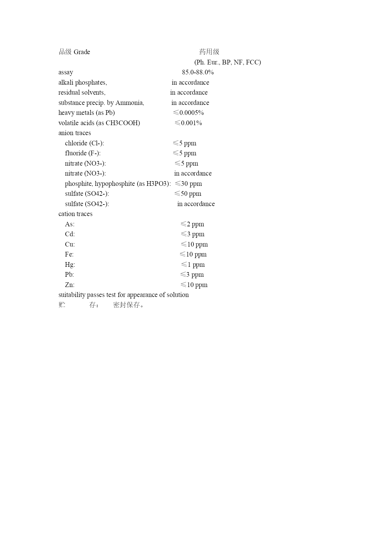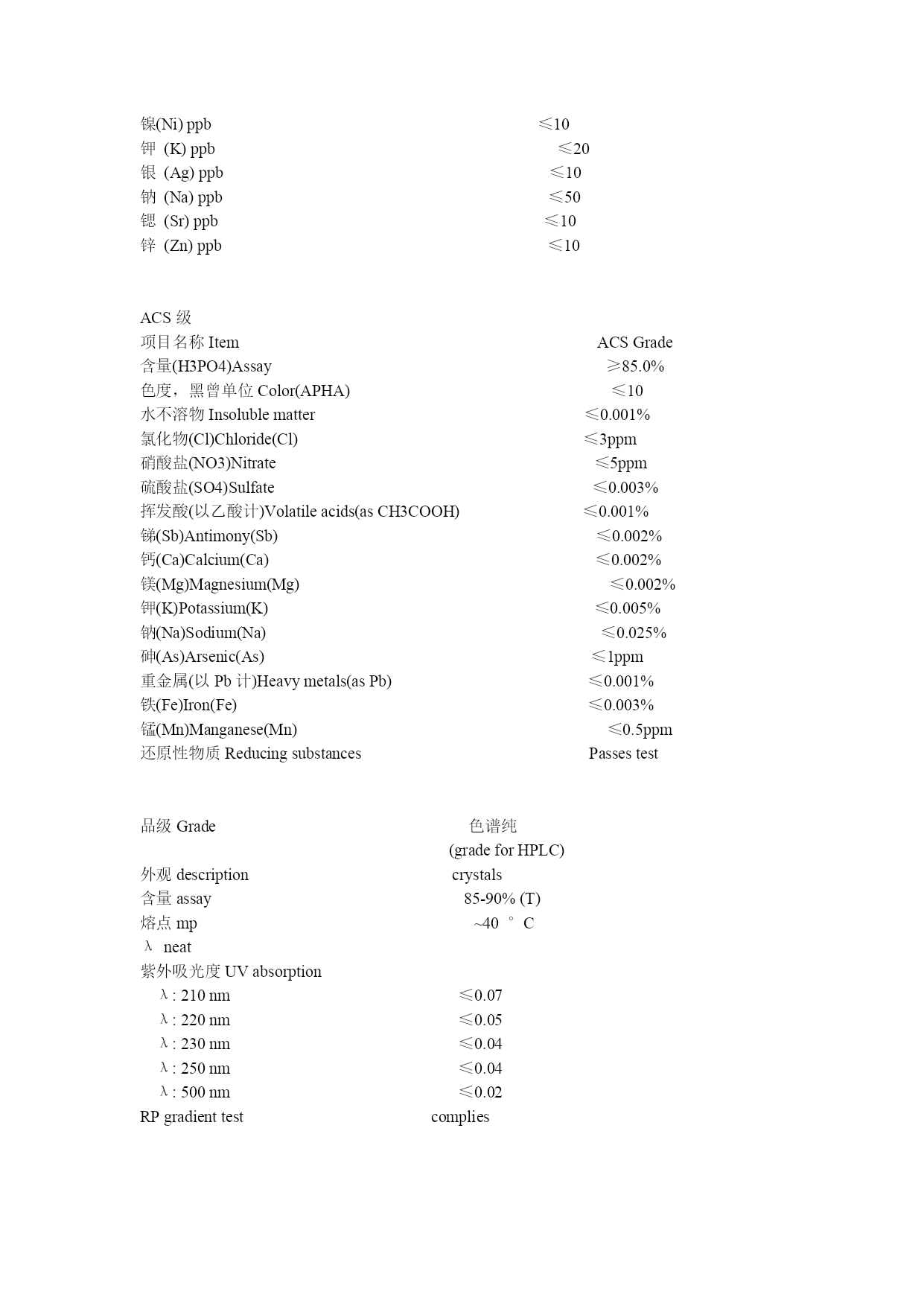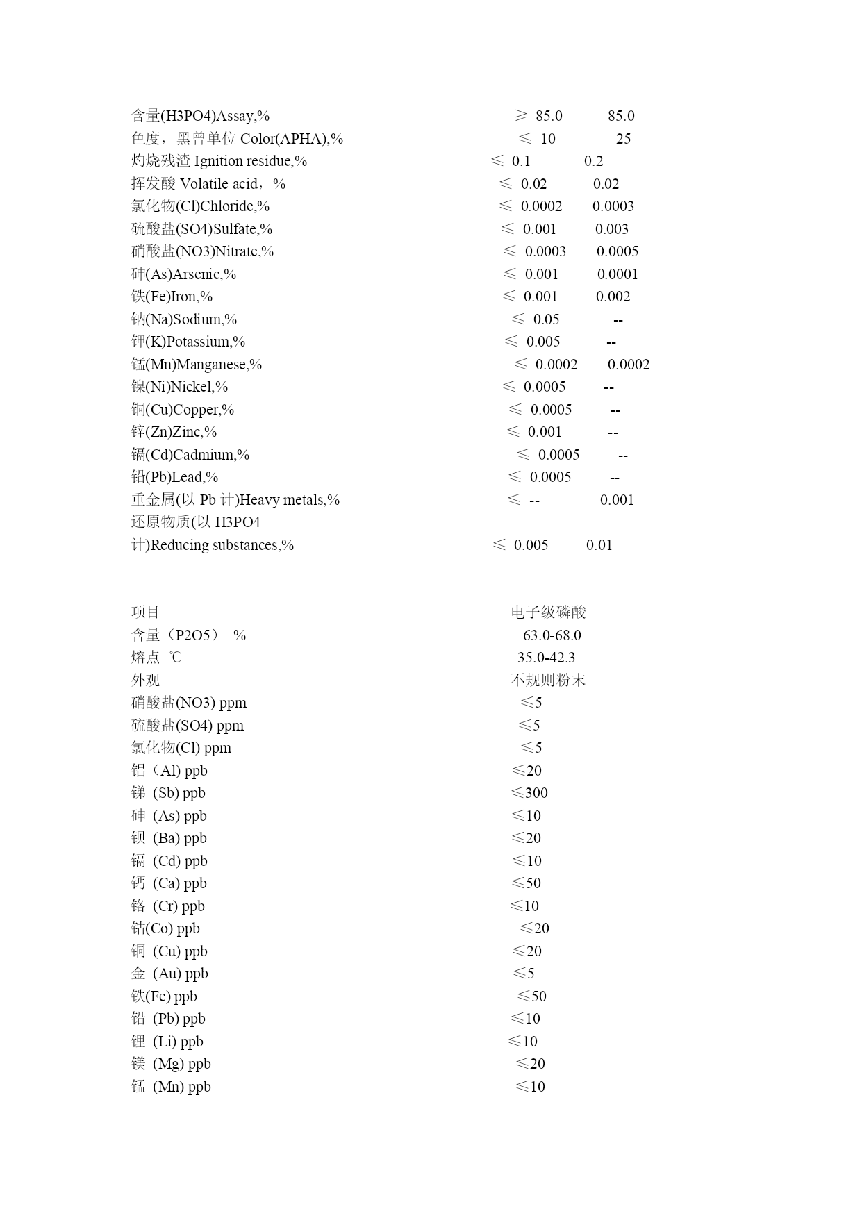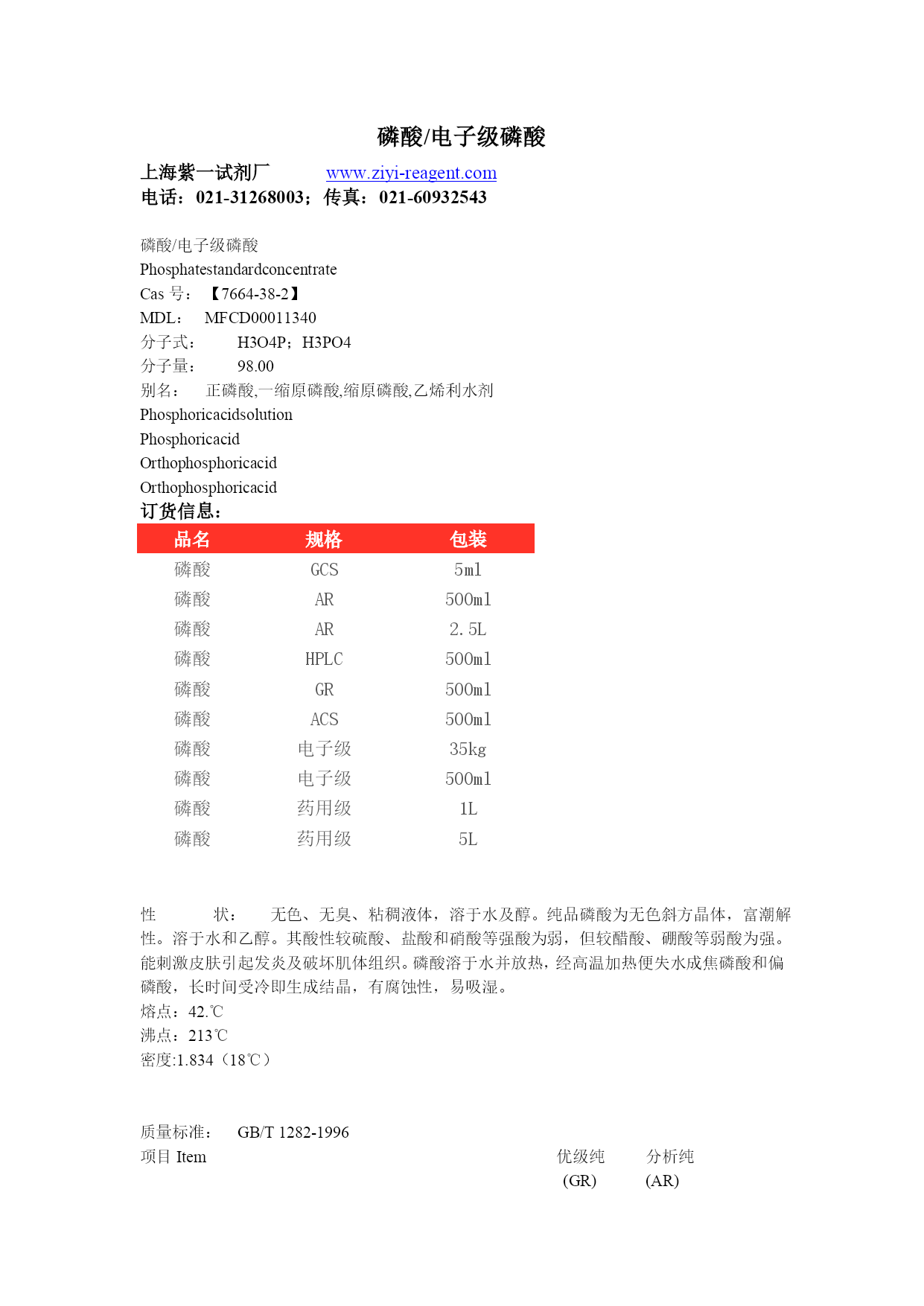 磷酸/电子级磷酸上海紫一试剂厂HYPERLINK"http://www.ziyi-reagent.com"www.ziyi-reagent.com电话:021-31268003;传真:021-60932543磷酸/电子级磷酸PhosphatestandardconcentrateCas号:【7664-38-2】MDL:MFCD00011340分子式:H3O4P;H3PO4分子量:98.00别名:正磷酸,一缩原磷酸,缩原磷酸,乙烯利水剂PhosphoricacidsolutionPhosphoricacidOrthophosphoricacidOrthophosphoricacid订货信息:品名规格包装磷酸GCS5ml磷酸AR500ml磷酸AR2.5L磷酸HPLC500ml磷酸GR500ml磷酸ACS500ml磷酸电子级35kg磷酸电子级500ml磷酸药用级1L磷酸药用级5L性状:无色、无臭、粘稠液体,溶于水及醇。纯品磷酸为无色斜方晶体,富潮解性。溶于水和乙醇。其酸性较硫酸、盐酸和硝酸等强酸为弱,但较醋酸、硼酸等弱酸为强。能刺激皮肤引起发炎及破坏肌体组织。磷酸溶于水并放热,经高温加热便失水成焦磷酸和偏磷酸,长时间受冷即生成结晶,有腐蚀性,易吸湿。熔点:42.℃沸点:213℃密度:1.834(18℃)质量标准:GB/T1282-1996项目Item优级纯分析纯(GR)(AR)含量(H3PO4)Assay,%≥85.085.0色度,黑曾单位Color(APHA),%≤1025灼烧残渣Ignitionresidue,%≤0.10.2挥发酸Volatileacid,%≤0.020.02氯化物(Cl)Chloride,%≤0.00020.0003硫酸盐(SO4)Sulfate,%≤0.0010.003硝酸盐(NO3)Nitrate,%≤0.00030.0005砷(As)Arsenic,%≤0.0010.0001铁(Fe)Iron,%≤0.0010.002钠(Na)Sodium,%≤0.05--钾(K)Potassium,%≤0.005--锰(Mn)Manganese,%≤0.00020.0002镍(Ni)Nickel,%≤0.0005--铜(Cu)Copper,%≤0.0005--锌(Zn)Zinc,%≤0.001--镉(Cd)Cadmium,%≤0.0005--铅(Pb)Lead,%≤0.0005--重金属(以Pb计)Heavymetals,%≤--0.001还原物质(以H3PO4计)Reducingsubstances,%≤0.0050.01项目电子级磷酸含量(P2O5)%63.0-68.0熔点℃35.0-42.3外观不规则粉末硝酸盐(NO3)ppm≤5硫酸盐(SO4)ppm≤5氯化物(Cl)ppm≤5铝(Al)ppb≤20锑(Sb)ppb≤300砷(As)ppb≤10钡(Ba)ppb≤20镉(Cd)ppb≤10钙(Ca)ppb≤50铬(Cr)ppb≤10钴(Co)ppb≤20铜(Cu)ppb≤20金(Au)ppb≤5铁(Fe)ppb≤50铅(Pb)ppb≤10锂(Li)ppb≤10镁(Mg)ppb≤20锰(Mn)ppb≤10镍(Ni)ppb≤10钾(K)ppb≤20银(Ag)ppb≤10钠(Na)ppb≤50锶(Sr)ppb≤10锌(Zn)ppb≤10ACS级项目名称ItemACSGrade含量(H3PO4)Assay≥85.0%色度,黑曾单位Color(APHA)≤10水不溶物Insolublematter≤0.001%氯化物(Cl)Chloride(Cl)≤3ppm硝酸盐(NO3)Nitrate≤5ppm硫酸盐(SO4)Sulfate≤0.003%挥发酸(以乙酸计)Volatileacids(asCH3COOH)≤0.001%锑(Sb)Antimony(Sb)≤0.002%钙(Ca)Calcium(Ca)≤0.002%镁(Mg)Magnesium(Mg)≤0.002%钾(K)Potassium(K)≤0.005%钠(Na)Sodium(Na)≤0.025%砷(As)Arsenic(As)≤1ppm重金属(以Pb计)Heavymetals(asPb)≤0.001%铁(Fe)Iron(Fe)≤0.003%锰(Mn)Manganese(Mn)≤0.5ppm还原性物质ReducingsubstancesPassestest品级Grade色谱纯(gradeforHPLC)外观descriptioncrystals含量assay85-90%(T)熔点mp~40°Cλneat紫外吸光度UVabsorptionλ:210nm≤0.07λ:220nm≤0.05λ:230nm≤0.04λ:250nm≤0.04λ:500nm≤0.02RPgra