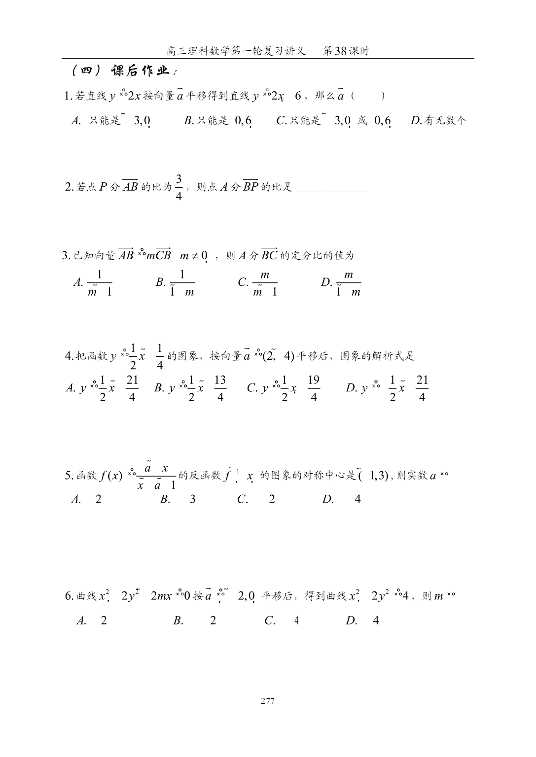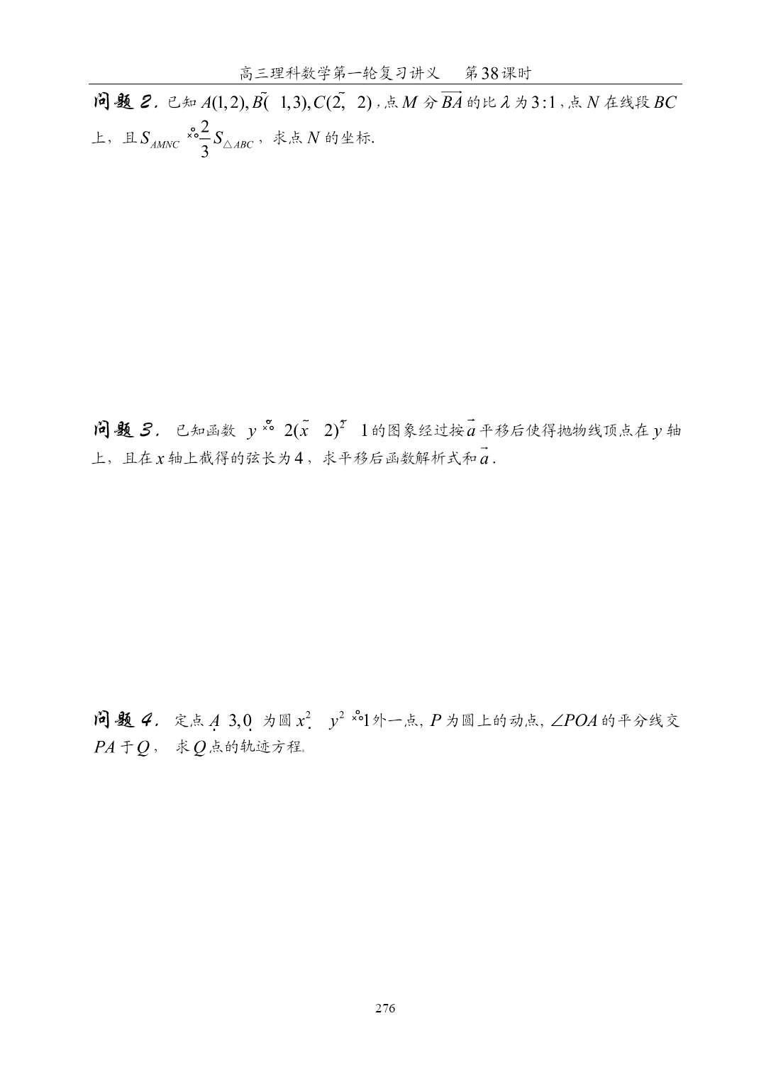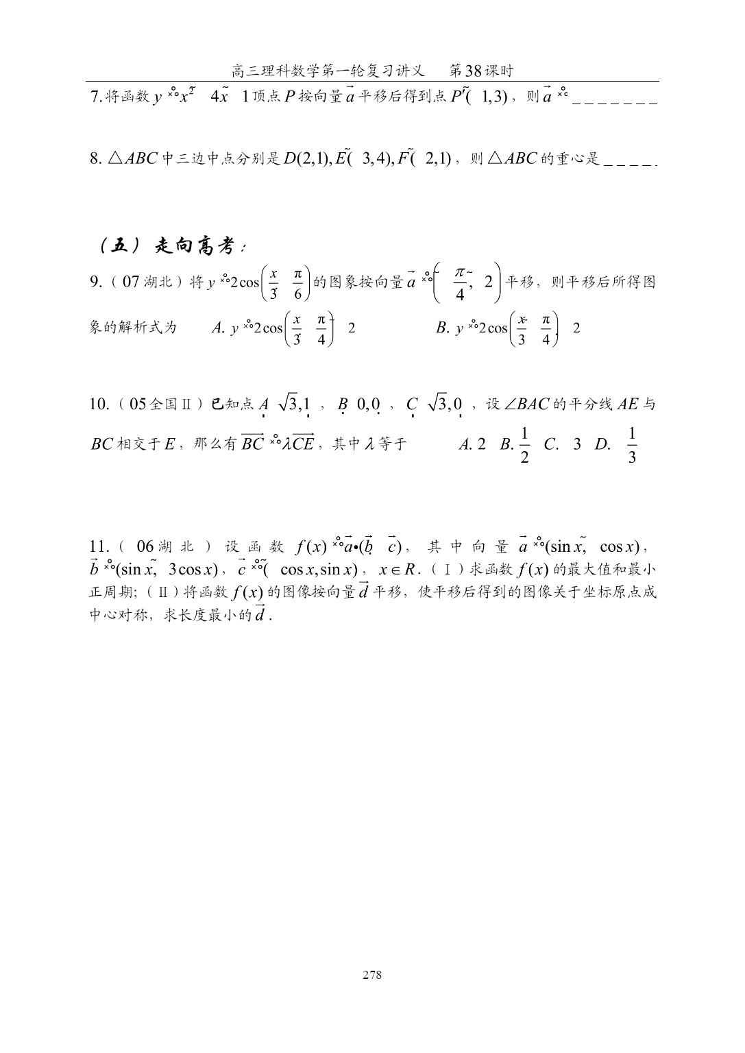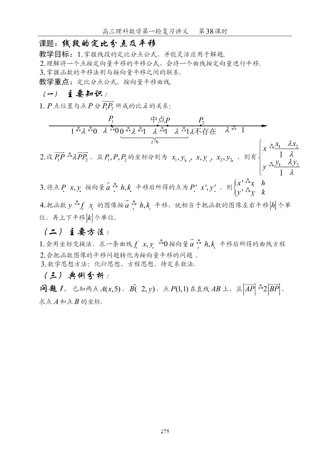 高三理科数学第一轮复习讲义第课时课题:线段的定比分点及平移教学目标:掌握线段的定比分点公式,并能灵活应用于解题.理解将一个点按定向量平移的平移公式,会将一个曲线按定向量进行平移.掌握函数的平移法则与按向量平移之间的联系.教学重点:定比分点公式,按向量平移曲线.(一)主要知识:点位置与点分所成的比的关系:设,且的坐标分别为,则有将点按向量平移后所得的点为,则把函数的图像按平移,就相当于把函数的图像左右平移个单位,再上下平移个单位.(二)主要方法:会用坐标变换法,求一条曲线按向量平移后所得的曲线方程会把函数图像的平移问题转化为按向量平移的问题.数学思想方法:化归思想、方程思想、待定系数法.(三)典例分析:问题1.已知两点,,点在直线上,且,求点和点的坐标.问题2.已知,点分的比为,点在线段上,且,求点的坐标.问题3.已知函数的图象经过按平移后使得抛物线顶点在轴上,且在轴上截得的弦长为,求平移后函数解析式和.问题4.定点为圆外一点,为圆上的动点,的平分线交于,求点的轨迹方程(四)课后作业:若直线按向量平移得到直线,那么()只能是只能是只能是或有无数个若点分的比为,则点分的比是已知向量,则分的定分比的值为把函数的图象,按向量平移后,图象的解析式是函数的反函数的图象的对称中心是,则实数曲线按平移后,得到曲线,则将函数顶点按向量平移后得到点,则中三边中点分别是,则的重心是(五)走向高考:(湖北)将的图象按向量平移,则平移后所得图象的解析式为(全国Ⅱ)已知点,,,设的平分线与相交于,那么有,其中等于(湖北)设函数,其中向量,,,.(Ⅰ)求函数的最大值和最小正周期;(Ⅱ)将函数的图像按向量平移,使平移后得到的图像关于坐标原点成中心对称,求长度最小的.