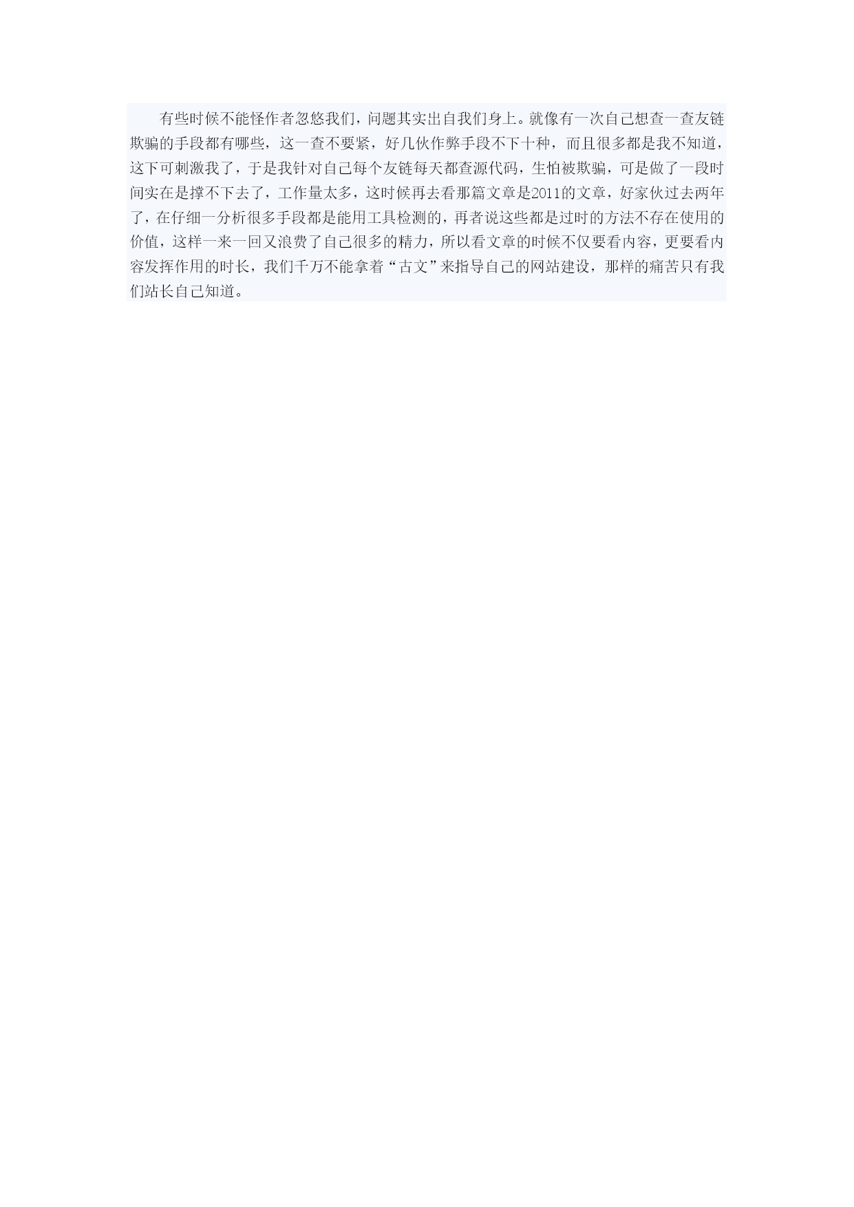 站长论坛分享泛滥,我们到底该相信谁来源:HYPERLINK"http://www.sfztc.com/"黑眼圈怎么去除HYPERLINK"http://www.sfztc.com/"http://www.sfztc.com/没有案例和数据作为基础的文章不去信就像林衍自己的经历一样,站长论坛上有着太多人云亦云的文章,从我的角度上看,文章说理的确很透彻,也有一定的道理,但我毕竟是新手,很多方面的经验还不是很丰富,如果单纯的相信他们,而没有自己的辨别能力,那么被忽悠的只能是我们自己,所以当他们看到什么“神人3月关键词上首页”、“百度拔毛第二天恢复”的时候,千万不要丧失自己的抵抗力,如果对方提供不了有力的案例和数据作为说明,我们可以认为他就是在忽悠我们。对于大家都比较模糊的观点,要听一半,信一半就像大家在参与SEO培训时候一样,对于讲师说的话我们要取其精华,去其糟粕,毕竟SEO或站长行业日新月异,别人的理解有别人的依据,我们还是要有自己的思考。就像前段时间百度大更新一样,很多站长都在说SEO已经没用,很多正规网站都躺着中枪,可是不可否认的是网站优化仍然是我们目前获取持续流量的最实惠方法,我们能说放弃就放弃吗?所以无论别人举了多少例子,上了多少张图,咱们总归是要有自己的思考,尤其是在一些模棱两可的观点上,更不能偏激的偏向任何一方,而要根据自己的思考做出理想的判断。“行”或是“不行”的信息大家少看说实话互联网哪有这么多“行”或是“不行”,很多时候就是一个度的问题。就像咱们的大家口中说的动态画面一样,大家常说蜘蛛不会抓取图片上的内容,反而会影响网站的加载速度,可是我们要想让自己的网站美观不加图片怎么行,尤其是我做十字绣,全站都是文字谁会喜欢?还有大家都知道网站交互功能会提升我们的用户体验,但同时太多的交互功能会让MYSQL数据库运转的混乱,严重的时候会让数据连接以及转化时出现乱码,可是这能说法我们放弃UI吗?所以很多时候站长行业没有这么多“行”或是“不行”,只有“多少”的考虑,而这点上,各位还是要有自己的考量,不能单纯的相信别人说的话。对于新手同行的分享要多想多看多思考相信各位站长都有自己的偶像,就像林衍一样,我就比较喜欢卢松松老师,他对于互联网的见解就很深刻,当然大家也可以喜欢非生客、月光宝盒之类的作者,每当他们在站长网站上发表文章的时候总是能引来众多人的追捧。追捧归追捧,对于新手同行的意见和分享我们也要当回事。原因很简单,他们是基础工作者,因为自身阅历的限制,他们对于网站的理解和操作都处于基础阶段,但就是这样来自最基层的朋友(包括我自己)分享出来的东西是最接地气的,他们对于网站的分析是最理性的,反而没有过多的修饰,所以从我们这些IT民工的文章中大家一定可以找到行业发展的最前沿。对于时间观念强的分享要格外注意有些时候不能怪作者忽悠我们,问题其实出自我们身上。就像有一次自己想查一查友链欺骗的手段都有哪些,这一查不要紧,好几伙作弊手段不下十种,而且很多都是我不知道,这下可刺激我了,于是我针对自己每个友链每天都查源代码,生怕被欺骗,可是做了一段时间实在是撑不下去了,工作量太多,这时候再去看那篇文章是2011的文章,好家伙过去两年了,在仔细一分析很多手段都是能用工具检测的,再者说这些都是过时的方法不存在使用的价值,这样一来一回又浪费了自己很多的精力,所以看文章的时候不仅要看内容,更要看内容发挥作用的时长,我们千万不能拿着“古文”来指导自己的网站建设,那样的痛苦只有我们站长自己知道。