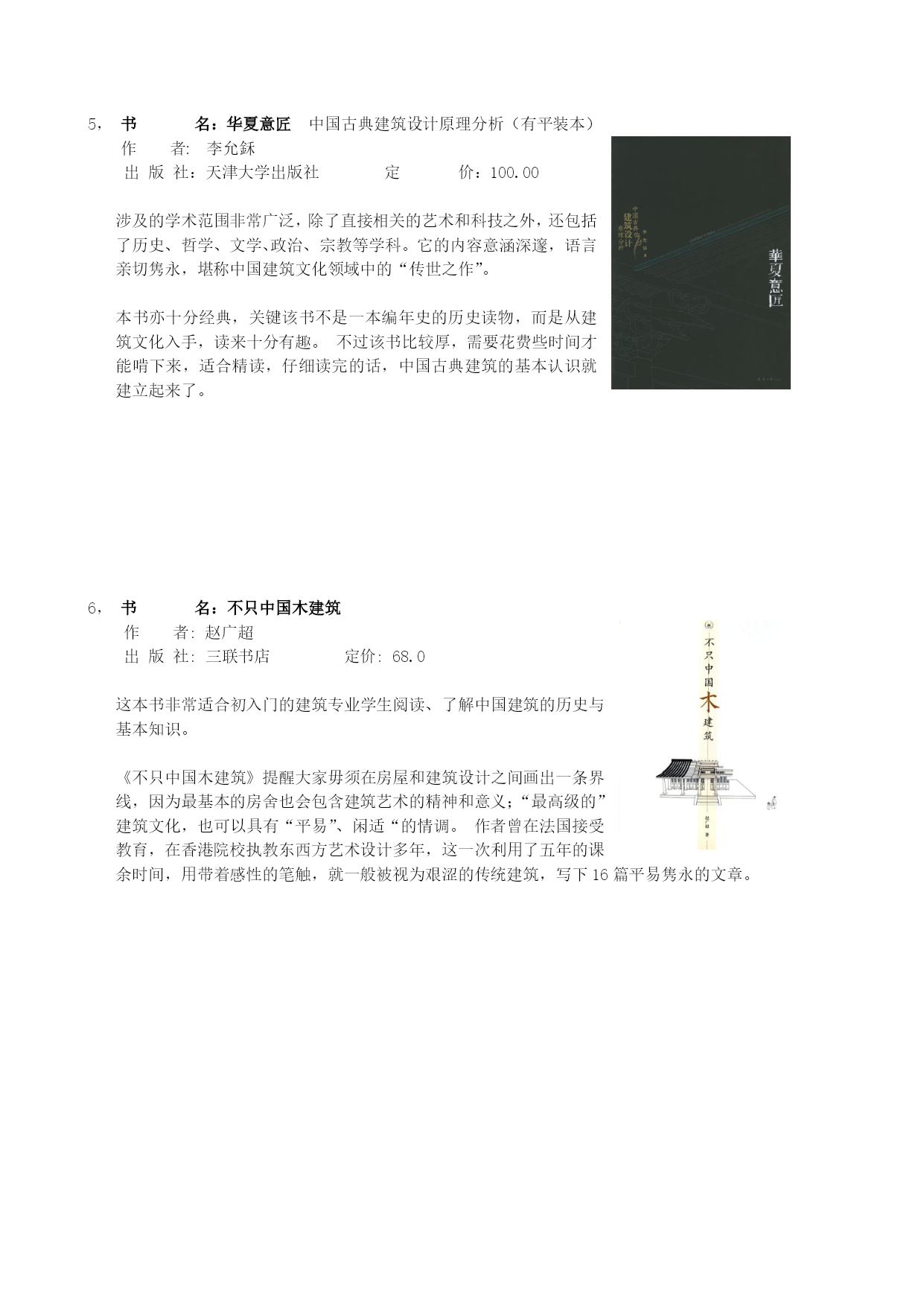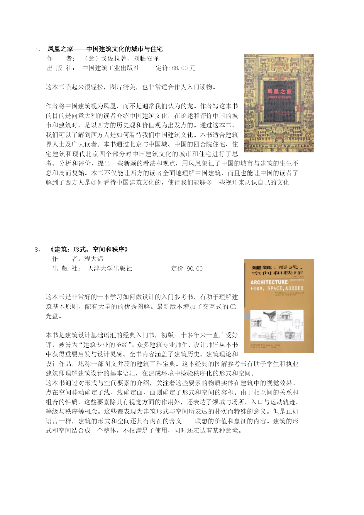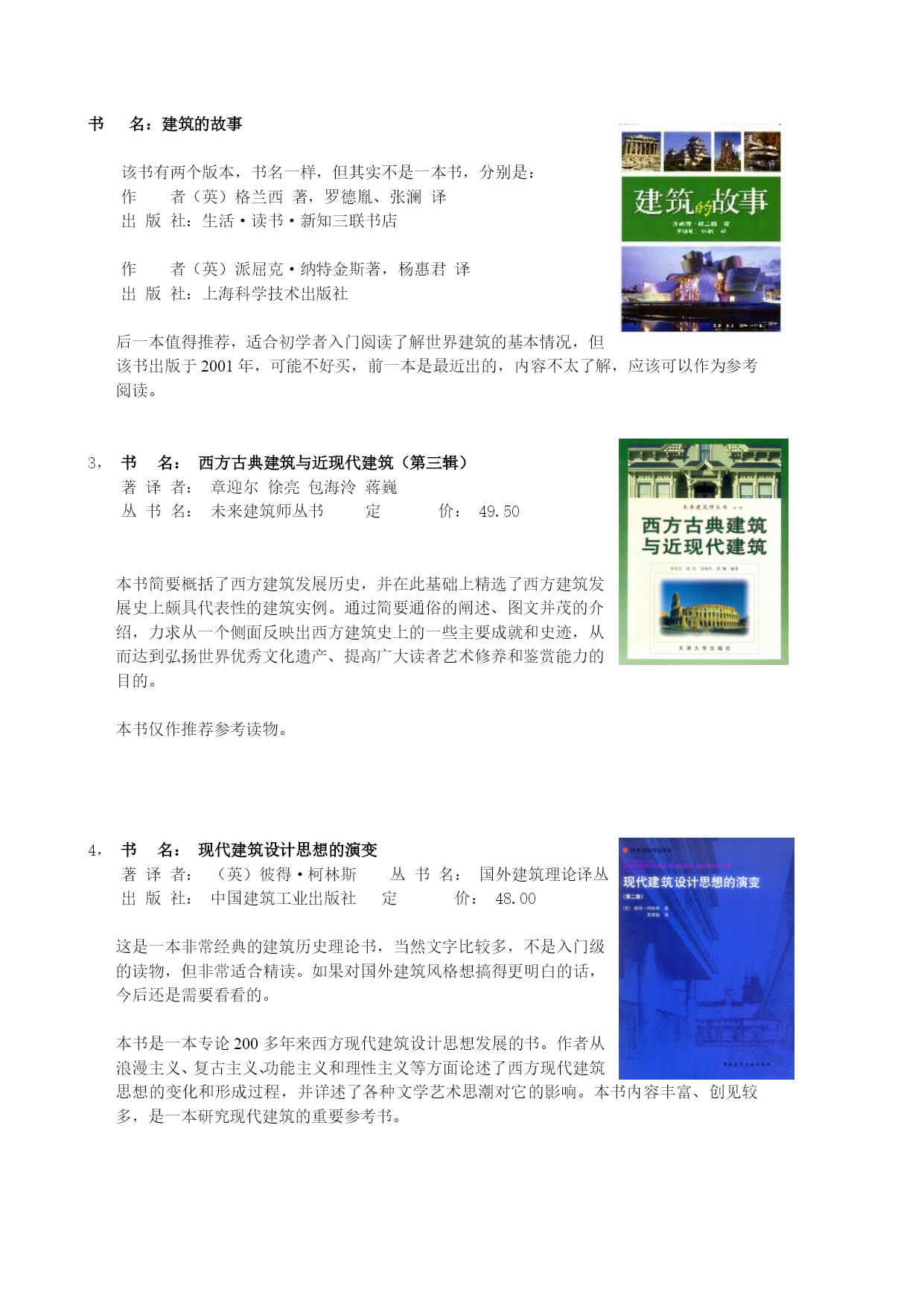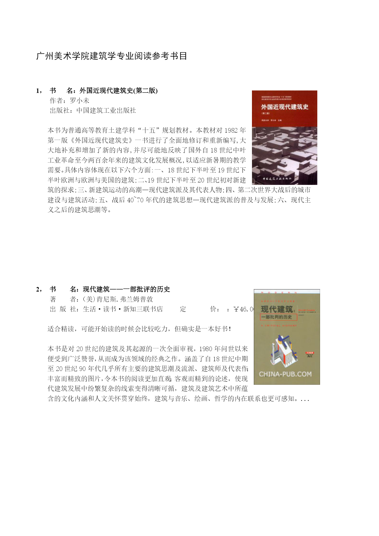 广州美术学院建筑学专业阅读参考书目书名:外国近现代建筑史(第二版)作者:罗小未出版社:中国建筑工业出版社本书为普通高等教育土建学科“十五”规划教材。本教材对1982年第一版《外国近现代建筑史》一书进行了全面地修订和重新编写,大大地补充和增加了新的内容,并尽可能地反映了国外自18世纪中叶工业革命至今两百余年来的建筑文化发展概况,以适应新暑期的教学需要。具体内容体现在以下六个方面:一、18世纪下半叶至19世纪下半叶欧洲与欧洲与美国的建筑;二、19世纪下半叶至20世纪初对新建筑的探求;三、新建筑运动的高潮—现代建筑派及其代表人物;四、第二次世界大战后的城市建设与建筑活动;五、战后40~70年代的建筑思想—现代建筑派的普及与发展;六、现代主义之后的建筑思潮等。书名:现代建筑——一部批评的历史著者:(美)肯尼斯.弗兰姆普敦HYPERLINK"http://baike.baidu.com/view/49852.htm"\t"_blank"出版社:HYPERLINK"http://baike.baidu.com/view/1110095.htm"\t"_blank"生活·读书·新知三联书店定价::¥46.00适合精读,可能开始读的时候会比较吃力,但确实是一本好书!本书是对20世纪的建筑及其起源的一次全面审视,1980年问世以来便受到广泛赞誉,从而成为该领域的经典之作。涵盖了自18世纪中期至20世纪90年代几乎所有主要的建筑思潮及流派、建筑师及代表作;丰富而精致的图片,令本书的阅读更加直观;客观而精到的论述,使现代建筑发展中纷繁复杂的线索变得清晰可循,建筑及建筑艺术中所蕴含的文化内涵和人文关怀贯穿始终,建筑与音乐、绘画、哲学的内在联系也更可感知。...书名:建筑的故事该书有两个版本,书名一样,但其实不是一本书,分别是:作者(英)格兰西著,罗德胤、张澜译HYPERLINK"http://baike.baidu.com/view/49852.htm"\t"_blank"出版社:HYPERLINK"http://baike.baidu.com/view/1110095.htm"\t"_blank"生活·读书·新知三联书店作者(英)派屈克·纳特金斯著,杨惠君译HYPERLINK"http://baike.baidu.com/view/49852.htm"\t"_blank"出版社:HYPERLINK"http://baike.baidu.com/view/1110095.htm"\t"_blank"上海科学技术出版社后一本值得推荐,适合初学者入门阅读了解世界建筑的基本情况,但该书出版于2001年,可能不好买,前一本是最近出的,内容不太了解,应该可以作为参考阅读。书名:西方古典建筑与近现代建筑(第三辑)著译者:章迎尔徐亮包海泠蒋巍丛书名:未来建筑师丛书定价:49.50本书简要概括了西方建筑发展历史,并在此基础上精选了西方建筑发展史上颇具代表性的建筑实例。通过简要通俗的阐述、图文并茂的介绍,力求从一个侧面反映出西方建筑史上的一些主要成就和史迹,从而达到弘扬世界优秀文化遗产、提高广大读者艺术修养和鉴赏能力的目的。本书仅作推荐参考读物。书名:现代建筑设计思想的演变著译者:(英)彼得·柯林斯丛书名:国外建筑理论译丛出版社:中国建筑工业出版社定价:48.00这是一本非常经典的建筑历史理论书,当然文字比较多,不是入门级的读物,但非常适合精读。如果对国外建筑风格想搞得更明白的话,今后还是需要看看的。本书是一本专论200多年来西方现代建筑设计思想发展的书。作者从浪漫主义、复古主义、功能主义和理性主义等方面论述了西方现代建筑思想的变化和形成过程,并详述了各种文学艺术思潮对它的影响。本书内容丰富、创见较多,是一本研究现代建筑的重要参考书。书名:华夏意匠中国古典建筑设计原理分析(有平装本)作者:李允鉌出版社:天津大学出版社定价:100.00涉及的学术范围非常广泛,除了直接相关的艺术和科技之外,还包括了历史、哲学、文学、政治、宗教等学科。它的内容意涵深邃,语言亲切隽永,堪称中国建筑文化领域中的“传世之作”。本书亦十分经典,关键该书不是一本编年史的历史读物,而是从建筑文化入手,读来十分有趣。不过该书比较厚,需要花费些时间才能啃下来,适合精读,仔细读完的话,中国古典建筑的基本认识就建立起来了。书名:不只中国木建筑作者:HYPERLINK"http://www.douban.com/book/search/%E8%B5%B5%E5%B9%BF%E8%B6%85"赵广超出版社:三联书店定价:68.0这本书非常适合初入门的建筑专业学生阅读、了解中国建筑的历史与基本知识。《不只中国木建筑》提醒大家毋须在房屋和建筑设计之间画出一条界线,因为最基本的