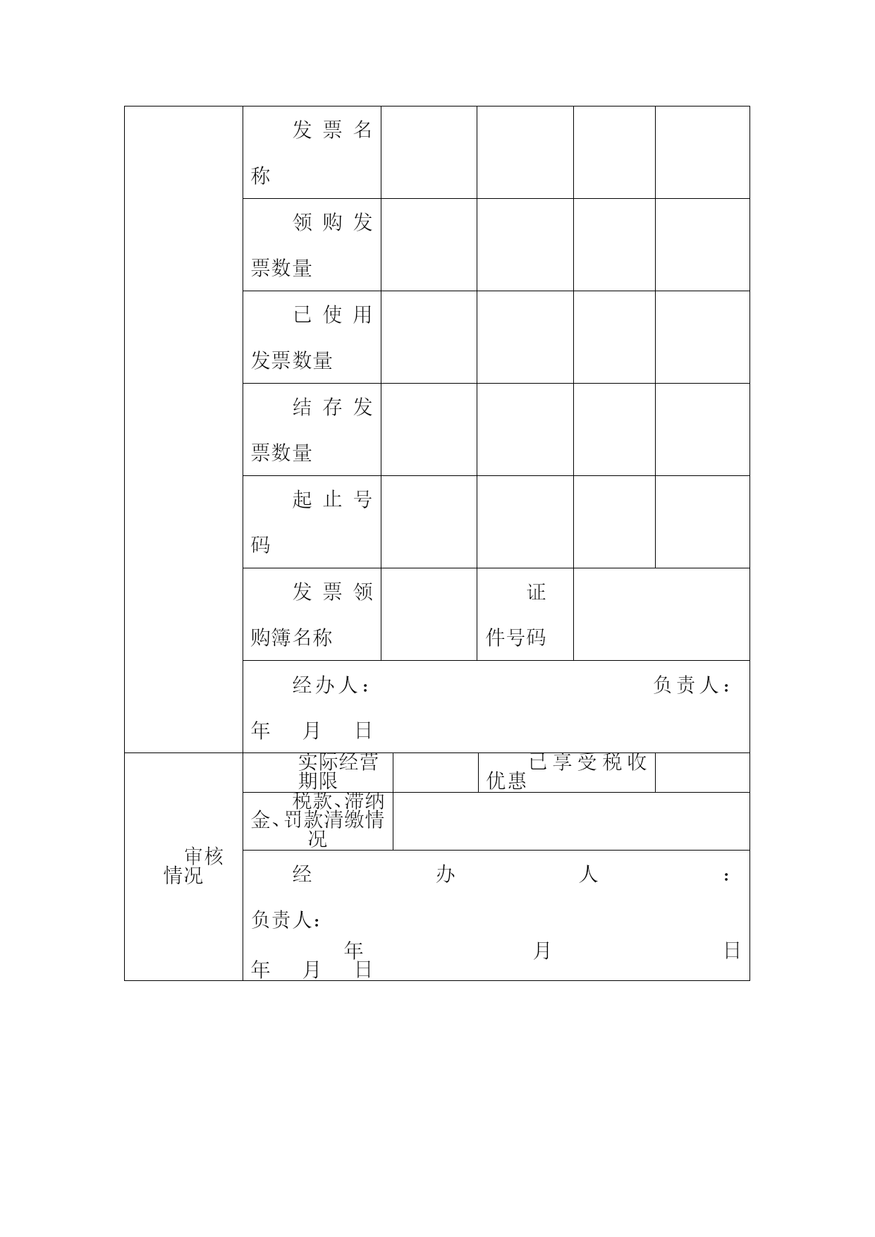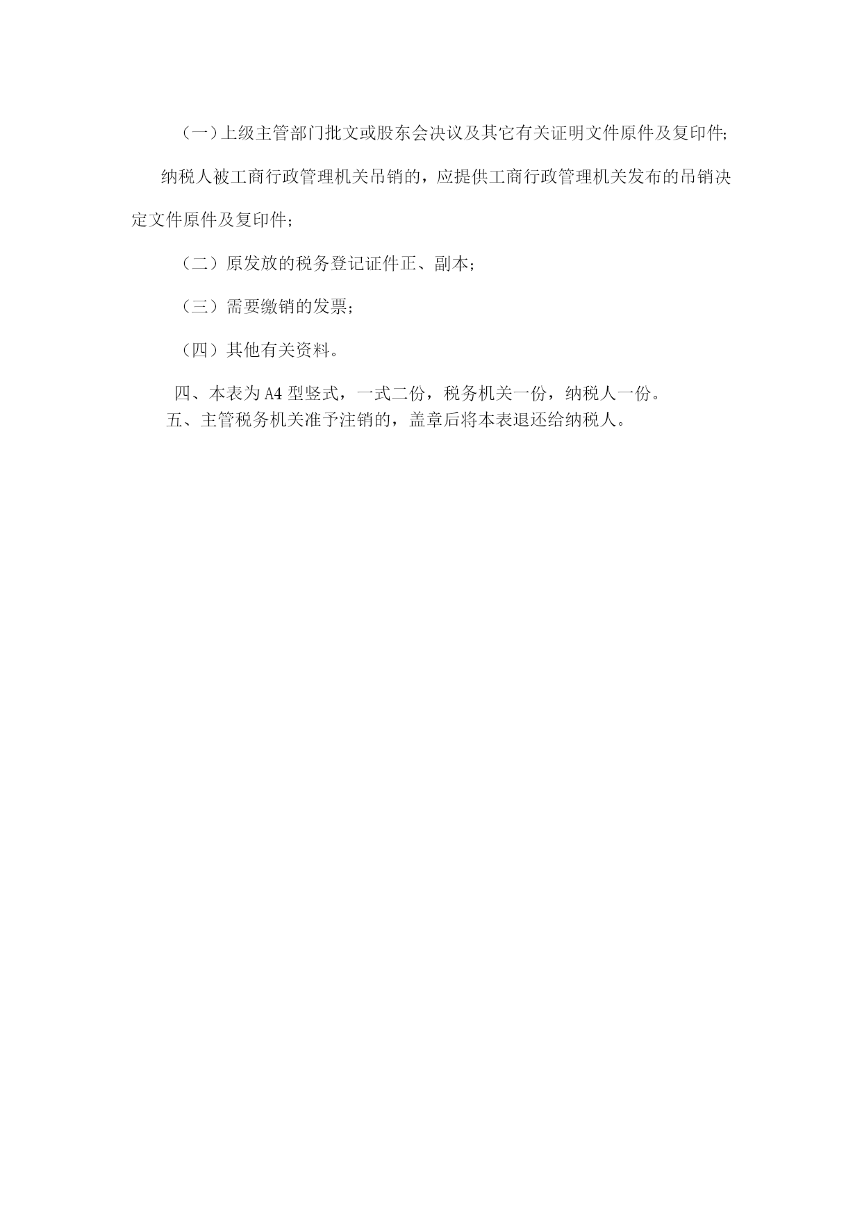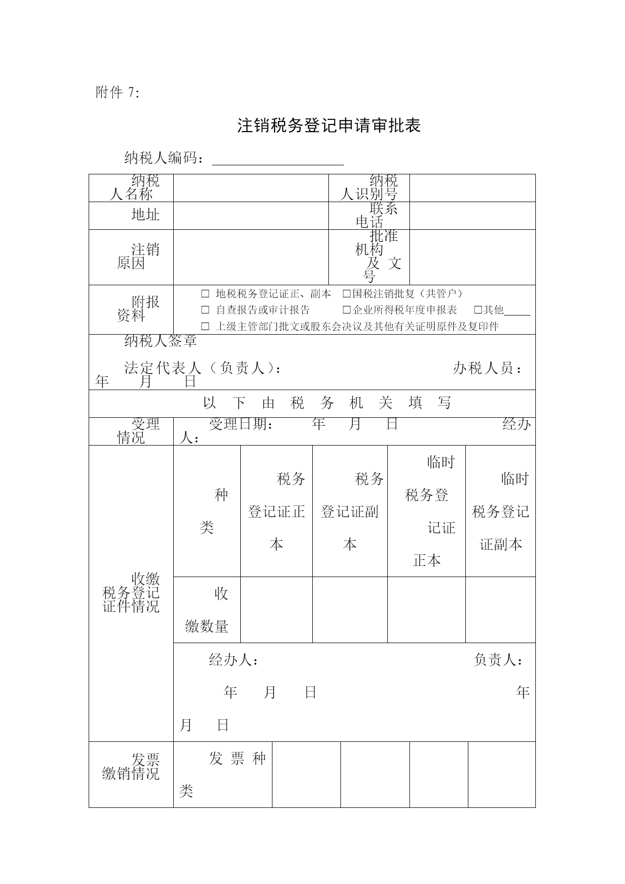 附件7:注销税务登记申请审批表纳税人编码:纳税人名称纳税人识别号地址联系电话注销原因批准机构及文号附报资料□地税税务登记证正、副本□国税注销批复(共管户)□自查报告或审计报告□企业所得税年度申报表□其他□上级主管部门批文或股东会决议及其他有关证明原件及复印件纳税人签章法定代表人(负责人):办税人员:年月日以下由税务机关填写受理情况受理日期:年月日经办人:收缴税务登记证件情况种类税务登记证正本税务登记证副本临时税务登记证正本临时税务登记证副本收缴数量经办人:负责人:年月日年月日发票缴销情况发票种类发票名称领购发票数量已使用发票数量结存发票数量起止号码发票领购簿名称证件号码经办人:负责人:年月日审核情况实际经营期限已享受税收优惠税款、滞纳金、罚款清缴情况经办人:负责人:年月日年月日实地调查核实情况经办人:负责人:年月日年月日稽查情况经办人:负责人:年月日年月日批准意见局长签字:主管税务机关盖章年月日年月日使用说明一、本表依据《广东省地方税务局注销税务登记管理办法》设置。二、适用范围:纳税人、扣缴义务人(以下简称“纳税人”)发生解散、破产、撤销、被吊销营业执照及其他情形而依法终止纳税义务,或者因住所、经营地点变动而涉及改变税务登记机关的,向原税务登记机关申报办理注销税务登记时使用。三、纳税人办理注销登记时,应根据不同情况向主管地方税务机关如实提供以下证件和资料:(一)上级主管部门批文或股东会决议及其它有关证明文件原件及复印件;纳税人被工商行政管理机关吊销的,应提供工商行政管理机关发布的吊销决定文件原件及复印件;(二)原发放的税务登记证件正、副本;(三)需要缴销的发票;(四)其他有关资料。四、本表为A4型竖式,一式二份,税务机关一份,纳税人一份。五、主管税务机关准予注销的,盖章后将本表退还给纳税人。