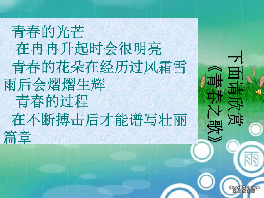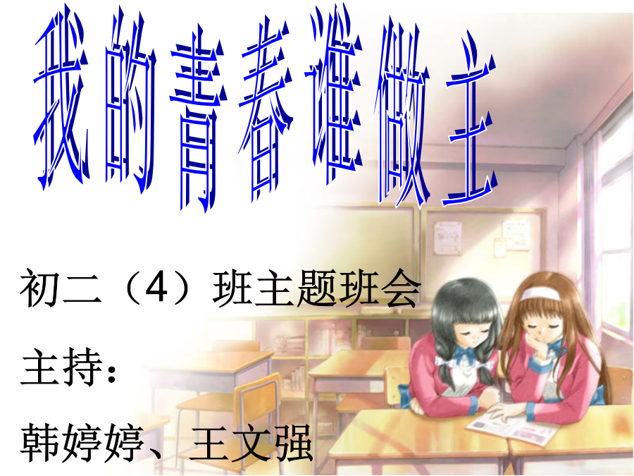 我的青春谁做主踏着青春的步伐,跨进初中的大门,你……青春的光芒在冉冉升起时会很明亮青春的花朵在经历过风霜雪雨后会熠熠生辉青春的过程在不断搏击后才能谱写壮丽篇章帅呆了~~这些情况在同学们中时有发生,想想自己来学校的目的是什么?下面请大家来谈谈对学习的看法。一、学习你觉得苦吗?那他们呢?如果你说苦,那她们呢?试问:我们还有理由不珍惜我们所拥有学习的机会吗?时刻问问自己努力了没有?我们真正把精力放在学习上了没有?二、生活你觉得苦吗?B、也许你会觉得自己的伙食太差了,住宿条件太差了、、、、、、为了给孩子上学我们凭什么荒废自己的青春,凭什么无视父母的期待,凭什么只顾自己的快乐而忽视那些爱我的人们?!凭什么?!我们要和别人比明天!!!哪个才是你梦想的“天空”你不学习没关系,但你要想一想,你一时的快乐会伤害谁?我的青春我做主为梦想为自己班主任寄语初二(4)版主题班会到此结束