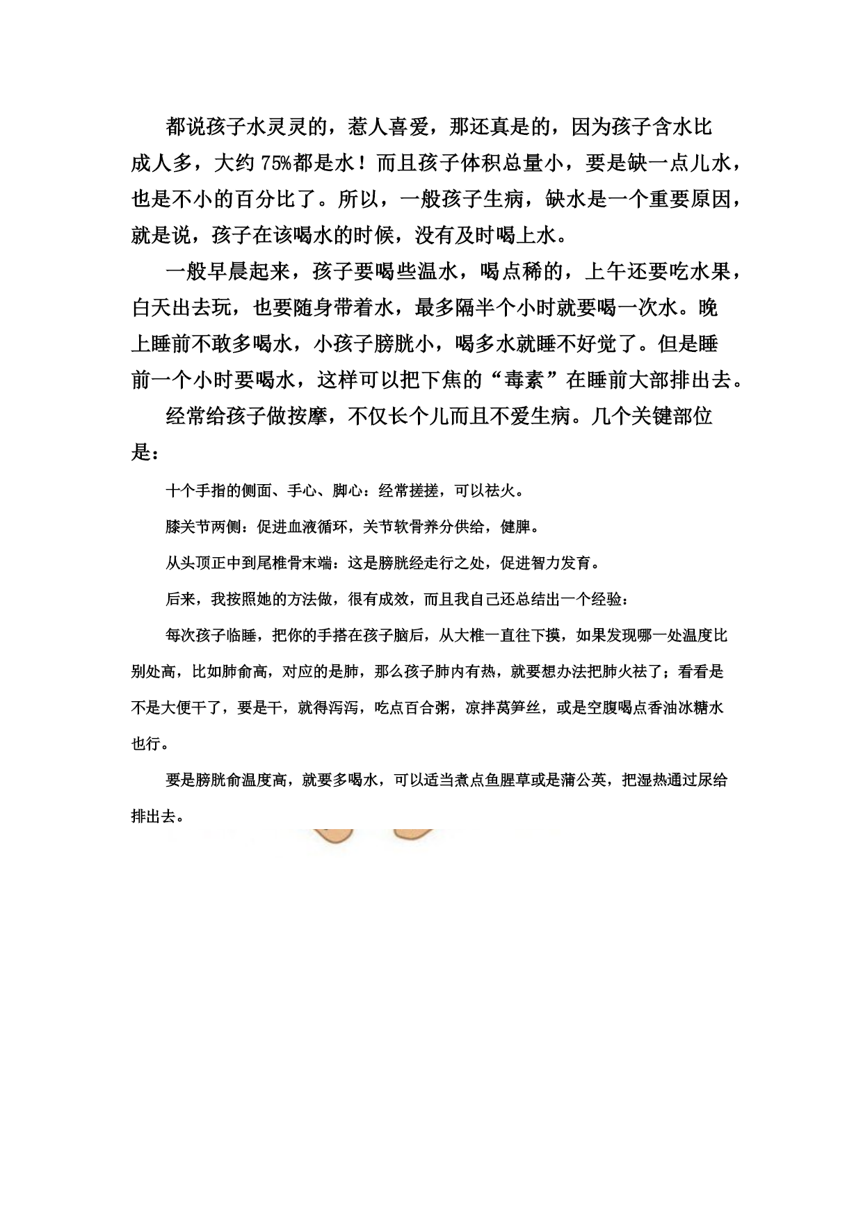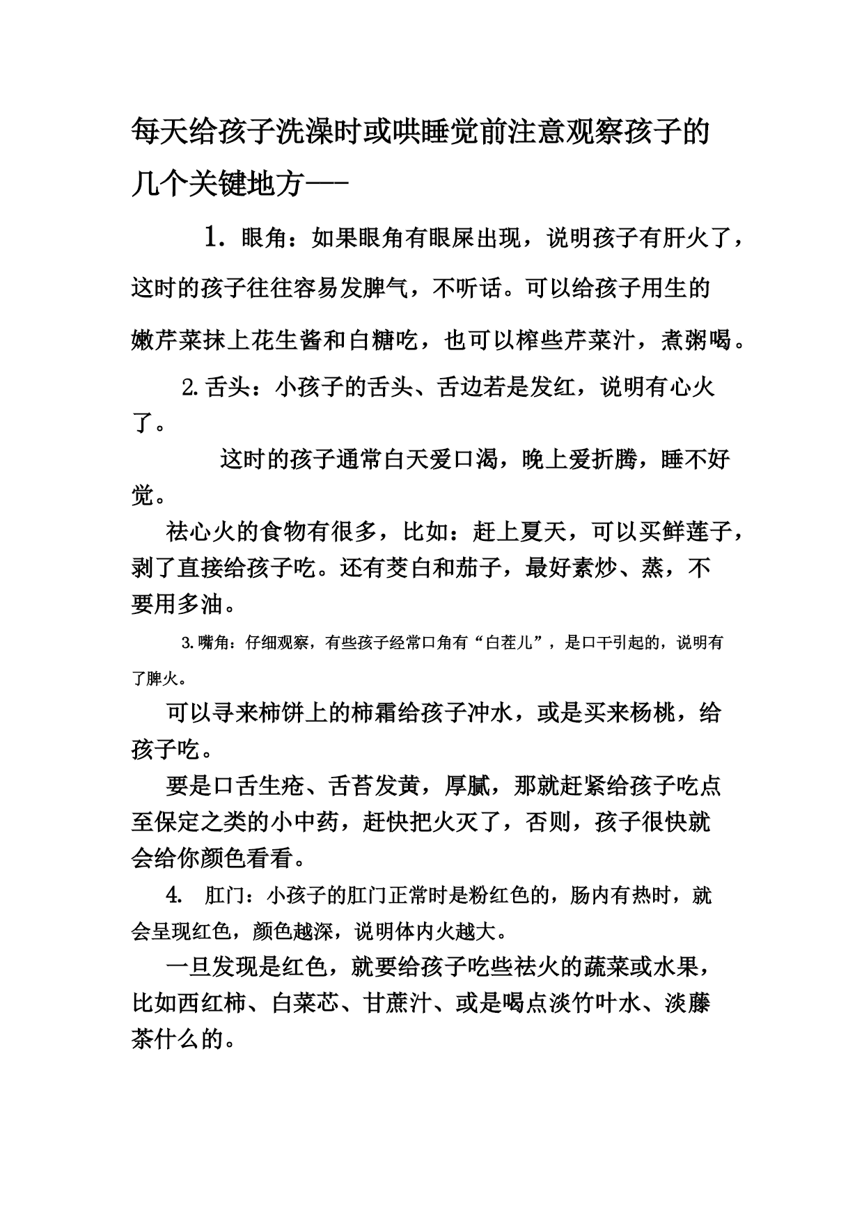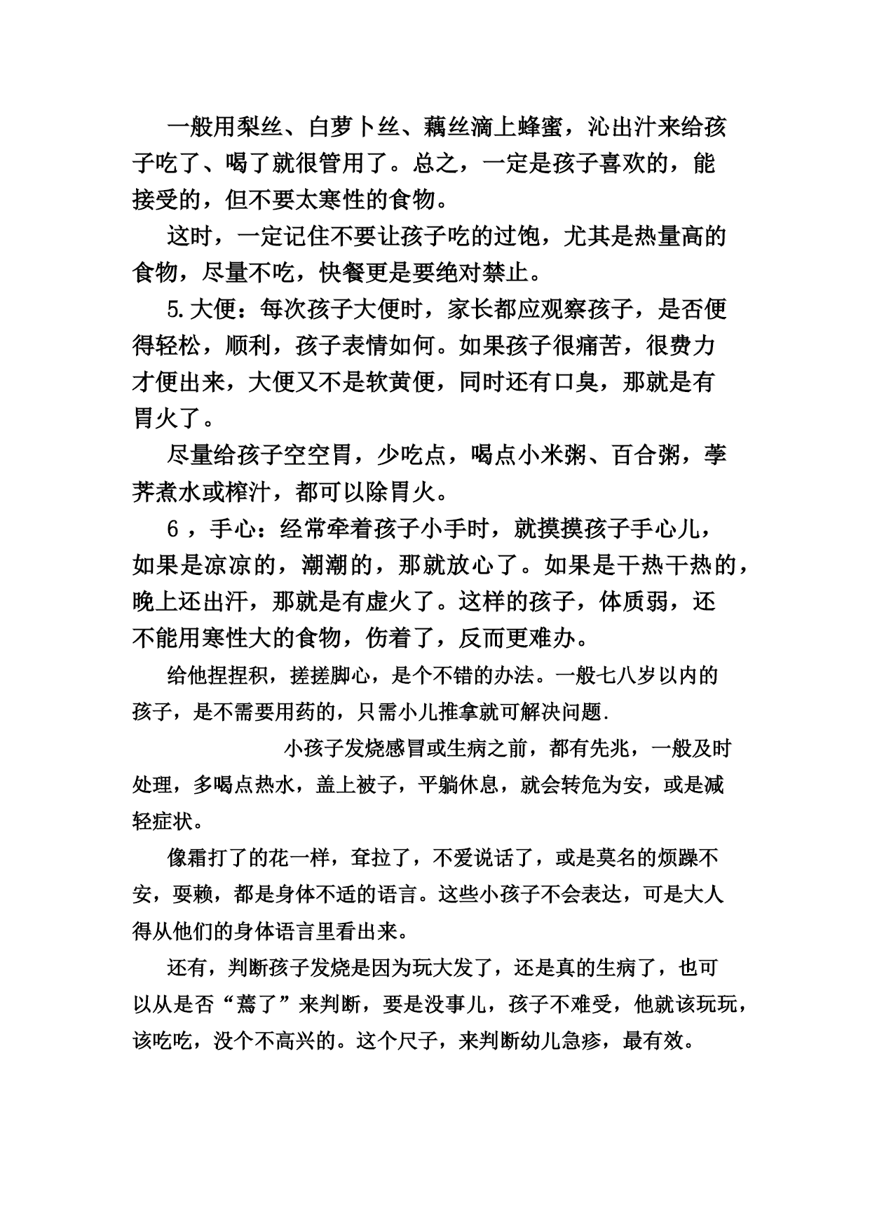 每天给孩子洗澡时或哄睡觉前注意观察孩子的几个关键地方---1.眼角:如果眼角有眼屎出现,说明孩子有肝火了,这时的孩子往往容易发脾气,不听话。可以给孩子用生的嫩芹菜抹上花生酱和白糖吃,也可以榨些芹菜汁,煮粥喝。2.舌头:小孩子的舌头、舌边若是发红,说明有心火了。这时的孩子通常白天爱口渴,晚上爱折腾,睡不好觉。祛心火的食物有很多,比如:赶上夏天,可以买鲜莲子,剥了直接给孩子吃。还有茭白和茄子,最好素炒、蒸,不要用多油。3.嘴角:仔细观察,有些孩子经常口角有“白茬儿”,是口干引起的,说明有了脾火。可以寻来柿饼上的柿霜给孩子冲水,或是买来杨桃,给孩子吃。要是口舌生疮、舌苔发黄,厚腻,那就赶紧给孩子吃点至保定之类的小中药,赶快把火灭了,否则,孩子很快就会给你颜色看看。4.肛门:小孩子的肛门正常时是粉红色的,肠内有热时,就会呈现红色,颜色越深,说明体内火越大。一旦发现是红色,就要给孩子吃些祛火的蔬菜或水果,比如西红柿、白菜芯、甘蔗汁、或是喝点淡竹叶水、淡藤茶什么的。一般用梨丝、白萝卜丝、藕丝滴上蜂蜜,沁出汁来给孩子吃了、喝了就很管用了。总之,一定是孩子喜欢的,能接受的,但不要太寒性的食物。这时,一定记住不要让孩子吃的过饱,尤其是热量高的食物,尽量不吃,快餐更是要绝对禁止。5.大便:每次孩子大便时,家长都应观察孩子,是否便得轻松,顺利,孩子表情如何。如果孩子很痛苦,很费力才便出来,大便又不是软黄便,同时还有口臭,那就是有胃火了。尽量给孩子空空胃,少吃点,喝点小米粥、百合粥,荸荠煮水或榨汁,都可以除胃火。6,手心:经常牵着孩子小手时,就摸摸孩子手心儿,如果是凉凉的,潮潮的,那就放心了。如果是干热干热的,晚上还出汗,那就是有虚火了。这样的孩子,体质弱,还不能用寒性大的食物,伤着了,反而更难办。给他捏捏积,搓搓脚心,是个不错的办法。一般七八岁以内的孩子,是不需要用药的,只需小儿推拿就可解决问题.小孩子发烧感冒或生病之前,都有先兆,一般及时处理,多喝点热水,盖上被子,平躺休息,就会转危为安,或是减轻症状。像霜打了的花一样,耷拉了,不爱说话了,或是莫名的烦躁不安,耍赖,都是身体不适的语言。这些小孩子不会表达,可是大人得从他们的身体语言里看出来。还有,判断孩子发烧是因为玩大发了,还是真的生病了,也可以从是否“蔫了”来判断,要是没事儿,孩子不难受,他就该玩玩,该吃吃,没个不高兴的。这个尺子,来判断幼儿急疹,最有效。都说孩子水灵灵的,惹人喜爱,那还真是的,因为孩子含水比成人多,大约75%都是水!而且孩子体积总量小,要是缺一点儿水,也是不小的百分比了。所以,一般孩子生病,缺水是一个重要原因,就是说,孩子在该喝水的时候,没有及时喝上水。一般早晨起来,孩子要喝些温水,喝点稀的,上午还要吃水果,白天出去玩,也要随身带着水,最多隔半个小时就要喝一次水。晚上睡前不敢多喝水,小孩子膀胱小,喝多水就睡不好觉了。但是睡前一个小时要喝水,这样可以把下焦的“毒素”在睡前大部排出去。经常给孩子做按摩,不仅长个儿而且不爱生病。几个关键部位是:十个手指的侧面、手心、脚心:经常搓搓,可以祛火。膝关节两侧:促进血液循环,关节软骨养分供给,健脾。从头顶正中到尾椎骨末端:这是膀胱经走行之处,促进智力发育。后来,我按照她的方法做,很有成效,而且我自己还总结出一个经验:每次孩子临睡,把你的手搭在孩子脑后,从大椎一直往下摸,如果发现哪一处温度比别处高,比如肺俞高,对应的是肺,那么孩子肺内有热,就要想办法把肺火祛了;看看是不是大便干了,要是干,就得泻泻,吃点百合粥,凉拌莴笋丝,或是空腹喝点香油冰糖水也行。要是膀胱俞温度高,就要多喝水,可以适当煮点鱼腥草或是蒲公英,把湿热通过尿给排出去。