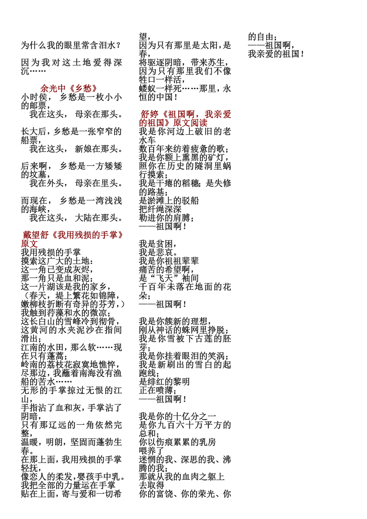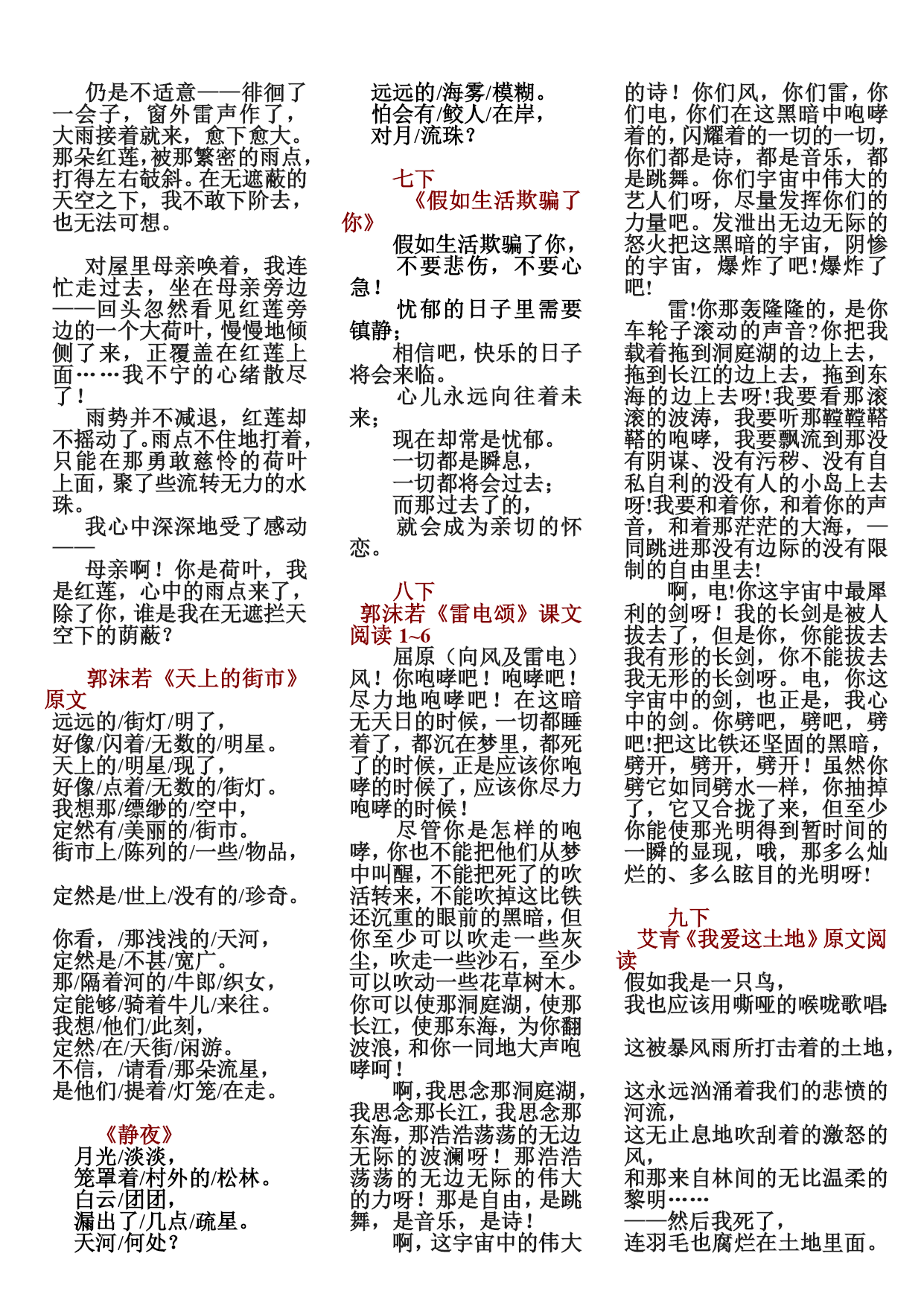 七上朱自清《春》盼望着,盼望着,东风来了,春天的脚步近了。一切都像刚睡醒的样子,欣欣然张开了眼。山朗润起来了,水涨起来了,太阳的脸红起来了。小草偷偷地从土里钻出来,嫩嫩的,绿绿的。园子里,田野里,瞧去,一大片一大片满是的。坐着,躺着,打两个滚,踢几脚球,赛几趟跑,捉几回迷藏。风轻悄悄的,草软绵绵的。桃树、杏树、梨树,你不让我,我不让你,都开满了花赶趟儿。红的像火,粉的像霞,白的像雪。花里带着甜味儿,闭了眼,树上仿佛已经满是桃儿、杏儿、梨儿。花下成千成百的蜜蜂嗡嗡地闹着,大小的蝴蝶飞来飞去。野花遍地是:杂样儿,有名字的,没名字的,散在草丛里,像眼睛,像星星,还眨呀眨的。“吹面不寒杨柳风”,不错的,像母亲的手抚摸着你。风里带来些新翻的泥土的气息,混着青草味儿,还有各种花的香,都在微微润湿的空气里酝酿。鸟儿将巢安在繁花嫩叶当中,高兴起来了,呼朋引伴地卖弄清脆的喉咙,唱出宛转的曲子,跟轻风流水应和着。牛背上牧童的短笛,这时候也成天在嘹亮地响着。雨是最寻常的,一下就是三两天。可别恼。看,像牛毛,像花针,像细丝,密密地斜织着,人家屋顶上全笼着一层薄烟。树叶儿却绿得发亮,小草也青得逼你的眼。傍晚时候,上灯了,一点点黄晕的光,烘托出一片安静而和平的夜。在乡下,小路上,石桥边,有撑起伞慢慢走着的人;还有地里工作的农民,披着蓑戴着笠。他们的草屋,稀稀疏疏的,在雨里静默着。天上风筝渐渐多了,地上孩子也多了。城里乡下,家家户户,老老小小,也赶趟儿似的,一个个都出来了。舒活舒活筋骨,抖擞抖擞精神,各做各的一份儿事去,“一年之计在于春”;刚起头儿,有的是工夫,有的是希望。春天像刚落地的娃娃,从头到脚都是新的,它生长着。春天像小姑娘,花枝招展的,笑着,走着。春天像健壮的青年,有铁一般的胳膊和腰脚,领着我们上前去。HYPERLINK"http://www.5156edu.com/page/08-09-21/38467.html"\t"_blank"何其芳《秋天》原文阅读震落了清晨满披着的露珠,伐木声丁丁地飘出幽谷。放下饱食过稻香的镰刀,用背篓来装竹篱间肥硕的瓜果。秋天栖息在农家里。向江面的冷雾撒下圆圆的网,收起青鳊鱼似的乌桕叶的影子。芦蓬上满载着白霜,轻轻摇着归泊的小桨。秋天游戏在渔船上。草野在蟋蟀声中更寥阔了。溪水因枯涸见石更清冽了。牛背上的笛声何处去了,那满流着夏夜的香与热的笛孔?秋天梦寐在牧羊女的眼里。HYPERLINK"http://www.5156edu.com/page/08-10-08/39060.html"\t"_blank"泰戈尔《金色花》原文阅读假如我变成了一朵金色花,为了好玩,长在树的高枝上,笑嘻嘻地在空中摇摆,又在新叶上跳舞,妈妈,你会认识我么?你要是叫道:“孩子,你在哪里呀?”我暗暗地在那里匿笑,却一声儿不响。我要悄悄地开放花瓣儿,看着你工作。当你沐浴后,湿发披在两肩,穿过金色花的林阴,走到做祷告的小庭院时,你会嗅到这花香,却不知道这香气是从我身上来的。当你吃过午饭,坐在窗前读《罗摩衍那》,那棵树的阴影落在你的头发与膝上时,我便要将我小小的影子投在你的书页上,正投在你所读的地方。但是你会猜得出这就是你孩子的小小影子吗?当你黄昏时拿了灯到牛棚里去,我便要突然地再落到地上来,又成了你的孩子,求你讲故事给我听。“你到哪里去了,你这坏孩子?”“我不告诉你,妈妈。”这就是你同我那时所要说的话了。冰心《荷叶母亲》阅读父亲的朋友送给我们两缸莲花,一缸是红的,一缸是白的,都摆在院子里。八年之久,我没有在院子里看莲花了——但故乡的园院里,却有许多;不但有并蒂的,还有三蒂的,四蒂的,都是红莲。九年前的一个月夜,祖父和我在园里乘凉。祖父笑着和我说:“我们园里最初开三蒂莲的时候,正好我们大家庭里添了你们三个姊妹。大家都欢喜,说适应了花瑞。”半夜里听见繁杂的雨声,早起是浓阴的天,我觉得有些烦闷。从窗内往外看时,那一朵白莲已经谢了,白瓣小船般散飘在水里。梗上只留个小小的莲蓬,和几根淡黄色的花须。那一朵红莲,昨天还是菡萏的,今晨却开满了,亭亭地在绿叶中间立着。仍是不适意——徘徊了一会子,窗外雷声作了,大雨接着就来,愈下愈大。那朵红莲,被那繁密的雨点,打得左右攲斜。在无遮蔽的天空之下,我不敢下阶去,也无法可想。对屋里母亲唤着,我连忙走过去,坐在母亲旁边——回头忽然看见红莲旁边的一个大荷叶,慢慢地倾侧了来,正覆盖在红莲上面……我不宁的心绪散尽了!雨势并不减退,红莲却不摇动了。雨点不住地打着,只能在那勇敢慈怜的荷叶上面,聚了些流转无力的水珠。我心中深深地受了感动——母亲啊!你是荷叶,我是红莲,心中的雨点来了,除了你,谁是我在无遮拦天空下的荫蔽?郭沫若《天上的街市》原文远远的/街灯/明了,好像/闪着/无数的/明星。天上的/明星/现了,好像/点着/无数的/街灯
