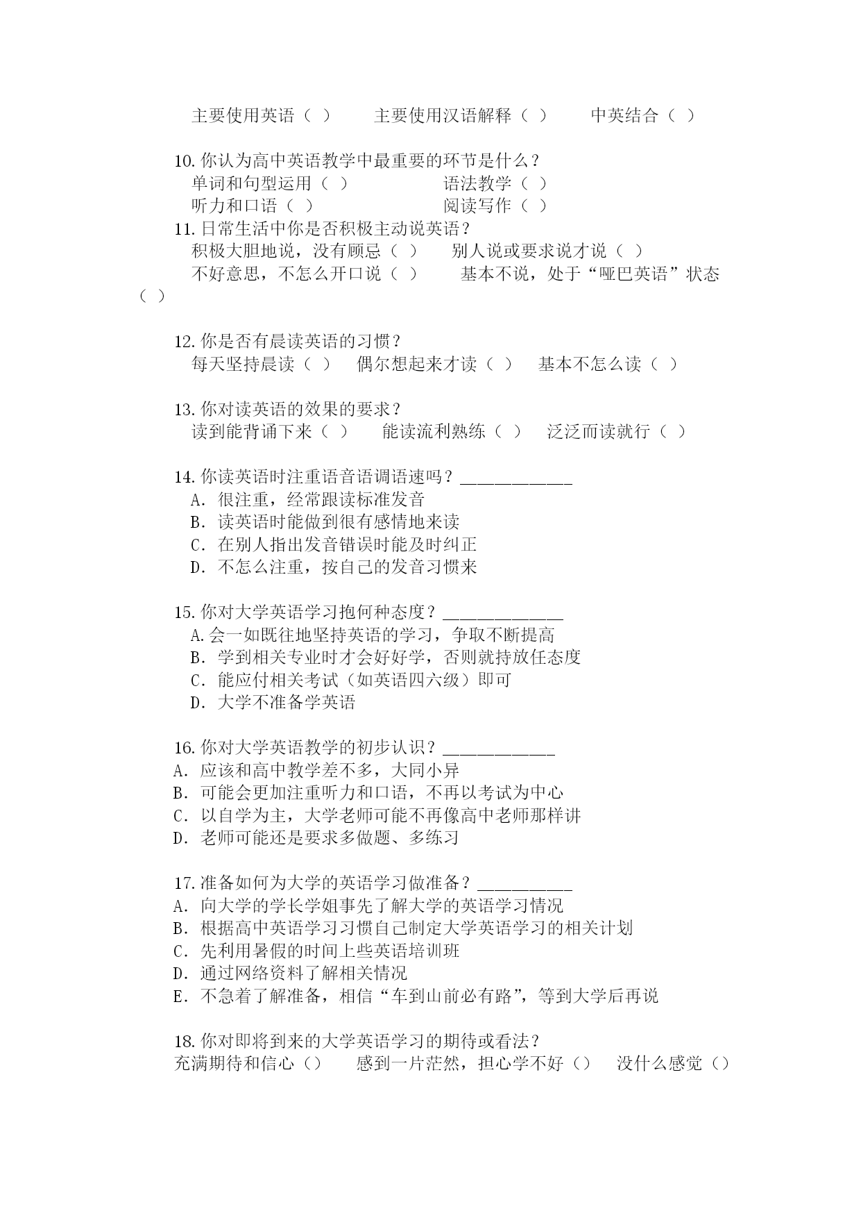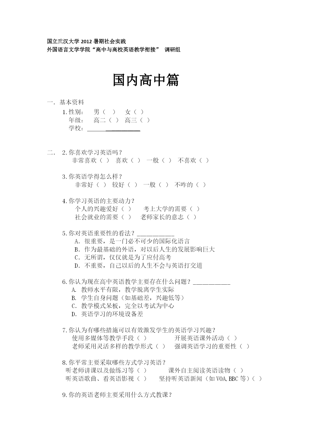 国立武汉大学2012暑期社会实践外国语言文学学院“高中与高校英语教学衔接”调研组国内高中篇基本资料1.性别:男()女()年级:高二()高三()学校:__________二.2.你喜欢学习英语吗?非常喜欢()喜欢()一般()不喜欢()3.你英语学得怎么样?非常好()较好()一般()不咋的()4.你学习英语的主要动力?个人的兴趣爱好()考上大学的需要()社会就业的需要()老师家长的意志()5.你对英语重要性的看法?____________A.很重要,是一门必不可少的国际化语言B.作为最基础的外语,对以后人生的发展影响巨大C.无所谓,仅仅就是为了应付高考D.不重要,自己以后的人生不会与英语打交道6.你认为现在高中英语教学主要存在什么问题?____________A.教师水平有限,教学脱离学生实际B.学生自身问题(如基础差,兴趣低等)C.教学模式呆板,完全以考试为中心D.英语学习的环境设备差7.你认为有哪些措施可以有效激发学生的英语学习兴趣?使用多媒体等教学手段()开展英语课外活动()老师采用灵活多样的教学形式()强调英语学习的重要性()8.你平常主要采取哪些方式学习英语?听老师讲课以及做练习等()课外自主阅读英语读物()听英语歌曲、看英语影视()坚持听英语新闻(如VOA,BBC等)()9.你的英语老师主要采用什么方式教课?主要使用英语()主要使用汉语解释()中英结合()10.你认为高中英语教学中最重要的环节是什么?单词和句型运用()语法教学()听力和口语()阅读写作()11.日常生活中你是否积极主动说英语?积极大胆地说,没有顾忌()别人说或要求说才说()不好意思,不怎么开口说()基本不说,处于“哑巴英语”状态()12.你是否有晨读英语的习惯?每天坚持晨读()偶尔想起来才读()基本不怎么读()13.你对读英语的效果的要求?读到能背诵下来()能读流利熟练()泛泛而读就行()14.你读英语时注重语音语调语速吗?_____________A.很注重,经常跟读标准发音B.读英语时能做到很有感情地来读C.在别人指出发音错误时能及时纠正D.不怎么注重,按自己的发音习惯来15.你对大学英语学习抱何种态度?______________A.会一如既往地坚持英语的学习,争取不断提高B.学到相关专业时才会好好学,否则就持放任态度C.能应付相关考试(如英语四六级)即可D.大学不准备学英语16.你对大学英语教学的初步认识?_____________A.应该和高中教学差不多,大同小异B.可能会更加注重听力和口语,不再以考试为中心C.以自学为主,大学老师可能不再像高中老师那样讲D.老师可能还是要求多做题、多练习17.准备如何为大学的英语学习做准备?___________A.向大学的学长学姐事先了解大学的英语学习情况B.根据高中英语学习习惯自己制定大学英语学习的相关计划C.先利用暑假的时间上些英语培训班D.通过网络资料了解相关情况E.不急着了解准备,相信“车到山前必有路”,等到大学后再说18.你对即将到来的大学英语学习的期待或看法?充满期待和信心()感到一片茫然,担心学不好()没什么感觉()19.你觉得英语学习最重要的是什么?________________________________________________________________20.你在学习英语的过程中有什么好的方法或经验?_______________________________________________________________
