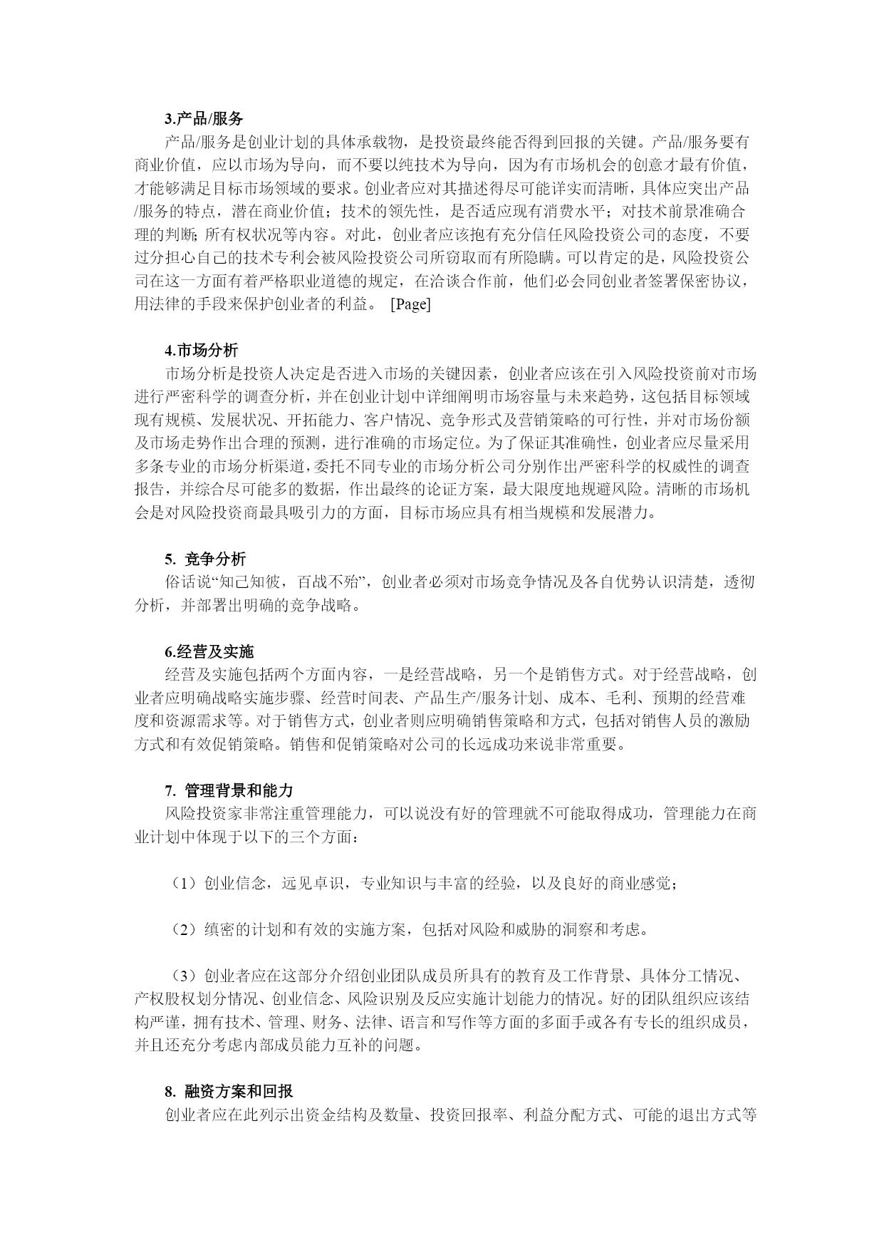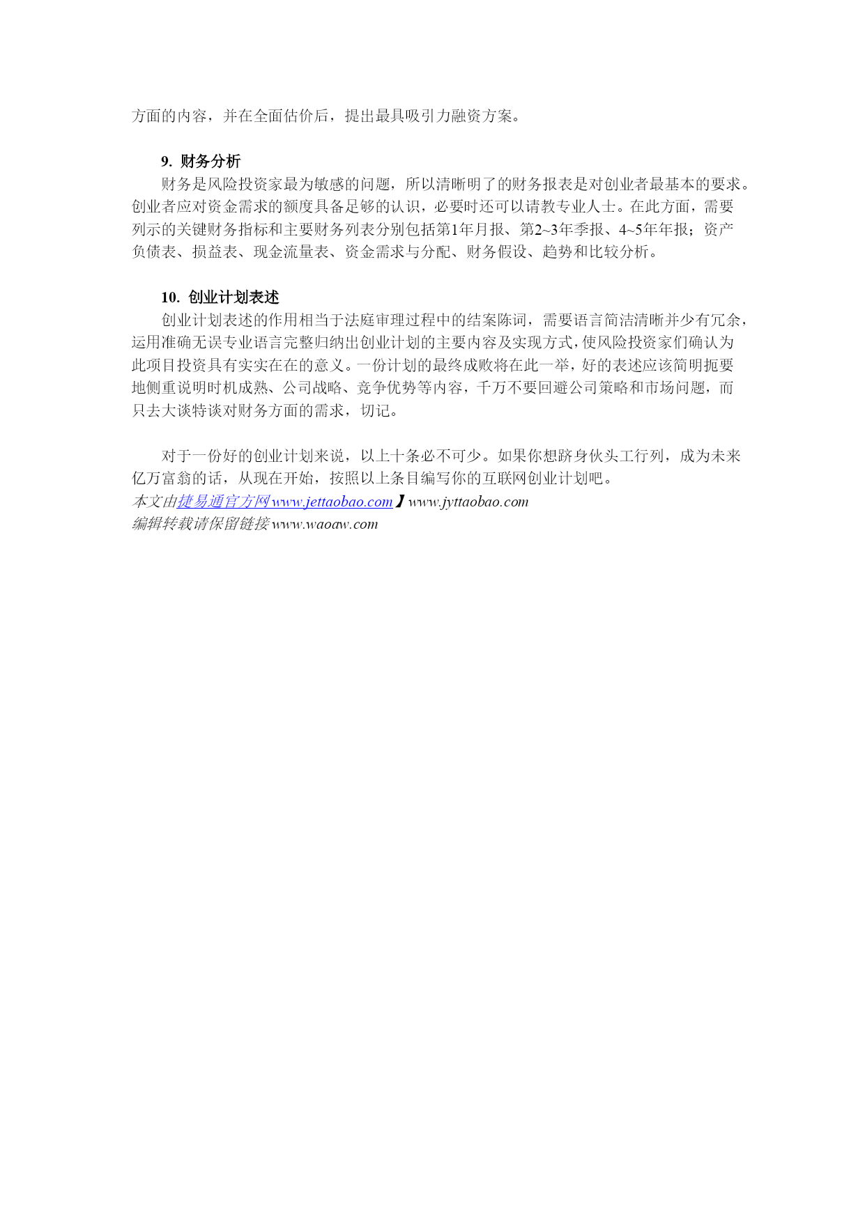 网上创业计划的10大要点作者:学生科技联合会来源:学生科技联合会点击:697人们提着成包成捆花花绿绿的钞票从世界各地的犄角旮旯聚集过来,里三层外三层地围着那口冒着腾腾热气的大锅,操着带有浓郁乡土气息的夹生英语相互致意,谈论着何时才能从空中那悬挂着的,用大锅所产生的水蒸气作动力的蒸汽印钞机里源源不断地飞出“刀元”,指划着应该如何改造蒸汽印钞机的机械结构才能使其工作得更有效率,虽然它现在只能不时蹦出几个小钢蹦儿。站在最前面的伙头工们忙碌万分,他们从身后人们手中接过钞薪,奋力扔进炉灶,延续着那不断窜出的熊熊火焰。同时,他们中的几个也会经常性地转过身来环视四周,大吼几声口号,以吸引更多志同道合的人。每当这个时候,人们又会多认识他们一次,史蒂夫·凯斯、杨志远……当然这里也有中国的互联网三巨头张朝阳、王志东和丁磊。伙头工们的辛勤劳作以及他们组织建造的未来赚钱机器深深感动了围观群众,于是他们慷慨地向其许诺了若干还在不断膨胀蕴涵无限动力可以用“刀元”衡量可以转让的大小气泡(股票期权),结果让这些以前除了劳动力其他什么也没有的伙头工们都成为了亿万富翁。这是一则有关互联网经济发展过程的笑话。说笑归说笑。在现实社会经济中,我们还不得不佩服这些站在互联网发展最前沿的伙头工们,是他们用努力丰富了我们的社会经济生活,也引导着传统经济模式向更具效率的新兴电子商务经济模式转型。在他们的劳动力构成中除了拥有对未来电子商务发展的前瞻性认识以外,还包括了对互联网创业过程的缜密,这两者缺一不可。网易公司在组织“网易中国世纪创业大赛”前,曾对参加活动的八家国际著名风险投资集团和大型IT企业进行了问卷调查,调查结果表明风险投资家尤为看中态度严谨、考虑周全的创业计划,因为他们认为,只有这样才能真正保证其投资的安全可靠,但这一点却恰恰是那些想从人群中挤到前排,加入伙头工队伍的新创业者们最容易疏忽的。一份严谨的创业计划到底应该包括哪些要点呢?该创业大赛评委组要求已报名参加大赛的770组参赛队伍必须提供以下十条内容:1.业务主旨一个合格的创业计划首先应该具备一段清晰、简洁、有效的概括描述性语言,以说明此项创业计划的发展方向和主要内容,其中应该特别突出富有吸引力的鲜明个性、明确的思路与目标以及创业者自身所具备的优势,让投资人能在最短的时间里全面了解整个创业计划,控制资金的投放方向及节奏,使其能在必要的时候提供最行之有效的帮助。风险投资集团拥有丰富的管理经验和强大风险自我控制能力,其在管理和风险控制方面的无形投入对处于起步阶段的创业者来说无异于黑夜里的一盏明灯。即使双方合作并未成功,虚心接受风险投资专家的建议也会使创业者获益非浅。2.创业公司情况介绍建立初步印象后,创业者应该进一步说明自己公司的背景和现状,清晰明了地托出公司的全盘战略目标,挑明作为商业盈利公司的最终目的,使投资人能充分了解其所投资的创业公司,建立起必要的信任。这是创业者“圈钱运动”的必由之路,需要有诚恳的态度,只有让投资人在充分信任自己之后,一切的合作才有可能真正地展开。试想在自己并不信任对方的情况下,有谁会将的几十万几百万甚至几千万的钞票拿给你去大把大把花掉呢?开诚布公是建立信任的基础。3.产品/服务产品/服务是创业计划的具体承载物,是投资最终能否得到回报的关键。产品/服务要有商业价值,应以市场为导向,而不要以纯技术为导向,因为有市场机会的创意才最有价值,才能够满足目标市场领域的要求。创业者应对其描述得尽可能详实而清晰,具体应突出产品/服务的特点,潜在商业价值;技术的领先性,是否适应现有消费水平;对技术前景准确合理的判断;所有权状况等内容。对此,创业者应该抱有充分信任风险投资公司的态度,不要过分担心自己的技术专利会被风险投资公司所窃取而有所隐瞒。可以肯定的是,风险投资公司在这一方面有着严格职业道德的规定,在洽谈合作前,他们必会同创业者签署保密协议,用法律的手段来保护创业者的利益。[Page]4.市场分析市场分析是投资人决定是否进入市场的关键因素,创业者应该在引入风险投资前对市场进行严密科学的调查分析,并在创业计划中详细阐明市场容量与未来趋势,这包括目标领域现有规模、发展状况、开拓能力、客户情况、竞争形式及营销策略的可行性,并对市场份额及市场走势作出合理的预测,进行准确的市场定位。为了保证其准确性,创业者应尽量采用多条专业的市场分析渠道,委托不同专业的市场分析公司分别作出严密科学的权威性的调查报告,并综合尽可能多的数据,作出最终的论证方案,最大限度地规避风险。清晰的市场机会是对风险投资商最具吸引力的方面,目标市场应具有相当规模和发展潜力。5.竞争分析俗话说“知己知彼,百战不殆”,创业者必须对市场竞争情况及各自优势认识清楚,透彻分析,并部署出明确的竞争战略。6.经营及实施经营及实施包括两个方面内容,一是经营战略,另一
