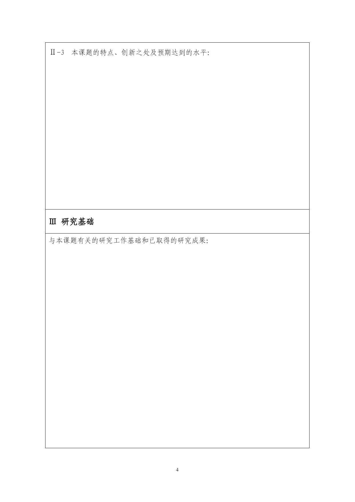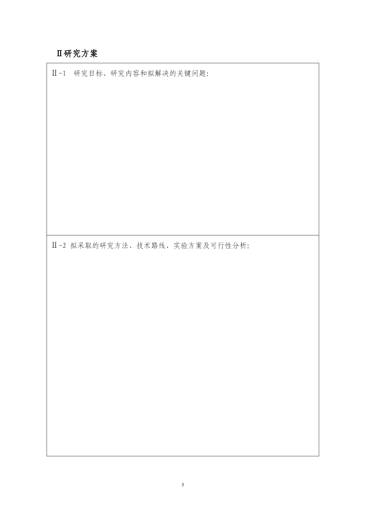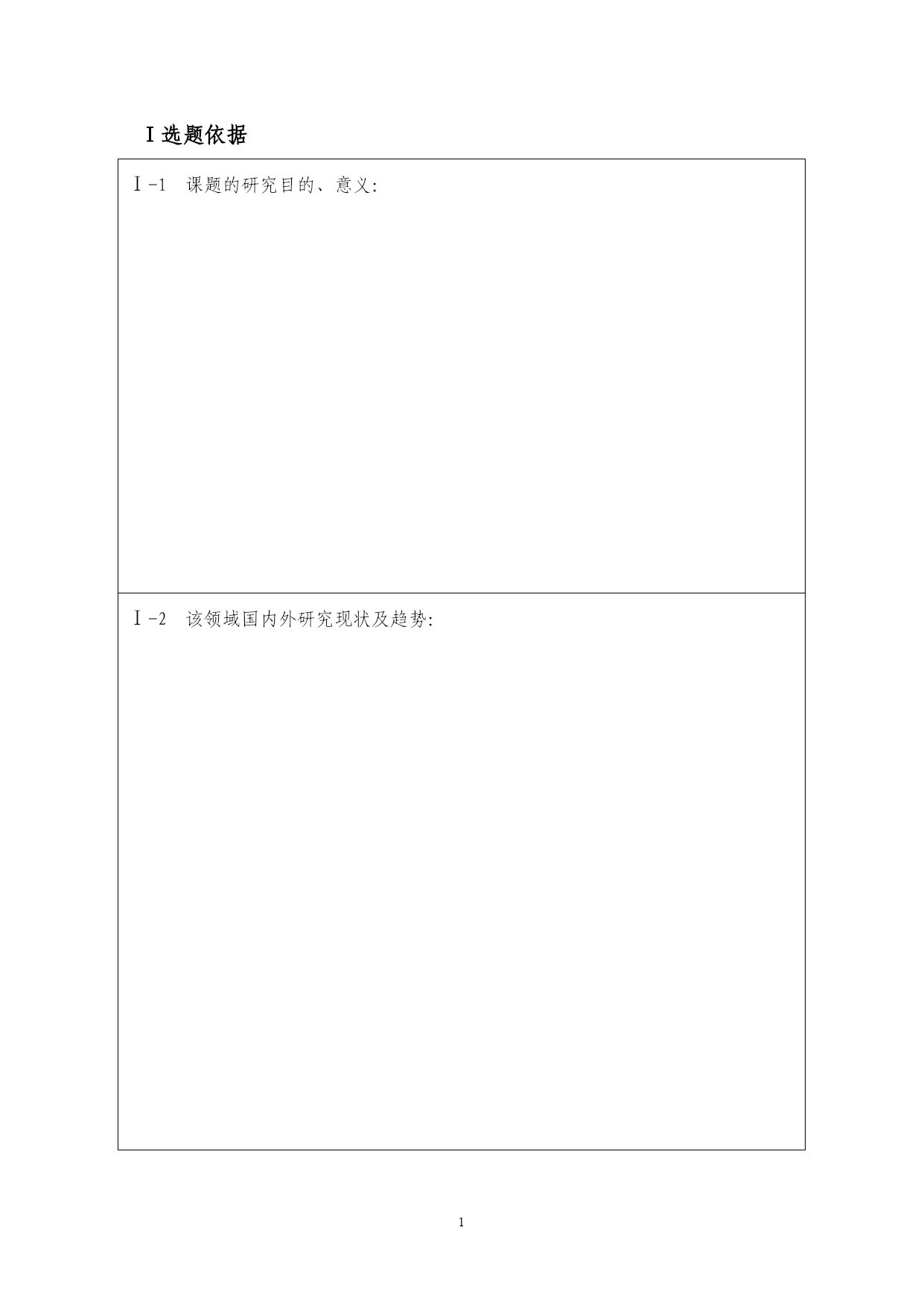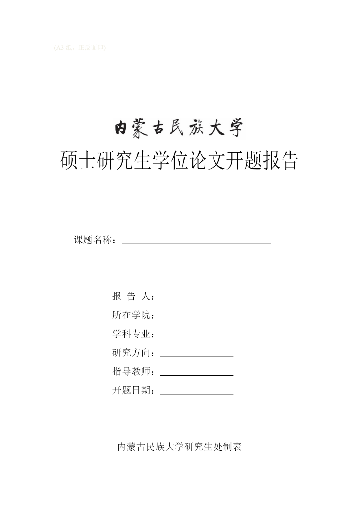 (A3纸,正反面印)硕士研究生学位论文开题报告课题名称:报告人:所在学院:学科专业:研究方向:指导教师:开题日期:内蒙古民族大学研究生处制表Ⅰ选题依据Ⅰ-1课题的研究目的、意义:Ⅰ-2该领域国内外研究现状及趋势:Ⅰ-3主要参考文献:序号作者论著题目刊物名称(出版单位)、时间注:可加附页Ⅱ研究方案Ⅱ-1研究目标、研究内容和拟解决的关键问题:Ⅱ-2拟采取的研究方法、技术路线、实验方案及可行性分析:Ⅱ-3本课题的特点、创新之处及预期达到的水平:Ⅲ研究基础与本课题有关的研究工作基础和已取得的研究成果:Ⅳ课题研究计划Ⅳ-1研究进度、工作内容和预期成果:Ⅳ-2经费预算支出科目金额(元)计算根据及理由Ⅴ课题论证Ⅴ-1课题来源及类别课题来源□国家计委、科委项目□国家经贸委项目□国家自然科学基金□国务院其它部门项目□主管部门(部委级)项目□省、市自治区项目□学校级项目□国际合作项目□自选项目□其他项目(在选项□内划√)课题类型□基础研究□应用研究□开发研究□其他(在选项□内划√)Ⅴ-2研究生指导小组成员姓名职称单位本人签字Ⅴ-3参加课题论证人员姓名职称单位本人签字Ⅴ-4对论文选题的评议就选题的理论和实践意义、研究内容、研究方法、实验设计方案的合理性和可行性、研究的预期结果等方面作出评议,并提出是否通过的建议:□同意通过开题报告。□同意作较小调整后通过该开题报告(并附调整内容)。□不同意通过该开题报告。主持人签字:年月日导师意见:导师签字:年月日学科点意见:负责人签字:年月日学院意见:院长签字:年月日Ⅵ调整内容时间调整前研究内容调整后研究内容评审小组意见:负责人签字:年月日