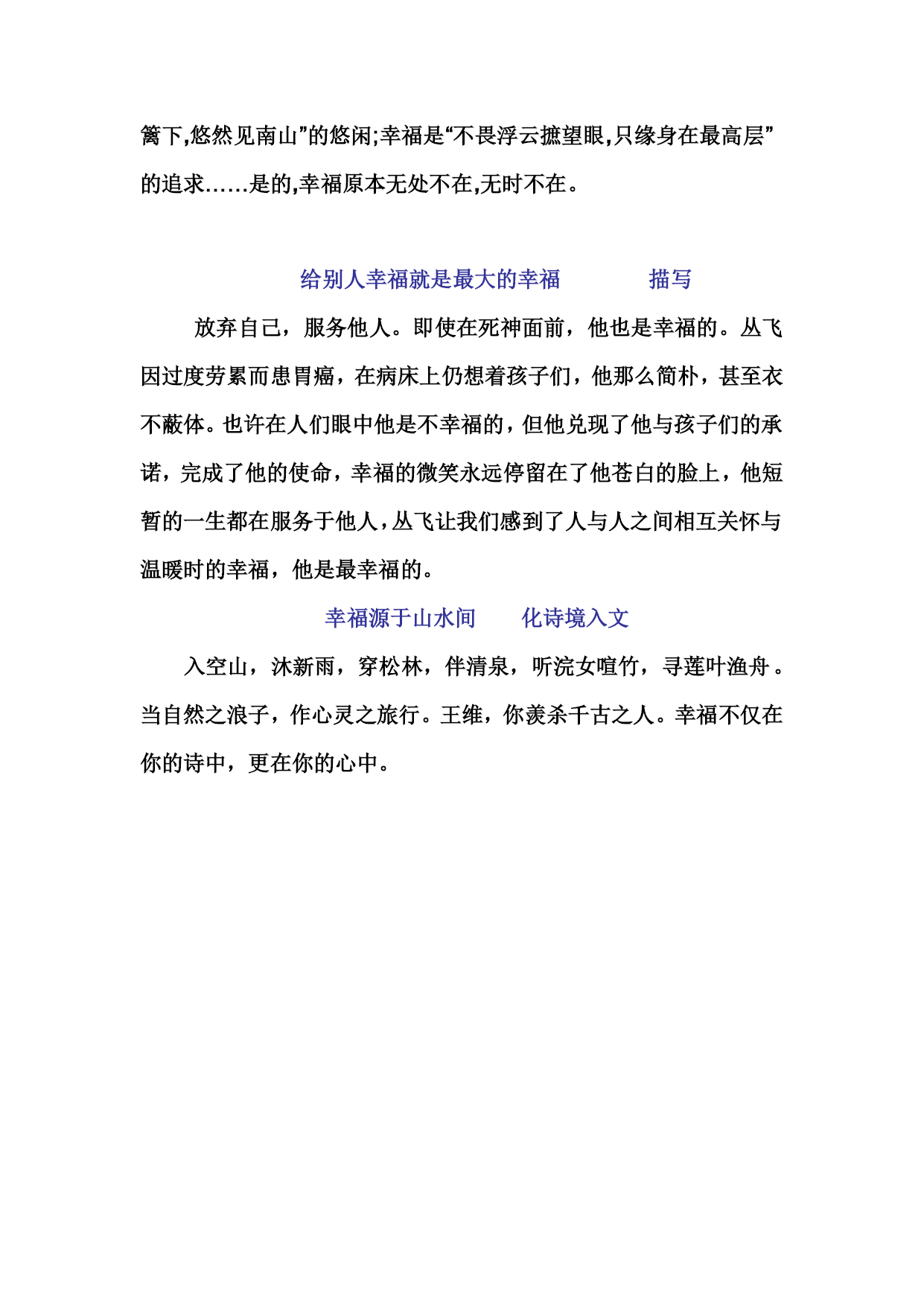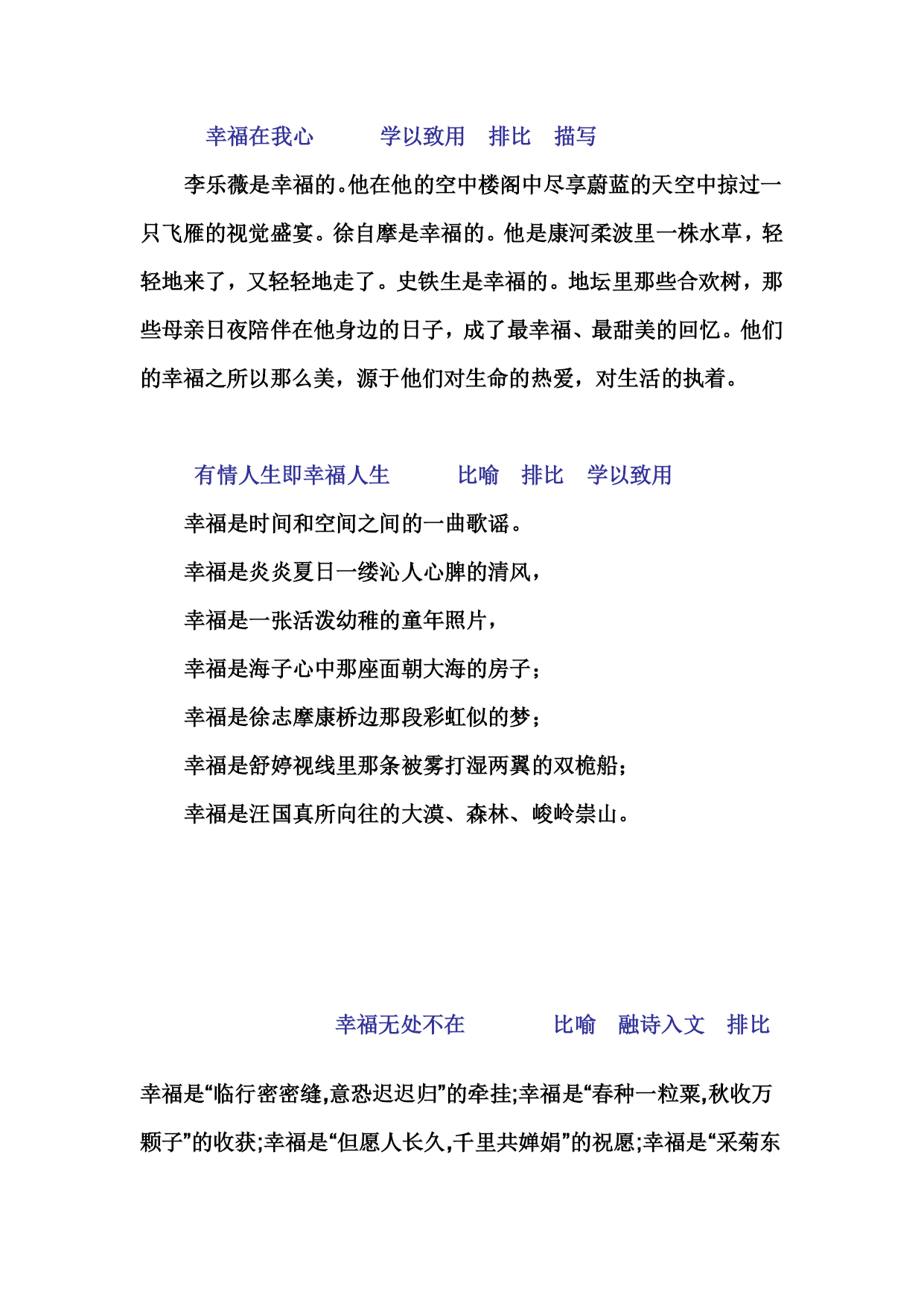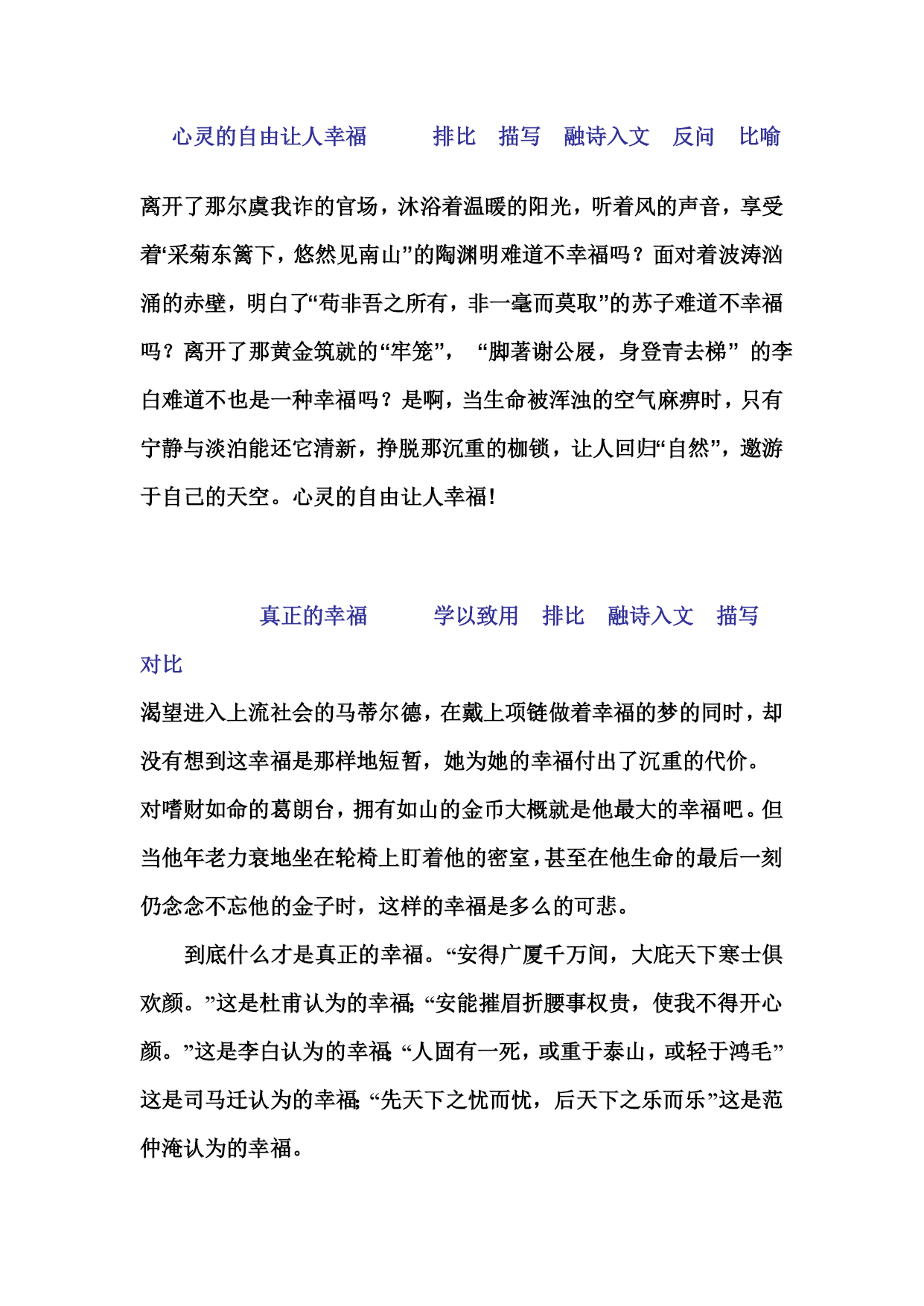 心灵的自由让人幸福排比描写融诗入文反问比喻离开了那尔虞我诈的官场,沐浴着温暖的阳光,听着风的声音,享受着“采菊东篱下,悠然见南山”的陶渊明难道不幸福吗?面对着波涛汹涌的赤壁,明白了“苟非吾之所有,非一毫而莫取”的苏子难道不幸福吗?离开了那黄金筑就的“牢笼”,“脚著谢公屐,身登青去梯”的李白难道不也是一种幸福吗?是啊,当生命被浑浊的空气麻痹时,只有宁静与淡泊能还它清新,挣脱那沉重的枷锁,让人回归“自然”,邀游于自己的天空。心灵的自由让人幸福!真正的幸福学以致用排比融诗入文描写对比渴望进入上流社会的马蒂尔德,在戴上项链做着幸福的梦的同时,却没有想到这幸福是那样地短暂,她为她的幸福付出了沉重的代价。对嗜财如命的葛朗台,拥有如山的金币大概就是他最大的幸福吧。但当他年老力衰地坐在轮椅上盯着他的密室,甚至在他生命的最后一刻仍念念不忘他的金子时,这样的幸福是多么的可悲。到底什么才是真正的幸福。“安得广厦千万间,大庇天下寒士俱欢颜。”这是杜甫认为的幸福;“安能摧眉折腰事权贵,使我不得开心颜。”这是李白认为的幸福;“人固有一死,或重于泰山,或轻于鸿毛”这是司马迁认为的幸福;“先天下之忧而忧,后天下之乐而乐”这是范仲淹认为的幸福。幸福在我心学以致用排比描写李乐薇是幸福的。他在他的空中楼阁中尽享蔚蓝的天空中掠过一只飞雁的视觉盛宴。徐自摩是幸福的。他是康河柔波里一株水草,轻轻地来了,又轻轻地走了。史铁生是幸福的。地坛里那些合欢树,那些母亲日夜陪伴在他身边的日子,成了最幸福、最甜美的回忆。他们的幸福之所以那么美,源于他们对生命的热爱,对生活的执着。有情人生即幸福人生比喻排比学以致用幸福是时间和空间之间的一曲歌谣。幸福是炎炎夏日一缕沁人心脾的清风,幸福是一张活泼幼稚的童年照片,幸福是海子心中那座面朝大海的房子;幸福是徐志摩康桥边那段彩虹似的梦;幸福是舒婷视线里那条被雾打湿两翼的双桅船;幸福是汪国真所向往的大漠、森林、峻岭崇山。幸福无处不在比喻融诗入文排比幸福是“临行密密缝,意恐迟迟归”的牵挂;幸福是“春种一粒粟,秋收万颗子”的收获;幸福是“但愿人长久,千里共婵娟”的祝愿;幸福是“采菊东篱下,悠然见南山”的悠闲;幸福是“不畏浮云摭望眼,只缘身在最高层”的追求……是的,幸福原本无处不在,无时不在。给别人幸福就是最大的幸福描写放弃自己,服务他人。即使在死神面前,他也是幸福的。丛飞因过度劳累而患胃癌,在病床上仍想着孩子们,他那么简朴,甚至衣不蔽体。也许在人们眼中他是不幸福的,但他兑现了他与孩子们的承诺,完成了他的使命,幸福的微笑永远停留在了他苍白的脸上,他短暂的一生都在服务于他人,丛飞让我们感到了人与人之间相互关怀与温暖时的幸福,他是最幸福的。幸福源于山水间化诗境入文入空山,沐新雨,穿松林,伴清泉,听浣女喧竹,寻莲叶渔舟。当自然之浪子,作心灵之旅行。王维,你羡杀千古之人。幸福不仅在你的诗中,更在你的心中。