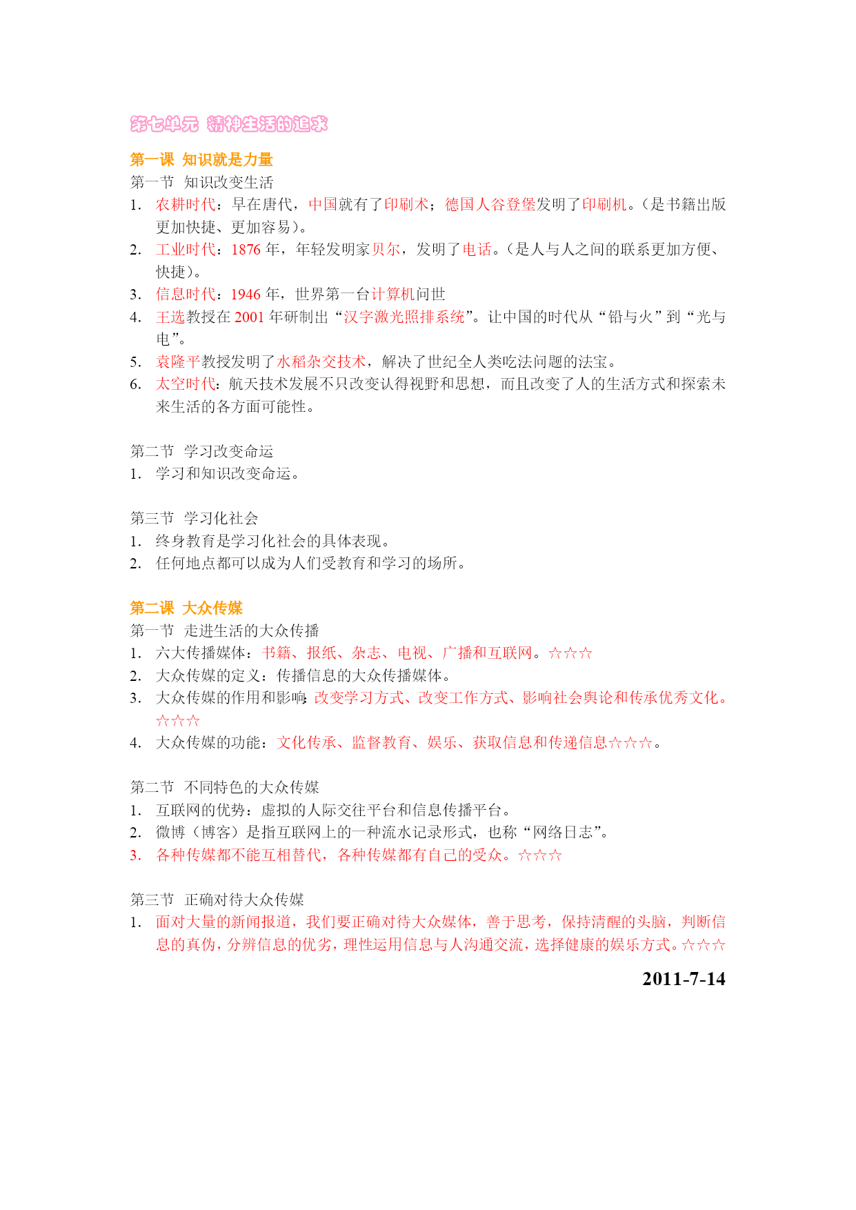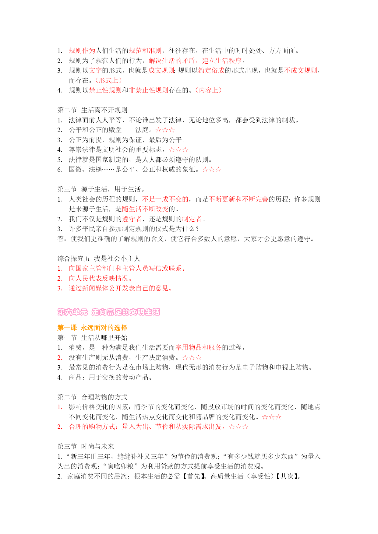 初一下学期《历史与社会》第五单元走进社会第一课在社会中成长社会伴我成长人不能脱离社会生存,每个人都从生到死,生活在一定的社会中。社会群体有:同龄群体、职业群体、民族群体、社会组织。人类胜过动物的主要优点,在于人类是生活在社会中。不同的社会镜子,对人有不同的反映。人的成长离不开社会,可以借助社会镜子,不断弥补不足,看到自己的进步,选择自己的未来。人类的成长,离不开社会精子的参照与评价。古代埃及象形文字中,“我”用画着大眼睛的脸来表示。人与人身边的社会沟通,眼睛是主要的工具。第二节社会是个大舞台家庭是人生的第一所学校,父母是我们的第一任老师;学校是我们的第二个家,学校是我们第一个接触的小社会;社区是我们第三个家,每个社区都是一个小社会。网络社区是高科技产物,也是一种新的生活空间,人们把它叫做“虚拟社区”,它与真实社区,虚拟社区同样需要健康的生活。宽容和平等的家庭气氛,能引导我们健康成长。反之,干扰我们学习,对我们身心健康有损害。第二课社会舞台的角色第一节变化的社会角色社会角色的分类:与生俱来的(性别、人种、民族、儿女……);社会规定的(扮演学生的角色……);自己选择的(未来的职业……);自己所期盼的(……)☆☆☆感受角色的变化:通过体会同一个角色的成长过程,感受成长的变化;通过扮演不同的社会角色,感受角色的转换。当角色发生改变,我们的想法、行为也会有所改变。不同角色的相互理解不同社会角色的价值观……往往存在差异。不同角色之间能够怀有相互尊重和包容乃至悦纳的心态,就可以避免一些不必要的小事。每一个角色之间都有相应的分工与合作,所有的角色之间要相互配合,才能组成和谐的整体。不同及角色之间需要相互沟通和协调,才会促进社会的和谐发展。演好自己的角色合格的社会角色之间需要不断学习与训练。要扮演好自己心目中期盼的角色,要从小立下志向,不断地朝着它努力,从我做起,从现在做起。第三课没有规矩,不成方圆。关于规则的故事规则作为人们生活的规范和准则,往往存在,在生活中的时时处处、方方面面。规则为了规范人们的行为,解决生活的矛盾,建立生活秩序。规则以文字的形式,也就是成文规则;规则以约定俗成的形式出现,也就是不成文规则,而存在。(形式上)规则以禁止性规则和非禁止性规则存在的。(内容上)生活离不开规则法律面前人人平等,不论谁出发了法律,无论地位多高,都会受到法律的制裁。公平和公正的殿堂——法庭。☆☆☆公正为前提,规则为保证,最后为公平。尊崇法律是文明社会的重要标志。☆☆☆法律就是国家制定的,是人人都必须遵守的队则。国徽、法槌……是公平、公正和权威的象征。☆☆☆源于生活,用于生活。人类社会的历程的规则,不是一成不变的,而是不断更新和不断完善的历程;许多规则是来源于生活,是随生活不断改变的。我们不仅是规则的遵守者,还是规则的制定者。许多平民亲自参加制定规则的仪式是为什么?答:使我们更准确的了解规则的含义,使它符合多数人的意愿,大家才会更愿意的遵守。综合探究五我是社会小主人向国家主管部门和主管人员写信或联系。向人民代表反映情况。通过新闻媒体公开发表自己的意见。第六单元走向富足的文明生活第一课永远面对的选择生活从哪里开始消费,是一种为满足我们生活需要而享用物品和服务的过程。没有生产则无从消费,生产决定消费。☆☆☆最常见的消费行为是在市场上购物,现代无形的消费行为是电子购物和电视上购物。商品:用于交换的劳动产品。合理购物的方式影响价格变化的因素:随季节的变化而变化、随投放市场的时间的变化而变化、随地点不同变化而变化、随生活热点变化而变化和随品牌的变化而变化。☆☆☆合理的购物方式:量入为出、节俭和从实际需求出发。☆☆☆时尚与未来1.“新三年旧三年,缝缝补补又三年”为节俭的消费观;“有多少钱就买多少东西”为量入为出的消费观;“寅吃卯粮”为利用贷款的方式提前享受生活的消费观。2.家庭消费不同的层次:根本生活的必需【首先】、高质量生活(享受性)【其次】。3.恩格尔系数的定义:食品支出占总支出的比重。☆☆☆4.恩格尔系数常常被人用来表示生活的富裕程度。☆☆☆5.注重环境保护的消费,渐渐成为人们高质量生活的追求,成为现代文明生活的标志。☆☆☆6.恩格尔系数越高,家庭生活越困难;恩格尔系数越低,家庭生活越富裕。☆☆☆7.俗语含义:(1)“买涨不买落”?答:价高质必好。(2)“好钢用在刀刃上,花钱花在节上”?答:节俭。(3)“有钱不买半年闲”?答:从实际需求出发。(4)“吃不了,兜着走”?答:节俭。(5)呼吁“节卡救树“?答:环保消费。第二课创业的学问爸爸创业成功的秘密投资的概述:用钱来生钱。创业的十六字秘诀:人无我有,人有我优,人优我廉,人廉我转。☆☆☆创业成功的因素:市场需要(人无我有,前提条件);产品价格(人有我优,竞争的有效手段);技术改造(人有我优,企业生命源泉);新的