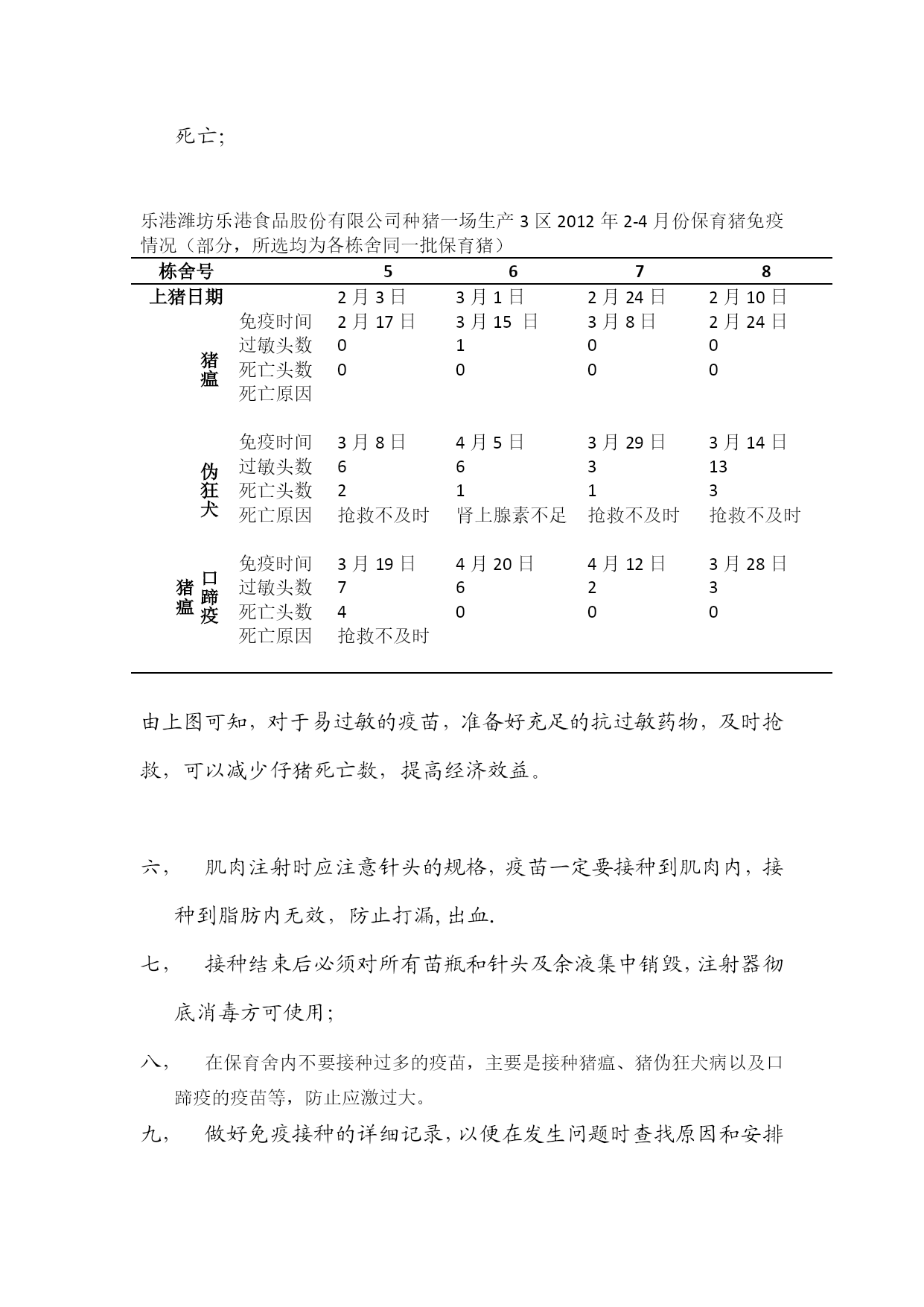 免疫免疫接种前应了解当地及本厂保育猪疫病情况,了解被免疫仔猪的健康情况,凡瘦弱有疾病或者在7天以前使用过抗生素,免疫抑制药物的猪只一律把免疫推后到其恢复后再补(应详细记录这一群体不许有一头漏落);使用疫苗时应仔细查阅产品说明书与瓶签是否相符,若不同则严禁使用,同时明确产品的生产日期、储运方法、其瓶装量、稀释液、使用剂量、使用方法及有关事项,凡有玻璃瓶裂纹、瓶盖松动以及其色泽和其它物理性状与说明书不一致的禁止使用。对于合格的疫苗要严格遵守操作规程;疫苗启用或稀释后容易失效所以应在2小时内用完,使用前要充分摇均匀使其全部溶解,并且在每一次吸苗时必须再次摇均匀,以不影响其含量而降低其使用效力;注射过程中应严格消毒,注射器、针头应洗净煮沸,要注射一头猪换一个针头,至少一栏仔猪一个针头.不能用已经注射的针头来吸苗,每一瓶塞上固定一个外包消毒棉球的吸苗针,己吸出的苗不得推回瓶内,被注射部必须严格消毒,推液后用消毒棉球按压注射部位不让液苗外泄;有的疫苗(如口蹄疫,伪狂犬)引起的过敏反应很大,接种后应详细观察,对严重的个体及时用肾上腺素等药物脱敏,以免引起死亡;乐港潍坊乐港食品股份有限公司种猪一场生产3区2012年2-4月份保育猪免疫情况(部分,所选均为各栋舍同一批保育猪)栋舍号5678上猪日期2月3日3月1日2月24日2月10日猪瘟免疫时间2月17日3月15日3月8日2月24日过敏头数0100死亡头数0000死亡原因伪狂犬免疫时间3月8日4月5日3月29日3月14日过敏头数66313死亡头数2113死亡原因抢救不及时肾上腺素不足抢救不及时抢救不及时口蹄疫猪瘟免疫时间3月19日4月20日4月12日3月28日过敏头数7623死亡头数4000死亡原因抢救不及时由上图可知,对于易过敏的疫苗,准备好充足的抗过敏药物,及时抢救,可以减少仔猪死亡数,提高经济效益。肌肉注射时应注意针头的规格,疫苗一定要接种到肌肉内,接种到脂肪内无效,防止打漏,出血.接种结束后必须对所有苗瓶和针头及余液集中销毁,注射器彻底消毒方可使用;在保育舍内不要接种过多的疫苗,主要是接种猪瘟、猪伪狂犬病以及口蹄疫的疫苗等,防止应激过大。做好免疫接种的详细记录,以便在发生问题时查找原因和安排下一步免疫计划。