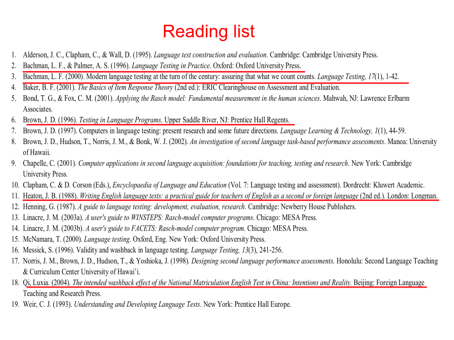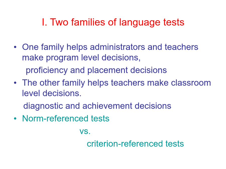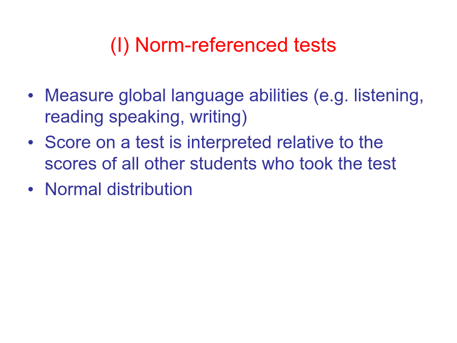 Chapter1TypesandusesoflanguagetestsReadinglistI.Twofamiliesoflanguagetests(I)Norm-referencedtestsNormalDistributionpeakedNorm-referencedtests(II)Criterion-referencedtestsNorn-referencedandcriterion-referencedtestdifferences(III)Matchingteststodecisionpurposes2.Program-levelplacementdecisions3.Classroom-levelachievementdecisions4.Classroom-leveldiagnostictestsIV.WhyasingletestcannotfulfillallfourfunctionsSpolsky(1978)classifiedthedevelopmentoflanguagetestingintothreeperiods,ortrends:theprescientificperiodthepsychometric/structuralistperiodtheintegrative/sociolinguisticperiod.grammar-translationapproachestolanguageteachingtranslationandfreecompositiontestsdifficulttoscoreobjectivelynostatisticaltechniquesappliedtovalidatethetestssimple,butunfairtostudentsThepsychometric-structuralistperiodTheintegrative-sociolinguisticperiodBachman’s(1990)’sframeworkofcommunicativelanguageability:Languagecompetence:grammatical,sociolinguistic,anddiscoursecompetence(Canale&Swain):organizationalcompetencegrammaticalcompetencetextualcompetencepragmaticcompetenceillocutionarycompetencesociolinguisticcompetenceStrategiccompetence:performsassessment,planning,andexecutionfunctionsindeterminingthemosteffectivemeansofachievingacommunicativegoalPsychophysiologicalmechanisms:characterizethechannel(auditory,visual)andmode(receptive,productive)Oller’s(1979)pragmaticproficiencytest:TemporallyandsequentiallyconsistentwiththerealworldoccurrencesoflanguageformsLinkingtoameaningfulextralinguisticcontextfamiliartothetesteesClark’s(1978)directassessment:approximatingtothegreatestextentthetestingcontexttotherealworldClozetestanddictationCommunicativetestingortotestcommunicativelyPerformancetestsNotdiscrete-pointinnatureIntegratingtwoormoreofthelanguageskillsoflistening,speaking,reading,writing,andotheraspectslikecohesionandcoherence,suprasegmentals,paralinguistics,kinesics,pragmatics,andcultureTask-based:essays,interviews,extensivereadingtasksPerformanceTestsRatersshouldbeappropriateintermsof:numberofrate