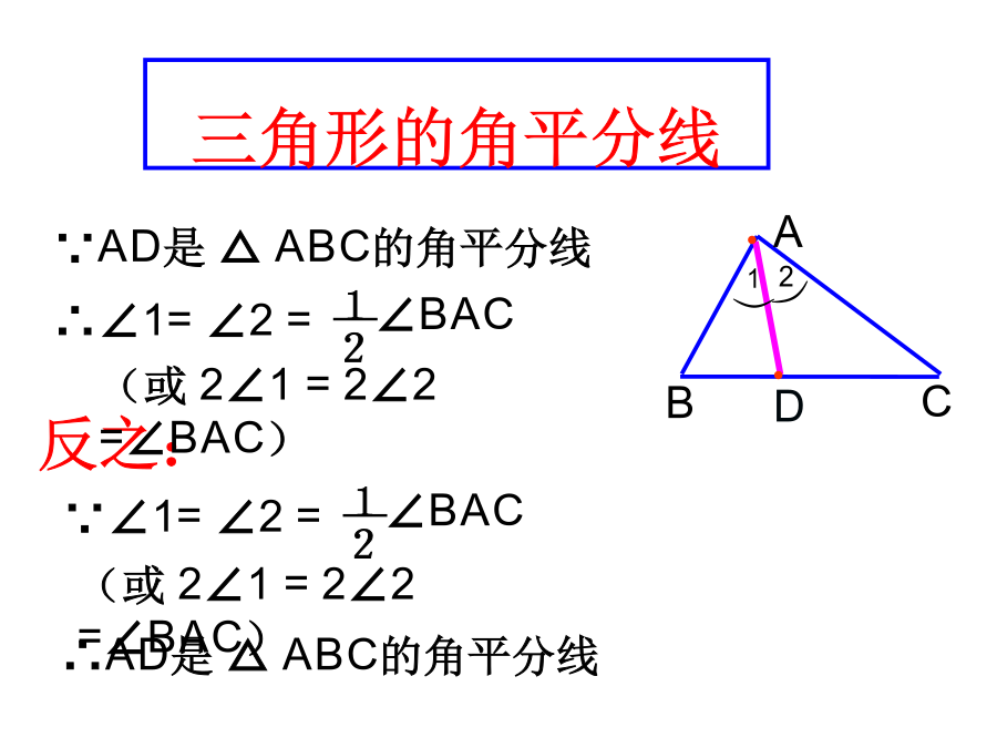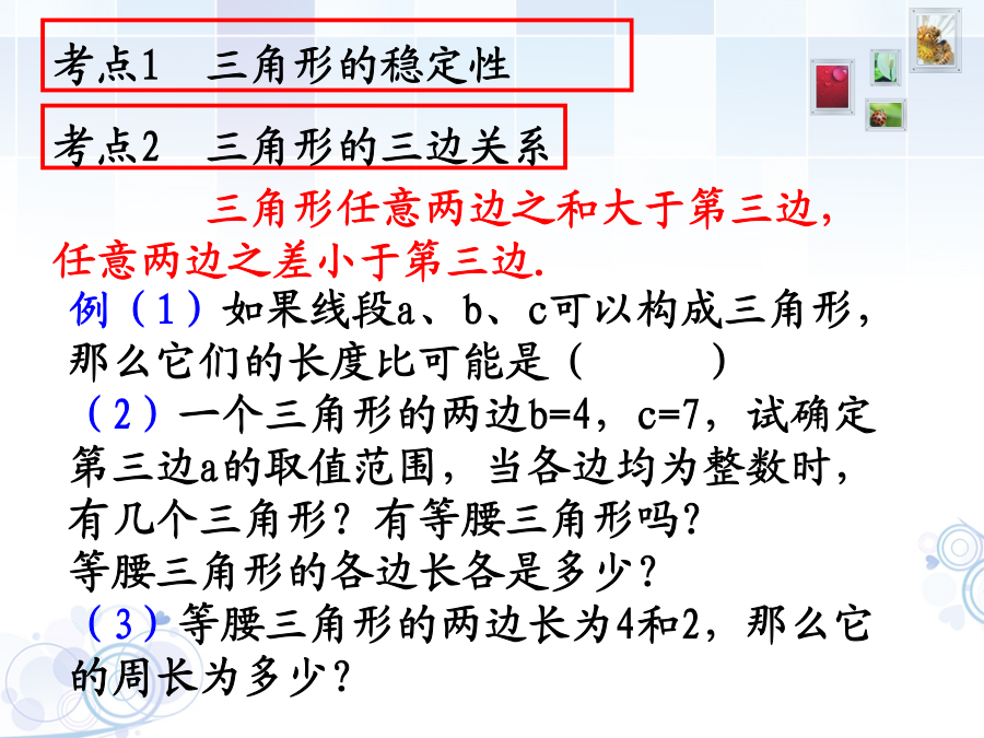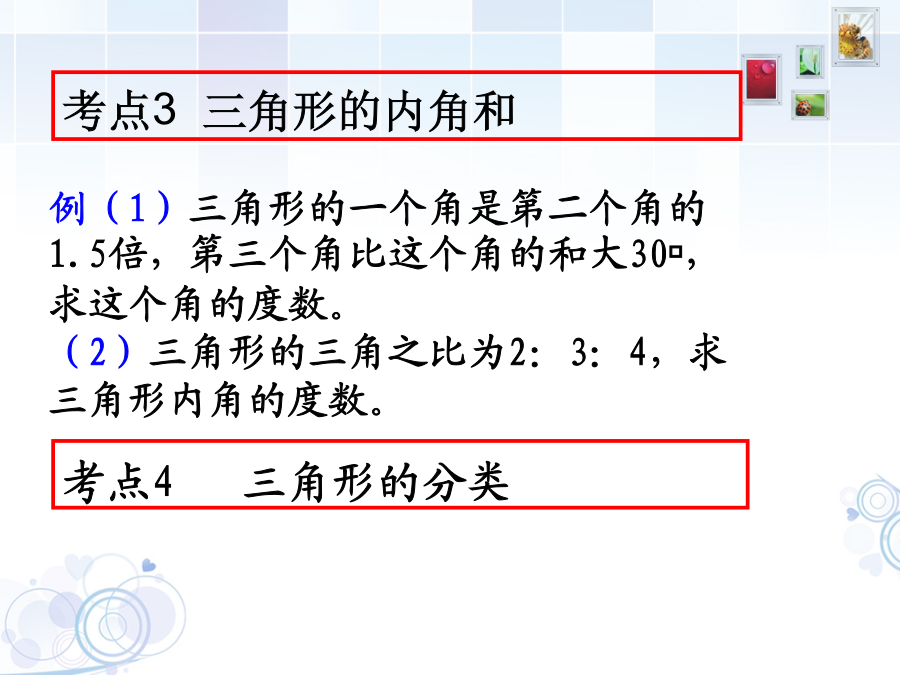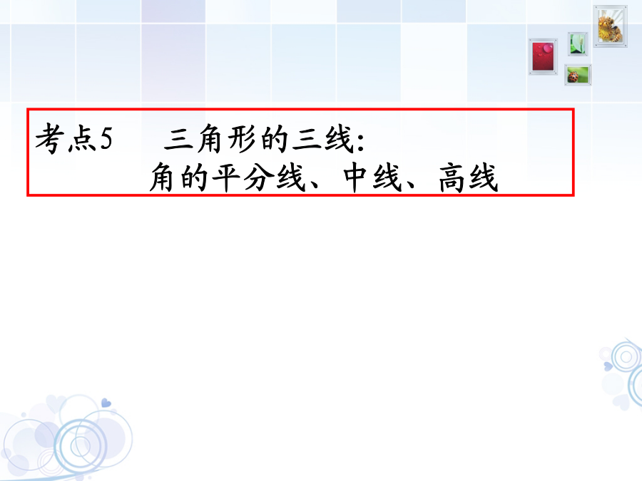 考点1三角形的稳定性例(1)三角形的一个角是第二个角的1.5倍,第三个角比这个角的和大30,求这个角的度数。(2)三角形的三角之比为2:3:4,求三角形内角的度数。考点5三角形的三线:角的平分线、中线、高线三角形的角平分线三角形的中线三角形的高CAB=A’B’直角三角形全等的条件A2.如图,AB=AD,CB=CD,E是AC上一点,BE与DE相等吗?E第七章生活中的轴对称考点1轴对称图形、图形成轴对称、对称轴考点3线段垂直平分线的性质1.等腰三角形是轴对称图形考点4等边三角形的性质考点5对称轴的性质考点6镜面对称