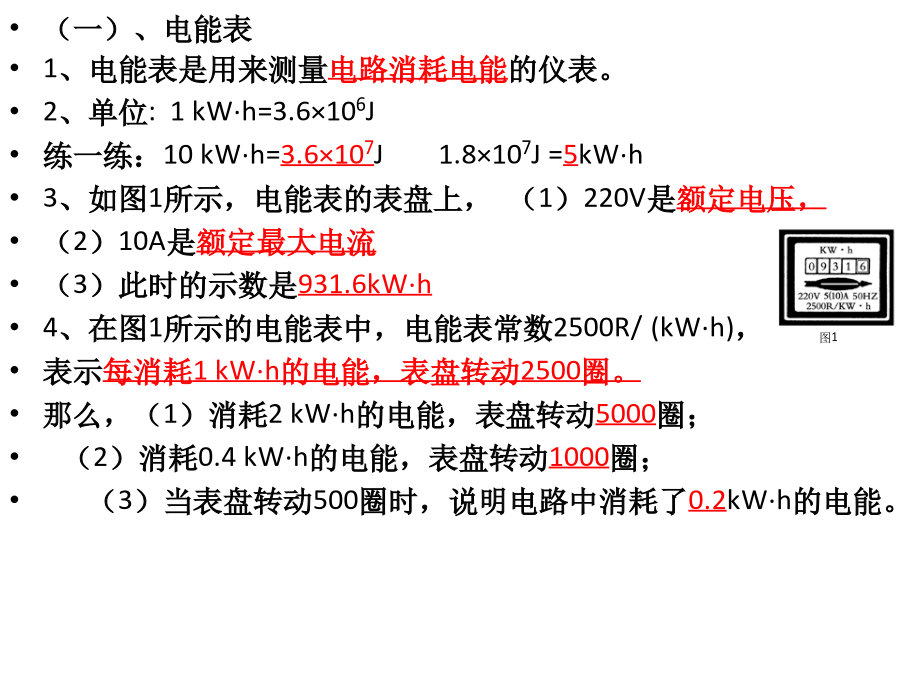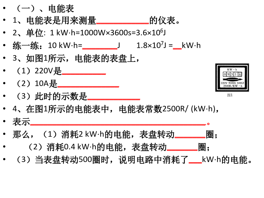 电功与电热复习(1)(一)、电能表1、电能表是用来测量____________的仪表。2、单位:1kW·h=1000W×3600s=3.6×106J练一练:10kW·h=________J1.8×107J=__kW·h3、如图1所示,电能表的表盘上,(1)220V是__________(2)10A是______________(3)此时的示数是____________4、在图1所示的电能表中,电能表常数2500R/(kW·h),表示________________________________________。那么,(1)消耗2kW·h的电能,表盘转动_______圈;(2)消耗0.4kW·h的电能,表盘转动_______圈;(3)当表盘转动500圈时,说明电路中消耗了___kW·h的电能。(一)、电能表1、电能表是用来测量电路消耗电能的仪表。2、单位:1kW·h=3.6×106J练一练:10kW·h=3.6×107J1.8×107J=5kW·h3、如图1所示,电能表的表盘上,(1)220V是额定电压,(2)10A是额定最大电流(3)此时的示数是931.6kW·h4、在图1所示的电能表中,电能表常数2500R/(kW·h),表示每消耗1kW·h的电能,表盘转动2500圈。那么,(1)消耗2kW·h的电能,表盘转动5000圈;(2)消耗0.4kW·h的电能,表盘转动1000圈;(3)当表盘转动500圈时,说明电路中消耗了0.2kW·h的电能。《电能表》小测试每空1分,计8分。1、电能表用来直接测量__________,它的计量单位是_____,也就是日常生活中所说的_____。2、电能表上标有“220V3(6)A”的字样,还标有“1500R/(kW·h)”的字样,其中220V是指________,6A是指_______________,某段时间内该电能表的表盘转动了6000圈,则这段时间内电路消耗的电能为______kW·h二、电功:例1、某段电路两端的电压是6伏,通过它的电流是0.5安,则通电5分钟,电流做功多少焦?试一试(2):已知L1的电阻比L2的电阻大,若将它们并联在电路中,通过灯中的电流大些,相同时间内电流通过灯做功多些。电流通过甲灯10秒钟做了200J的功,每秒做功____J;电流通过乙灯3秒做了120J的功,每秒做功____J。电流通过_____灯做功较多。电流通过_____灯做功较快。1、电功率的公式是这样推导出来的:P=____=_____=UI。(适用于任何电路)2、电功率的单位:______,常用单位有________、_________。3、某灯泡上标有“6V3W”字样,表示额定电压U额为,额定功率P额为,可以算出该灯的额定电流I额=,灯丝阻值R=。当这只灯两端的实际电压U实为3V时,通过它的实际电流I实为________,它的实际功率是_________。(忽略温度对电阻的影响。)3、某学习小组想测一个额定电压为2.5V的灯泡的额定功率.已知电源电压为6V.(1)他们设计的电路如图a所示,则表1是________,表2是________.(2)电压表有0~3V和0~15V两种量程,他们应选用V量程.(3)实验时应调节_________,当________________时读出电流表的读数如图b所示,则灯泡的额定电流为A,额定功率为______W。4.小华家的电能表上标有“3000r/(kw·h)”字样.电能表转盘转过15r耗时3min,则3min内消耗的电能是____kW·h.谢谢大家!