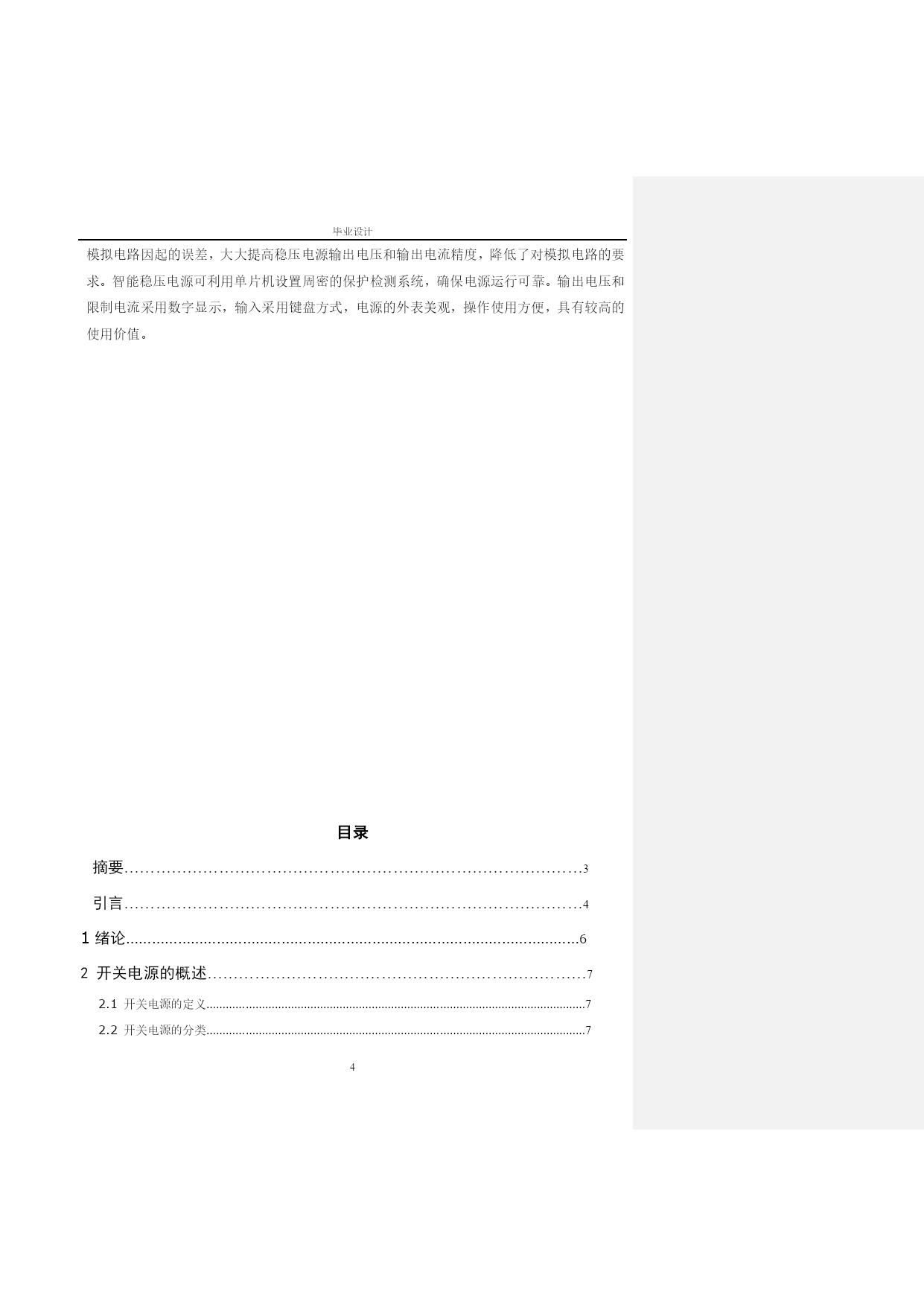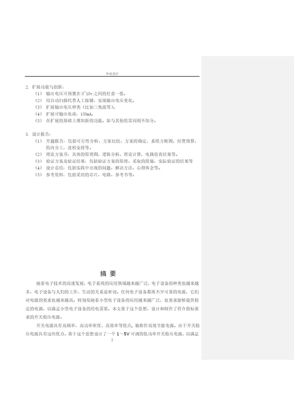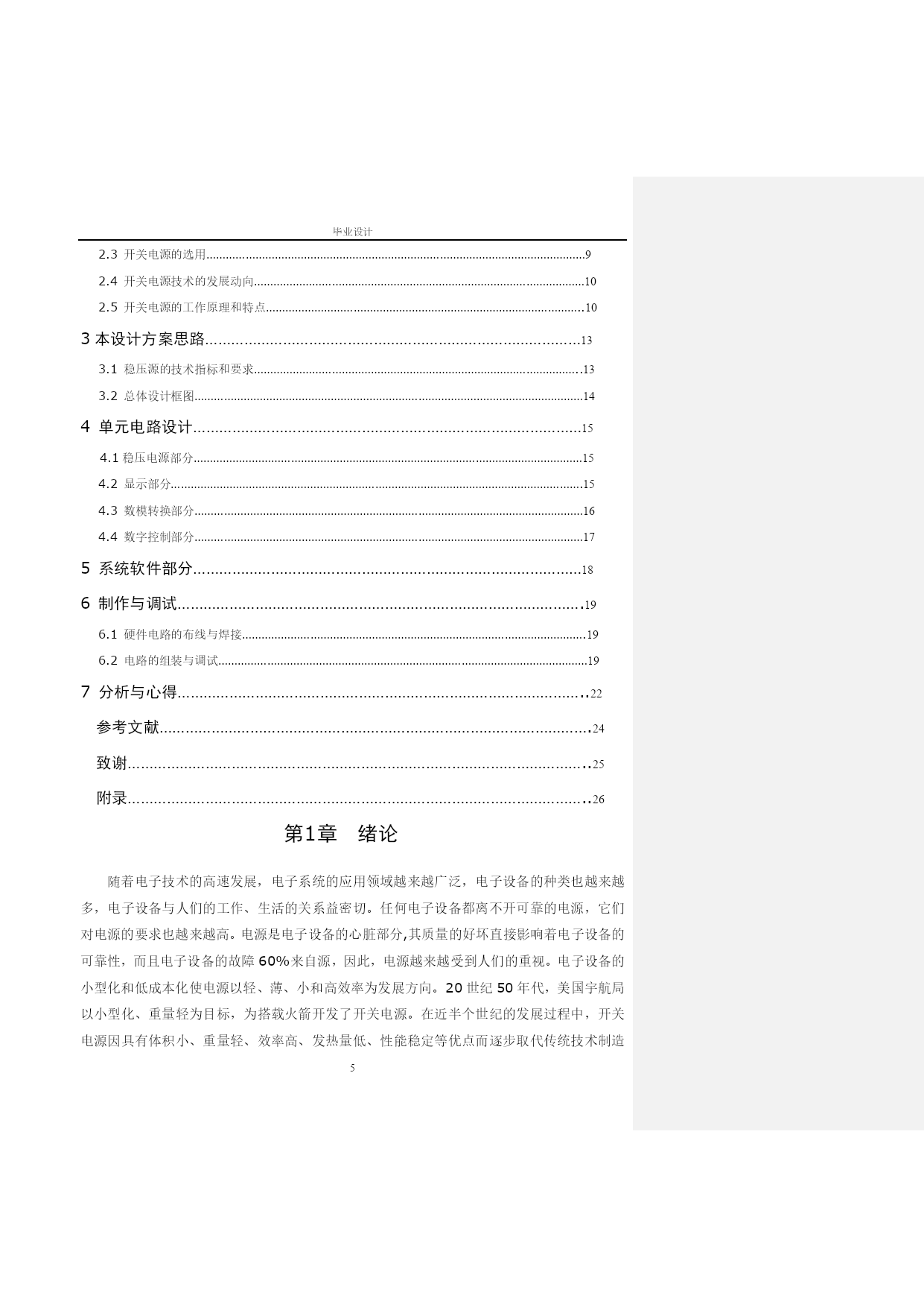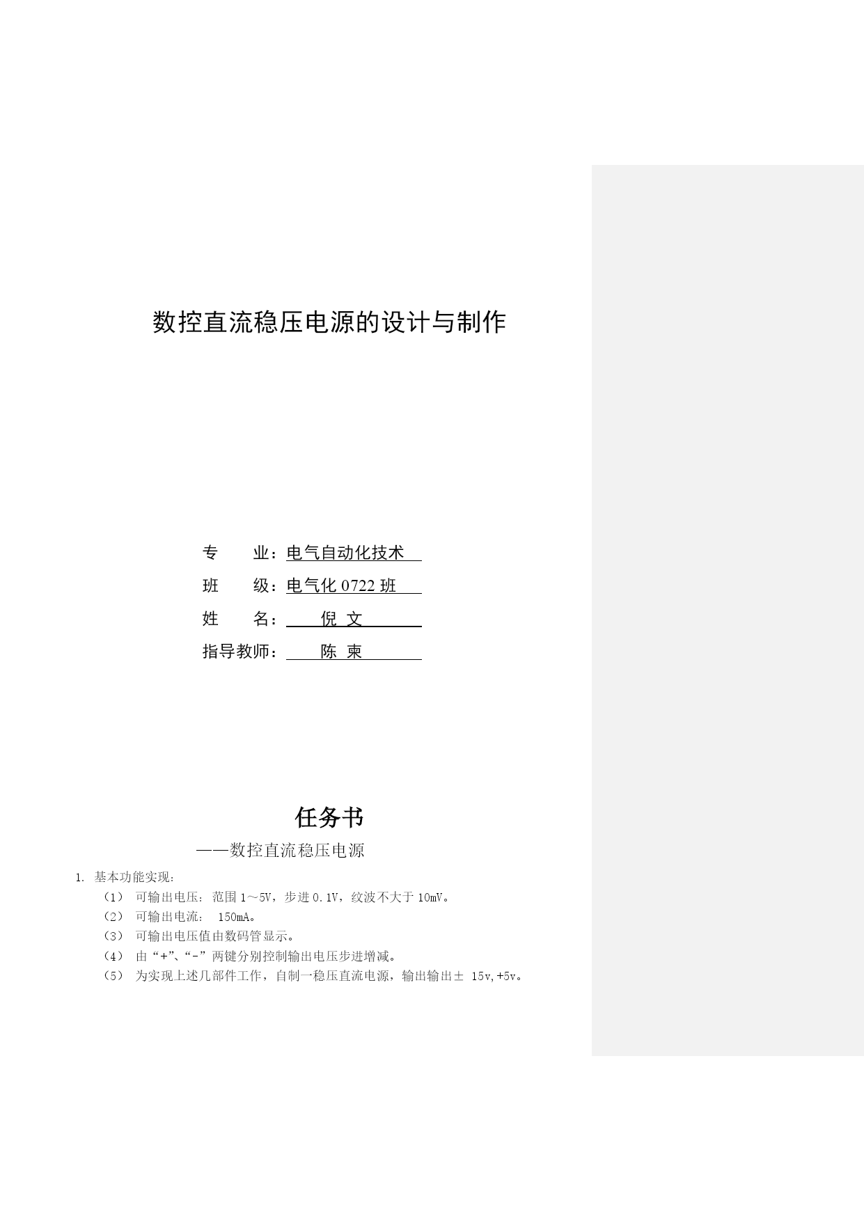 毕业设计数控直流稳压电源的设计与制作专业:电气自动化技术班级:电气化0722班姓名:倪文指导教师:陈柬任务书——数控直流稳压电源基本功能实现:可输出电压:范围1~5V,步进0.1V,纹波不大于10mV。可输出电流:150mA。可输出电压值由数码管显示。由“+”、“-”两键分别控制输出电压步进增减。为实现上述几部件工作,自制一稳压直流电源,输出输出±15v,+5v。扩展功能与创新:输出电压可预置在0~10v之间的任意一值。用自动扫描代替人工按键,实现输出电压变化。扩展输出电压种类(比如三角波等)。扩展可输出电流:150mA。在扩展的基础上增加新的功能。如与其他组雷同则不加分。设计报告:开题报告:包括可行性分析,方案比较,方案的确定,系统方框图,经费预算,组内分工,进程安排等。理论方案书:具体的原理图,逻辑分析,理论计算,电路仿真结果等。验证方案及验证结果:包括验证方案的原理,采取的措施,实际验证的结果等设计总结:包括实践中出现的问题,解决方法,心得体会等。参考资料:包括采用的芯片,电路,参考书等。摘要随着电子技术的高速发展,电子系统的应用领域越来越广泛,电子设备的种类也越来越多,电子设备与人们的工作、生活的关系益密切。任何电子设备都离不开可靠的电源,它们对电源的要求也越来越高。特别是随着小型电子设备的应用越来越广泛,也要求能够提供稳定的电源,以满足小型电子设备的用电需要。本文基于这个思想,设计和制作了符合指标要求的开关稳压电源。开关电源具有高频率、高功率密度、高效率等优点,被称作高效节能电源。由于开关稳压电源具有这些优点,基于这个思想设计了一个1~5V可调的低功率开关稳压电源,以满足小型电子设备的供电需要。本文以开关电源的发展历史、发展现状以及发展趋势为线索,介绍了开关电源的一些新技术,技术指标,分类标准等。并根据这些标准设计了一种满足小型电子设备供电需要的开关稳压电源。电源设计的主要指标是:输入电压为AC220V,输入频率为50HZ,输入电压范围为AC165V~265V,输出电压为直流1~5V可调,输出最大电流为150mA,输出最大功率为2.25W。最后在完成基本指标的基础上,本文还增加了防浪涌电流的附属功能,使电路更加满足小型电子设备的用电需要。数控直流稳压源就是能用数字来控制电源输出电压的大小,而且能使输出的直流电压能保持稳定、精确的直流电压源;本文介绍了利用数/模转换电路、辅助电源电路、去抖电路等组成的数控直流稳压电源电路,详述了电源的基本电路结构和控制策略;它与传统的稳压电源相比,具有操作方便、电压稳定度高的特点,其结构简单、制作方便、成本低,输出电压在1~5V之间连续可调,其输出电压大小以1V步进,输出电压的大小调节是通过“+”“-”两键操作的,而且可根据实际要求组成具有不同输出电压值的稳压源电路。该电源控制电路选用89C51单片机控制主电路采用串联调整稳压技术具有线路简单、响应迅速、稳定性好、效率高等特点。详细分析了电源的拓朴图及工作原理。关键词:稳压电源;单片微型机;数控直流;D/A转换引言数控支流稳压电源是一种常见的电子仪器,广泛的用于电子电路,教学实验和科学研究等领域。目前实用的直流稳压电源大部分是线性电源。利用分离器件组成,其体积大,功率底,可靠性差,操作使用不方便,自我保护功能不够,因而故障率高。随着电子科技的飞速发展,各种电子,电器设备对稳压电源的性能要求日益提高,稳压电源不断差朝着小型化,高效率,低成本,高可靠性,低电磁干扰,模块化和智能化发展。以单片机系统为核心而设计制造出来的新一代稳压电源不但电路简单,结构紧凑,价格低廉,性能卓越,而且单片机具有计算和控制功能,利用它对采样技术进行各种计算,从而可排除和减少由于骚扰信号和模拟电路因起的误差,大大提高稳压电源输出电压和输出电流精度,降低了对模拟电路的要求。智能稳压电源可利用单片机设置周密的保护检测系统,确保电源运行可靠。输出电压和限制电流采用数字显示,输入采用键盘方式,电源的外表美观,操作使用方便,具有较高的使用价值。目录摘要……………………………………………………………………………3引言……………………………………………………………………………41绪论……………………………………………………………………………………………62开关电源的概述………………………………………………………………72.1开关电源的定义………………………………………………………………………………………………………72.2开关电源的分类………………………………………………………………………………………………………72.3开关电源的选用………………………………………………………………………………………………………92.4开关电源技术的发展动向…………