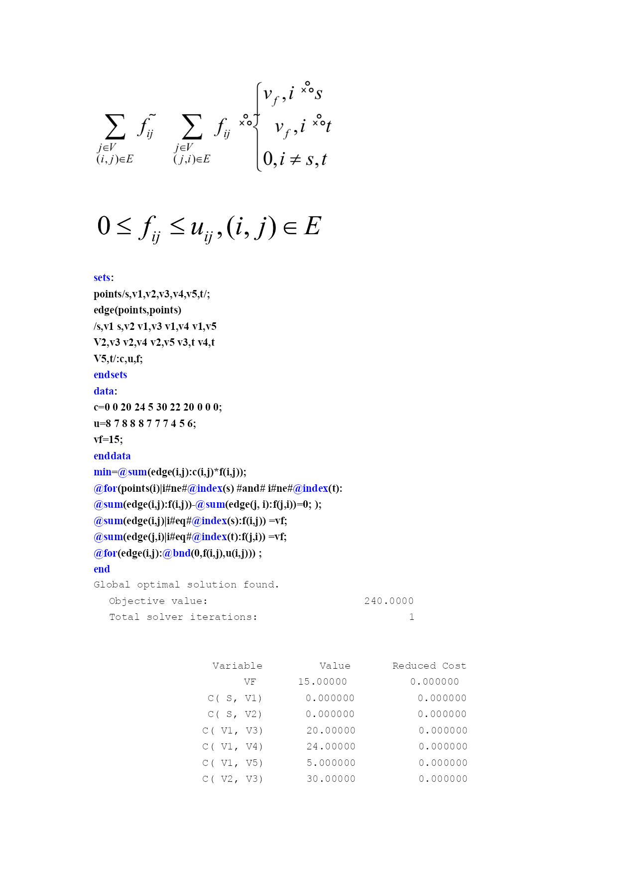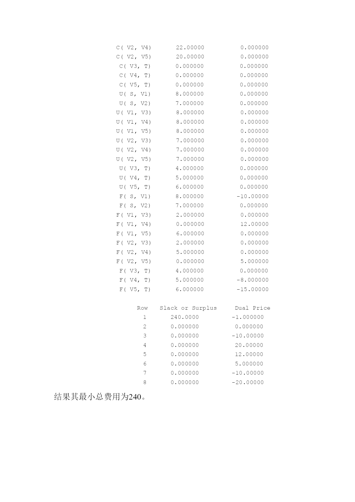 下表给出某运输问题的产销平衡表与单位运价表。将此问题转化为最小费用最大流问题,画出网络图并求数值解。产量销地123产量2030242252087销量456网络图如下,弧旁数字为.设为边(i,j)上的数量,为边(i,j)上的单位运费,则最小费用最大流的数学为边(i,j)上的额定容量,规划表达sets:points/s,v1,v2,v3,v4,v5,t/;edge(points,points)/s,v1s,v2v1,v3v1,v4v1,v5V2,v3v2,v4v2,v5v3,tv4,tV5,t/:c,u,f;endsetsdata:c=0020245302220000;u=87888777456;vf=15;enddatamin=@sum(edge(i,j):c(i,j)*f(i,j));@for(points(i)|i#ne#@index(s)#and#i#ne#@index(t):@sum(edge(i,j):f(i,j))-@sum(edge(j,i):f(j,i))=0;);@sum(edge(i,j)|i#eq#@index(s):f(i,j))=vf;@sum(edge(j,i)|i#eq#@index(t):f(j,i))=vf;@for(edge(i,j):@bnd(0,f(i,j),u(i,j)));endGlobaloptimalsolutionfound.Objectivevalue:240.0000Totalsolveriterations:1VariableValueReducedCostVF15.000000.000000C(S,V1)0.0000000.000000C(S,V2)0.0000000.000000C(V1,V3)20.000000.000000C(V1,V4)24.000000.000000C(V1,V5)5.0000000.000000C(V2,V3)30.000000.000000C(V2,V4)22.000000.000000C(V2,V5)20.000000.000000C(V3,T)0.0000000.000000C(V4,T)0.0000000.000000C(V5,T)0.0000000.000000U(S,V1)8.0000000.000000U(S,V2)7.0000000.000000U(V1,V3)8.0000000.000000U(V1,V4)8.0000000.000000U(V1,V5)8.0000000.000000U(V2,V3)7.0000000.000000U(V2,V4)7.0000000.000000U(V2,V5)7.0000000.000000U(V3,T)4.0000000.000000U(V4,T)5.0000000.000000U(V5,T)6.0000000.000000F(S,V1)8.000000-10.00000F(S,V2)7.0000000.000000F(V1,V3)2.0000000.000000F(V1,V4)0.00000012.00000F(V1,V5)6.0000000.000000F(V2,V3)2.0000000.000000F(V2,V4)5.0000000.000000F(V2,V5)0.0000005.000000F(V3,T)4.0000000.000000F(V4,T)5.000000-8.000000F(V5,T)6.000000-15.00000RowSlackorSurplusDualPrice1240.0000-1.00000020.0000000.00000030.000000-10.0000040.00000020.0000050.00000012.0000060.0000005.00000070.000000-10.0000080.000000-20.00000结果其最小总费用为240。