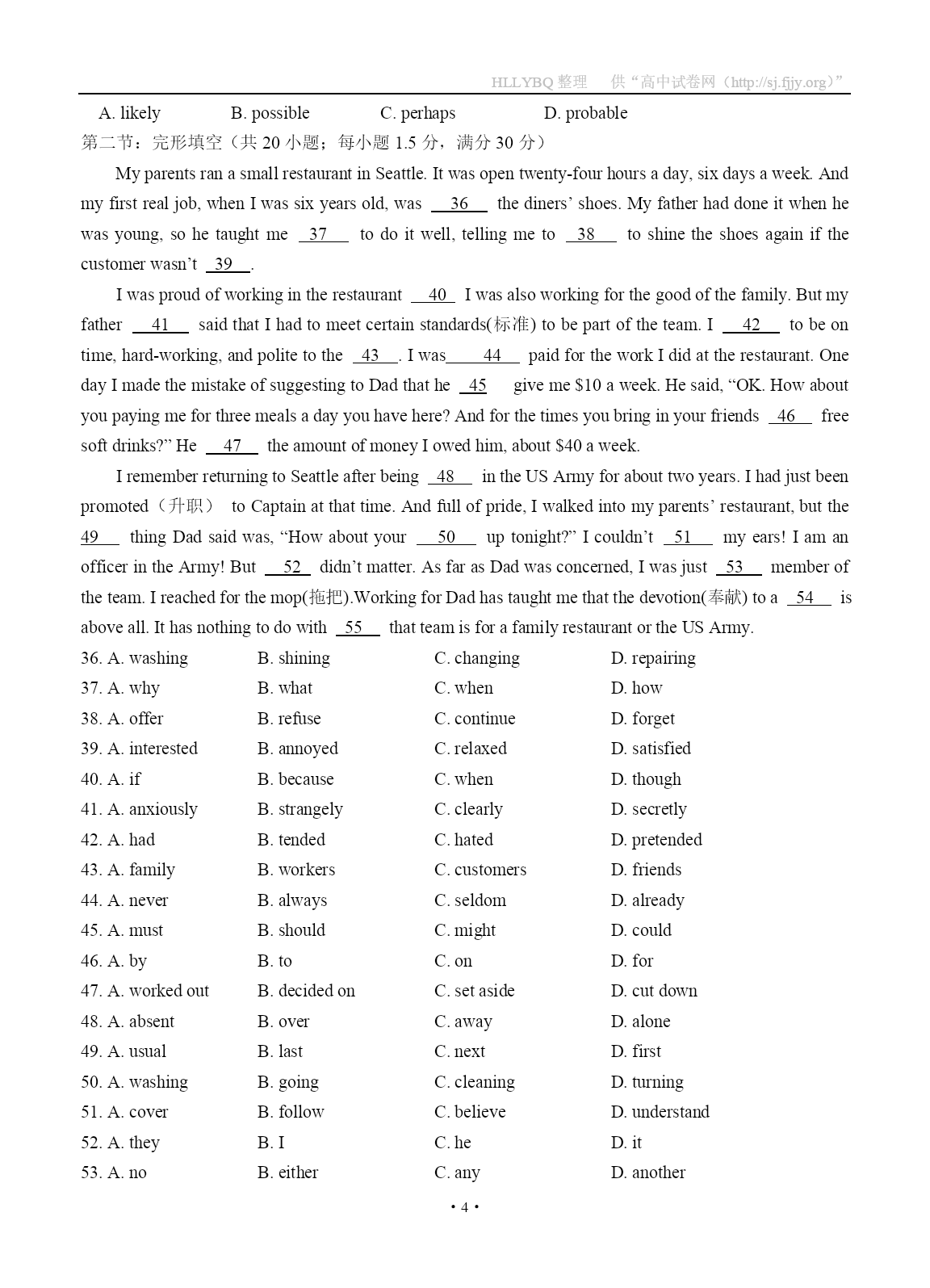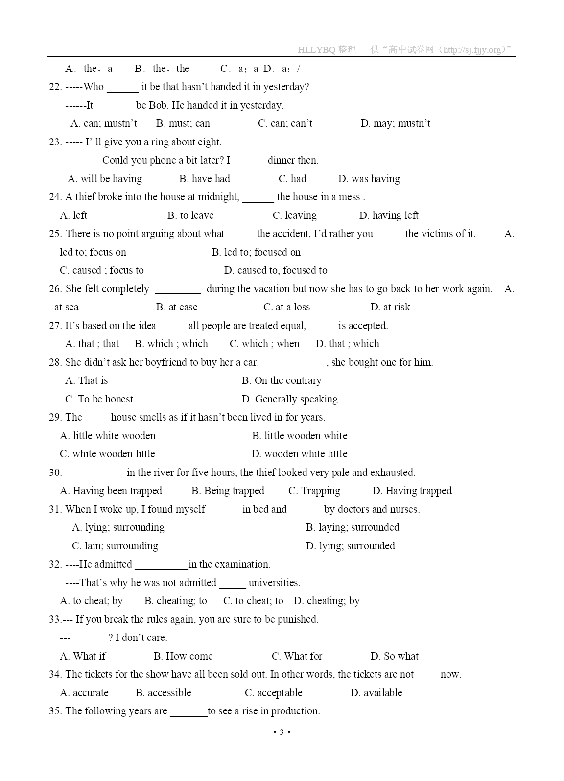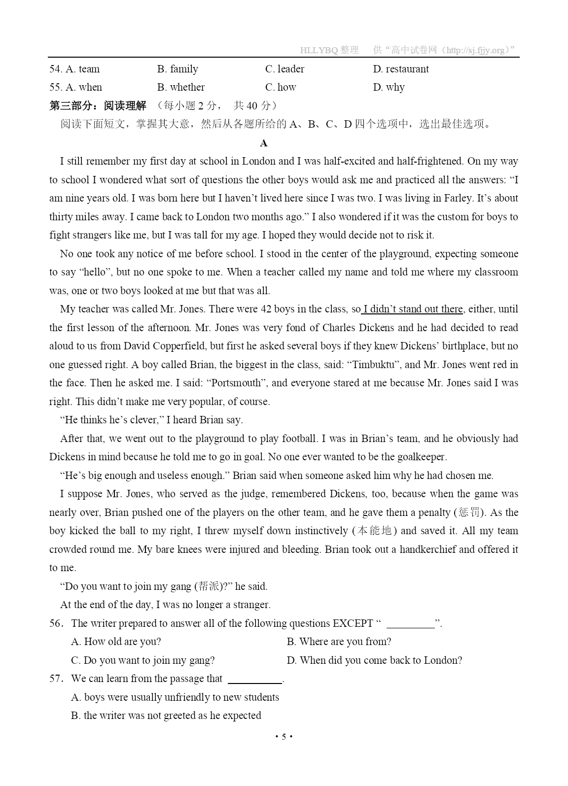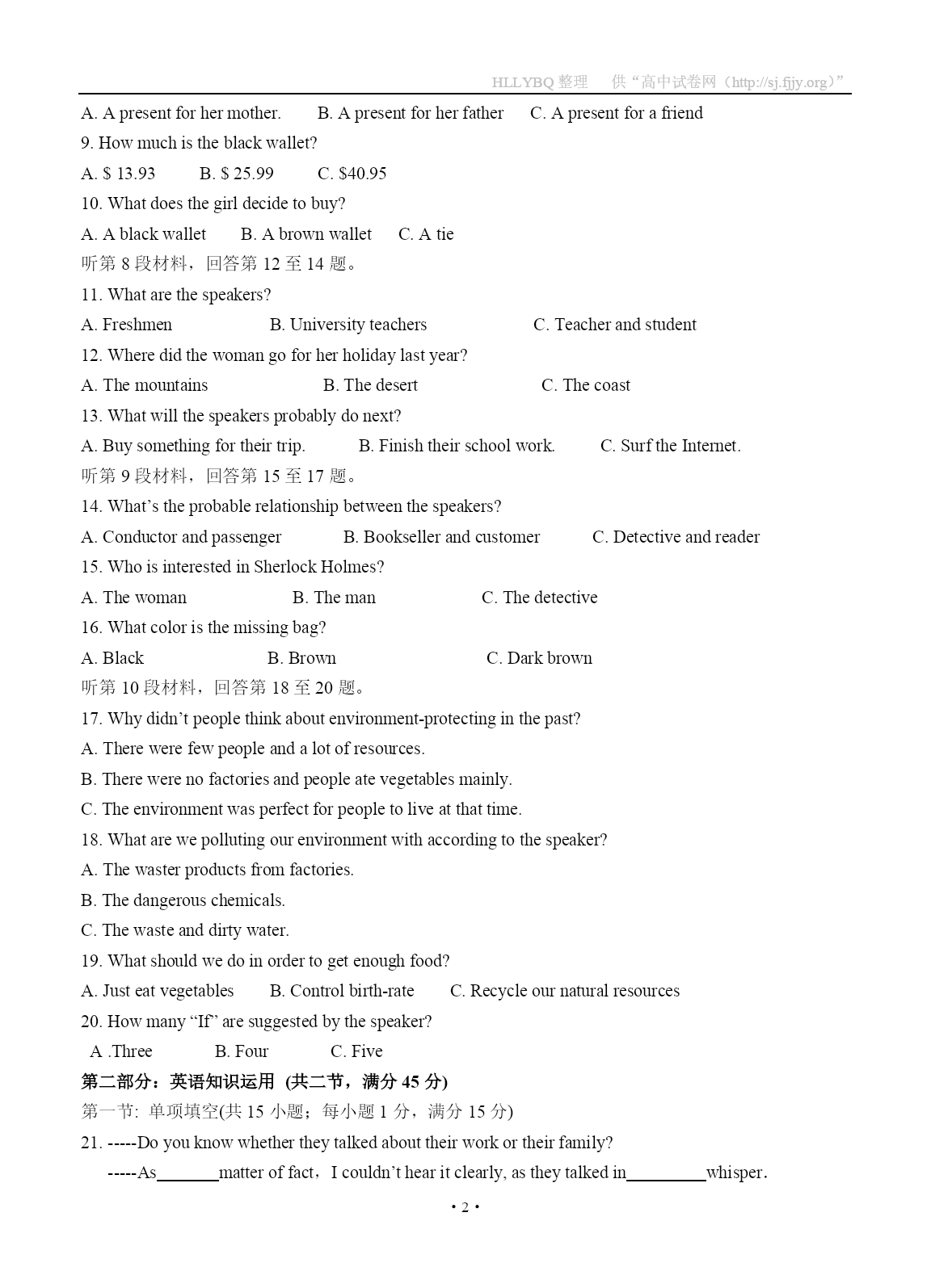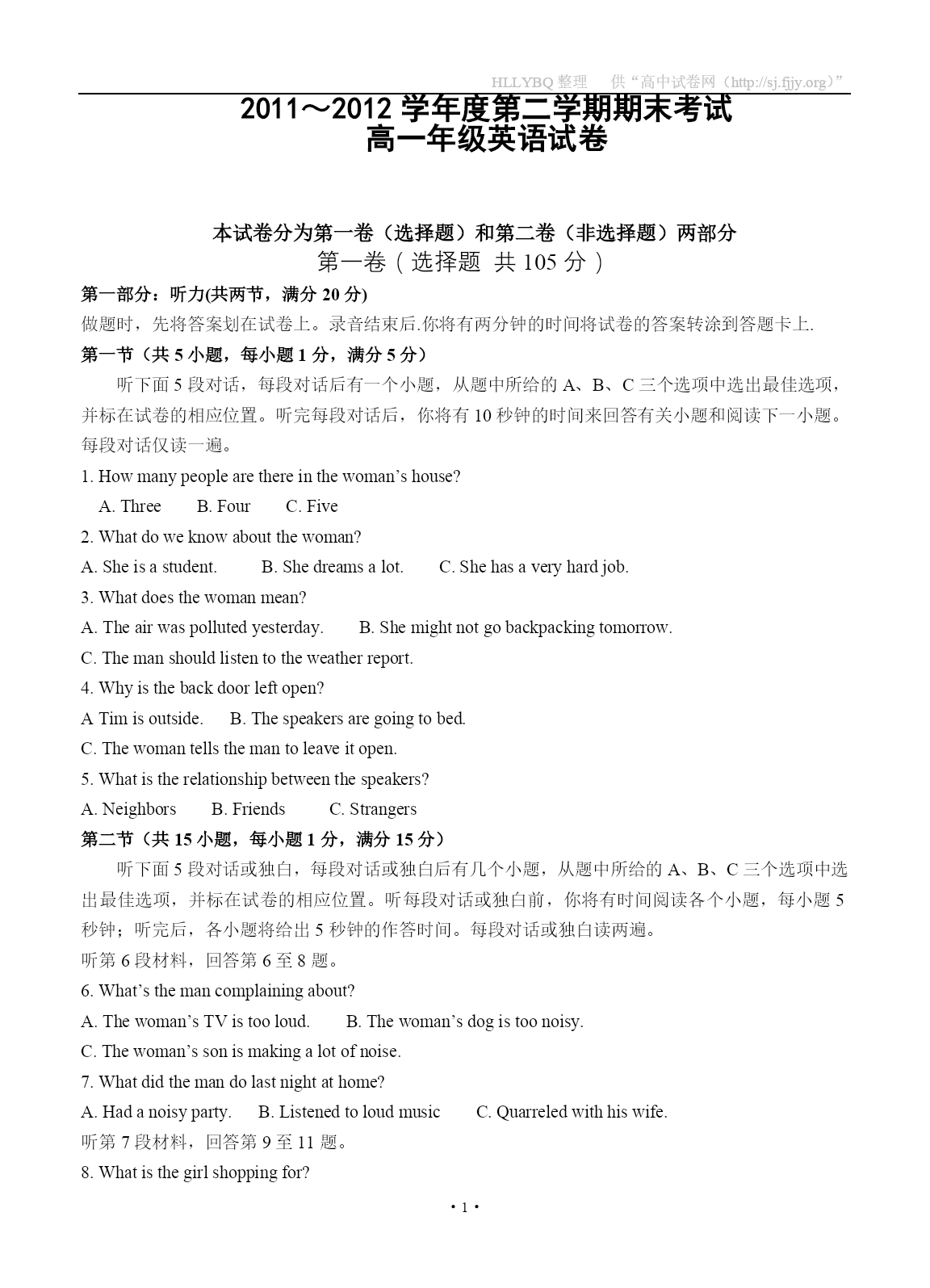 HLLYBQ整理供“高中试卷网(http://sj.fjjy.org)”··2011~2012学年度第二学期期末考试高一年级英语试卷本试卷分为第一卷(选择题)和第二卷(非选择题)两部分第一卷(选择题共105分)第一部分:听力(共两节,满分20分)做题时,先将答案划在试卷上。录音结束后.你将有两分钟的时间将试卷的答案转涂到答题卡上.第一节(共5小题,每小题1分,满分5分)听下面5段对话,每段对话后有一个小题,从题中所给的A、B、C三个选项中选出最佳选项,并标在试卷的相应位置。听完每段对话后,你将有10秒钟的时间来回答有关小题和阅读下一小题。每段对话仅读一遍。1.Howmanypeoplearethereinthewoman’shouse?A.ThreeB.FourC.Five2.Whatdoweknowaboutthewoman?A.Sheisastudent.B.Shedreamsalot.C.Shehasaveryhardjob.3.Whatdoesthewomanmean?A.Theairwaspollutedyesterday.B.Shemightnotgobackpackingtomorrow.C.Themanshouldlistentotheweatherreport.4.Whyisthebackdoorleftopen?ATimisoutside.B.Thespeakersaregoingtobed.C.Thewomantellsthemantoleaveitopen.5.Whatistherelationshipbetweenthespeakers?A.NeighborsB.FriendsC.Strangers第二节(共15小题,每小题1分,满分15分)听下面5段对话或独白,每段对话或独白后有几个小题,从题中所给的A、B、C三个选项中选出最佳选项,并标在试卷的相应位置。听每段对话或独白前,你将有时间阅读各个小题,每小题5秒钟;听完后,各小题将给出5秒钟的作答时间。每段对话或独白读两遍。听第6段材料,回答第6至8题。6.What’sthemancomplainingabout?A.Thewoman’sTVistooloud.B.Thewoman’sdogistoonoisy.C.Thewoman’ssonismakingalotofnoise.7.Whatdidthemandolastnightathome?A.Hadanoisyparty.B.ListenedtoloudmusicC.Quarreledwithhiswife.听第7段材料,回答第9至11题。8.Whatisthegirlshoppingfor?A.Apresentforhermother.B.ApresentforherfatherC.Apresentforafriend9.Howmuchistheblackwallet?A.$13.93B.$25.99C.$40.9510.Whatdoesthegirldecidetobuy?A.AblackwalletB.AbrownwalletC.Atie听第8段材料,回答第12至14题。11.Whatarethespeakers?A.FreshmenB.UniversityteachersC.Teacherandstudent12.Wheredidthewomangoforherholidaylastyear?A.ThemountainsB.ThedesertC.Thecoast13.Whatwillthespeakersprobablydonext?A.Buysomethingfortheirtrip.B.Finishtheirschoolwork.C.SurftheInternet.听第9段材料,回答第15至17题。14.What’stheprobablerelationshipbetweenthespeakers?A.ConductorandpassengerB.BooksellerandcustomerC.Detectiveandreader15.WhoisinterestedinSherlockHolmes?A.ThewomanB.ThemanC.Thedetective16.Whatcoloristhemissingbag?A.BlackB.BrownC.Darkbrown听第10段材料,回答第18至20题。17.Whydidn’tpeoplethinkaboutenvironment-protectinginthepast?A.Therewerefewpeopleandalotofresources.B.Therewerenofactoriesandpeopleateveg