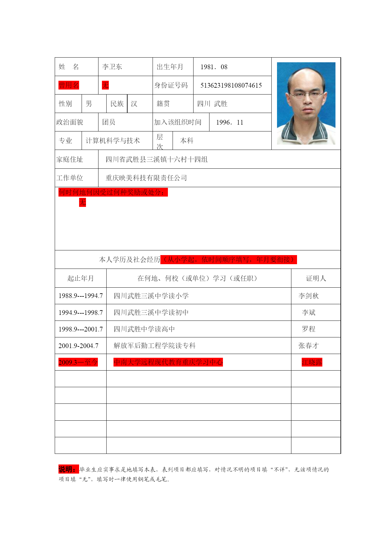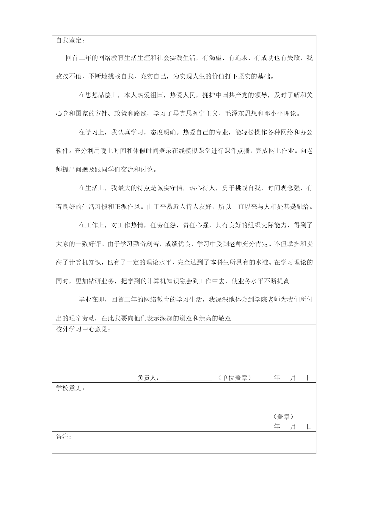 学号09031010701001中南大学现代远程教育毕业生登记表姓名李卫东专业计算机科学与技术层次本科管理中心重庆教学管理中心学习中心重庆直属学习中心填表日期2011年12月1日姓名李卫东出生年月1981.08近期一寸照片曾用名无身份证号码513623198108074615性别男民族汉籍贯四川武胜政治面貌团员加入该组织时间1996.11专业计算机科学与技术层次本科家庭住址四川省武胜县三溪镇十六村十四组工作单位重庆映美科技有限责任公司何时何地何因受过何种奖励或处分:无本人学历及社会经历(从小学起,依时间顺序填写,年月要衔接)起止年月在何地、何校(或单位)学习(或任职)证明人1988.9---1994.7四川武胜三溪中学读小学李剑秋1994.9---1998.7四川武胜三溪中学读初中李斌1998.9---2001.7四川武胜中学读高中罗程2001.9-2004.7解放军后勤工程学院读专科张春才2009.3—至今中南大学远程现代教育重庆学习中心江晓露说明:毕业生应实事求是地填写本表,表列项目都应填写,对情况不明的项目填“不详”,无该项情况的项目填“无”,填写时一律使用钢笔或毛笔。自我鉴定:回首二年的网络教育生活生涯和社会实践生活,有渴望、有追求、有成功也有失败,我孜孜不倦,不断地挑战自我,充实自己,为实现人生的价值打下坚实的基础。在思想品德上,本人热爱祖国,热爱人民,拥护中国共产党的领导,及时了解和关心党和国家的方针、政策和路线,学习了马克思列宁主义、毛泽东思想和邓小平理论。在学习上,我认真学习,态度明确。热爱自己的专业,能轻松操作各种网络和办公软件。充分利用晚上时间和休假时间登录在线模拟课堂进行课件点播,完成网上作业。向老师提出问题及跟同学们交流和讨论。在生活上,我最大的特点是诚实守信,热心待人,勇于挑战自我,时间观念强,有着良好的生活习惯和正派作风。由于平易近人待人友好,所以一直以来与人相处甚是融洽。在工作上,对工作热情,任劳任怨,责任心强,具有良好的组织交际能力,得到了大家的一致好评。由于学习勤奋刻苦,成绩优良,学习中受到老师充分肯定。不但掌握和提高了计算机知识,也有了一定的理论水平,完全达到了本科生所具有的水准。在学习理论的同时,更加钻研业务,把学到的计算机知识融会到工作中去,使业务水平不断提高。毕业在即,回首二年的网络教育的学习生活,我深深地体会到学院老师为我们所付出的艰辛劳动,在此我要向他们表示深深的谢意和崇高的敬意校外学习中心意见:负责人:(单位盖章)年月日学校意见:(盖章)年月日备注:
