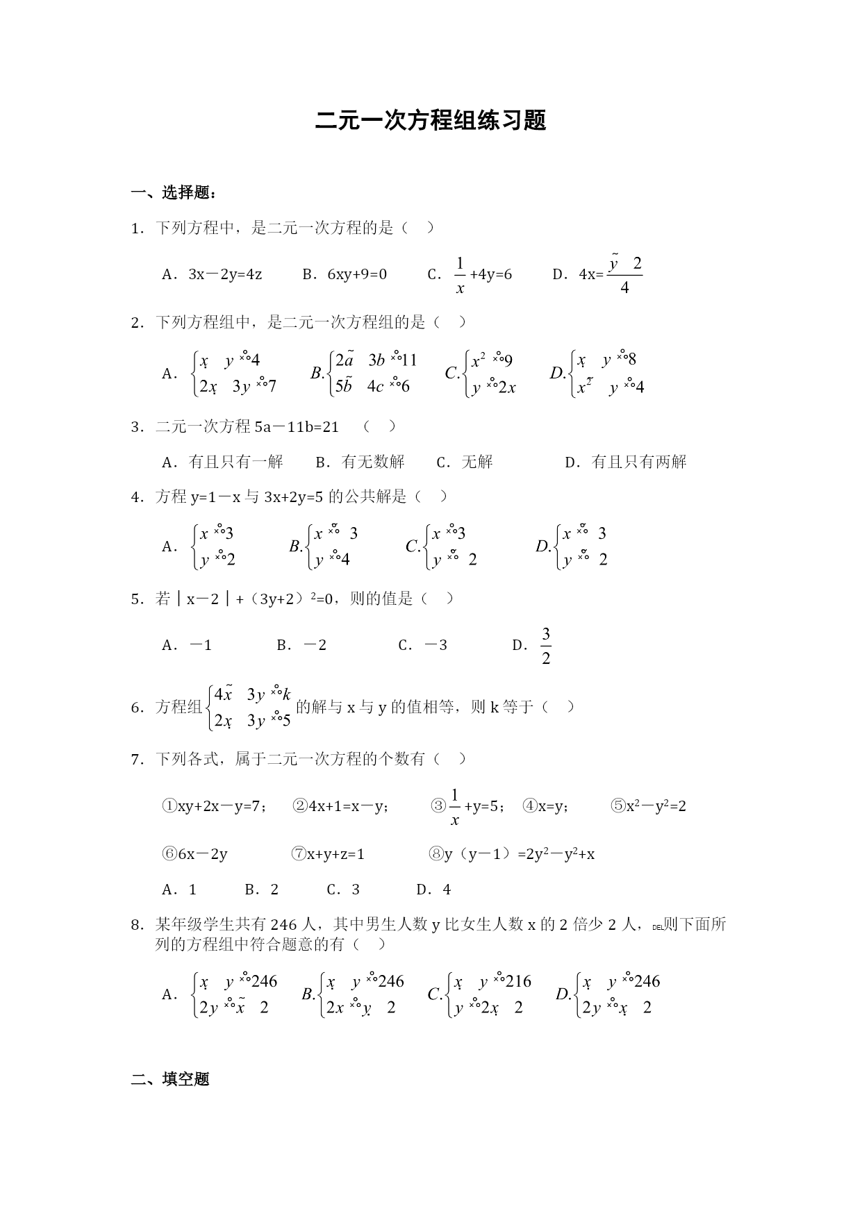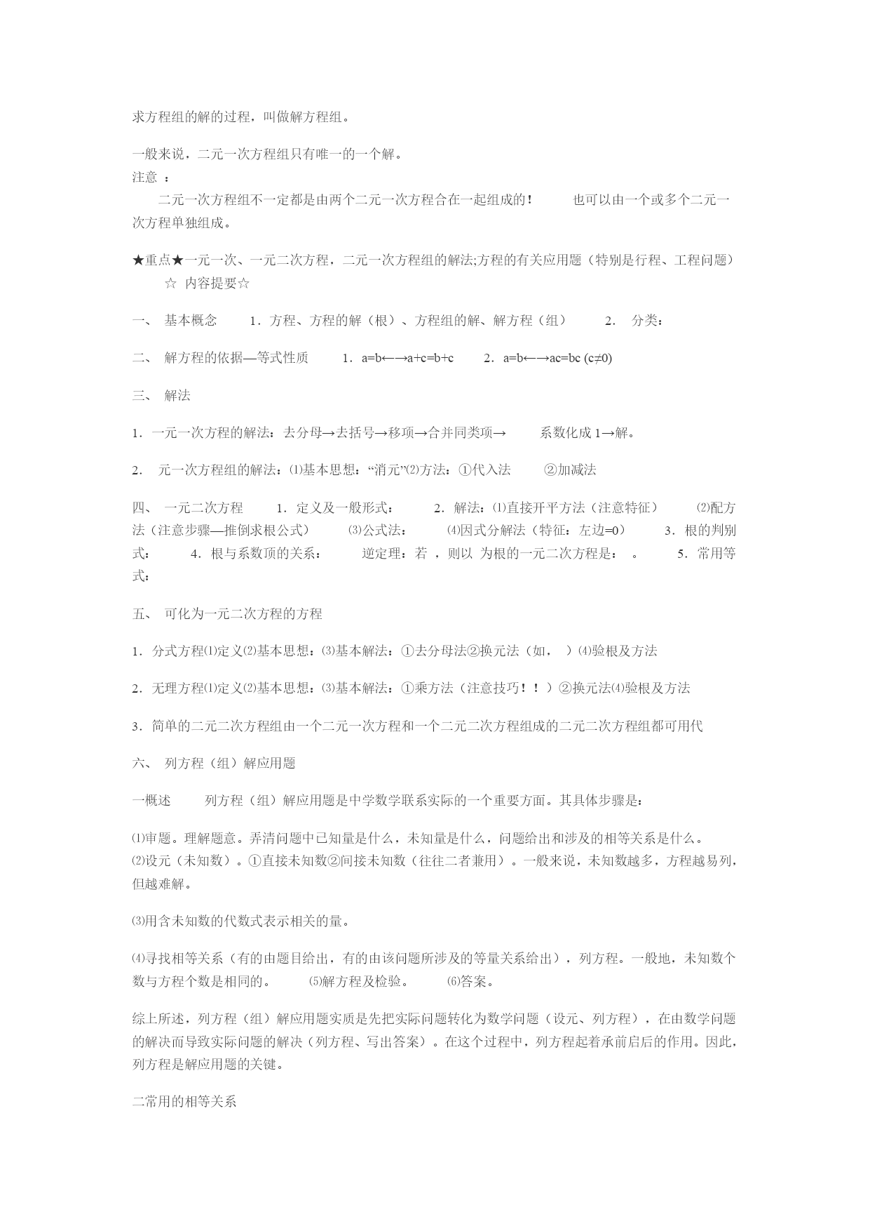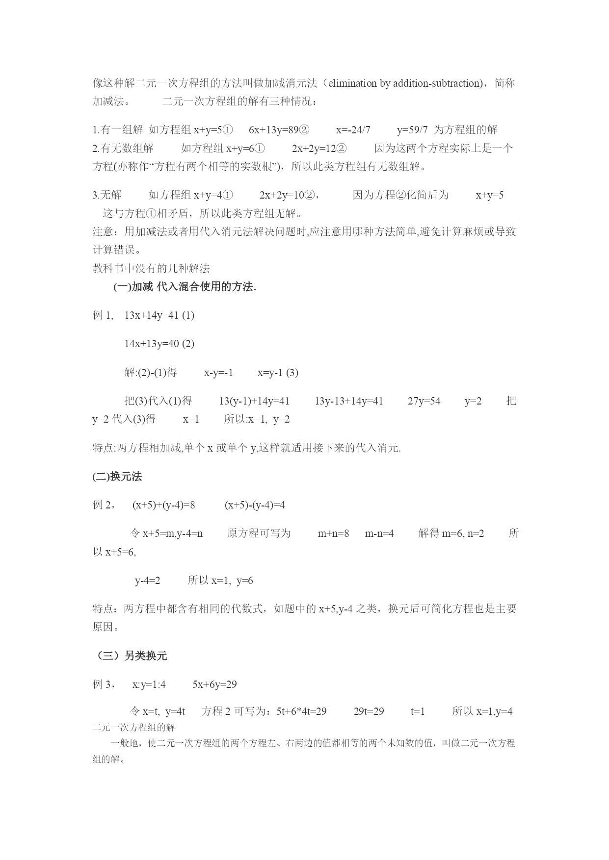 二元一次方程组知识点归纳、解题技巧汇总、练习题及答案把两个一次方程联立在一起,那么这两个方程就组成了一个二元一次方程组。有几个方程组成的一组方程叫做方程组。如果方程组中含有两个未知数,且含未知数的项的次数都是一次,那么这样的方程组叫做二元一次方程组。二元一次方程定义:一个含有两个未知数,并且未知数的都指数是1的整式方程,叫二元一次方程。二元一次方程组定义:两个结合在一起的共含有两个未知数的一次方程,叫二元一次方程组。二元一次方程的解:使二元一次方程两边的值相等的两个未知数的值,叫做二元一次方程的解。二元一次方程组的解:二元一次方程组的两个公共解,叫做二元一次方程组的解。一般解法,消元:将方程组中的未知数个数由多化少,逐一解决。消元的方法有两种:代入消元法例:解方程组x+y=5①6x+13y=89②解:由①得x=5-y③把③带入②,得6(5-y)+13y=89y=59/7把y=59/7带入③,x=5-59/7即x=-24/7∴x=-24/7y=59/7为方程组的解我们把这种通过“代入”消去一个未知数,从而求出方程组的解的方法叫做代入消元法(eliminationbysubstitution),简称代入法。加减消元法例:解方程组x+y=9①x-y=5②解:①+②2x=14即x=7把x=7带入①得7+y=9解得y=-2∴x=7y=-2为方程组的解像这种解二元一次方程组的方法叫做加减消元法(eliminationbyaddition-subtraction),简称加减法。二元一次方程组的解有三种情况:1.有一组解如方程组x+y=5①6x+13y=89②x=-24/7y=59/7为方程组的解2.有无数组解如方程组x+y=6①2x+2y=12②因为这两个方程实际上是一个方程(亦称作“方程有两个相等的实数根”),所以此类方程组有无数组解。3.无解如方程组x+y=4①2x+2y=10②,因为方程②化简后为x+y=5这与方程①相矛盾,所以此类方程组无解。注意:用加减法或者用代入消元法解决问题时,应注意用哪种方法简单,避免计算麻烦或导致计算错误。教科书中没有的几种解法(一)加减-代入混合使用的方法.例1,13x+14y=41(1)14x+13y=40(2)解:(2)-(1)得x-y=-1x=y-1(3)把(3)代入(1)得13(y-1)+14y=4113y-13+14y=4127y=54y=2把y=2代入(3)得x=1所以:x=1,y=2特点:两方程相加减,单个x或单个y,这样就适用接下来的代入消元.(二)换元法例2,(x+5)+(y-4)=8(x+5)-(y-4)=4令x+5=m,y-4=n原方程可写为m+n=8m-n=4解得m=6,n=2所以x+5=6,y-4=2所以x=1,y=6特点:两方程中都含有相同的代数式,如题中的x+5,y-4之类,换元后可简化方程也是主要原因。(三)另类换元例3,x:y=1:45x+6y=29令x=t,y=4t方程2可写为:5t+6*4t=2929t=29t=1所以x=1,y=4二元一次方程组的解一般地,使二元一次方程组的两个方程左、右两边的值都相等的两个未知数的值,叫做二元一次方程组的解。求方程组的解的过程,叫做解方程组。一般来说,二元一次方程组只有唯一的一个解。注意:二元一次方程组不一定都是由两个二元一次方程合在一起组成的!也可以由一个或多个二元一次方程单独组成。★重点★一元一次、一元二次方程,二元一次方程组的解法;方程的有关应用题(特别是行程、工程问题)☆内容提要☆一、基本概念1.方程、方程的解(根)、方程组的解、解方程(组)2.分类:二、解方程的依据—等式性质1.a=b←→a+c=b+c2.a=b←→ac=bc(c≠0)三、解法1.一元一次方程的解法:去分母→去括号→移项→合并同类项→系数化成1→解。2.元一次方程组的解法:⑴基本思想:“消元”⑵方法:①代入法②加减法四、一元二次方程1.定义及一般形式:2.解法:⑴直接开平方法(注意特征)⑵配方法(注意步骤—推倒求根公式)⑶公式法:⑷因式分解法(特征:左边=0)3.根的判别式:4.根与系数顶的关系:逆定理:若,则以为根的一元二次方程是:。5.常用等式:五、可化为一元二次方程的方程1.分式方程⑴定义⑵基本思想:⑶基本解法:①去分母法②换元法(如,)⑷验根及方法2.无理方程⑴定义⑵基本思想:⑶基本解法:①乘方法(注意技巧!!)②换元法⑷验根及方法3.简单的二元二次方程组由一个二元一次方程和一个二元二次方程组成的二元二次方程组都可用代六、列方程(组)解应用题一概述列方程(组)解应用题是中学数学联系实际的一个重要方面。其具体步骤是:⑴审题。理解题意。弄清问题中已知量是什么,未知量是什么,问题给出和涉及的相等关系是什么。⑵设元(未知数)。①直接未知数②间接未知数(往往