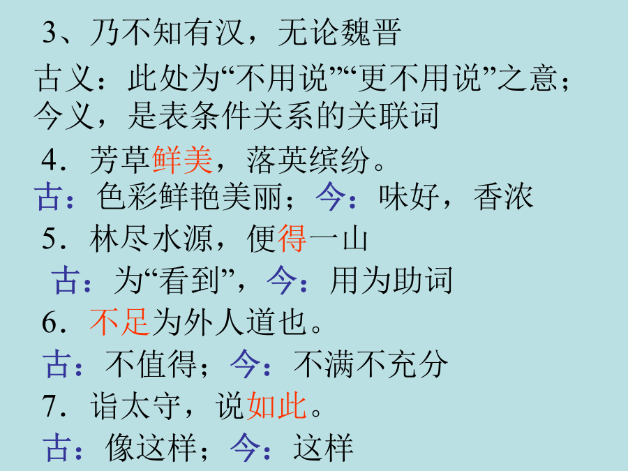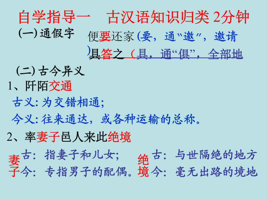 桃花源记本节课学习目标7.诣太守,说如此。(三)一词多义①寻向所志①武陵人捕鱼为业(四)文言句式一(四)文言句式二自学指导二分析文章的内容一、文章的结构分析幽美好客缘溪行,忘路之远近。忽逢桃花林……作业