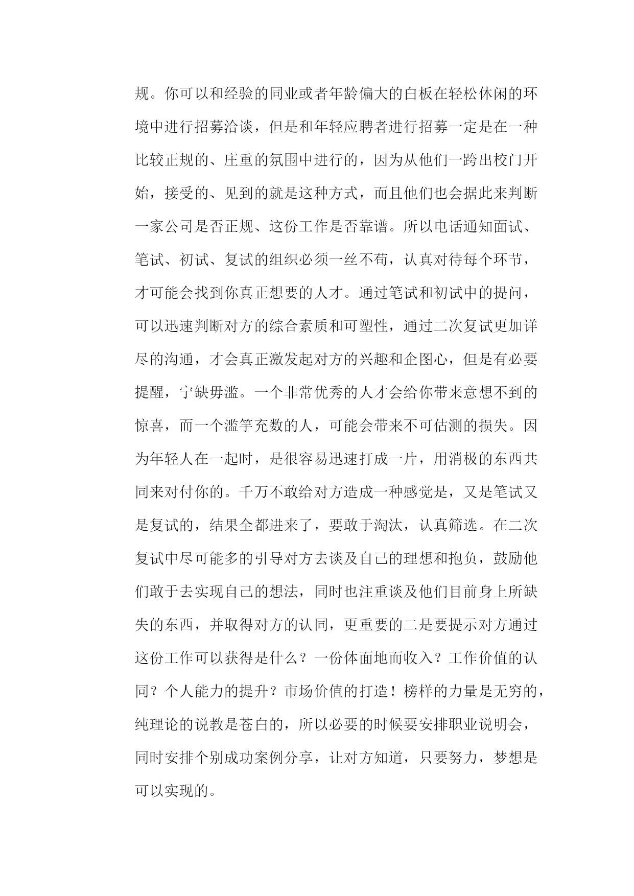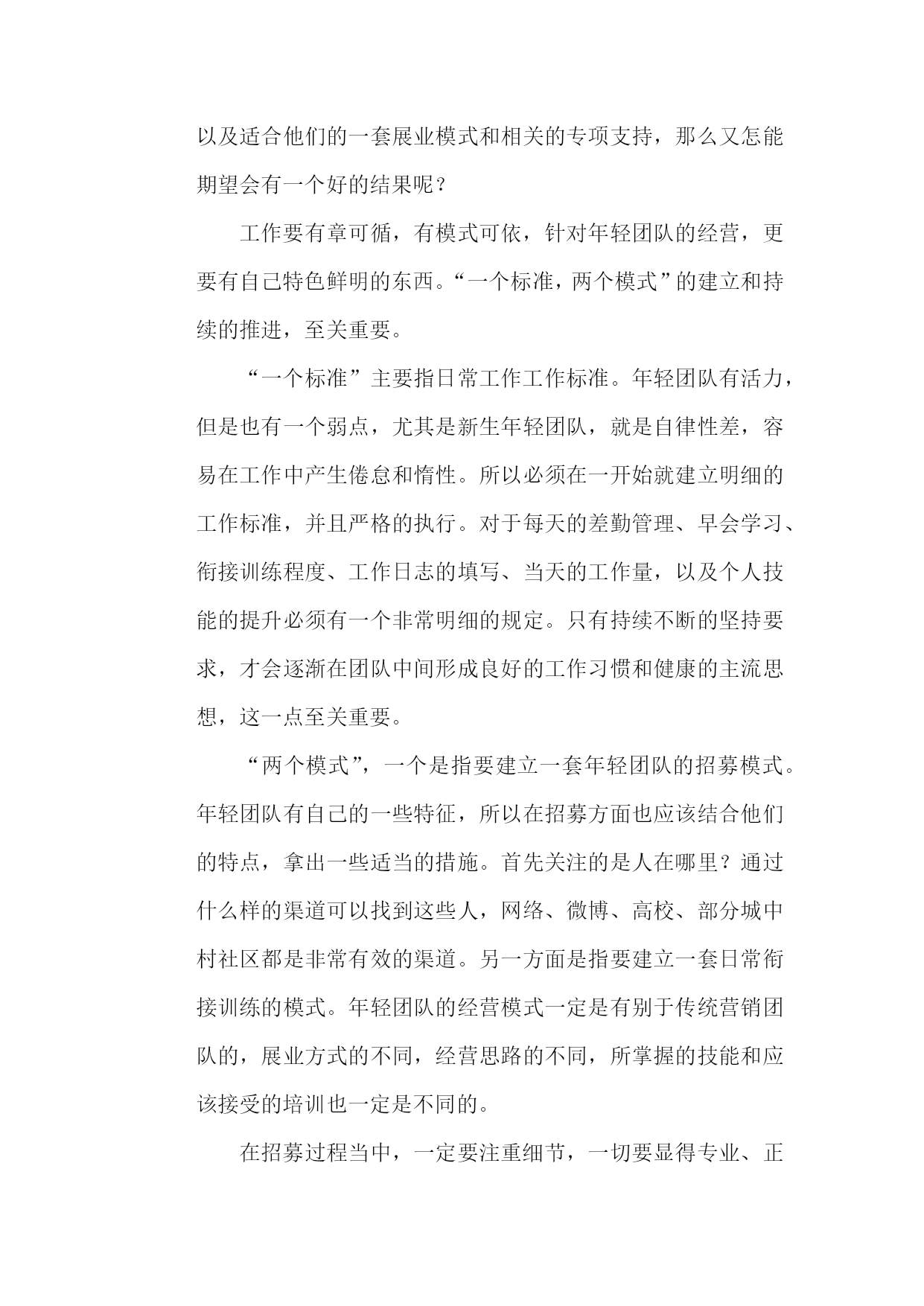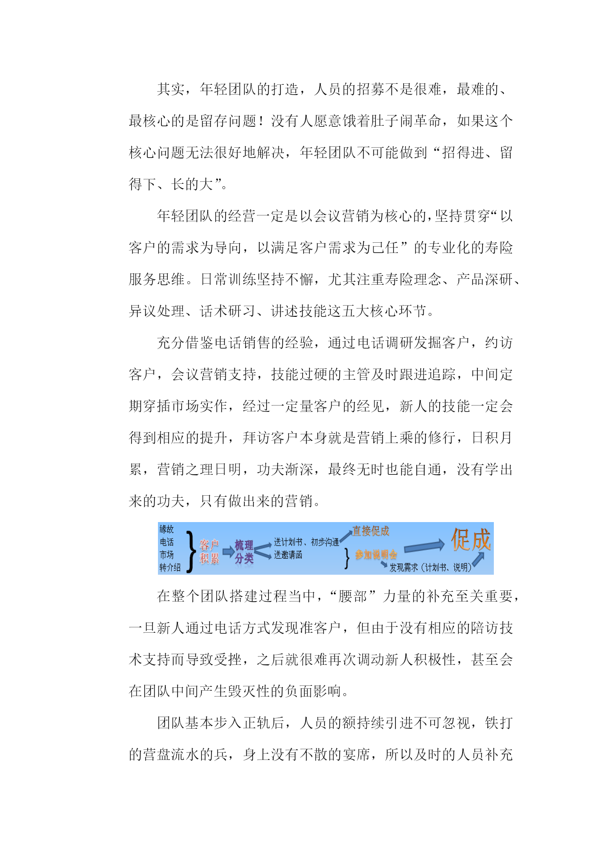 关于寿险营销年轻团队经营的几点思考寿险营销团队年轻化、专业化、高学历化是大势所趋,也是保监会为扭转保险销售误导,重塑行业形象的需要,但是放眼全国,虽然很地方都已经开始尝试招募年轻大学生团队,但是真正运作成功的却不多。但是一旦这样的团队真的步入正轨,他们所创造的产能和价值却也是令人叹为观止的。回顾自己既往的工作经历,感触颇深。首先要坚定一个信念,那就是年轻团队一定是行业大势所趋,是未来的主流方向。但是仍然有很多人坚定的认为,年轻人是做不了保险的,究其原因,留存很难,会归结为年轻人大多为外来的学生,没有缘故市场,在当地没有成熟的人脉关系,所认识的人群大多和他们一样一穷二白,甚至更会认为今天的80后、90后吃苦能力不足,心浮气躁,总而言之,虽然学习力很强,但终究属于纸上谈兵,并不能真的把学到点额知识变成客户、变成保费。当然年轻团队是有属于他们的一些特质,定力差一些,面对外界诱惑时容易动摇,甚至抗压性、以及做事的毅力都会差一点,但是客观地讲,他们身上也有很多不可多得的优势,比如:学习力很强,脑子活,会有很多创新理念,专业水准能在短时间较大程度的提升,自主性强等。但是年轻团队的留存是首要问题。有人说,“用一千种方法去追寻一个结果,是人才,用一种方法想得到不同的结果,是蠢材”,事实上,我也见过很多公司在招募年轻大学生,但却没有相匹配的培训和衔接训练以及适合他们的一套展业模式和相关的专项支持,那么又怎能期望会有一个好的结果呢?工作要有章可循,有模式可依,针对年轻团队的经营,更要有自己特色鲜明的东西。“一个标准,两个模式”的建立和持续的推进,至关重要。“一个标准”主要指日常工作工作标准。年轻团队有活力,但是也有一个弱点,尤其是新生年轻团队,就是自律性差,容易在工作中产生倦怠和惰性。所以必须在一开始就建立明细的工作标准,并且严格的执行。对于每天的差勤管理、早会学习、衔接训练程度、工作日志的填写、当天的工作量,以及个人技能的提升必须有一个非常明细的规定。只有持续不断的坚持要求,才会逐渐在团队中间形成良好的工作习惯和健康的主流思想,这一点至关重要。“两个模式”,一个是指要建立一套年轻团队的招募模式。年轻团队有自己的一些特征,所以在招募方面也应该结合他们的特点,拿出一些适当的措施。首先关注的是人在哪里?通过什么样的渠道可以找到这些人,网络、微博、高校、部分城中村社区都是非常有效的渠道。另一方面是指要建立一套日常衔接训练的模式。年轻团队的经营模式一定是有别于传统营销团队的,展业方式的不同,经营思路的不同,所掌握的技能和应该接受的培训也一定是不同的。在招募过程当中,一定要注重细节,一切要显得专业、正规。你可以和经验的同业或者年龄偏大的白板在轻松休闲的环境中进行招募洽谈,但是和年轻应聘者进行招募一定是在一种比较正规的、庄重的氛围中进行的,因为从他们一跨出校门开始,接受的、见到的就是这种方式,而且他们也会据此来判断一家公司是否正规、这份工作是否靠谱。所以电话通知面试、笔试、初试、复试的组织必须一丝不苟,认真对待每个环节,才可能会找到你真正想要的人才。通过笔试和初试中的提问,可以迅速判断对方的综合素质和可塑性,通过二次复试更加详尽的沟通,才会真正激发起对方的兴趣和企图心,但是有必要提醒,宁缺毋滥。一个非常优秀的人才会给你带来意想不到的惊喜,而一个滥竽充数的人,可能会带来不可估测的损失。因为年轻人在一起时,是很容易迅速打成一片,用消极的东西共同来对付你的。千万不敢给对方造成一种感觉是,又是笔试又是复试的,结果全都进来了,要敢于淘汰,认真筛选。在二次复试中尽可能多的引导对方去谈及自己的理想和抱负,鼓励他们敢于去实现自己的想法,同时也注重谈及他们目前身上所缺失的东西,并取得对方的认同,更重要的二是要提示对方通过这份工作可以获得是什么?一份体面地而收入?工作价值的认同?个人能力的提升?市场价值的打造!榜样的力量是无穷的,纯理论的说教是苍白的,所以必要的时候要安排职业说明会,同时安排个别成功案例分享,让对方知道,只要努力,梦想是可以实现的。其实,年轻团队的打造,人员的招募不是很难,最难的、最核心的是留存问题!没有人愿意饿着肚子闹革命,如果这个核心问题无法很好地解决,年轻团队不可能做到“招得进、留得下、长的大”。年轻团队的经营一定是以会议营销为核心的,坚持贯穿“以客户的需求为导向,以满足客户需求为己任”的专业化的寿险服务思维。日常训练坚持不懈,尤其注重寿险理念、产品深研、异议处理、话术研习、讲述技能这五大核心环节。充分借鉴电话销售的经验,通过电话调研发掘客户,约访客户,会议营销支持,技能过硬的主管及时跟进追踪,中间定期穿插市场实作,经过一定量客户的经见,新人的技能一定会得到相应的提升,拜访客户本身就是营销上乘的修行,日积月累,营销之理日明,功夫渐深,最终无时也能自通,没有