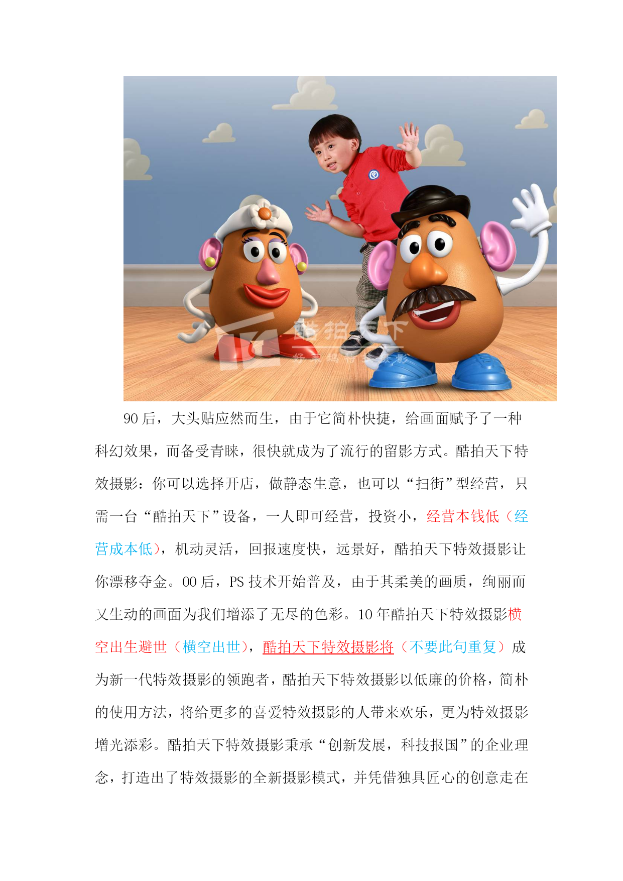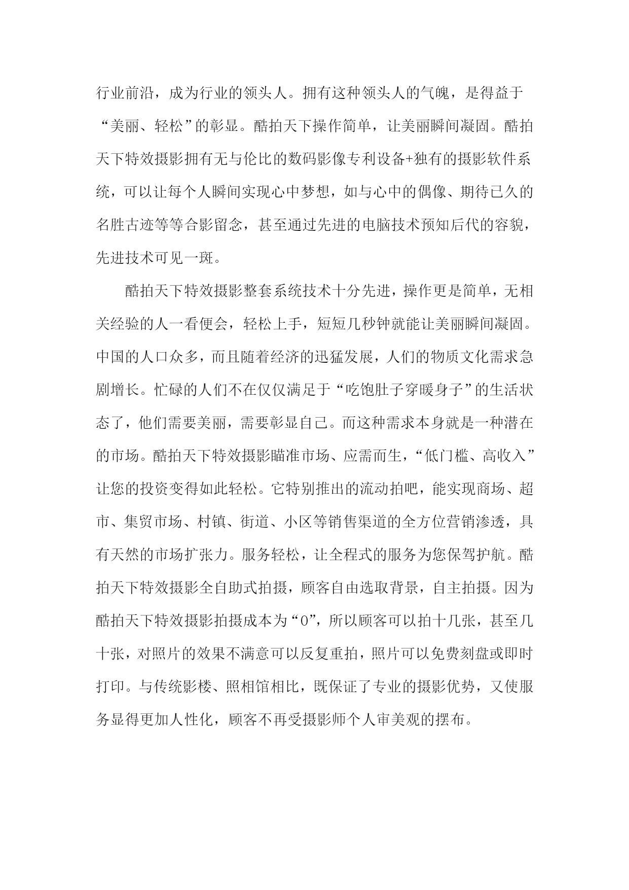 酷拍天下记录每一个美丽故事,让记忆镌刻幸福光阴催人老。一晃百年,珍惜时光,光阴会给你留下无边的乐趣和极大的收获。虚度时日,光阴回报你的则是无尽的懊悔与失败。昨天已经成为过去,生活在回忆中是无知,熟悉的地方离我们远去,我们不能在思念中留恋和无法自拔。我们唯一能做的就是把自己美好的时光用自己的双手记录下来,每一次成长的经历,每一个美丽的故事,照片能够帮你记录下生活的精彩点滴。摄影——自然是其中最好的选择之一,轻轻一摁,美丽岁月瞬间定格,成为经典的回忆。但随之而来的一个问题便是“千篇一律的背景无法改变,再美丽的记忆也会黯然失色。”这让许多人产生疑问,有没有一种方式能够解决这个问题,让留住美丽的愿望变得轻松?酷拍天下特效摄影给了消费者们最好的答案——“有”!它以千变万化的背景、多样娴熟的技术、绚烂多姿的制作,让留住美丽不再繁琐,几秒便能轻松搞定。90后,大头贴应然而生,由于它简朴快捷,给画面赋予了一种科幻效果,而备受青睐,很快就成为了流行的留影方式。酷拍天下特效摄影:你可以选择开店,做静态生意,也可以“扫街”型经营,只需一台“酷拍天下”设备,一人即可经营,投资小,经营本钱低(经营成本低),机动灵活,回报速度快,远景好,酷拍天下特效摄影让你漂移夺金。00后,PS技术开始普及,由于其柔美的画质,绚丽而又生动的画面为我们增添了无尽的色彩。10年酷拍天下特效摄影横空出生避世(横空出世),酷拍天下特效摄影将(不要此句重复)成为新一代特效摄影的领跑者,酷拍天下特效摄影以低廉的价格,简朴的使用方法,将给更多的喜爱特效摄影的人带来欢乐,更为特效摄影增光添彩。酷拍天下特效摄影秉承“创新发展,科技报国”的企业理念,打造出了特效摄影的全新摄影模式,并凭借独具匠心的创意走在行业前沿,成为行业的领头人。拥有这种领头人的气魄,是得益于“美丽、轻松”的彰显。酷拍天下操作简单,让美丽瞬间凝固。酷拍天下特效摄影拥有无与伦比的数码影像专利设备+独有的摄影软件系统,可以让每个人瞬间实现心中梦想,如与心中的偶像、期待已久的名胜古迹等等合影留念,甚至通过先进的电脑技术预知后代的容貌,先进技术可见一斑。酷拍天下特效摄影整套系统技术十分先进,操作更是简单,无相关经验的人一看便会,轻松上手,短短几秒钟就能让美丽瞬间凝固。中国的人口众多,而且随着经济的迅猛发展,人们的物质文化需求急剧增长。忙碌的人们不在仅仅满足于“吃饱肚子穿暖身子”的生活状态了,他们需要美丽,需要彰显自己。而这种需求本身就是一种潜在的市场。酷拍天下特效摄影瞄准市场、应需而生,“低门槛、高收入”让您的投资变得如此轻松。它特别推出的流动拍吧,能实现商场、超市、集贸市场、村镇、街道、小区等销售渠道的全方位营销渗透,具有天然的市场扩张力。服务轻松,让全程式的服务为您保驾护航。酷拍天下特效摄影全自助式拍摄,顾客自由选取背景,自主拍摄。因为酷拍天下特效摄影拍摄成本为“0”,所以顾客可以拍十几张,甚至几十张,对照片的效果不满意可以反复重拍,照片可以免费刻盘或即时打印。与传统影楼、照相馆相比,既保证了专业的摄影优势,又使服务显得更加人性化,顾客不再受摄影师个人审美观的摆布。