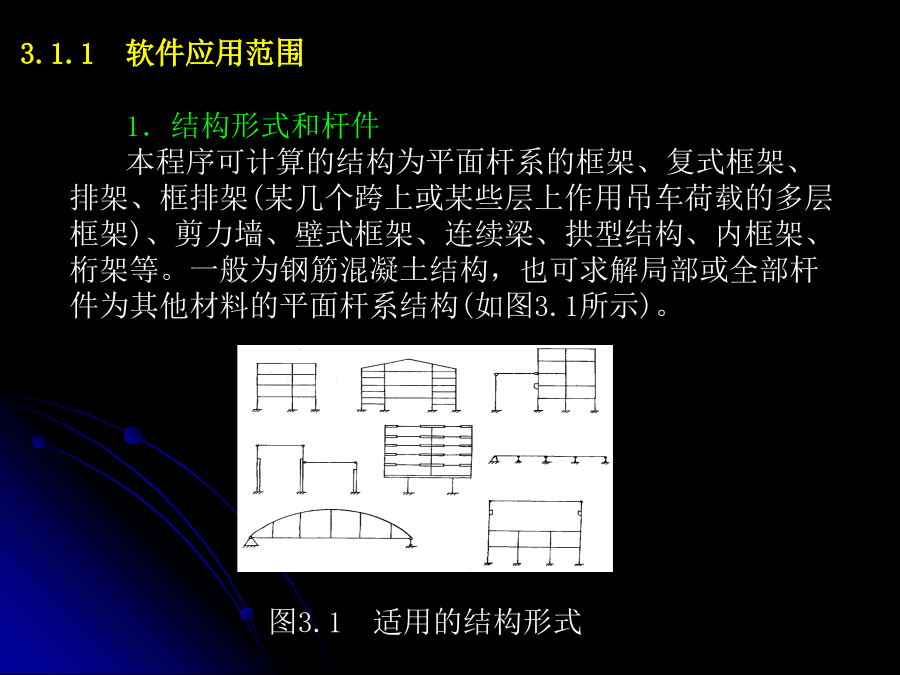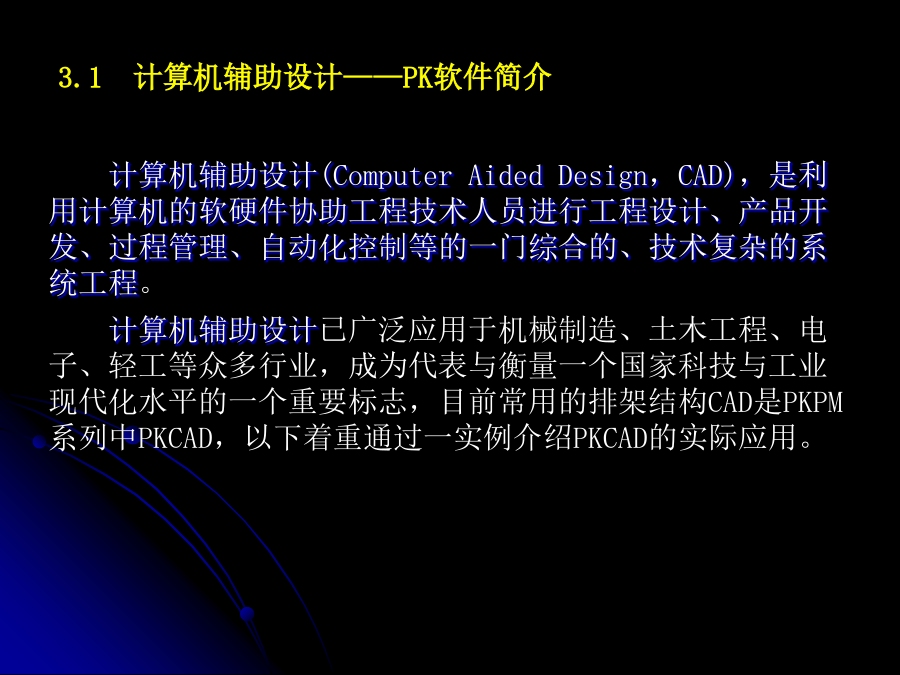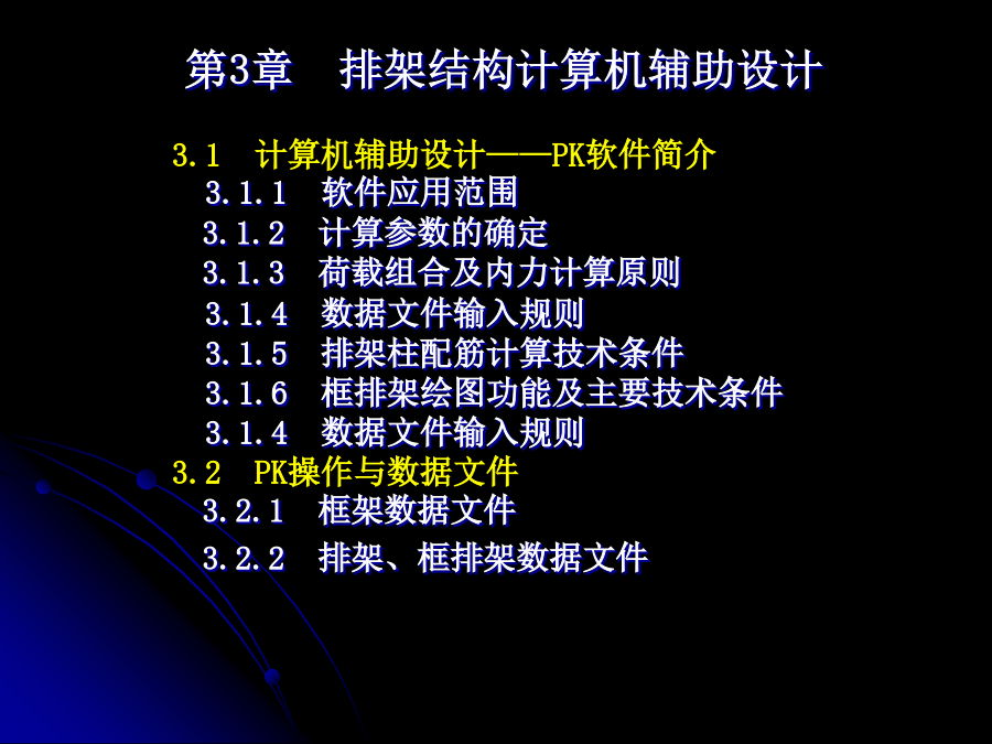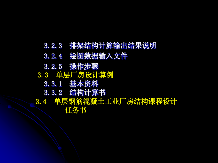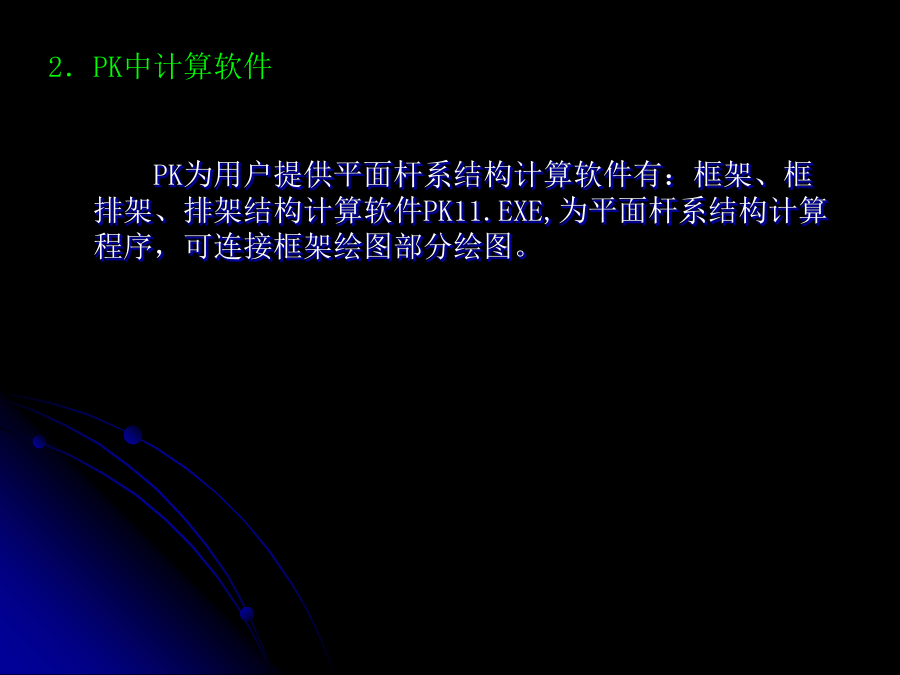第3章排架结构计算机辅助设计3.2.3排架结构计算输出结果说明3.2.4绘图数据输入文件3.2.5操作步骤3.3单层厂房设计算例3.3.1基本资料3.3.2结构计算书3.4单层钢筋混凝土工业厂房结构课程设计任务书3.1计算机辅助设计——PK软件简介计算机辅助设计(ComputerAidedDesign,CAD),是利用计算机的软硬件协助工程技术人员进行工程设计、产品开发、过程管理、自动化控制等的一门综合的、技术复杂的系统工程。计算机辅助设计已广泛应用于机械制造、土木工程、电子、轻工等众多行业,成为代表与衡量一个国家科技与工业现代化水平的一个重要标志,目前常用的排架结构CAD是PKPM系列中PKCAD,以下着重通过一实例介绍PKCAD的实际应用。3.1.1软件应用范围内力分析采用矩阵位移法,每一节点有水平位移,竖向位移,转角三个自由度。(2)在排架和框排架结构计算时(此时NJJ为负值),使用PK计算。柱段总根数≤45根,有吊车荷载的跨数≤7跨。排架的跨数≤9跨,排架柱的柱段总数≤25根3.1.2计算参数的确定3.1.3荷载组合及内力计算原则(2)程序认为以上作用在各节点、柱间、梁间活载都是相容的,程序在求解各杆件最不利组合时,各个活荷载既可以同时作用,又可以分别作用。(3)PK11程序还可以计算任意组互相排斥的活荷载,这样的活荷载各组之间不会同时作用,程序自动从各组中挑选出一组来作最不利布置组合。内力组合时应考虑:①多跨吊车竖向荷载按最不利的最多两跨考虑。②吊车水平荷载不论是单跨还是多跨厂房均按吊车荷载中不利的一跨考虑。③有地震荷载组合时吊车荷载中不再考虑水平刹车力内力组合时先进行吊车荷载的予组合。(2)排架柱的计算和绘图限于矩形断面和工字型断面,其配筋按对称配筋考虑。(3)根据国家规范GB50009—2001第5.2.2条,多跨吊车效应作用时乘以折减系数,该系数由用户输入。(4)根据抗震规范,对于15m高度以下的平面排架,地震计算时应考虑空间和扭转影响的效应调正系数,该系数由用户查规范输入。(5)排架柱地震计算时应考虑吊车桥架引起的地震剪力和弯矩增大系数,该系数由用户查规范输入。(6)牛腿计算时考虑吊车水平荷载。3.1.4数据文件输入规则2)规则框架程序自动形成节点和杆件编号。编号原则内定为:当层数≤跨数时,采用沿纵向Y的节点编号系统如图3.3所示;当层数>跨数或跨数大于10时,采用沿横向X的节点编号系统如图3.4所示。任何情况下,柱脚都最后编号。这样可保证规则框架在任何情况下,其总刚矩阵存储的变带宽最小,省内存容量和计算时间。节点和杆件编号举例如图3.3和图3.4所示,柱梁编号采用由左向右,自下而上的顺序。各跨跨度应以底层柱中心为准。图3.3层数≤跨数时编号系统3)排架、框排架均应按非规则框架填表排架柱段编号应按自下向上,自左至右的顺序,在牛腿顶处,变截面处均应设置节点。框排架计算柱梁编号,要将框架上的柱梁编在前面,排架柱上的柱段和与排架柱相连的两端铰支梁要编在后面,即:先编框架上的柱号,再编排架上的柱号,再编框架上梁号,最后编排架上梁号,这样,在PK2绘图时,框架绘图不再包含排架柱部分。排架柱的绘图由软件PJZ完成。图3.5坐标及荷载本程序对于虚杆件及两端铰接杆件在绘图时一律不予画出,对于虚杆件计算中给出超筋信息。3.1.5排架柱配筋计算技术条件钢筋混凝土结构构造手册》(冶金工业出版社出版)自动给出,在有抗震设防时(即结构计算时作了抗震计算)均按抗震要求作了处理。(3)牛腿的配筋尺寸均由软件自动计算分析给出,只须给出牛腿的挑出长度,牛腿的其他细部尺寸由软件自动给出,牛腿纵向筋的计算根据给出的外力按混凝土结构设计规范GB50010—2002第10.8.1条进行,作用在牛腿顶部的水平拉力设计值从PK11的Tmax/2取得,水平箍筋及弯起钢筋的计算及构造均按GB50010—2002第10.8.1条进行。(4)可作排架柱在翻身、一点起吊时的配筋计算,吊装计算配筋大于原计算配筋时,排架柱选筋按吊装计算结果确定。吊装点位置由人机交互指定,亦可随时修改。柱自重均乘以动力系数1.5。3.1.6框排架绘图功能及主要技术条件用PK11计算完排架或框排架后,只须填写一个简单的排架绘图补充数据文件,即可运行“PJZ”,或PK主菜单项目4绘出排架柱施工图。(2)施工图纸的版面布置及分页均自动进行,每根排架柱布置在一张图上,由排架柱的模板立面图,配筋立面图,柱与牛腿的剖面图,钢筋表组成。(3)在排架和框排架结构计算时:①柱段总根数≤45根,有吊车荷载的跨数≤7跨。②排架的跨数≤9跨,排架柱的柱段总数≤25根。(4)框排架的框架部分绘施工图时,柱梁的总根数不再包括排架柱上的柱段和与排架柱铰接的梁。(5)可在排梁柱的模板立面图的下面和左、右两侧面上标注预