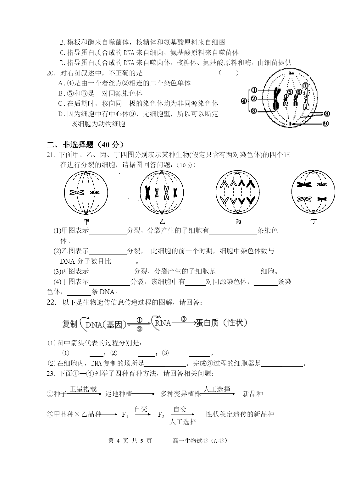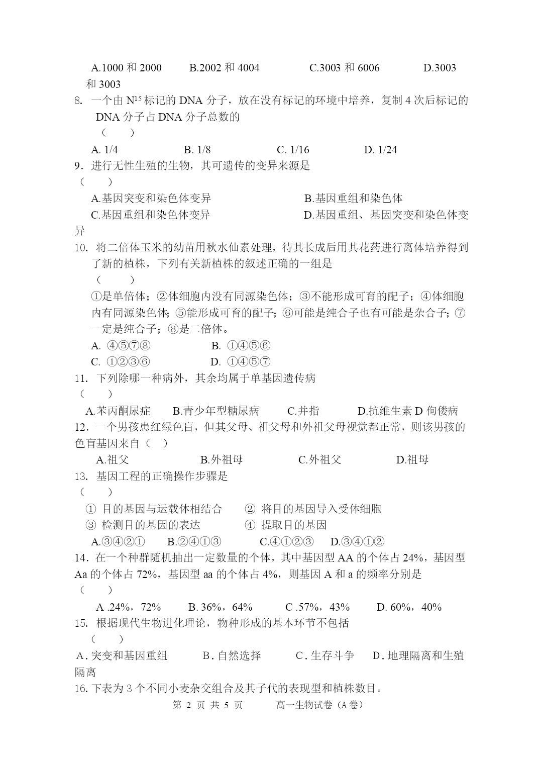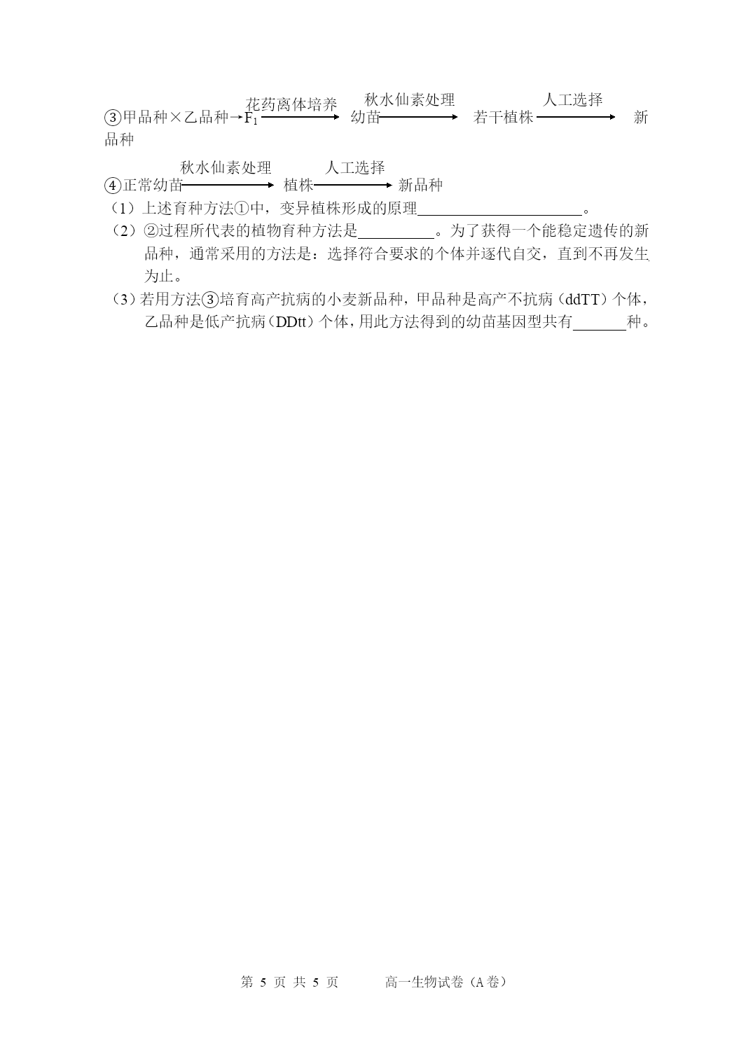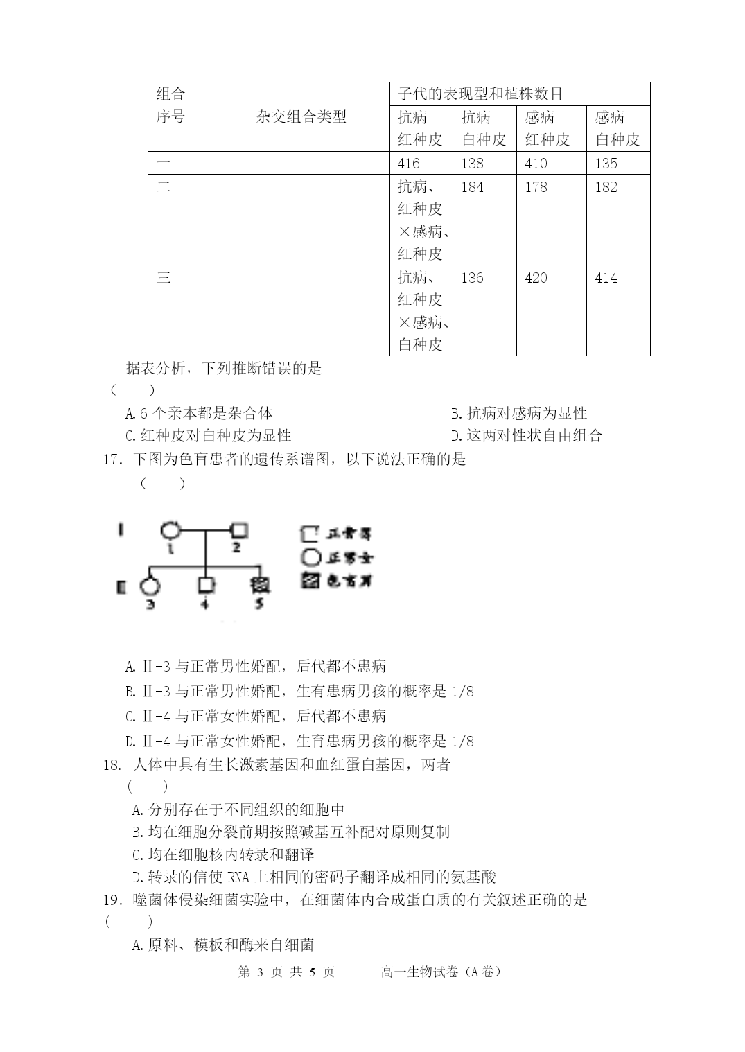 第页共NUMPAGES5页高一生物试卷(A卷)开封市第25中学2011-2012学年度第二学期期末考试高一生物(A卷)时间:80分钟满分:100一、选择题(20×3=60)1.下列各组中属于相对性状的是()A.玉米的黄粒和圆粒B.家鸡的长腿和毛腿C.绵羊的白毛和黒毛D.豌豆的高茎和豆荚的绿色2.下列叙述正确的是()A.纯合子测交后代都是纯合子B.纯合子自交后代都是纯合子C.杂合子自交后代都是杂合子D.杂合子测交后代都是杂合子3.已知小麦抗锈病是由显性基因控制,让一株杂合子小麦自交得F1,淘汰掉其中不抗锈病的植株后,再自交得F2,从理论上计算,F2中不抗锈病占植株总数的()A.1/4B.1/6C.1/8D.1/164.若某动物细胞内有两对同源染色体,分别用A和a,B和b表示。下列各组精子中由同一个精原细胞经减数分裂形成的是()A.AB、ab、ab、ABB.AB、aB、aB、ABC.AB、Ab、aB、abD.aB、aB、ab、ab5.有3个核酸分子,共有5种碱基、8种核苷酸、4条核苷酸链,它的组成是()A.1个DNA分子,2个RNA分子B.2个DNA分子,1个RNA分子C.3个RNA分子D.3个DNA分子6.根据下表提供的信息,可以确定色氨酸的密码子是()A.ACCB.TGGC.TCGD.UGG7.如果一条多肽链中有肽键1000个,则作为合成该多肽链的信使RNA分子和用来转录该信使RNA分子的基因中,分别至少要有碱基()个。A.1000和2000B.2002和4004C.3003和6006D.3003和30038.一个由N15标记的DNA分子,放在没有标记的环境中培养,复制4次后标记的DNA分子占DNA分子总数的()A.1/4B.1/8C.1/16D.1/249.进行无性生殖的生物,其可遗传的变异来源是()A.基因突变和染色体变异B.基因重组和染色体C.基因重组和染色体变异D.基因重组、基因突变和染色体变异10.将二倍体玉米的幼苗用秋水仙素处理,待其长成后用其花药进行离体培养得到了新的植株,下列有关新植株的叙述正确的一组是()①是单倍体;②体细胞内没有同源染色体;③不能形成可育的配子;④体细胞内有同源染色体;⑤能形成可育的配子;⑥可能是纯合子也有可能是杂合子;⑦一定是纯合子;⑧是二倍体。A.④⑤⑦⑧B.①④⑤⑥C.①②③⑥D.①④⑤⑦11.下列除哪一种病外,其余均属于单基因遗传病()A.苯丙酮尿症B.青少年型糖尿病C.并指D.抗维生素D佝偻病12.一个男孩患红绿色盲,但其父母、祖父母和外祖父母视觉都正常,则该男孩的色盲基因来自()A.祖父B.外祖母C.外祖父D.祖母13.基因工程的正确操作步骤是()①目的基因与运载体相结合②将目的基因导入受体细胞③检测目的基因的表达④提取目的基因A.③④②①B.②④①③C.④①②③D.③④①②14.在一个种群随机抽出一定数量的个体,其中基因型AA的个体占24%,基因型Aa的个体占72%,基因型aa的个体占4%,则基因A和a的频率分别是()A.24%,72%B.36%,64%C.57%,43%D.60%,40%15.根据现代生物进化理论,物种形成的基本环节不包括()A.突变和基因重组B.自然选择C.生存斗争D.地理隔离和生殖隔离16.下表为3个不同小麦杂交组合及其子代的表现型和植株数目。组合序号杂交组合类型子代的表现型和植株数目抗病红种皮抗病白种皮感病红种皮感病白种皮一416138410135二抗病、红种皮×感病、红种皮184178182三抗病、红种皮×感病、白种皮136420414据表分析,下列推断错误的是()A.6个亲本都是杂合体B.抗病对感病为显性C.红种皮对白种皮为显性D.这两对性状自由组合17.下图为色盲患者的遗传系谱图,以下说法正确的是()A.Ⅱ-3与正常男性婚配,后代都不患病B.Ⅱ-3与正常男性婚配,生有患病男孩的概率是1/8C.Ⅱ-4与正常女性婚配,后代都不患病D.Ⅱ-4与正常女性婚配,生育患病男孩的概率是1/818.人体中具有生长激素基因和血红蛋白基因,两者()A.分别存在于不同组织的细胞中B.均在细胞分裂前期按照碱基互补配对原则复制C.均在细胞核内转录和翻译D.转录的信使RNA上相同的密码子翻译成相同的氨基酸19.噬菌体侵染细菌实验中,在细菌体内合成蛋白质的有关叙述正确的是()A.原料、模板和酶来自细菌B.模板和酶来自噬菌体,核糖体和氨基酸原料来自细菌C.指导蛋白质合成的DNA来自细菌,氨基酸原料来自噬菌体D.指导蛋白质合成的DNA来自噬菌体,核糖体、氨基酸原料和酶,由细菌提供20.对右图叙述中,不正确的是()A.④是由一个着丝点②相连的二个染色单体B.⑤和⑥是一对同源染色体C.在后期时,移向同一极的染色体均为非同源染色体D.因为细胞中有中心体⑨,无细胞壁,