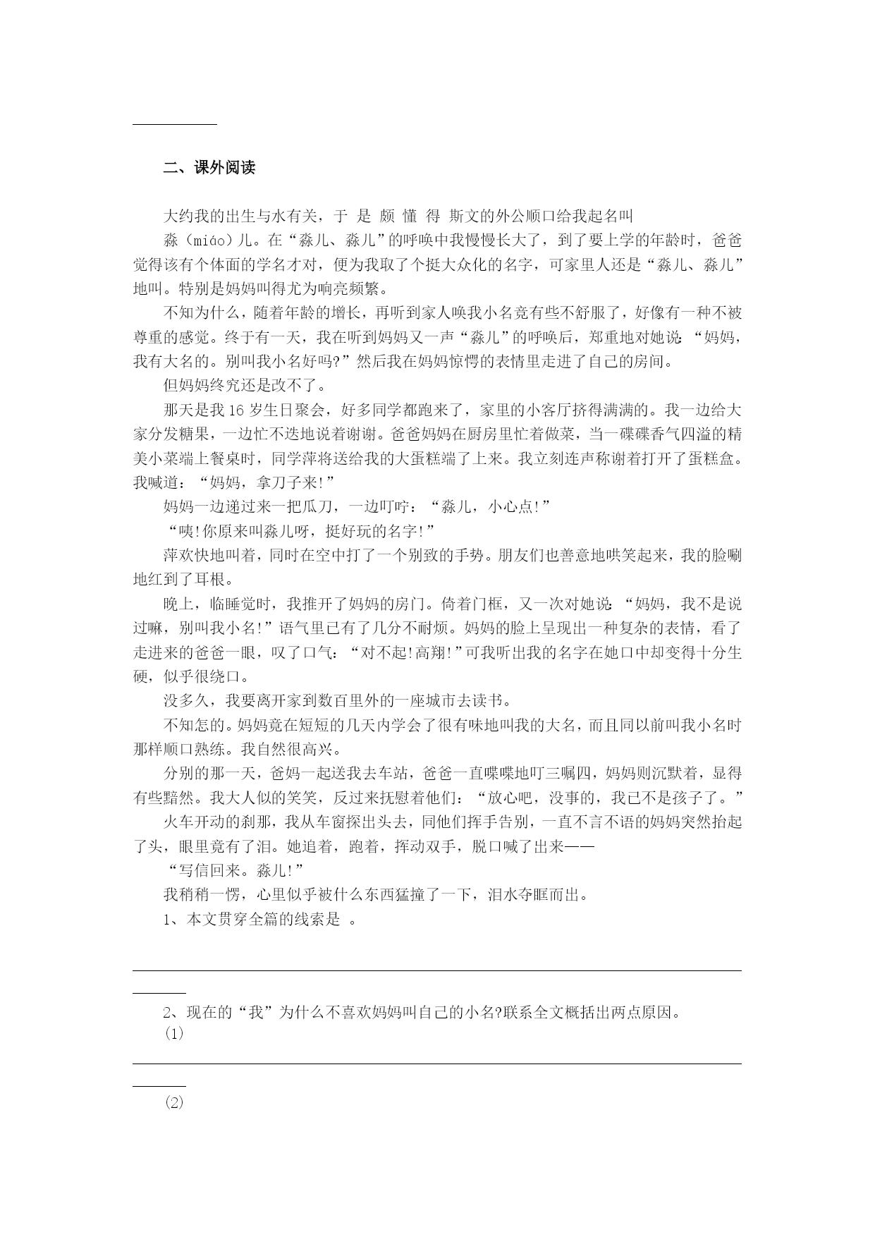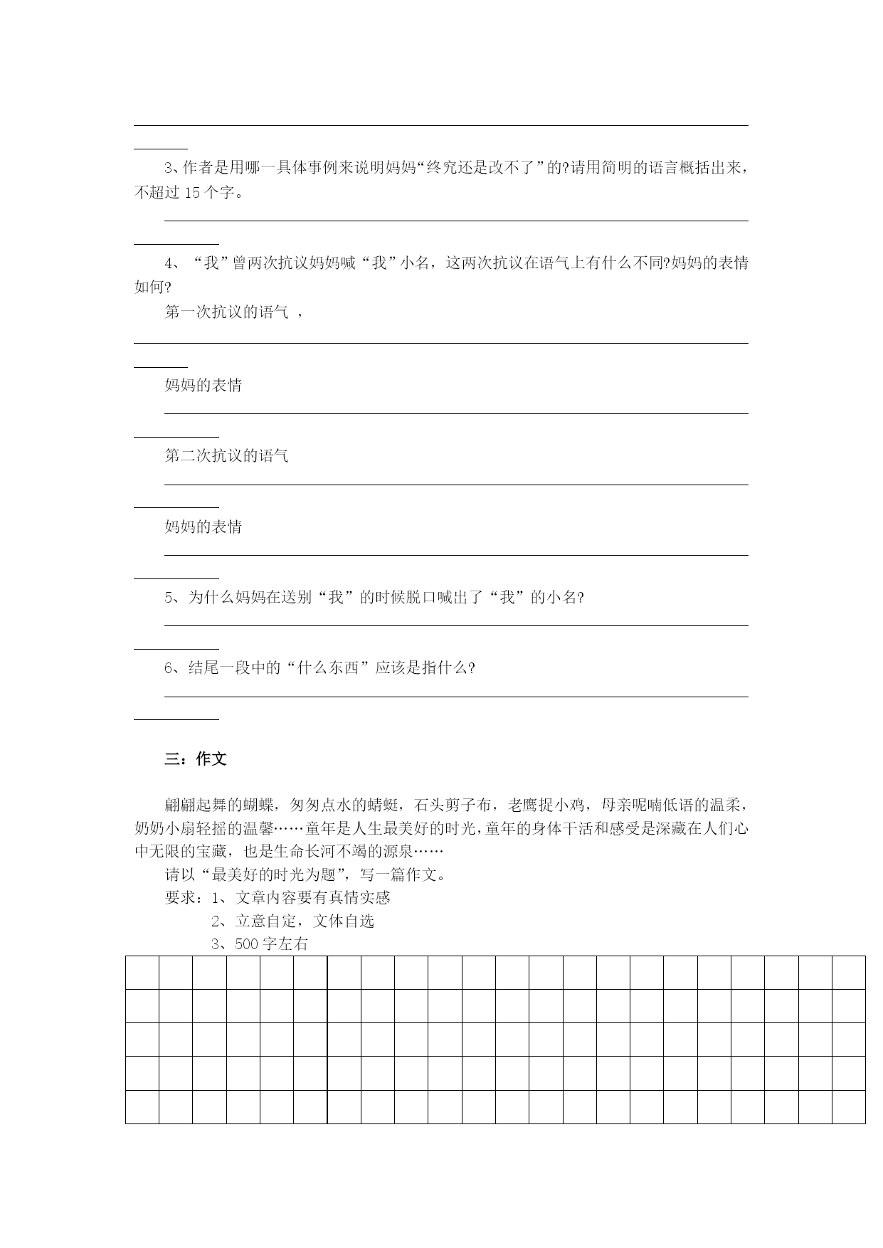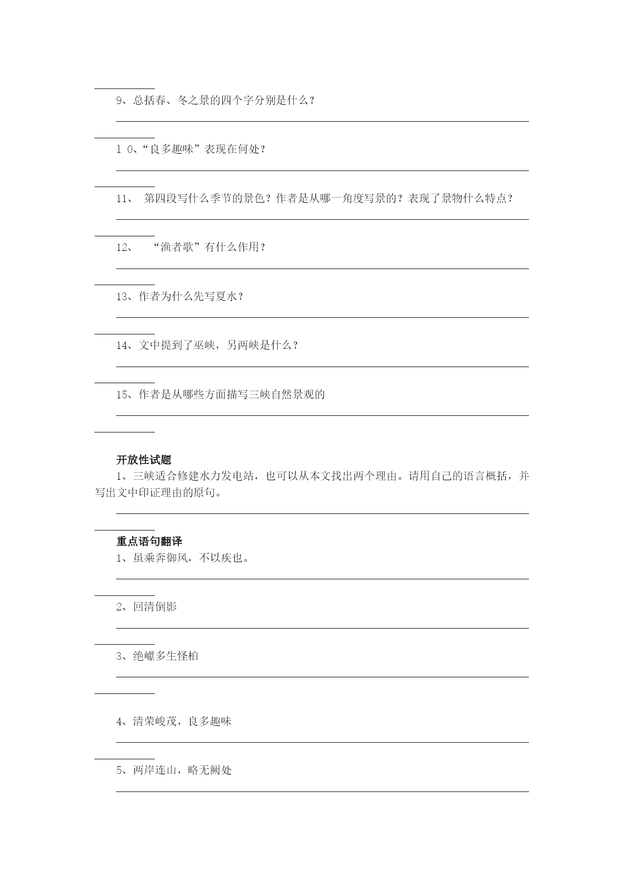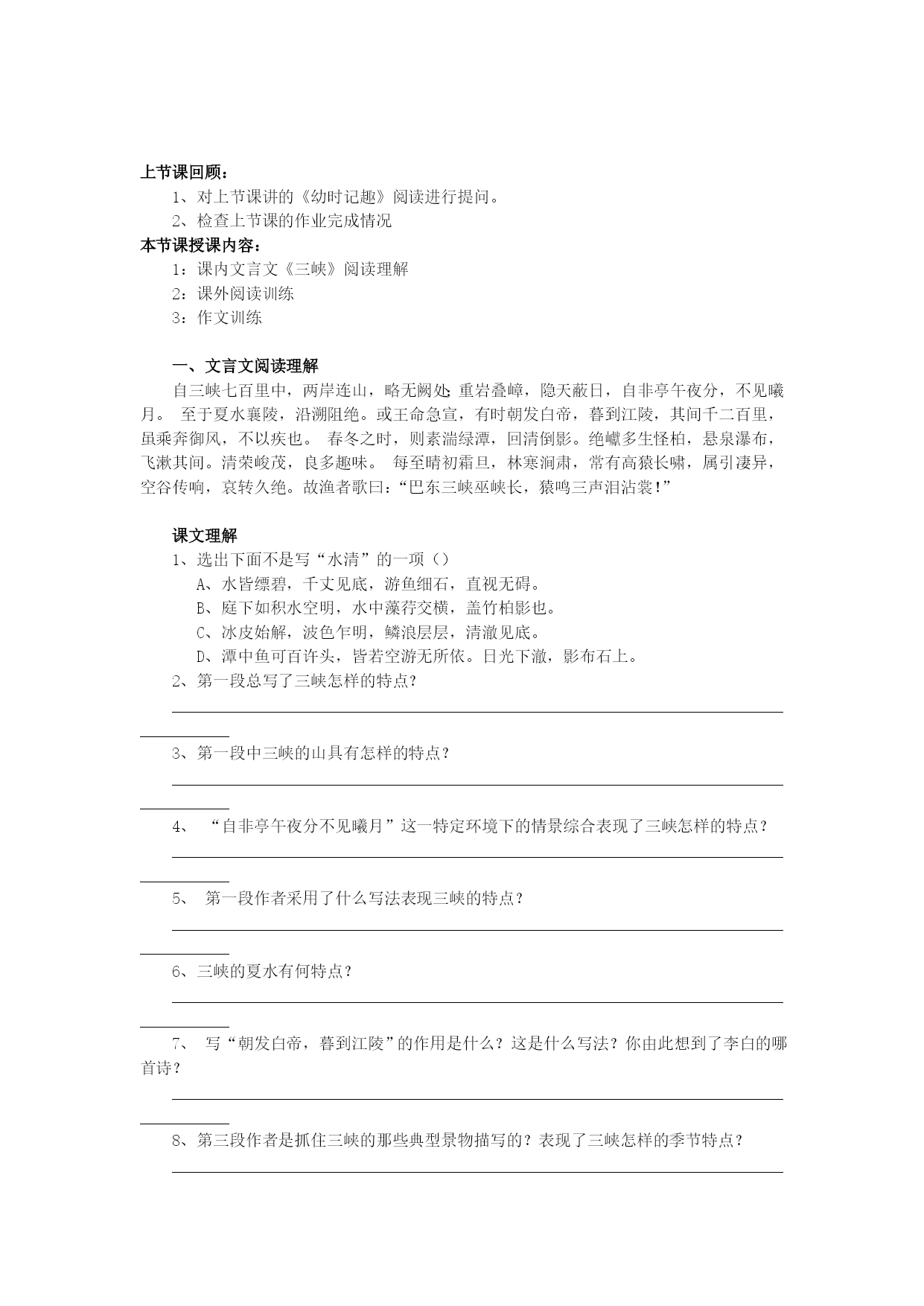 上节课回顾:1、对上节课讲的《幼时记趣》阅读进行提问。2、检查上节课的作业完成情况本节课授课内容:1:课内文言文《三峡》阅读理解2:课外阅读训练3:作文训练一、文言文阅读理解自三峡七百里中,两岸连山,略无阙处;重岩叠嶂,隐天蔽日,自非亭午夜分,不见曦月。至于夏水襄陵,沿溯阻绝。或王命急宣,有时朝发白帝,暮到江陵,其间千二百里,虽乘奔御风,不以疾也。春冬之时,则素湍绿潭,回清倒影。绝巘多生怪柏,悬泉瀑布,飞漱其间。清荣峻茂,良多趣味。每至晴初霜旦,林寒涧肃,常有高猿长啸,属引凄异,空谷传响,哀转久绝。故渔者歌曰:“巴东三峡巫峡长,猿鸣三声泪沾裳!”课文理解1、选出下面不是写“水清”的一项()A、水皆缥碧,千丈见底,游鱼细石,直视无碍。B、庭下如积水空明,水中藻荇交横,盖竹柏影也。C、冰皮始解,波色乍明,鳞浪层层,清澈见底。D、潭中鱼可百许头,皆若空游无所依。日光下澈,影布石上。2、第一段总写了三峡怎样的特点?______________________________________________________________________________________3、第一段中三峡的山具有怎样的特点?______________________________________________________________________________________4、“自非亭午夜分不见曦月”这一特定环境下的情景综合表现了三峡怎样的特点?______________________________________________________________________________________5、第一段作者采用了什么写法表现三峡的特点?______________________________________________________________________________________6、三峡的夏水有何特点?______________________________________________________________________________________7、写“朝发白帝,暮到江陵”的作用是什么?这是什么写法?你由此想到了李白的哪首诗?______________________________________________________________________________________8、第三段作者是抓住三峡的那些典型景物描写的?表现了三峡怎样的季节特点?______________________________________________________________________________________9、总括春、冬之景的四个字分别是什么?______________________________________________________________________________________l0、“良多趣味”表现在何处?______________________________________________________________________________________11、第四段写什么季节的景色?作者是从哪一角度写景的?表现了景物什么特点?______________________________________________________________________________________12、“渔者歌”有什么作用?______________________________________________________________________________________13、作者为什么先写夏水?______________________________________________________________________________________14、文中提到了巫峡,另两峡是什么?______________________________________________________________________________________15、作者是从哪些方面描写三峡自然景观的______________________________________________________________________________________开放性试题1、三峡适合修建水力发电站,也可以从本文找出两个理由。请用自己的语言概括,并写出文中印证理由的原句。______________________________