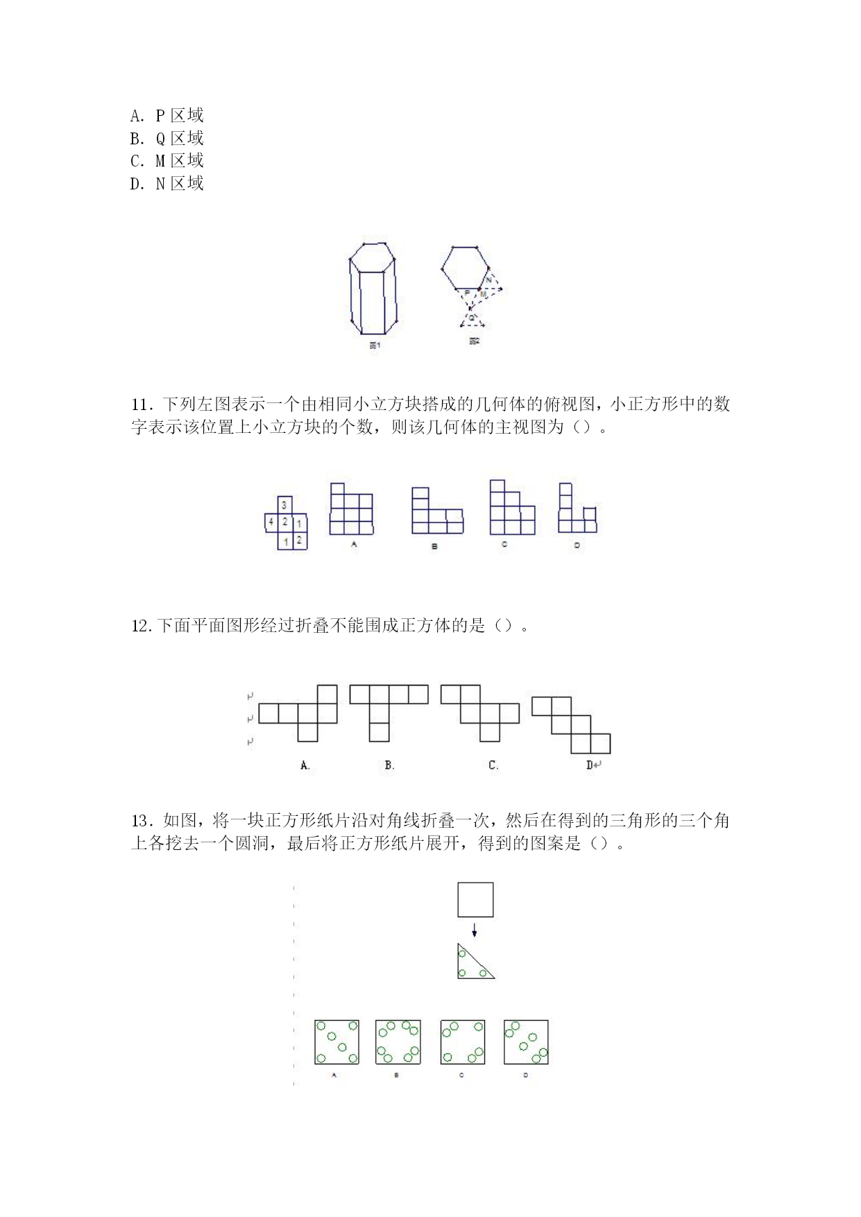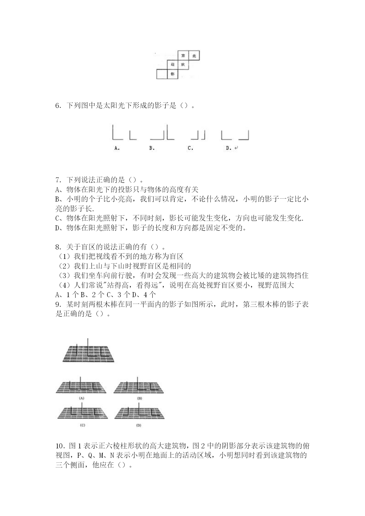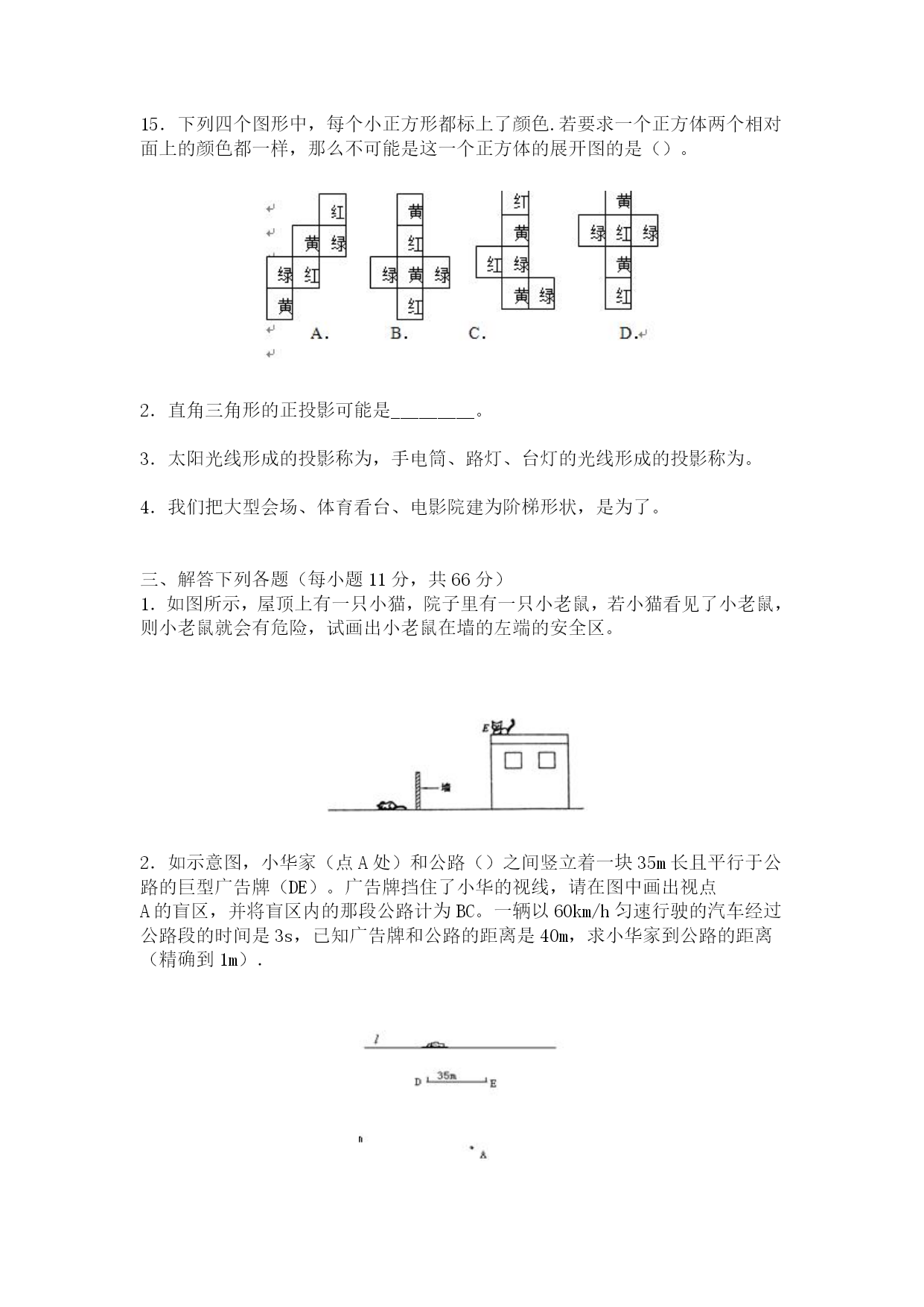 初中数学中考专练:投影与视图日期:2012-01-01来源:网络一、选择题(每小题4分,共60分)1、如图所示,右面水杯的俯视图是()。2.下图所示的几何体的主视图是()。3.下图中几何体的左视图是()。4.小明从正面观察下图所示的两个物体,看到的是()。5、如图:是一个正方体的平面展开图,当把它拆成一个正方体,与空白面相对的字应该是()。A、北B、京C、欢D、迎6.下列图中是太阳光下形成的影子是()。7.下列说法正确的是()。A、物体在阳光下的投影只与物体的高度有关B、小明的个子比小亮高,我们可以肯定,不论什么情况,小明的影子一定比小亮的影子长.C、物体在阳光照射下,不同时刻,影长可能发生变化,方向也可能发生变化.D、物体在阳光照射下,影子的长度和方向都是固定不变的。8.关于盲区的说法正确的有()。(1)我们把视线看不到的地方称为盲区(2)我们上山与下山时视野盲区是相同的(3)我们坐车向前行驶,有时会发现一些高大的建筑物会被比矮的建筑物挡住(4)人们常说"站得高,看得远",说明在高处视野盲区要小,视野范围大A、1个B、2个C、3个D、4个9.某时刻两根木棒在同一平面内的影子如图所示,此时,第三根木棒的影子表是正确的是()。10.图1表示正六棱柱形状的高大建筑物,图2中的阴影部分表示该建筑物的俯视图,P、Q、M、N表示小明在地面上的活动区域,小明想同时看到该建筑物的三个侧面,他应在()。A.P区域B.Q区域C.M区域D.N区域11.下列左图表示一个由相同小立方块搭成的几何体的俯视图,小正方形中的数字表示该位置上小立方块的个数,则该几何体的主视图为()。12.下面平面图形经过折叠不能围成正方体的是()。13.如图,将一块正方形纸片沿对角线折叠一次,然后在得到的三角形的三个角上各挖去一个圆洞,最后将正方形纸片展开,得到的图案是()。15.下列四个图形中,每个小正方形都标上了颜色.若要求一个正方体两个相对面上的颜色都一样,那么不可能是这一个正方体的展开图的是()。2.直角三角形的正投影可能是_________。3.太阳光线形成的投影称为,手电筒、路灯、台灯的光线形成的投影称为。4.我们把大型会场、体育看台、电影院建为阶梯形状,是为了。三、解答下列各题(每小题11分,共66分)1.如图所示,屋顶上有一只小猫,院子里有一只小老鼠,若小猫看见了小老鼠,则小老鼠就会有危险,试画出小老鼠在墙的左端的安全区。2.如示意图,小华家(点A处)和公路()之间竖立着一块35m长且平行于公路的巨型广告牌(DE)。广告牌挡住了小华的视线,请在图中画出视点A的盲区,并将盲区内的那段公路计为BC。一辆以60km/h匀速行驶的汽车经过公路段的时间是3s,已知广告牌和公路的距离是40m,求小华家到公路的距离(精确到1m).