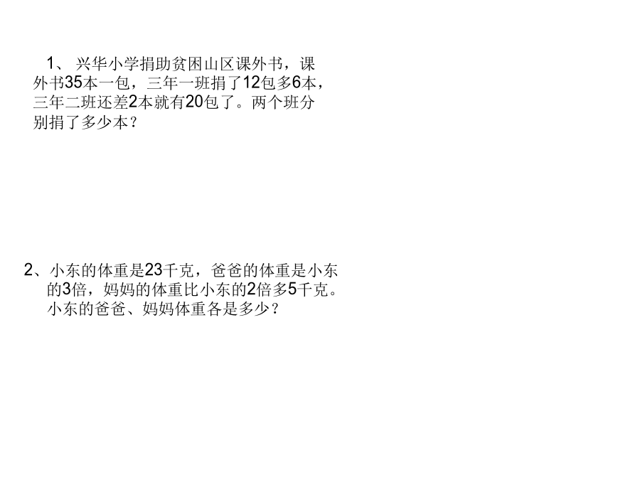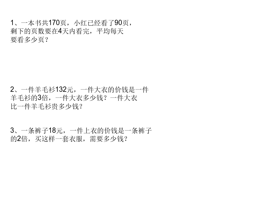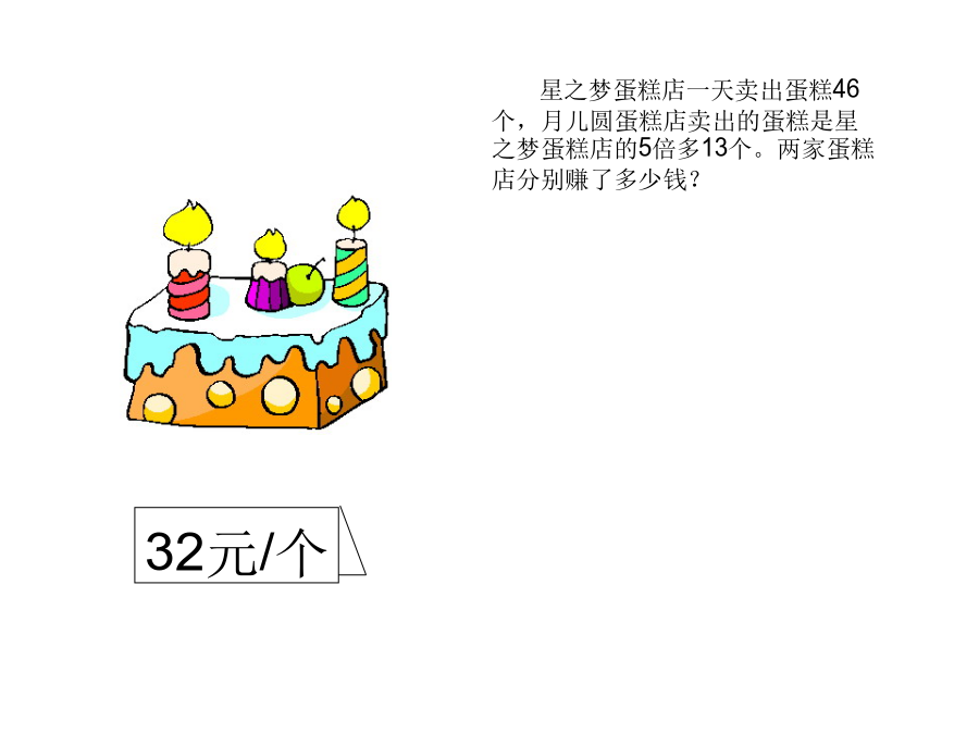 星之梦蛋糕店一天卖出蛋糕46个,月儿圆蛋糕店卖出的蛋糕是星之梦蛋糕店的5倍多13个。两家蛋糕店分别赚了多少钱?49元/件1、兴华小学捐助贫困山区课外书,课外书35本一包,三年一班捐了12包多6本,三年二班还差2本就有20包了。两个班分别捐了多少本?1、一本书,小红已经看了90页,剩下的页数要在4天内看完,平均每天要看多少页?