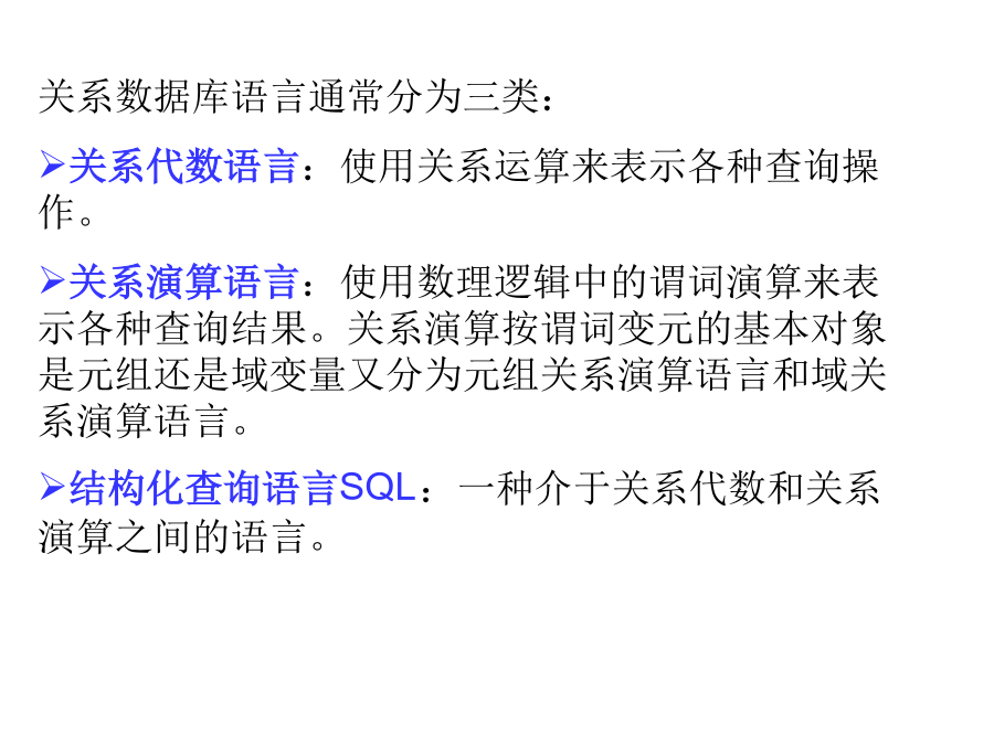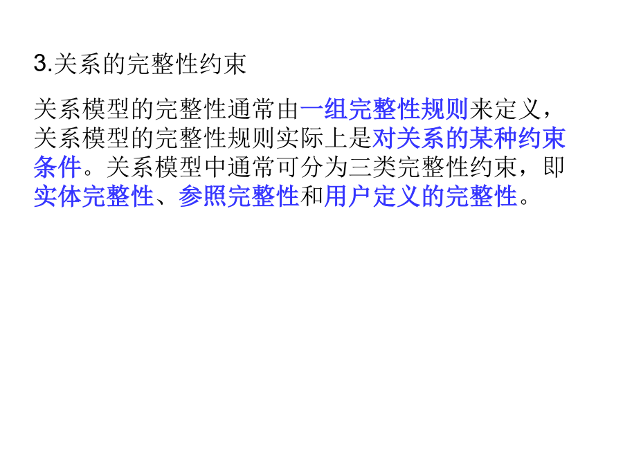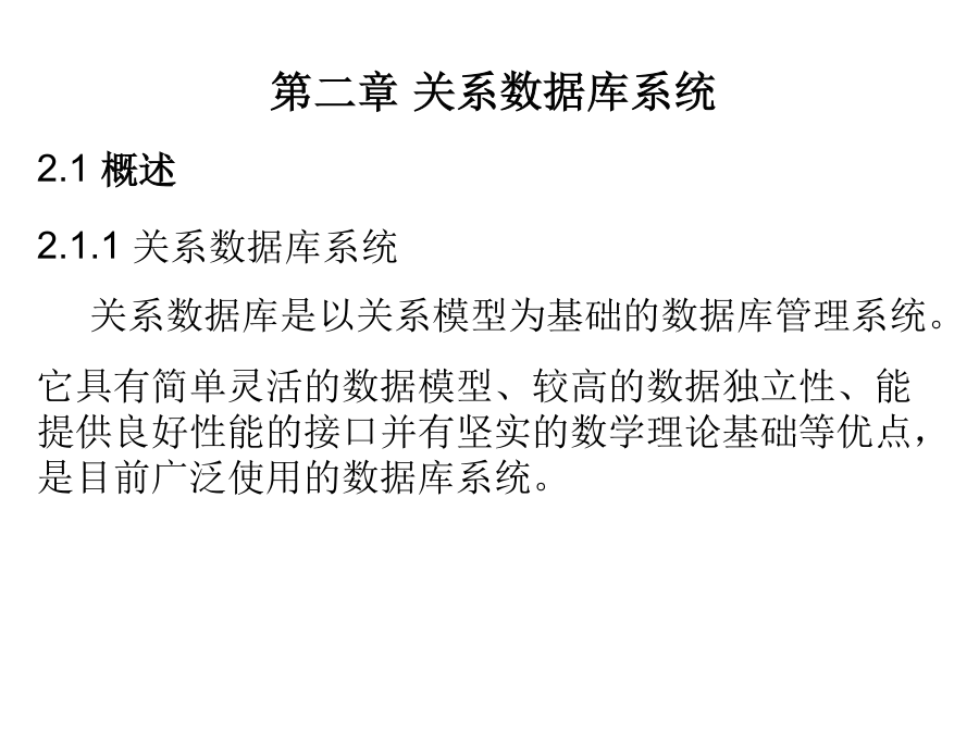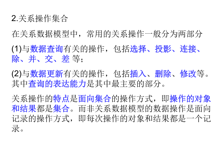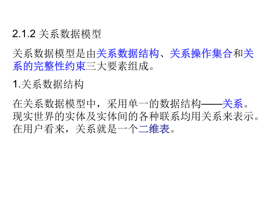 第二章关系数据库系统2.1.2关系数据模型关系数据模型是由关系数据结构、关系操作集合和关系的完整性约束三大要素组成。1.关系数据结构在关系数据模型中,采用单一的数据结构——关系。现实世界的实体及实体间的各种联系均用关系来表示。在用户看来,关系就是一个二维表。2.关系操作集合在关系数据模型中,常用的关系操作一般分为两部分(1)与数据查询有关的操作,包括选择、投影、连接、除、并、交、差等;(2)与数据更新有关的操作,包括插入、删除、修改等。其中查询的表达能力是其中最主要的部分。关系操作的特点是面向集合的操作方式,即操作的对象和结果都是集合。而非关系数据模型的数据操作是面向记录的操作方式,即每次操作的对象和结果都是一个记录。关系数据库语言通常分为三类:关系代数语言:使用关系运算来表示各种查询操作。关系演算语言:使用数理逻辑中的谓词演算来表示各种查询结果。关系演算按谓词变元的基本对象是元组还是域变量又分为元组关系演算语言和域关系演算语言。结构化查询语言SQL:一种介于关系代数和关系演算之间的语言。3.关系的完整性约束关系模型的完整性通常由一组完整性规则来定义,关系模型的完整性规则实际上是对关系的某种约束条件。关系模型中通常可分为三类完整性约束,即实体完整性、参照完整性和用户定义的完整性。2.2关系数据模型的数据结构1.关系一个关系对应一个二维表,每个表必须有一个表名,称为关系名。2.属性和域表中的每一列(或字段),称为属性。对表中每个属性必须起一个名字,即属性名。属性列中的值称为属性值,属性值的取值范围称为域。3.关系模式对关系的描述称为关系模式。一般表示为:关系名(属性1,属性2,…,属性n)如上例中关系模式为:学生(学号,姓名,性别,年龄,所在系,籍贯)实际上关系模式是指对表结构的定义和描述,包括表名及表中有哪些属性列、各个属性的名、数据类型和宽度等。4.元组和分量关系中的一行,称为一个元组。元组中的每一个属性值,称为该元组的一个分量。5.侯选码和主码在一个关系中,如果存在某个属性可以唯一标识该关系的元组,这个属性称为该关系的侯选码。若一个关系中有多个侯选码,则选定其中一个为主码。6.主属性和非主属性一个关系中所有侯选码中的诸属性称为主属性,不包含在任何侯选码中的属性称为非主属性。2.2.2关系的形式化定义2.笛卡儿积给定一组域D1、D2、……、Dn(这些域中也可以有相同的),则D1、D2、……、Dn的笛卡尔积为:D1×D2×…×Dn={(d1、d2、……、dn)|di∈Di,i=1,2,…,n}其中每一个元素(d1、d2、……、dn)称为一个n元组,简称元组。元素中的每一个值di叫做一个分量。若Di(i=1,2,…n)为有限集,其基数为mi(i=1,2,…n),则D1×D2×…×Dn的基数n为:M=∏mii=1例如:D1=教师集合={王刚,张华,李莉}D2=课程集合={数学,英语}D3=教室集合={101,102}则D1×D2×…×Dn={(王刚,数学,101),(王刚,数学,102),(王刚,英语,101),(王刚,英语,102),(张华,数学,101),(张华,数学,102),(张华,英语,101),(张华,英语,102),(李莉,数学,101),(李莉,数学,102),(李莉,英语,101),(李莉,英语,102)}其中(王刚,数学,101)、(王刚,数学,102)等都是元组。王刚、数学、101等都是分量。该笛卡尔积的基数为3×2×2=12,即D1×D2×D3一共有12个元组,也可以用二维表表示,如图:3.关系D1×D2×…×Dn的一个子集称为在域D1、D2、…、Dn上的一个关系。例如,在上图的笛卡尔积中,根据授课的实际情况,选出其中的一个子集,如下图所示,便构成了一个关系(该关系名为授课)授课需指出的是:从数学角度所研究的关系理论中,一个关系中的元组个数可以是无限的,即无限关系。另外,由于笛卡尔积不满足交换率,因此,当关系作为关系数据模型的数据结构时,必须给予如下的限定和扩充:在关系模型中的关系必须是有限关系,因为计算机无法处理无限数据;通过为关系的每个列附加一个不同的属性名,用来标识关系中的诸列,从而可以取消关系元组中分量间的有序性,使关系中的属性列可以任意交换。2.2.3关系的分类和性质在关系数据库中,关系通常有三种类型,即基本关系(又称基本表和基表)、查询表和视图(表)。基本表是数据库中实际存在的用来存储数据的表;查询表是用来临时存放查询结果的表;视图是由基本表和其他视图导出的表,它并不存放数据,因此是虚表。基本关系应具有以下6条基本性质:列是同质的,即每一列中的分量是同一类型的数据,来自同一个域;不同的列可以出自同一个域,称其中的每一列为一个属性,不同的属性要给予不同的属性名;列的顺序无所谓,即列的次序可以任意交
