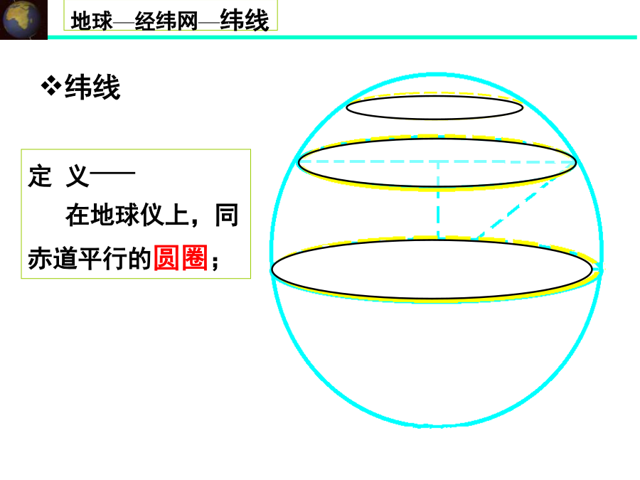 地球仪赤道基多的赤道纪念碑认识纬线定义——在地球仪上,同赤道平行的圆圈;假想你站在赤道的上空,画出你看到的赤道及其他纬线的样子。如果你是站在北极的上空,你看到的纬线又是什么样子的呢?特点——1.都自成圆圈——纬线圈。2.赤道最长,往两极纬线圈越来越小两极为点。3.所有的纬线都相互平行。4.纬线指示东西方向。(相对的)90o1、向北读数越大,为北纬,用“N”表示2、向南读数越大,为南纬,用“S”表示认识经线假想你站在赤道的上空,画出你看到的经线的样子。如果你是站在北极的上空,你看到的经线又是什么样子的呢?1.经线都是半圆2.所有的经线长度都相等,都收敛于南北两极。3.经线指示南北方向。1、向东读数越大,为东经,用“E”表示2、向西读数越大,为西经,用“W”表示认识经纬网经纬网定位考一考25°18°再见!