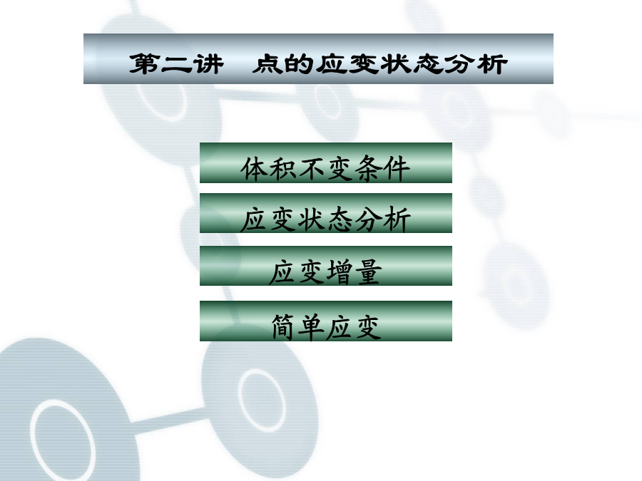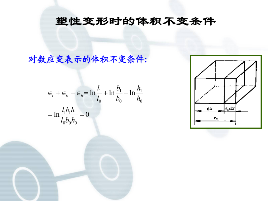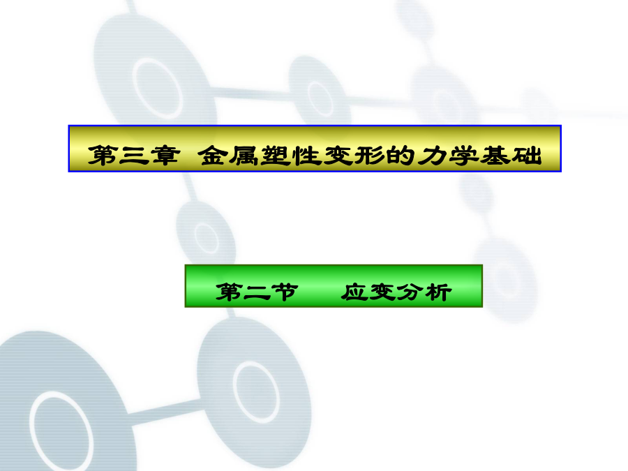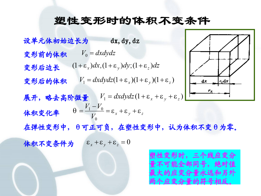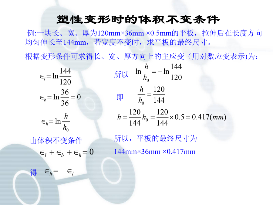第三章金属塑性变形的力学基础第二讲点的应变状态分析塑性变形时的体积不变条件塑性变形时的体积不变条件例:一块长、宽、厚为120mm×36mm×0.5mm的平板,拉伸后在长度方向均匀伸长至144mm,若宽度不变时,求平板的最终尺寸。根据变形条件可求得长、宽、厚方向上的主应变(用对数应变表示)为:点的应变状态与应力状态相比较(2)应变张量不变量(4)主应变简图用主应变的个数和符号来表示应变状态的简图称主应变状态图,简称为主应变简图或主应变图。2、八面体应变4、等效应变应变增量和应变速率张量2、位移增量和应变增量应变增量:3、应变速率张量例一:矩形柱体在无摩擦的光滑平板间压缩。由体积不变条件:平面应变平面应变平面应变平面应变平面应变平面应变工程应用工程应用工程应用本章小结