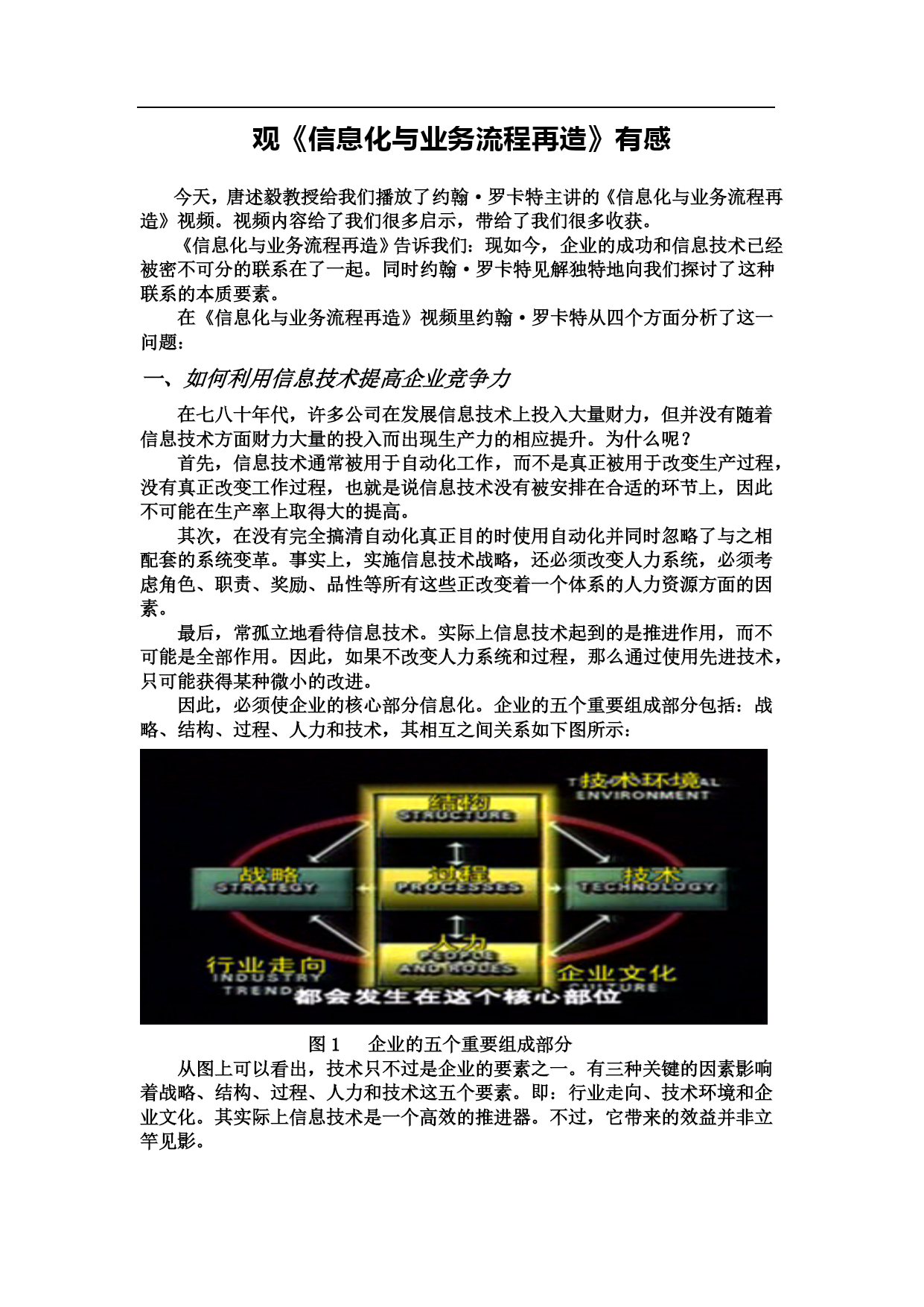 观《信息化与业务流程再造》有感今天,唐述毅教授给我们播放了约翰·罗卡特主讲的《信息化与业务流程再造》视频。视频内容给了我们很多启示,带给了我们很多收获。《信息化与业务流程再造》告诉我们:现如今,企业的成功和信息技术已经被密不可分的联系在了一起。同时约翰·罗卡特见解独特地向我们探讨了这种联系的本质要素。在《信息化与业务流程再造》视频里约翰·罗卡特从四个方面分析了这一问题:一、如何利用信息技术提高企业竞争力在七八十年代,许多公司在发展信息技术上投入大量财力,但并没有随着信息技术方面财力大量的投入而出现生产力的相应提升。为什么呢?首先,信息技术通常被用于自动化工作,而不是真正被用于改变生产过程,没有真正改变工作过程,也就是说信息技术没有被安排在合适的环节上,因此不可能在生产率上取得大的提高。其次,在没有完全搞清自动化真正目的时使用自动化并同时忽略了与之相配套的系统变革。事实上,实施信息技术战略,还必须改变人力系统,必须考虑角色、职责、奖励、品性等所有这些正改变着一个体系的人力资源方面的因素。最后,常孤立地看待信息技术。实际上信息技术起到的是推进作用,而不可能是全部作用。因此,如果不改变人力系统和过程,那么通过使用先进技术,只可能获得某种微小的改进。因此,必须使企业的核心部分信息化。企业的五个重要组成部分包括:战略、结构、过程、人力和技术,其相互之间关系如下图所示:图1企业的五个重要组成部分从图上可以看出,技术只不过是企业的要素之一。有三种关键的因素影响着战略、结构、过程、人力和技术这五个要素。即:行业走向、技术环境和企业文化。其实际上信息技术是一个高效的推进器。不过,它带来的效益并非立竿见影。二、影响信息技术在业务流程再造中成功运用的重要因素其中最为重要的是高层对信息技术的看法。信息技术对企业的影响和高层对它的理解程度成正比。对于信息技术在企业中的作用,领导者应当保持一个清楚的认识。领导者必须从战略的角度来把握企业前进的方向,为了达到目的,为了贯彻战略目标,领导者需要知道需要何种基础设施,而信息技术是其中不可或缺的一部分。拥有员工,拥有自己的机构和正规的管理过程,信息技术可以充当一种黏合剂。这样,领导者就可以和所有员工一起密切合作打造一个能完全贯彻执行这个目标的机构。三、未来发展中,信息技术在许许多多领域将必不可少,尤其在通讯领域、信息的收集和储存领域、公司内部沟通系统领域等。四、未来企业的运作形式及信息技术发挥的作用未来的企业将更加网络化。那些新兴企业,将越来越不像传统的、等级森严的、官僚式的企业,它们将更像一种快速变化的流体,特别是在人员和流程的管理上。未来将会有两种类型的企业形式:1.灵活组织机构、2.虚拟公司或虚拟企业。如果上述两类企业成为未来企业的主流类型,如果企业的权力和权限正在被分配,那么拥有信息就是至关重要的了。如果没有得到信息,人们不可能做出更好的决策。所以信息技术所发挥的最大作用,一个是传播信息,一个是提高智力。这个世界在发展中正变成一个越来越相互依存的地方。企业也越来越相互依赖。在一定意义上,信息技术让每个人都更多地了解了正在发生什么。但是它也使企业内部联系更加紧密。人们现在更依赖于信息采取行动。相对于赋予人们理解信息含义的能力来说,主要用在信息的分配上。在传统的等级制企业中,只由一两个人统筹全局。而在一个越来越多的人都见多识广并做决策的企业中,越来越多的人们需要相互理解他们的所作所为如何影响了别人。