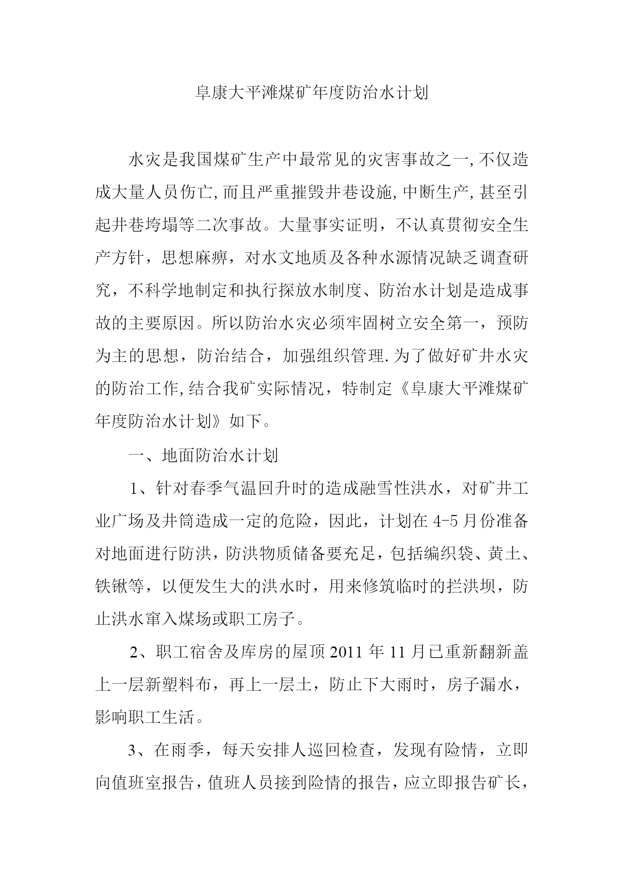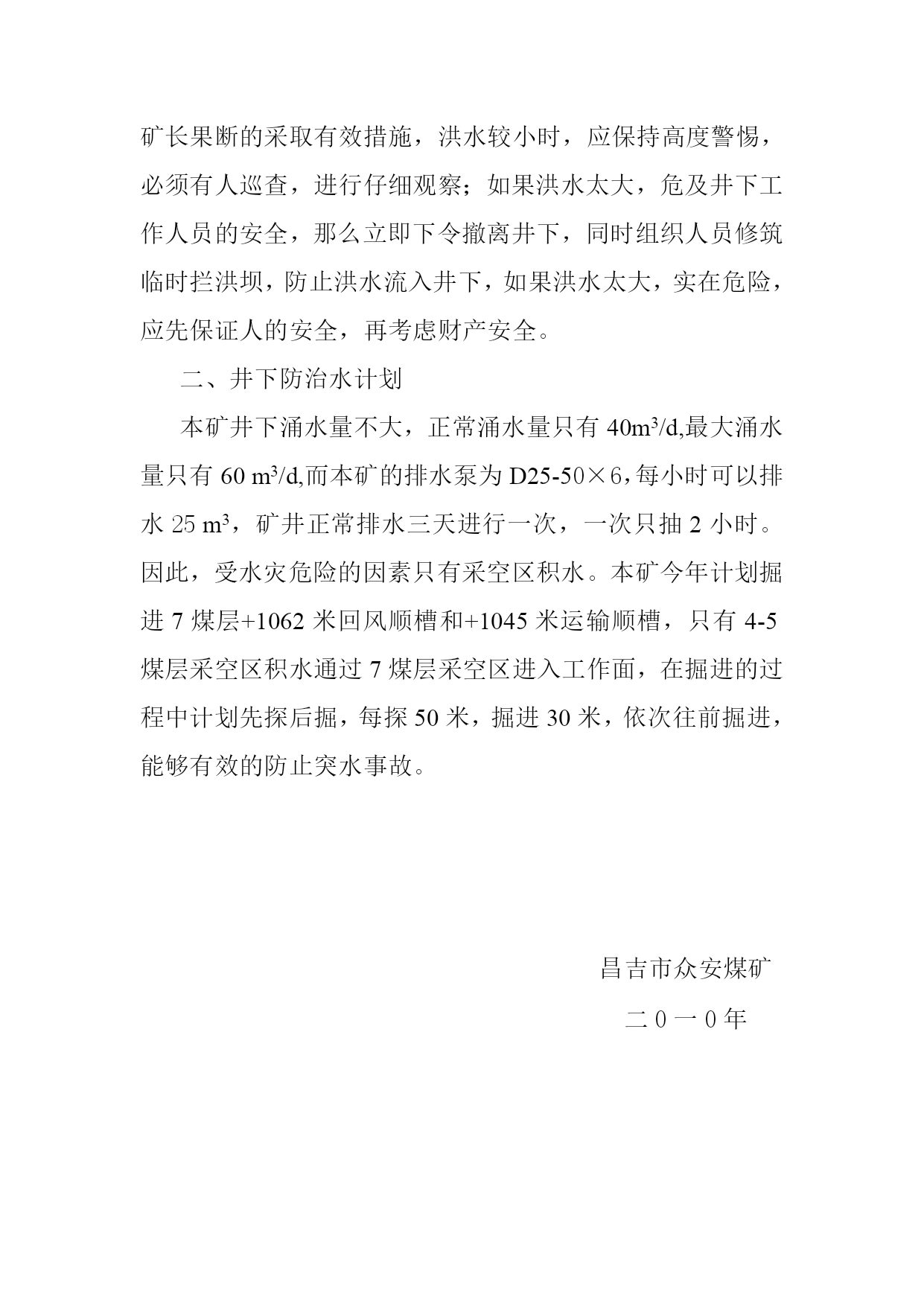 天池矿业有限责任公司阜康大平滩煤矿年度防治水计划阜康大平滩煤矿二0一二年阜康大平滩煤矿年度防治水计划水灾是我国煤矿生产中最常见的灾害事故之一,不仅造成大量人员伤亡,而且严重摧毁井巷设施,中断生产,甚至引起井巷垮塌等二次事故。大量事实证明,不认真贯彻安全生产方针,思想麻痹,对水文地质及各种水源情况缺乏调查研究,不科学地制定和执行探放水制度、防治水计划是造成事故的主要原因。所以防治水灾必须牢固树立安全第一,预防为主的思想,防治结合,加强组织管理.为了做好矿井水灾的防治工作,结合我矿实际情况,特制定《阜康大平滩煤矿年度防治水计划》如下。一、地面防治水计划1、针对春季气温回升时的造成融雪性洪水,对矿井工业广场及井筒造成一定的危险,因此,计划在4-5月份准备对地面进行防洪,防洪物质储备要充足,包括编织袋、黄土、铁锹等,以便发生大的洪水时,用来修筑临时的拦洪坝,防止洪水窜入煤场或职工房子。2、职工宿舍及库房的屋顶2011年11月已重新翻新盖上一层新塑料布,再上一层土,防止下大雨时,房子漏水,影响职工生活。3、在雨季,每天安排人巡回检查,发现有险情,立即向值班室报告,值班人员接到险情的报告,应立即报告矿长,矿长果断的采取有效措施,洪水较小时,应保持高度警惕,必须有人巡查,进行仔细观察;如果洪水太大,危及井下工作人员的安全,那么立即下令撤离井下,同时组织人员修筑临时拦洪坝,防止洪水流入井下,如果洪水太大,实在危险,应先保证人的安全,再考虑财产安全。二、井下防治水计划本矿井下涌水量不大,正常涌水量只有40m3/d,最大涌水量只有60m3/d,而本矿的排水泵为D25-50×6,每小时可以排水25m3,矿井正常排水三天进行一次,一次只抽2小时。因此,受水灾危险的因素只有采空区积水。本矿今年计划掘进7煤层+1062米回风顺槽和+1045米运输顺槽,只有4-5煤层采空区积水通过7煤层采空区进入工作面,在掘进的过程中计划先探后掘,每探50米,掘进30米,依次往前掘进,能够有效的防止突水事故。昌吉市众安煤矿二0一0年