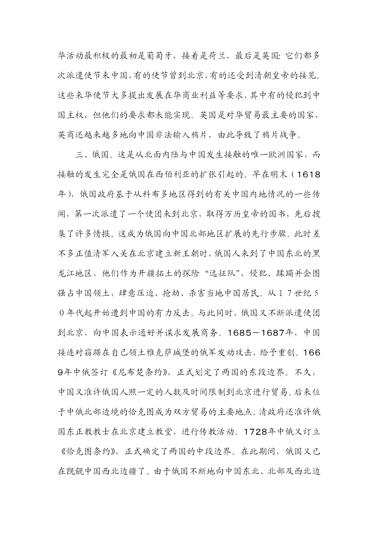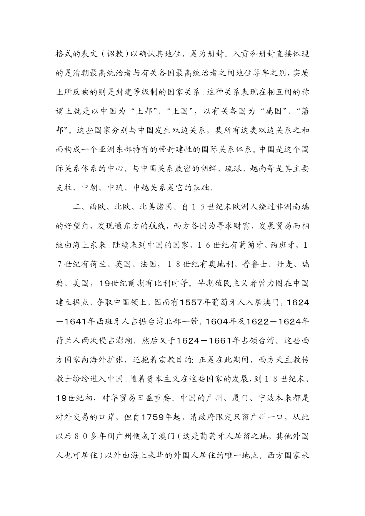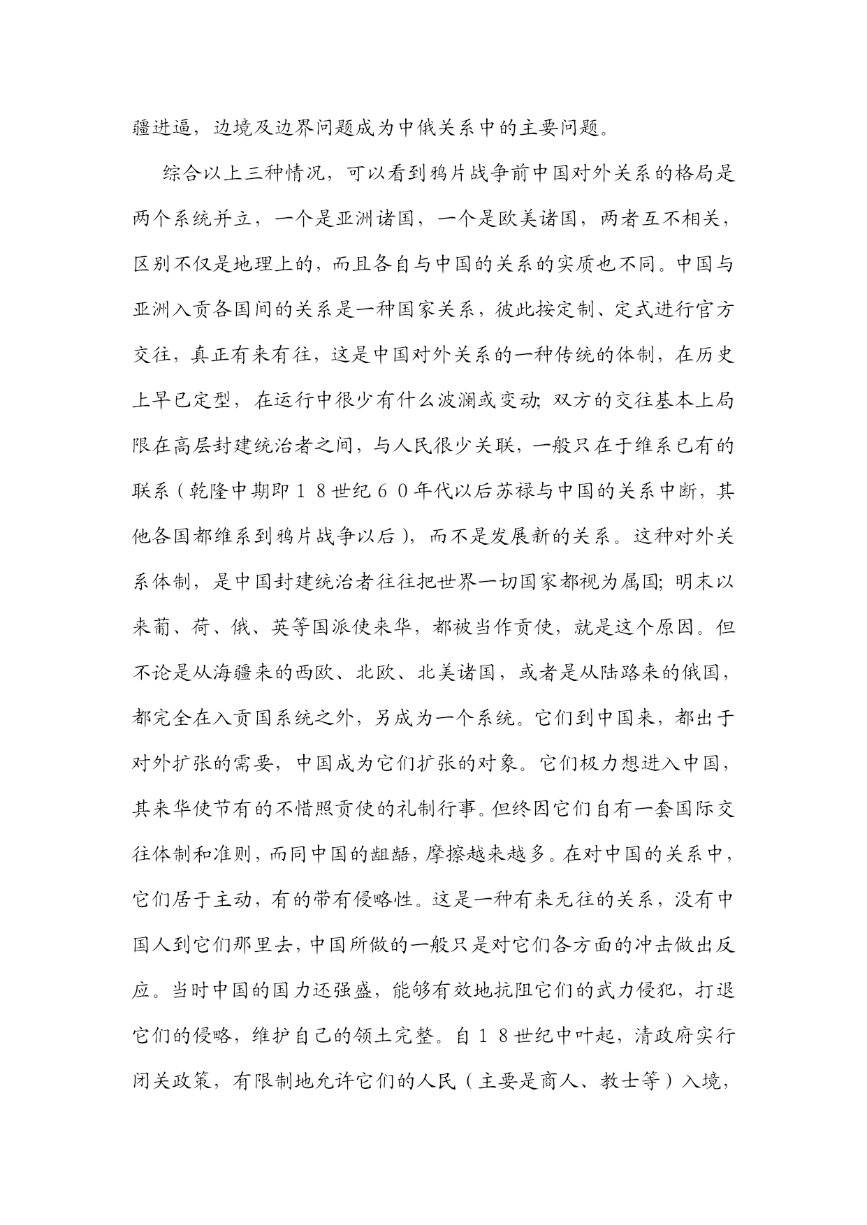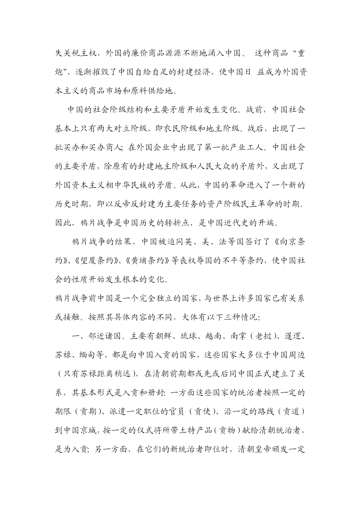 分享自互联网,由个人整理所得。中国近代史纲要-------中国近代史开端为什么说鸦片战争是中国近代史的开端?鸦片战争使中国的社会发生了巨大的变化。一方面,西方列强对中国发动的侵略战争使中国的国家主权和领土完整遭到严重破坏。列强通过一系列不平等条约,对中国的政治、经济、文化等方面开始进行控制和干预,使中国一步一步的变成为一个半殖民地的国家。另一方面,西方资本主义的侵略,还造成了中国社会形态的变化,它表现为从封建经济缝隙中逐步生长出才资本主义经济得到一定的发展,封建的自然经济受到一定的冲击,中国社会开始了近代化的步伐。在一定程度上可以说,西方资本主义的入侵,在客观上迫使中国社会逐步摆脱了封建王朝的历史发展模式,挣脱了自然经济发展的轨道,开始向近代化的方向发展。中国的主权开始遭到破坏,战前,中国政治上是一个领土完整、主权独立的国家。战后,割让香港等条款破坏了中围的领土及领海主权;“领事裁判权”制度,破坏了中国的司法主权,协定关税,破坏了小国的关税主权;片面最惠国待遇,为列强广泛地掠夺中国提供了方便。这样,中国就从一个独立的主权园家开始沦为一个遭受外因侵略者奴役的半殖民地国家。中国自给自足的自然经济开始解体。战前,中国经济上是一个以自然经济为基础的封建国家,小农业和家庭手工业相结合,有力地排斥着外国的商品侵略。战后,废除“公行”制度,增加通商口岸,丧失关税主权,外国的廉价商品源源不断地涌入中国。这种商品“重炮”,逐渐摧毁了中国自给自足的封建经济,使中国日益成为外国资本主义的商品市场和原料供给地。中国的社会阶级结构和主要矛盾开始发生变化。战前,中国社会基本上只有两大对立阶级,即农民阶级和地主阶级。战后,出现了一批买办和买办商人;在外国企业中出现了第一批产业工人。中国社会的主要矛盾,除原有的封建地主阶级和人民大众的矛盾外,又出现了外国资本主义相中华民族的矛盾。从此,中国的革命进入了一个新的历史时期,即以反帝反封建为主要任务的资产阶级民主革命的时期。因此,鸦片战争是申国历史的转折点,是中国近代史的开端。鸦片战争的结果,中国被迫同英、美、法等国签订了《向京条约》、《望厦条约》、《黄埔条约》等丧权辱国的不平等条约,使中国社会的性质开始发生根本的变化。鸦片战争前中国是一个完全独立的国家,与世界上许多国家已有关系或接触。按照其具体内容的不同,大体有以下三种情况:一、邻近诸国。主要有朝鲜、琉球、越南、南掌(老挝)、暹逻、苏禄、缅甸等,都是向中国入贡的国家,这些国家大多位于中国周边(只有苏禄距离稍远),在清朝前期都或先或后同中国正式建立了关系,其基本形式是入贡和册封:一方面这些国家的统治者按照一定的期限(贡期)、派遣一定职位的官员(贡使)、沿一定的路线(贡道)到中国京城,按一定的仪式将所带土特产品(贡物)献给清朝统治者,是为入贡;另一方面,在它们的新统治者即位时,清朝皇帝颁发一定格式的表文(诏敕)以确认其地位,是为册封。入贡和册封直接体现的是清朝最高统治者与有关各国最高统治者之间地位尊卑之别,实质上所反映的则是封建等级制的国家关系。这种关系表现在相互间的称谓上就是以中国为“上邦”、“上国”,以有关各国为“属国”、“藩邦”。这些国家分别与中国发生双边关系,集所有这类双边关系之和而构成一个亚洲东部特有的带封建性的国际关系体系。中国是这个国际关系体系的中心。与中国关系最密的朝鲜、琉球、越南等是其主要支柱,中朝、中琉、中越关系是它的基础。二、西欧、北欧、北美诸国。自15世纪末欧洲人绕过非洲南端的好望角,发现通东方的航线,西方各国为寻求财富、发展贸易而相继由海上东来。陆续来到中国的国家,16世纪有葡萄牙、西班牙,17世纪有荷兰、英国、法国,18世纪有奥地利、普鲁士、丹麦、瑞典、美国,19世纪前期有比利时等。早期殖民主义者曾力图在中国建立据点,夺取中国领土,因而有1557年葡萄牙人入居澳门,1624-1641年西班牙人占据台湾北部一带,1604年及1622-1624年荷兰人两次侵占澎湖,然后又于1624-1661年占领台湾。这些西方国家向海外扩张,还抱着宗教目的:正是在此期间,西方天主教传教士纷纷进入中国。随着资本主义在这些国家的发展,到18世纪末、19世纪初,对华贸易日益重要。中国的广州、厦门、宁波本来都是对外交易的口岸,但自1759年起,清政府限定只留广州一口,从此以后80多年间广州便成了澳门(这是葡萄牙人居留之地,其他外国人也可居住)以外由海上来华的外国人居住的唯一地点。西方国家来华活动最积极的最初是葡萄牙,接着是荷兰,最后是英国:它们都多次派遣使节来中国,有的使节曾到北京,有的还受到清朝皇帝的接见。这些来华使节大多提出发展在华商业利益等要求,其中有的侵犯到中国主权,但他们的要求都未能实现。英国是对华贸易最主要的国家,英商还越来越多地向中国非法输入鸦片,由此