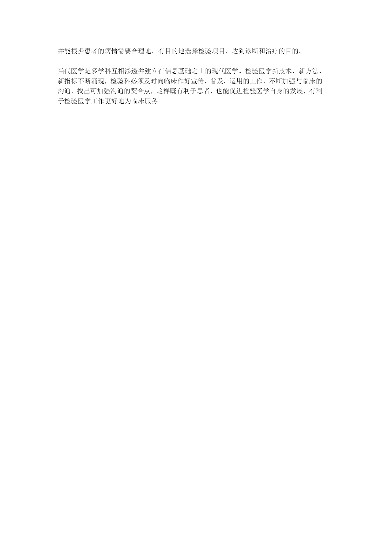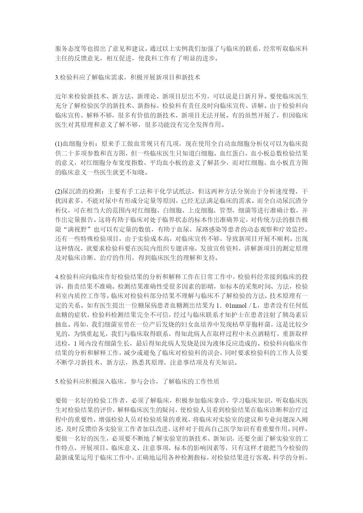 过去我们从事医学检验工作,主要埋头于实验室做方法学的研究与应用,目的是为临床提供准确的数据。随着科学技术的不断进步与医疗事业的不断发展,以激光技术为原理的流式细胞仪、全自动生化分析仪,以化学发光及电化学发光为原理的多种用于免疫和药物浓度筛查的仪器,以及多种分子生物学技术的应用,检验科成为为临床疾病诊断、治疗、预防保健、科研提供科学数据的主要科室,使检验医学朝着高理论、高科技、高水平方向发展,这就要求医学检验人员要不断加强学习,提高素质,迎接新知识、新技术的挑战。根据《医疗事故处理条例》规定,当发生医疗纠纷时,要求医疗单位举证倒置。所以检验医学对临床的重要性显的更加重要,临床也对检验科检验质量提出更高的要求。新仪器、新技术进入检验医学使检测质量有了显著提高,但影响检验质量的因素还包括检测前(从标本准备到实验室)和检测后,三个过程任何一个环节的误差都将导致检测结果的错误。所以,加强检验科与临床的沟通是提高检验质量的保证。1.积极主动向临床宣传检测前质量的重要性要保证检验结果的准确,应高度重视检测前的质量管理。所谓“检测前”即是从采集标本前的准备到实验室检测的一系列处理过程。国外有文献介绍分析前存在的问题不少,如采集标本不规范(占6%~8%)、采集时间不对(占2.2%)、标本收集后未及时送检(占22.2%)、标本不合格(占2.3%)等,给检测结果带来了不少影响。为了避免或减少检测前错误给检测结果准确性带来的影响,检验科应主动向临床宣传检测前质控的意义和注意要点。因为除了准确熟练的操作外,标本的正确采集、临床用药等也会影响检测结果。(1)为了准确测定血脂,要求患者积极配合,做到连续3d素食后才能采集标本;(2)做葡萄糖耐量试验或餐后2h血糖的患者,医生应详细告诉患者何时服用葡萄糖、何时抽血等事宜,只有争取患者的配合才能做好这些检查;(3)正在输液的患者千万不可同侧采血,更不允许利用原有输液针头采血,这是经常发生的错误。如我院一外伤患者,查血糖时发现病人血糖为30mmol/L,但病人并无高血糖症状,工作人员及时跟临床医生联系,查找原因,原来护士采集标本时是从病人输葡萄糖输液器的针头中采集的,因此结果出了偏差;(4)正确选用抗凝剂,同时注意血液与抗凝剂的比例。抗凝剂使用错误或血液与抗凝剂比例不对,都会严重影响检测结果,特别是对新参加工作的医护人员应进行培训和宣传。以上几种情况说明,检验科与临床沟通、保持经常联系,有助于临床与检验医学工作质量的提高。2.检验科应随时深入临床,积极听取临床的反馈意见。以促进工作的完善。并达到与临床的共同发展随着检验自动化的飞速发展,向临床提供的具有诊断价值的检验项目日益增多,但临床医生与检验人员之间常常处于一种相互隔绝的状态。如一张血细胞分析化验单中的20项参数中,真正能够被临床医生理解和使用的大约只有四、五项。这就要求检验科人员经常深入临床,随时了解临床的反馈意见,指导临床医生正确合理的选择检验项目,将有限的检验信息转化为高效的诊断信息,不断改进工作方法。坚持与临床各科室进行对话活动。对话中临床就检验科服务态度、检验质量、检验项目、检验急诊报告时间等各方面提出了意见和建议。同时我科在对话会上对临床标本的采集质量、检验申请单书写、标本送检、急诊项目、急诊记录、服务态度等也提出了意见和建议。通过以上实例我们加强了与临床的联系,经常听取临床科主任的反馈意见,相互促进,使我科工作有了明显的进步。3.检验科应了解临床需求,积极开展新项目和新技术近年来检验新技术、新方法、新理论、新项目层出不穷,可以说是日新月异。要使临床医生充分了解检验医学的新技术、新指标,检验科有责任及时向临床宣传、讲解。由于检验科向临床宣传、解释不够,很多有价值的新技术、新项目无法开展。有的虽然开展了,但因临床医生对其原理和意义了解不够,很多功能没有完全发挥作用。(1)血细胞分析:原来手工做血常规只有几项,现在使用全自动血细胞分析仪可以为临床提供二十多项参数和直方图,但一些临床医生只知道白细胞、血红蛋白、血小板总数检验结果的意义,对红细胞分布宽度指数、平均血小板的意义了解甚少,而对红细胞、血小板直方图的临床意义一些医生就更不知晓。(2)尿沉渣的检测:主要有手工法和干化学试纸法,但这两种方法分别由于分析速度慢、干扰因素多、不能对尿中有形成分定量等原因,已经无法满足临床的需求。而全自动尿沉渣分析仪,可在相当大的范围内对红细胞、白细胞、上皮细胞、管型、细菌等进行准确计数,并作出定量报告。这将有助于临床对处于临界状态的标本作出准确界定,对传统方法的报告极限“满视野”也可以有定量的数值,有助于血尿、尿路感染等患者的动态观察和疗效监控。还有一些特殊检验项目,由于实验成本高,对临床宣传不够,导致新项目开展不顺利。出现这种情况,就要求检验科要在医院内组织专题讲座,
