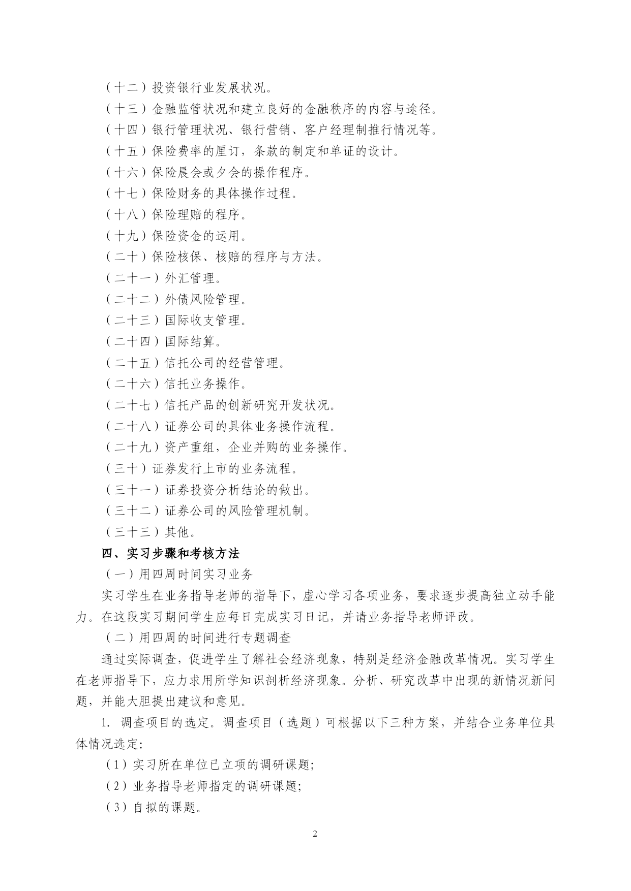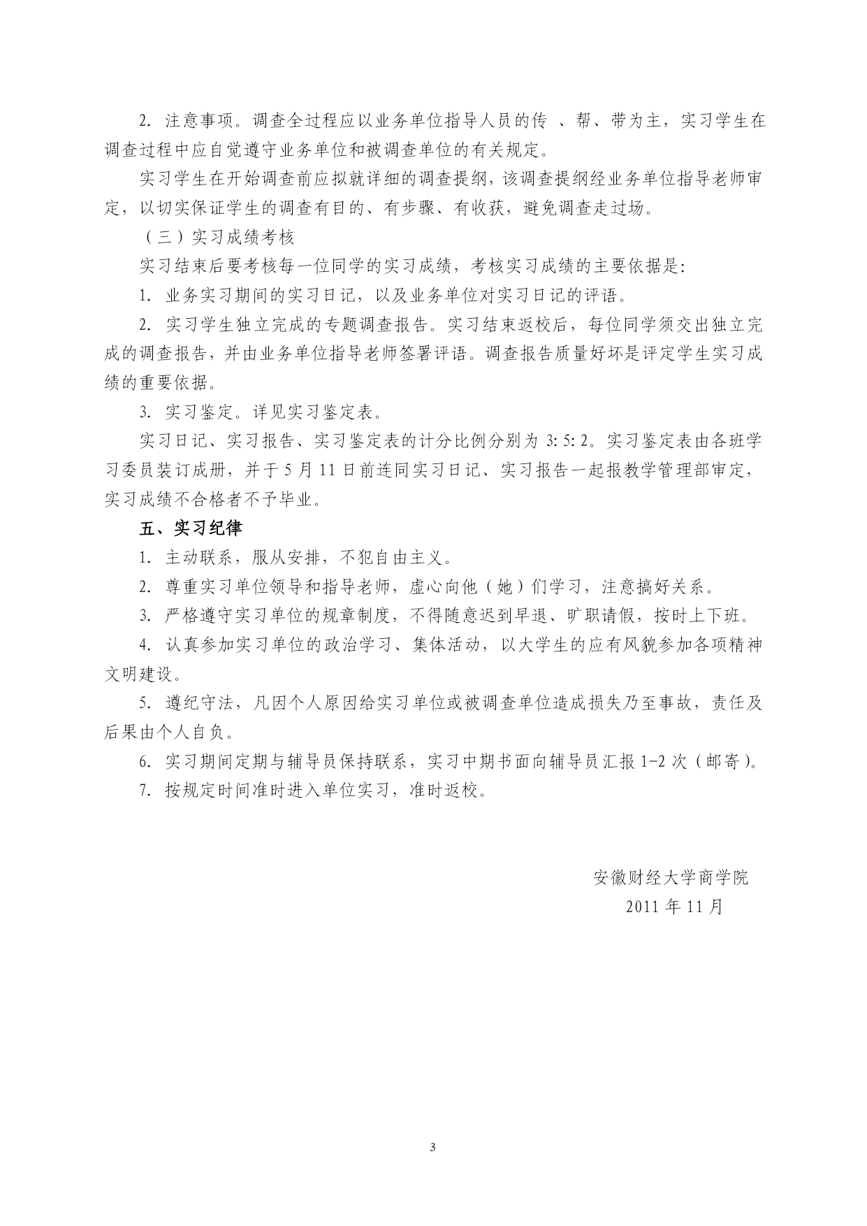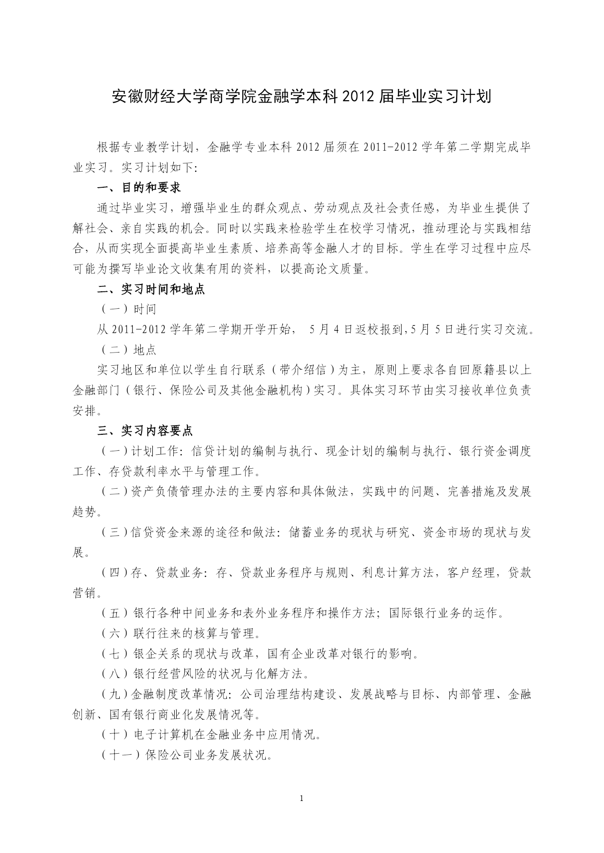 安徽财经大学商学院金融学本科2012届毕业实习计划根据专业教学计划,金融学专业本科2012届须在2011-2012学年第二学期完成毕业实习。实习计划如下:一、目的和要求通过毕业实习,增强毕业生的群众观点、劳动观点及社会责任感,为毕业生提供了解社会、亲自实践的机会。同时以实践来检验学生在校学习情况,推动理论与实践相结合,从而实现全面提高毕业生素质、培养高等金融人才的目标。学生在学习过程中应尽可能为撰写毕业论文收集有用的资料,以提高论文质量。二、实习时间和地点(一)时间从2011-2012学年第二学期开学开始,5月4日返校报到,5月5日进行实习交流。(二)地点实习地区和单位以学生自行联系(带介绍信)为主,原则上要求各自回原籍县以上金融部门(银行、保险公司及其他金融机构)实习。具体实习环节由实习接收单位负责安排。三、实习内容要点(一)计划工作:信贷计划的编制与执行、现金计划的编制与执行、银行资金调度工作、存贷款利率水平与管理工作。(二)资产负债管理办法的主要内容和具体做法,实践中的问题、完善措施及发展趋势。(三)信贷资金来源的途径和做法:储蓄业务的现状与研究、资金市场的现状与发展。(四)存、贷款业务:存、贷款业务程序与规则、利息计算方法,客户经理,贷款营销。(五)银行各种中间业务和表外业务程序和操作方法;国际银行业务的运作。(六)联行往来的核算与管理。(七)银企关系的现状与改革,国有企业改革对银行的影响。(八)银行经营风险的状况与化解方法。(九)金融制度改革情况:公司治理结构建设、发展战略与目标、内部管理、金融创新、国有银行商业化发展情况等。(十)电子计算机在金融业务中应用情况。(十一)保险公司业务发展状况。(十二)投资银行业发展状况。(十三)金融监管状况和建立良好的金融秩序的内容与途径。(十四)银行管理状况、银行营销、客户经理制推行情况等。(十五)保险费率的厘订,条款的制定和单证的设计。(十六)保险晨会或夕会的操作程序。(十七)保险财务的具体操作过程。(十八)保险理赔的程序。(十九)保险资金的运用。(二十)保险核保、核赔的程序与方法。(二十一)外汇管理。(二十二)外债风险管理。(二十三)国际收支管理。(二十四)国际结算。(二十五)信托公司的经营管理。(二十六)信托业务操作。(二十七)信托产品的创新研究开发状况。(二十八)证券公司的具体业务操作流程。(二十九)资产重组,企业并购的业务操作。(三十)证券发行上市的业务流程。(三十一)证券投资分析结论的做出。(三十二)证券公司的风险管理机制。(三十三)其他。四、实习步骤和考核方法(一)用四周时间实习业务实习学生在业务指导老师的指导下,虚心学习各项业务,要求逐步提高独立动手能力。在这段实习期间学生应每日完成实习日记,并请业务指导老师评改。(二)用四周的时间进行专题调查通过实际调查,促进学生了解社会经济现象,特别是经济金融改革情况。实习学生在老师指导下,应力求用所学知识剖析经济现象。分析、研究改革中出现的新情况新问题,并能大胆提出建议和意见。1.调查项目的选定。调查项目(选题)可根据以下三种方案,并结合业务单位具体情况选定:(1)实习所在单位已立项的调研课题;(2)业务指导老师指定的调研课题;(3)自拟的课题。2.注意事项。调查全过程应以业务单位指导人员的传、帮、带为主,实习学生在调查过程中应自觉遵守业务单位和被调查单位的有关规定。实习学生在开始调查前应拟就详细的调查提纲,该调查提纲经业务单位指导老师审定,以切实保证学生的调查有目的、有步骤、有收获,避免调查走过场。(三)实习成绩考核实习结束后要考核每一位同学的实习成绩,考核实习成绩的主要依据是:1.业务实习期间的实习日记,以及业务单位对实习日记的评语。2.实习学生独立完成的专题调查报告。实习结束返校后,每位同学须交出独立完成的调查报告,并由业务单位指导老师签署评语。调查报告质量好坏是评定学生实习成绩的重要依据。3.实习鉴定。详见实习鉴定表。实习日记、实习报告、实习鉴定表的计分比例分别为3:5:2。实习鉴定表由各班学习委员装订成册,并于5月11日前连同实习日记、实习报告一起报教学管理部审定,实习成绩不合格者不予毕业。五、实习纪律1.主动联系,服从安排,不犯自由主义。2.尊重实习单位领导和指导老师,虚心向他(她)们学习,注意搞好关系。3.严格遵守实习单位的规章制度,不得随意迟到早退、旷职请假,按时上下班。4.认真参加实习单位的政治学习、集体活动,以大学生的应有风貌参加各项精神文明建设。5.遵纪守法,凡因个人原因给实习单位或被调查单位造成损失乃至事故,责任及后果由个人自负。6.实习期间定期与辅导员保持联系,实习中期书面向辅导员汇报1-2次(邮寄)。7.按规定时间准时进入单位实习,准时返校。安徽财经大学商学院2011年