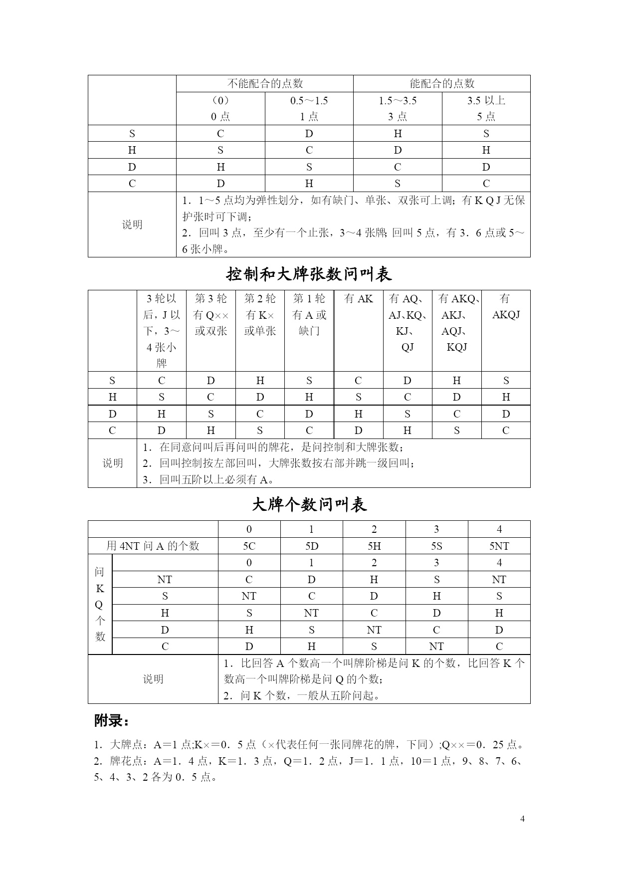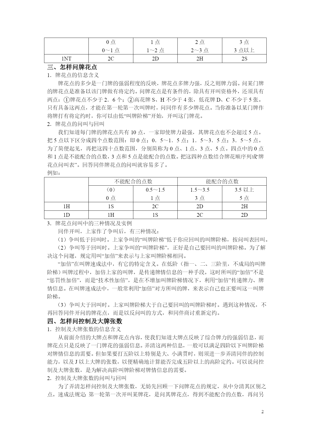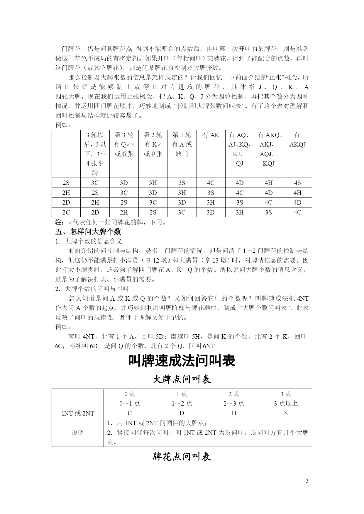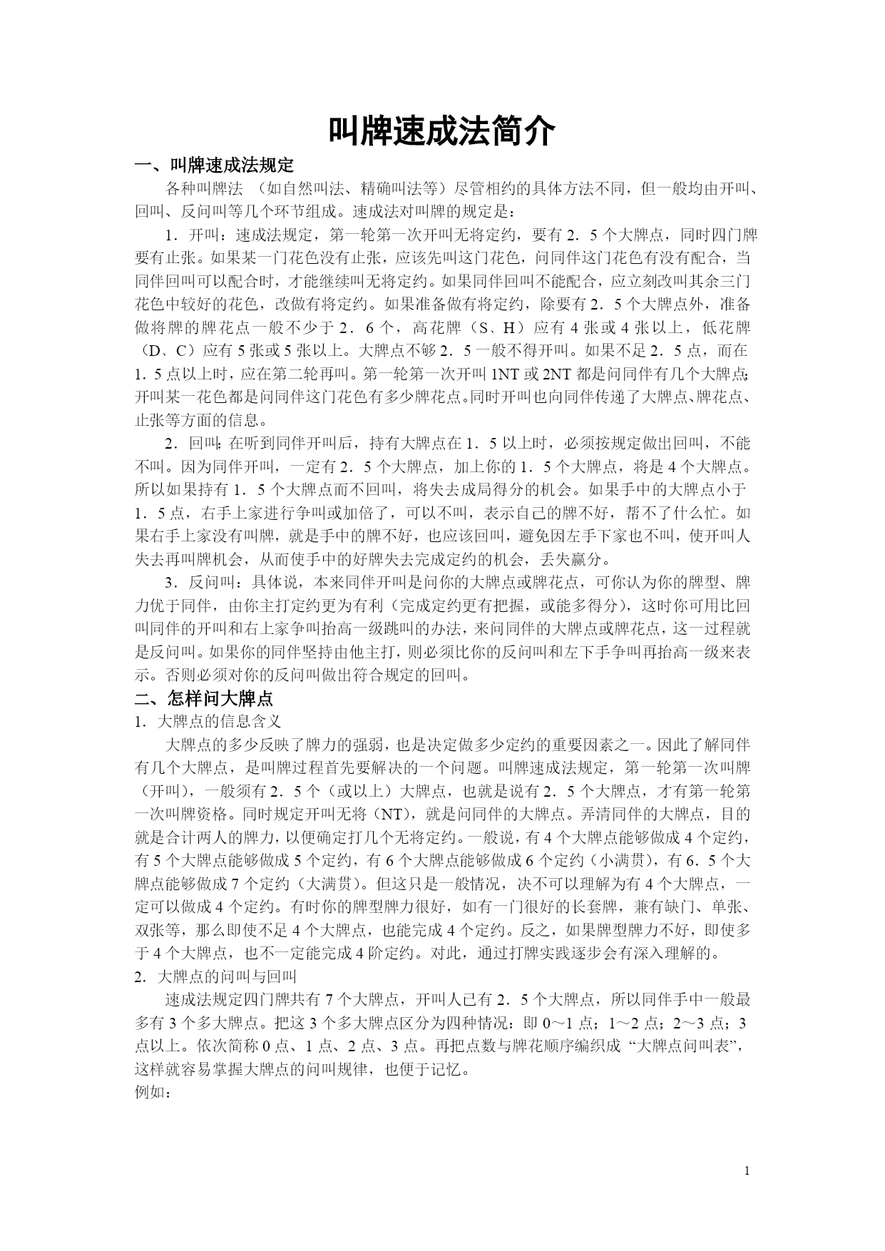 叫牌速成法简介一、叫牌速成法规定各种叫牌法(如自然叫法、精确叫法等)尽管相约的具体方法不同,但一般均由开叫、回叫、反问叫等几个环节组成。速成法对叫牌的规定是:1.开叫:速成法规定,第一轮第一次开叫无将定约,要有2.5个大牌点,同时四门牌要有止张。如果某一门花色没有止张,应该先叫这门花色,问同伴这门花色有没有配合,当同伴回叫可以配合时,才能继续叫无将定约。如果同伴回叫不能配合,应立刻改叫其余三门花色中较好的花色,改做有将定约。如果准备做有将定约,除要有2.5个大牌点外,准备做将牌的牌花点一般不少于2.6个,高花牌(S﹑H)应有4张或4张以上,低花牌(D﹑C)应有5张或5张以上。大牌点不够2.5一般不得开叫。如果不足2.5点,而在1.5点以上时,应在第二轮再叫。第一轮第一次开叫1NT或2NT都是问同伴有几个大牌点;开叫某一花色都是问同伴这门花色有多少牌花点。同时开叫也向同伴传递了大牌点、牌花点、止张等方面的信息。2.回叫:在听到同伴开叫后,持有大牌点在1.5以上时,必须按规定做出回叫,不能不叫。因为同伴开叫,一定有2.5个大牌点,加上你的1.5个大牌点,将是4个大牌点。所以如果持有1.5个大牌点而不回叫,将失去成局得分的机会。如果手中的大牌点小于1.5点,右手上家进行争叫或加倍了,可以不叫,表示自己的牌不好,帮不了什么忙。如果右手上家没有叫牌,就是手中的牌不好,也应该回叫,避免因左手下家也不叫,使开叫人失去再叫牌机会,从而使手中的好牌失去完成定约的机会,丢失赢分。3.反问叫:具体说,本来同伴开叫是问你的大牌点或牌花点,可你认为你的牌型、牌力优于同伴,由你主打定约更为有利(完成定约更有把握,或能多得分),这时你可用比回叫同伴的开叫和右上家争叫抬高一级跳叫的办法,来问同伴的大牌点或牌花点,这一过程就是反问叫。如果你的同伴坚持由他主打,则必须比你的反问叫和左下手争叫再抬高一级来表示。否则必须对你的反问叫做出符合规定的回叫。二、怎样问大牌点1.大牌点的信息含义大牌点的多少反映了牌力的强弱,也是决定做多少定约的重要因素之一。因此了解同伴有几个大牌点,是叫牌过程首先要解决的一个问题。叫牌速成法规定,第一轮第一次叫牌(开叫),一般须有2.5个(或以上)大牌点,也就是说有2.5个大牌点,才有第一轮第一次叫牌资格。同时规定开叫无将(NT),就是问同伴的大牌点。弄清同伴的大牌点,目的就是合计两人的牌力,以便确定打几个无将定约。一般说,有4个大牌点能够做成4个定约,有5个大牌点能够做成5个定约,有6个大牌点能够做成6个定约(小满贯),有6.5个大牌点能够做成7个定约(大满贯)。但这只是一般情况,决不可以理解为有4个大牌点,一定可以做成4个定约。有时你的牌型牌力很好,如有一门很好的长套牌,兼有缺门、单张、双张等,那么即使不足4个大牌点,也能完成4个定约。反之,如果牌型牌力不好,即使多于4个大牌点,也不一定能完成4阶定约。对此,通过打牌实践逐步会有深入理解的。2.大牌点的问叫与回叫速成法规定四门牌共有7个大牌点,开叫人已有2.5个大牌点,所以同伴手中一般最多有3个多大牌点。把这3个多大牌点区分为四种情况:即0~1点;1~2点;2~3点;3点以上。依次简称0点、1点、2点、3点。再把点数与牌花顺序编织成“大牌点问叫表”,这样就容易掌握大牌点的问叫规律,也便于记忆。例如:0点0~1点1点1~2点2点2~3点3点3点以上1NT2C2D2H2S三、怎样问牌花点1.牌花点的信息含义牌花点的多少是一门牌的强弱程度的反映,牌花点多牌力强,反之则牌力弱。问某门牌的牌花点是准备以该门牌做有将定约。问牌花点是有条件的,除具有开叫资格外,还须具有两点:①牌花点不少于2.6个;②高花牌S、H不少于4张,低花牌D、C不少于5张。只有具备这两点,才能在第一轮第一次叫牌时,问同伴有多少牌花点。当你准备以某门牌作将牌打有将定约时,你可以由低“叫牌阶梯”开始,开叫这门牌花。2.牌花点的问叫与回叫我们知道每门牌的牌花点共有10点,一家即使牌力最强,其牌花点也不会超过5点。把5点以下区分成四个点数范围:即0点;0.5~1.5点;1.5~3.5点;3.5~5点。为了简便起见,再把这四十点数范围,分别简称为0点、1点、3点、5点。四点中的0点和1点是不能配合的点数,3点和5点是能配合的点数。把这四种点数结合牌花顺序列成“牌花点问叫表”。回答同伴牌花点的问叫就容易多了。例如:不能配合的点数能配合的点数(0)0点0.5~1.51点1.5~3.53点3.5以上5点1H1S2C2D2H1D1H1S2C2D3.牌花点问叫中的三种情况及实例同伴开叫,上家作了争叫后,有三种情况:(1)争叫低于回叫时。上家争叫的“叫牌阶梯”低于你应回叫的叫牌阶梯,按问叫表回叫。(2)争叫等于回叫时。