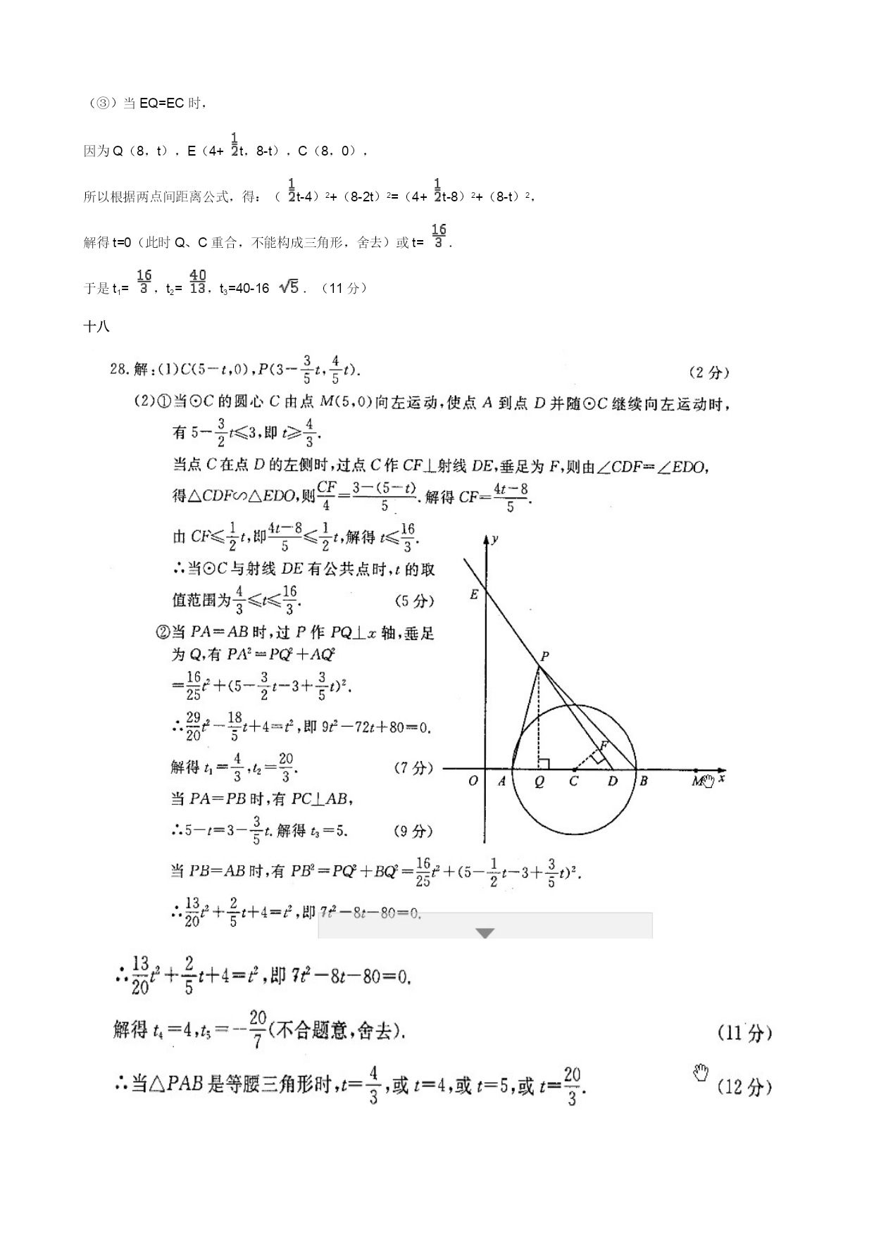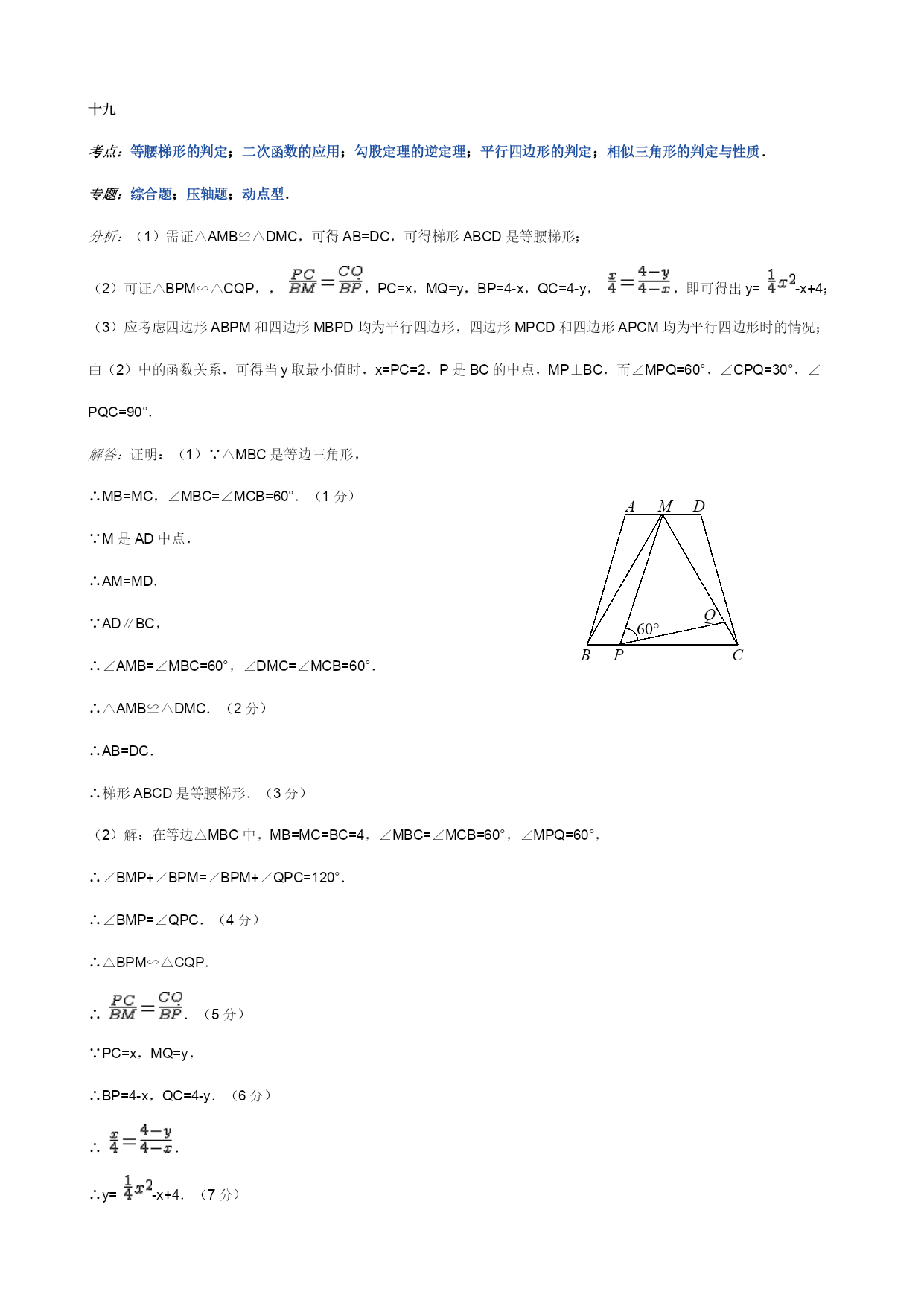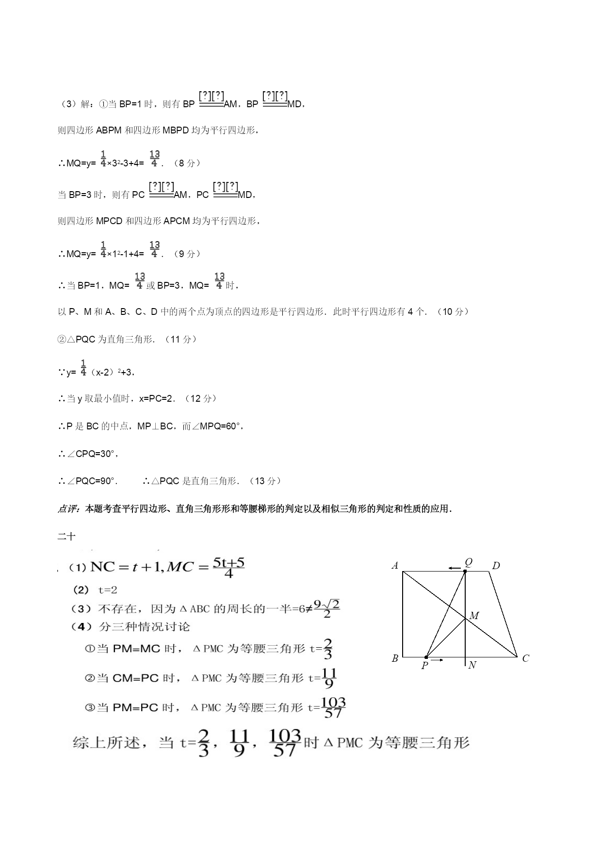 十七考点:HYPERLINK"javascript:void(0)"二次函数综合题.专题:HYPERLINK"javascript:void(0)"压轴题.分析:(1)由于四边形ABCD为矩形,所以A点与D点纵坐标相同,A点与B点横坐标相同;(2)①根据相似三角形的性质求出点E的横坐标表达式即为点G的横作标表达式.代入二次函数解析式,求出纵标表达式,将线段最值问题转化为二次函数最值问题解答.②若构成等腰三角形,则三条边中有两条边相等即可,于是可分EQ=EC,EC=CQ,EQ=EC三种情况讨论.若有两种情况时间相同,则三边长度相同,为等腰三角形.OADBCEFPGQ解答:解:(1)因为点B的横坐标为4,点D的纵坐标为8,AD∥x轴,AB∥y轴,所以点A的坐标为(4,8).(1分)将A(4,8)、C(8,0)两点坐标分别代入y=ax2+bx得解得a=-,b=4,∴抛物线的解析式为:y=-x2+4x;(3分)(2)①在Rt△APE和Rt△ABC中,tan∠PAE==,即=.∴PE=AP=t.PB=8-t.∴点E的坐标为(4+t,8-t).∴点G的纵坐标为:-(4+t)2+4(4+t)=-t2+8.(5分)∴EG=-t2+8-(8-t)=-t2+t.∵-<0,∴当t=4时,线段EG最长为2.(7分)②共有三个时刻.(8分)(①)当EQ=QC时,因为Q(8,t),E(4+t,8-t),QC=t,所以根据两点间距离公式,得:(t-4)2+(8-2t)2=t2.整理得13t2-144t+320=0,解得t=或t==8(此时E、C重合,不能构成三角形,舍去).(②)当EC=CQ时,因为E(4+t,8-t),C(8,0),QC=t,所以根据两点间距离公式,得:(4+t-8)2+(8-t)2=t2.整理得t2-80t+320=0,t=40-16,t=40+16>8(此时Q不在矩形的边上,舍去).(③)当EQ=EC时,因为Q(8,t),E(4+t,8-t),C(8,0),所以根据两点间距离公式,得:(t-4)2+(8-2t)2=(4+t-8)2+(8-t)2,解得t=0(此时Q、C重合,不能构成三角形,舍去)或t=.于是t1=,t2=,t3=40-16.(11分)十八十九考点:HYPERLINK"javascript:void(0)"等腰梯形的判定;HYPERLINK"javascript:void(0)"二次函数的应用;HYPERLINK"javascript:void(0)"勾股定理的逆定理;HYPERLINK"javascript:void(0)"平行四边形的判定;HYPERLINK"javascript:void(0)"相似三角形的判定与性质.专题:HYPERLINK"javascript:void(0)"综合题;HYPERLINK"javascript:void(0)"压轴题;HYPERLINK"javascript:void(0)"动点型.分析:(1)需证△AMB≌△DMC,可得AB=DC,可得梯形ABCD是等腰梯形;(2)可证△BPM∽△CQP,,,PC=x,MQ=y,BP=4-x,QC=4-y,,即可得出y=-x+4;(3)应考虑四边形ABPM和四边形MBPD均为平行四边形,四边形MPCD和四边形APCM均为平行四边形时的情况;由(2)中的函数关系,可得当y取最小值时,x=PC=2,P是BC的中点,MP⊥BC,而∠MPQ=60°,∠CPQ=30°,∠PQC=90°.ADCBPMQ60°解答:证明:(1)∵△MBC是等边三角形,∴MB=MC,∠MBC=∠MCB=60°.(1分)∵M是AD中点,∴AM=MD.∵AD∥BC,∴∠AMB=∠MBC=60°,∠DMC=∠MCB=60°.∴△AMB≌△DMC.(2分)∴AB=DC.∴梯形ABCD是等腰梯形.(3分)(2)解:在等边△MBC中,MB=MC=BC=4,∠MBC=∠MCB=60°,∠MPQ=60°,∴∠BMP+∠BPM=∠BPM+∠QPC=120°.∴∠BMP=∠QPC.(4分)∴△BPM∽△CQP.∴.(5分)∵PC=x,MQ=y,∴BP=4-x,QC=4-y.(6分)∴.∴y=-x+4.(7分)(3)解:①当BP=1时,则有BPAM,BPMD,则四边形ABPM和四边形MBPD均为平行四边形,∴MQ=y=×32-3+4=.(8分)当BP=3时,则有PCAM,PCMD,则四边形MPCD和四边形APCM均为平行四边形,∴MQ=y=×12-1+4=.(9分)∴当BP=1,MQ=或BP=3,MQ=时,以P、M和A、B、C、D中的两个点为顶点的四边形是平行四边形.此时平行四边形有4个.(10分)②△PQC为直角三角形.(11分)∵y=