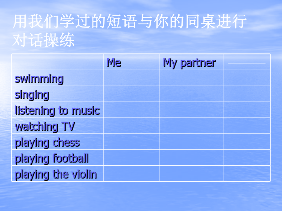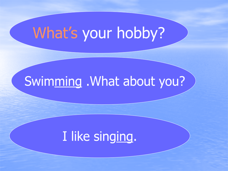 六年级宝丰镇黄栗中学执教:刘波let'sstartWhat’s=Tellmeaboutyourpenpal.Whatdoesheliketodo?Hishobbyispainting,andthat’smyhobby,too.Howdoeshegotoschool?Doeshegotoschoolbycar?No,hegoesonfoot,becausehisschoolisnottoofar.ALet'slearnridingabikemakingkitesdivingcollectingstampsplayingtheviolinridingabikedivingplayingthevioloncollectingstampsmakingkitesWhatisyourhobby?Ilikeridingabike.Ilikediving.Ilikeplayingtheviolin.Ilikecollectingstamps.Ilikemakingkites.注意:动词的-ing形式以不发音的e结尾的单词,是去掉e再加-ing.别的词都是直接加-ing.有一个词很特殊,swimming,是双写m再加-ing.Groupwork(分组活动)练习翻译句子或短语;1.你的爱好是什么?2.我喜欢拉小提琴。3.骑自行车4.跳水5.制作风筝6.集邮