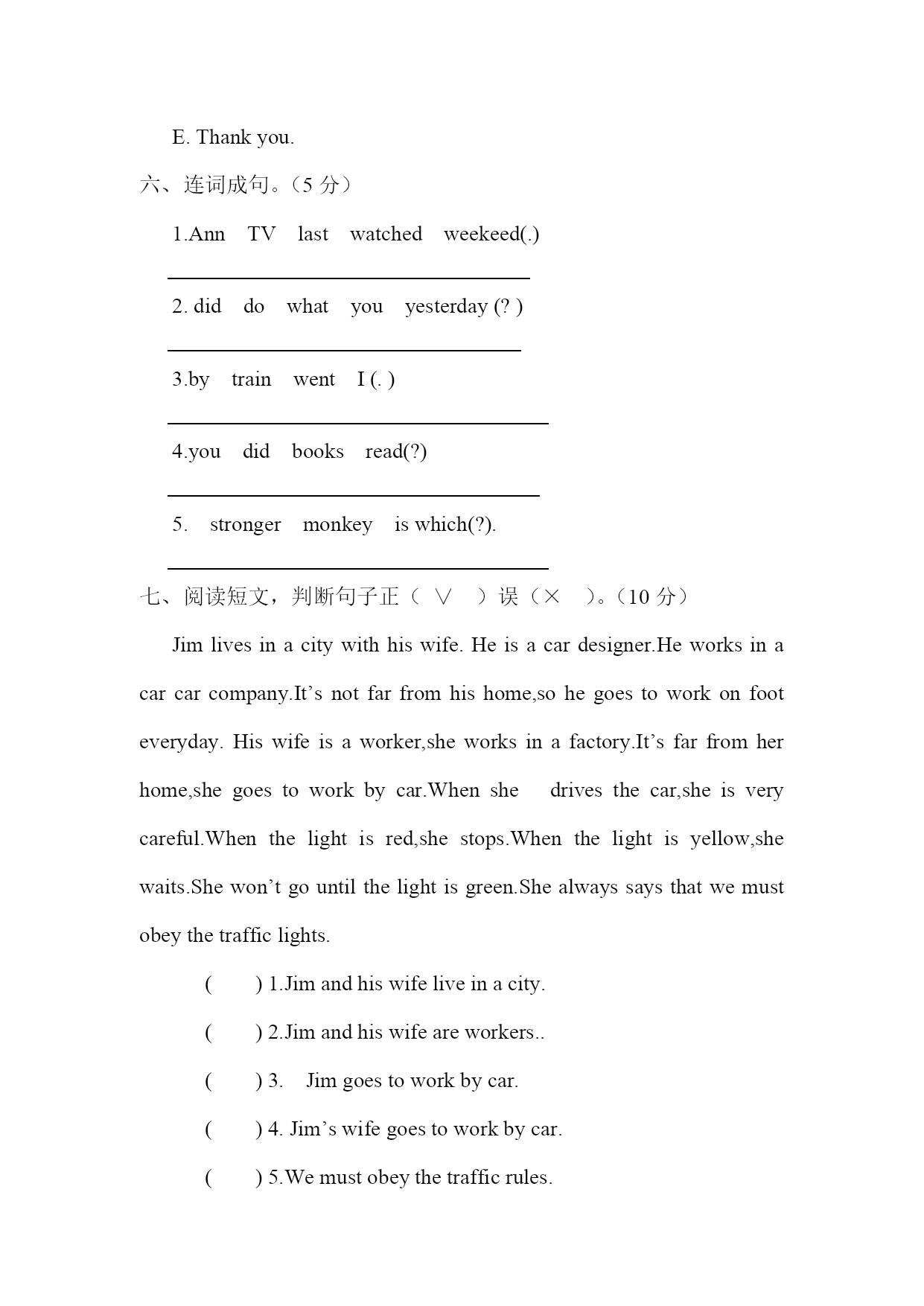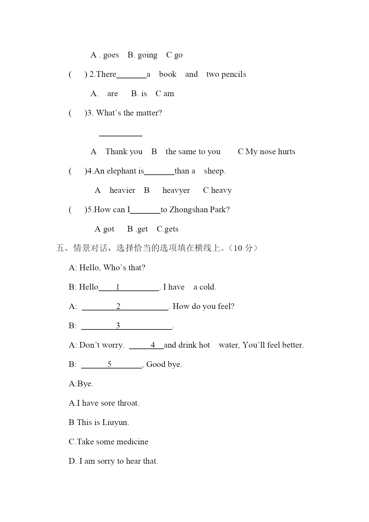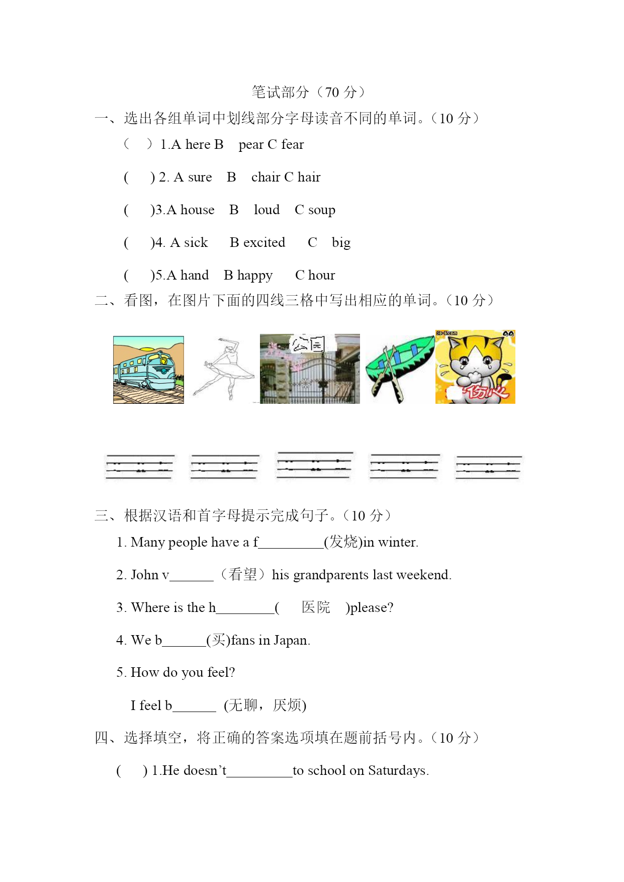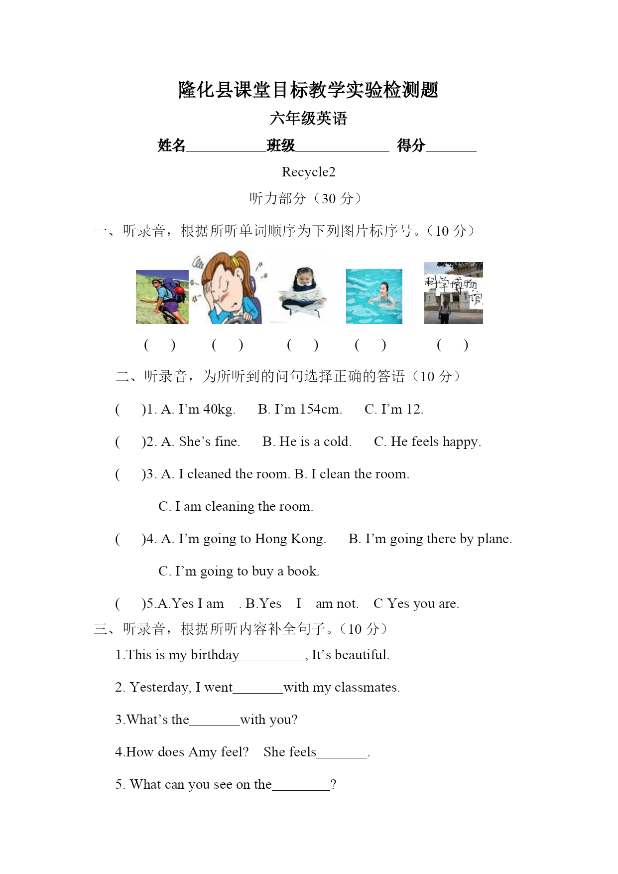 隆化县课堂目标教学实验检测题六年级英语姓名班级得分Recycle2听力部分(30分)一、听录音,根据所听单词顺序为下列图片标序号。(10分)()()()()()二、听录音,为所听到的问句选择正确的答语(10分)()1.A.I’m40kg.B.I’m154cm.C.I’m12.()2.A.She’sfine.B.Heisacold.C.Hefeelshappy.()3.A.Icleanedtheroom.B.Icleantheroom.C.Iamcleaningtheroom.()4.A.I’mgoingtoHongKong.B.I’mgoingtherebyplane.C.I’mgoingtobuyabook.()5.A.YesIam.B.YesIamnot.CYesyouare.三、听录音,根据所听内容补全句子。(10分)1.Thisismybirthday,It’sbeautiful.2.Yesterday,Iwentwithmyclassmates.3.What’sthewithyou?4.HowdoesAmyfeel?Shefeels.5.Whatcanyouseeonthe?笔试部分(70分)一、选出各组单词中划线部分字母读音不同的单词。(10分)()1.AhereBpearCfear()2.AsureBchairChair()3.AhouseBloudCsoup()4.AsickBexcitedCbig()5.AhandBhappyChour二、看图,在图片下面的四线三格中写出相应的单词。(10分)HYPERLINK"http://image.baidu.com/i?ct=503316480&z=&tn=baiduimagedetail&word=%CD%A3%B5%C4%B1%EA%D6%BE&in=21556&cl=2&lm=-1&pn=2&rn=1&di=9064605225&ln=2000&fr=&fmq=&ic=0&s=0&se=1&sme=0&tab=&width=&height=&face=0&is=&istype=2"\t"_blank"HYPERLINK"http://image.baidu.com/i?ct=503316480&z=&tn=baiduimagedetail&word=%C7%E5%BD%E0%B9%A4%C8%CB&in=20613&cl=2&lm=-1&pn=0&rn=1&di=65438756115&ln=2000&fr=&fmq=&ic=&s=&se=&sme=0&tab=&width=&height=&face=&is=&istype="\t"_blank"三、根据汉语和首字母提示完成句子。(10分)1.Manypeoplehaveaf(发烧)inwinter.2.Johnv(看望)hisgrandparentslastweekend.3.Whereistheh(医院)please?4.Web(买)fansinJapan.5.Howdoyoufeel?Ifeelb(无聊,厌烦)四、选择填空,将正确的答案选项填在题前括号内。(10分)()1.Hedoesn’ttoschoolonSaturdays.A.goesB.goingCgo()2.ThereabookandtwopencilsA.areB.isCam()3.What’sthematter?AThankyouBthesametoyouCMynosehurts()4.Anelephantisthanasheep.AheavierBheavyerCheavy()5.HowcanItoZhongshanPark?AgotB.getC.gets五、情景对话,选择恰当的选项填在横线上。(10分)A:Hello,Who’sthat?B:Hello1.Ihaveacold.A:2.Howdoyoufeel?B:3.A:Don’tworry.4anddrinkhotwater,You’llfeelbetter.B:5,Goodbye.A:Bye.A.Ihavesorethroat.BThisisLiuyun.C.TakesomemedicineD.Iamsorrytohearthat.E.Thankyou.六、连词成句。(5分)1.AnnTVlastwatchedweekeed(.)2.diddowhatyouyesterday(?)3.bytrainwentI(.)4.youdidbooksread(?)5.strongermonkeyiswhich(?).七、阅读短文,判断句子正(∨)误(×)。(10分)Jimlivesinacitywithhiswife.Heisacardesigner.Heworksinacarc