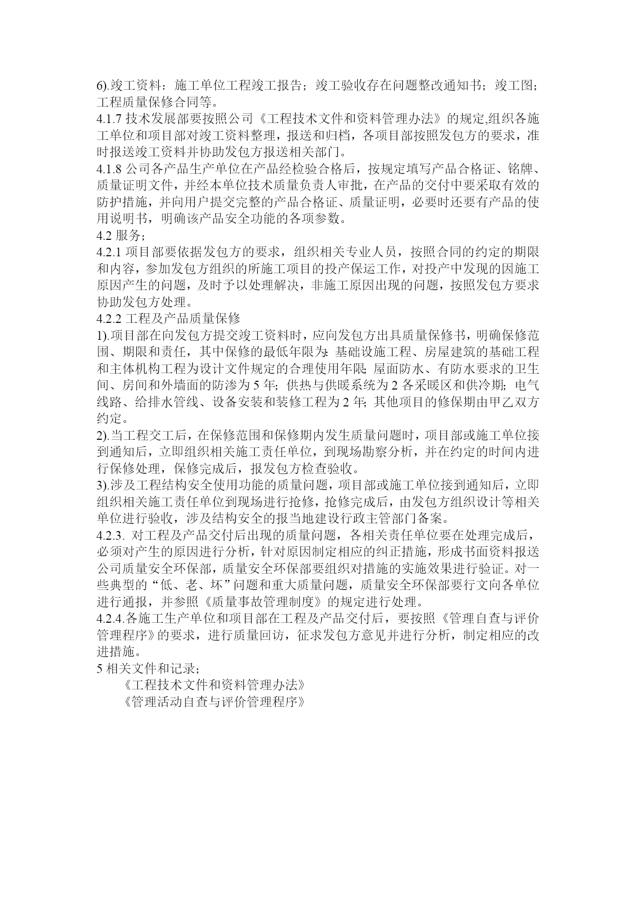 工程产品的交付和服务管理程序1、目的和适用范围为规范工程产品交付及交付后服务的管理工作,特制订本程序。本程序适用于工程产品交付管理活动及交付后服务的管理活动。2、依据的标准及条款GB/T50430标准10.6,13.1,13.2,13.3条款,GB/T19001标准7.5.1条款,Q/SY1002.1-2007标准中5.5.3,5.6.3条款,GB/T28001-2001标准4.4.6,4.5.2条款和GB/T24001-2004标准中4.4.6,4.5.3条款以及《中环人民共和国建筑法》第61、62条和《建筑工程质量管理条例》第39、40、41条。3、职责3.1项目管理中心负责组织工程产品的交付和交付后服务活动的实施。3.2.技术发展部负责组织各生产单位和项目部进行工程竣工资料的整理、报送和归档管理工作。3.3各生产单位和项目部具体负责所承担的工程产品的交付及移交前的防护和交付后的各项维修服务活动。4程序内容4.1工程及产品交付的管理4.1.1工程项目作业完毕后,经发包方、监理验收合格后,承担项目施工的项目部由项目技术负责人组织编制该项目的试运方案,报工程监理和发包方审批后,按批准后的方案安排试运活动。4.1.2在试运前48小时,项目部以书面形式通知工程监理或发包方,通知试运内容、时间、地点及设备的试运记录。工程监理和发包方相关负责人达到现场后,在他们的监督下进行试运,并记录试运的结果,将其作为竣工资料的一部分。4.1.3当项目由多个施工单位参与施工时,项目部要通知各相关施工单位及责任部门,组建试运的组织机构,由项目部牵头实施该项目的试运。4.1.4对于试运过程所发现的问题,各责任单位立即组织整改,直到合格为止。试运结束并合格后,试运结果由责任单位报工程监理和发包方签字确认。4.1.5试运结束后,项目部要对该项目的各个部位采取有效的防护措施进行防护,以便完整无损的向发包方移交。4.1.6试运结束后,由项目部在15日内向发包方提供完整的竣工资料和验收报告。工程竣工资料按照监理批准的工程划分办法编写,施工竣工表格采用工程质量评定标准中规定的表格或发包方、工程监理指定的表格,并符合国家行业标准规范的要求,施工竣工资料一般包括:1).开工前资料:中标通知书;施工合同;图纸会审记录;施工组织设计或施工方案;质量安全技术交底记录;测量定位记录;施工现场质量管理检查记录等。2).质量验收记录资料:各检验批、分项、分部工程的质量验收记录和各单位工程竣工验收记录。3).试验资料:包括涉及到该项目所使用的材料、构配件、设备的试验报告,涉及工程安全功能的测试和试验报告。4).材料、构配件等合格证资料(材质证明文件)5).施工过程资料:设计变更;工程测量放线记录;自检、互检、交接检记录;施工日志;“四新”技术施工记录;工程质量整改通知单等。5).必要时增补的资料:施工单位资质证明;执业人员资格证明等。6).竣工资料:施工单位工程竣工报告;竣工验收存在问题整改通知书;竣工图;工程质量保修合同等。4.1.7技术发展部要按照公司《工程技术文件和资料管理办法》的规定,组织各施工单位和项目部对竣工资料整理,报送和归档,各项目部按照发包方的要求,准时报送竣工资料并协助发包方报送相关部门。4.1.8公司各产品生产单位在产品经检验合格后,按规定填写产品合格证、铭牌、质量证明文件,并经本单位技术质量负责人审批,在产品的交付中要采取有效的防护措施,并向用户提交完整的产品合格证、质量证明,必要时还要有产品的使用说明书,明确该产品安全功能的各项参数。4.2服务;4.2.1项目部要依据发包方的要求,组织相关专业人员,按照合同的约定的期限和内容,参加发包方组织的所施工项目的投产保运工作,对投产中发现的因施工原因产生的问题,及时予以处理解决,非施工原因出现的问题,按照发包方要求协助发包方处理。4.2.2工程及产品质量保修1).项目部在向发包方提交竣工资料时,应向发包方出具质量保修书,明确保修范围、期限和责任,其中保修的最低年限为:基础设施工程、房屋建筑的基础工程和主体机构工程为设计文件规定的合理使用年限;屋面防水、有防水要求的卫生间、房间和外墙面的防渗为5年;供热与供暖系统为2各采暖区和供冷期;电气线路、给排水管线、设备安装和装修工程为2年;其他项目的修保期由甲乙双方约定。2).当工程交工后,在保修范围和保修期内发生质量问题时,项目部或施工单位接到通知后,立即组织相关施工责任单位,到现场勘察分析,并在约定的时间内进行保修处理,保修完成后,报发包方检查验收。3).涉及工程结构安全使用功能的质量问题,项目部或施工单位接到通知后,立即组织相关施工责任单位到现场进行抢修,抢修完成后,由发包方组织设计等相关单位进行验收,涉及结构安全的报当地建设行政主管部门备案。4.2.3.对工程及产品交