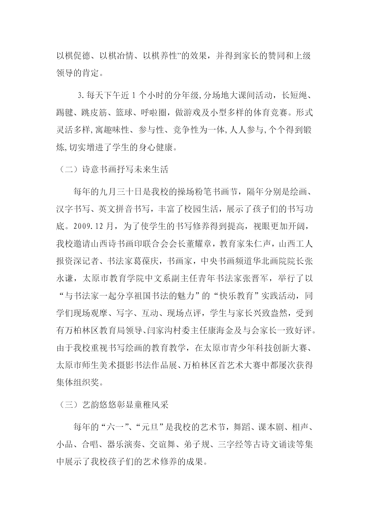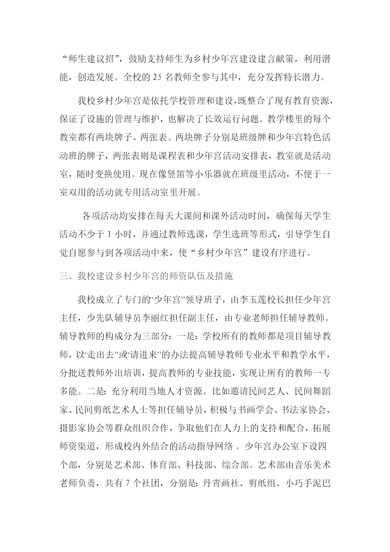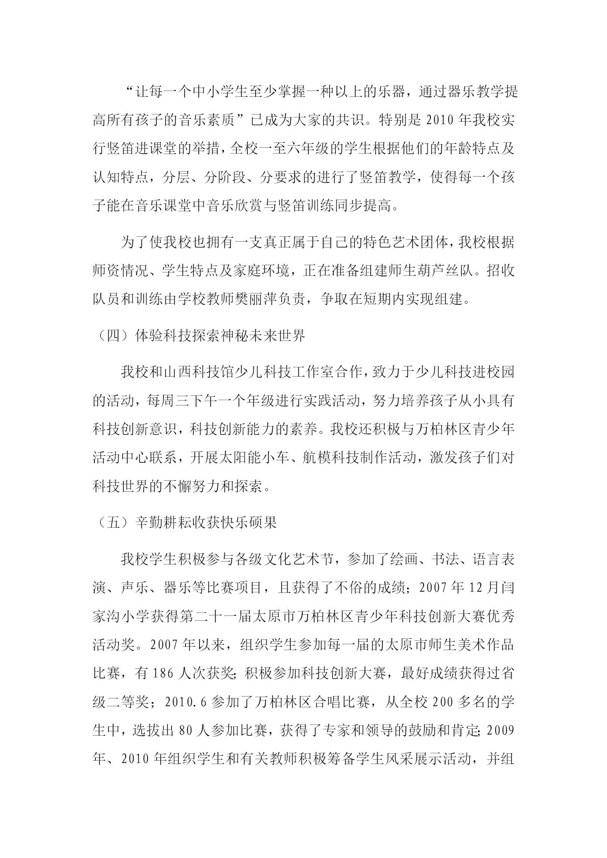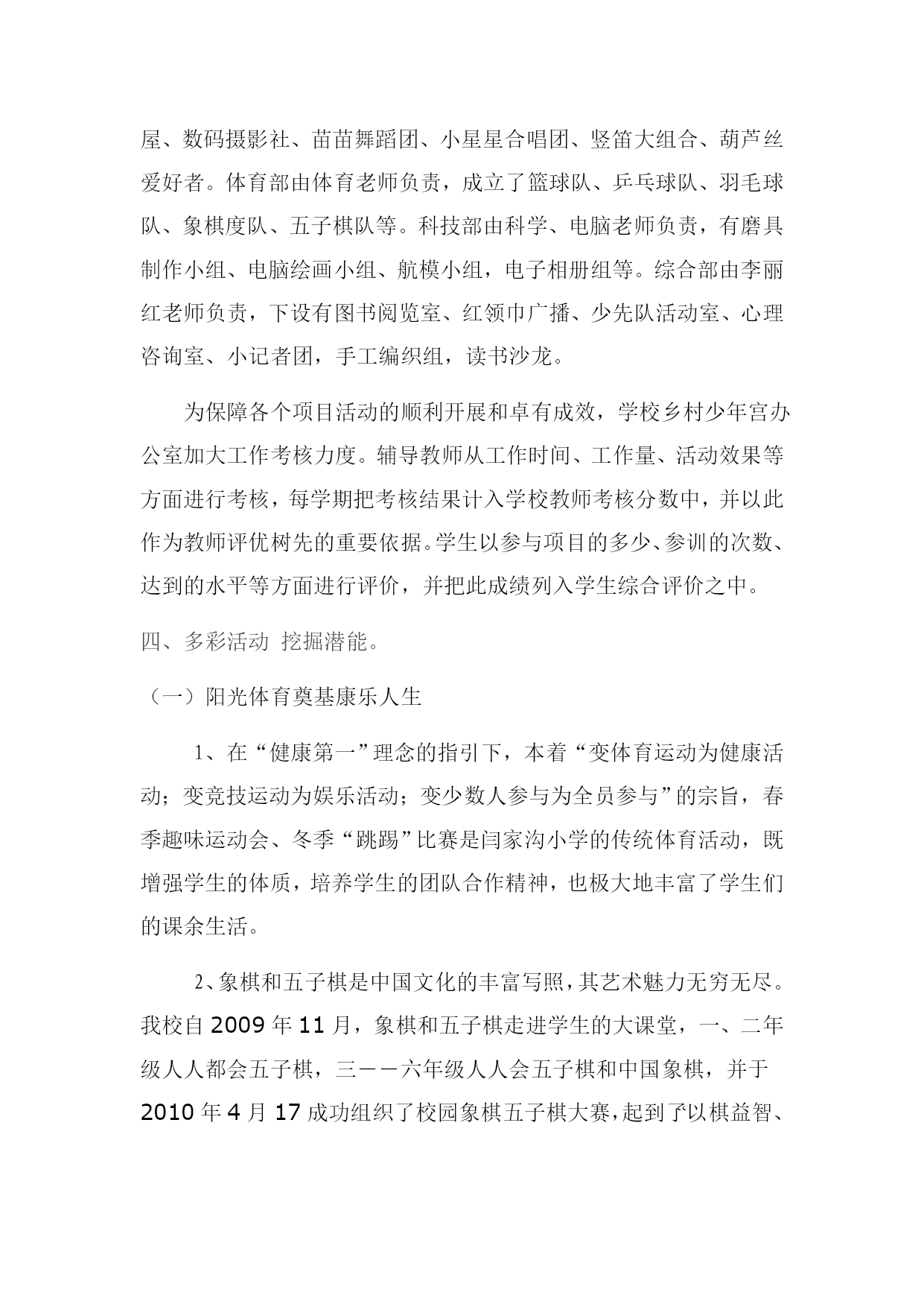 赏琴棋书画,做快乐少年闫家沟小学乡村少年宫交流材料闫家沟小学乡村少年宫位于太原市万柏林区闫家沟村。依托闫家沟小学,校园环境优美,布局合理,总占地面积3600平方米,建筑面积2700平方米。设有图书馆,电脑室,美术活动室、舞蹈室、乒乓球室,美术教具室、少先队活动室、体育器材室,科技体验室,科学实验室,音乐教室等功能教室11个专用教室和7个多功能教室,比较先进的学校办学资源为农村孩子提供了丰富的发展平台。一、我校建设乡村少年宫的指导思想为全面贯彻落实党的教育方针,深入贯彻实施素质教育,促进学生的全面发展,我校启动了“闫家沟小学少年宫”建设工程,构建课内与课外结合、校内与校外配合、资源共享互补,并以“赏琴棋书画,做快乐少年”为主题,培养学生的兴趣和爱好,满足学生的课外活动需求,实现快乐学习,健康成长,全面发展。其中“竖笛特色”、“读书特色”、“快乐教育”“棋类教育”已初见成效。使“少年宫”成为孩子们喜欢的活动场所、家长放心的教育阵地。目前,各个项目已经充分开展活动起来,并已取得优异成绩。二、我校建设农村少年宫的模式我校根据实际确定了少年宫建设模式,采用“四招”建设乡村少年宫:(一)是“师资招”,利用特长教师的优势,挖掘培植特色品牌,做精做大;(二)是“当地资源招”,充分发挥当地优势资源,依托民俗、地方史等资源,培植典型,辐射带动;(三)是“学校传统招”,继承发扬学校先前丰厚的文化底蕴,聚成育人新亮点;(四)是“师生建议招”,鼓励支持师生为乡村少年宫建设建言献策,利用潜能,创造发展。全校的25名HYPERLINK"http://WWW.teachercn.com"\t"_blank"教师全参与其中,充分发挥特长潜力。我校乡村少年宫是依托学校管理和建设,既整合了现有教育资源,保证了设施的管理与维护,也解决了长效运行问题。教学楼里的每个教室都有两块牌子、两张表。两块牌子分别是班级牌和少年宫特色HYPERLINK"http://www.teachercn.com/Kcgg/Hdkc/"\t"_blank"活动班的牌子,两张表则是课程表和少年宫HYPERLINK"http://www.teachercn.com/Kcgg/Hdkc/"\t"_blank"活动安排表,教室就是活动室,随时变换使用。现在像竖笛等小乐器就在班级里HYPERLINK"http://www.teachercn.com/Kcgg/Hdkc/"\t"_blank"活动,不便于一室双用的HYPERLINK"http://www.teachercn.com/Kcgg/Hdkc/"\t"_blank"活动就专用HYPERLINK"http://www.teachercn.com/Kcgg/Hdkc/"\t"_blank"活动室里开展。各项活动均安排在每天大课间和课外活动时间,确保每天学生活动不少于1小时,并通过教师选课,学生选班等形式,引导学生自觉自愿参与到各项活动中来,使“乡村少年宫”建设有序进行。三、我校建设乡村少年宫的师资队伍及措施我校成立了专门的“少年宫”领导班子,由李玉莲校长担任少年宫主任,少先队辅导员李丽红担任副主任,由专业老师担任辅导教师。辅导教师的构成分为三部分:一是:学校所有的教师都是项目辅导教师,以“走出去”或“请进来”的办法提高辅导教师专业水平和教学水平,分批送教师外出培训,提高教师的专业技能,实现让所有的教师一专多能。二是:充分利用当地人才资源。比如邀请民间艺人、民间舞蹈家、民间剪纸艺术人士等担任辅导员,积极与书画学会、书法家协会、摄影家协会等群众组织合作,争取他们在人力上的支持和配合,拓展师资渠道,形成校内外结合的活动指导网络。少年宫办公室下设四个部,分别是艺术部、体育部、科技部、综合部。艺术部由音乐美术老师负责,共有7个社团,分别是:丹青画社、剪纸组、小巧手泥巴屋、数码摄影社、苗苗舞蹈团、小星星合唱团、竖笛大组合、葫芦丝爱好者。体育部由体育老师负责,成立了篮球队、乒乓球队、羽毛球队、象棋度队、五子棋队等。科技部由科学、电脑老师负责,有磨具制作小组、电脑绘画小组、航模小组,电子相册组等。综合部由李丽红老师负责,下设有图书阅览室、红领巾广播、少先队活动室、心理咨询室、小记者团,手工编织组,读书沙龙。为保障各个项目活动的顺利开展和卓有成效,学校乡村少年宫办公室加大工作考核力度。辅导教师从工作时间、工作量、活动效果等方面进行考核,每学期把考核结果计入学校教师考核分数中,并以此作为教师评优树先的重要依据。学生以参与项目的多少、参训的次数、达到的水平等方面进行评价,并把此成绩列入学生综合评价之中。四、多彩活动挖掘潜能。(一)阳光体育奠基康乐人生1、在“健康第一”理念的指引下,本着“变体育运动为健康活动;变竞技运动为娱乐活动;变少